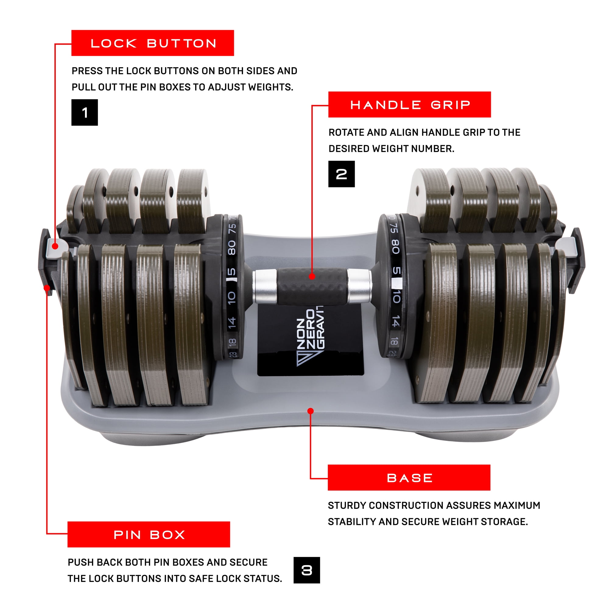Broad Weight Range Maximize your at-home gym space with a variety of weight plates ranging anywhere from 5 to 80lbs in a sturdy and compact design. The textured, soft-grip handle ensures lifting your dumbbell is safe and secure. For a balanced workout, we recommend purchasing two dumbbells. Multiple Workouts Workout your entire body. Strength training tones and sculpts direct muscle groups. Target specific regions anywhere from your abdominal core to shoulders, arms, back, glutes & legs with a wide-range of workout opportunities. The possibilites are endless! Top-Notch Design The PowerDyne Adjustable Dumbbell weight is designed to be both functional and easy to operate. To use, unlock and pull out the pin boxes on both ends, then rotate and align the handle grip to your desired weight. Simply, lock and secure everything back in place and you’re ready to lift! Constructed with top-quality materials: Iron, Aluminum, Glass Fiber Filled Nylon, Polycarbonate & Acrylonitrile Butadiene Styrene Plastic.