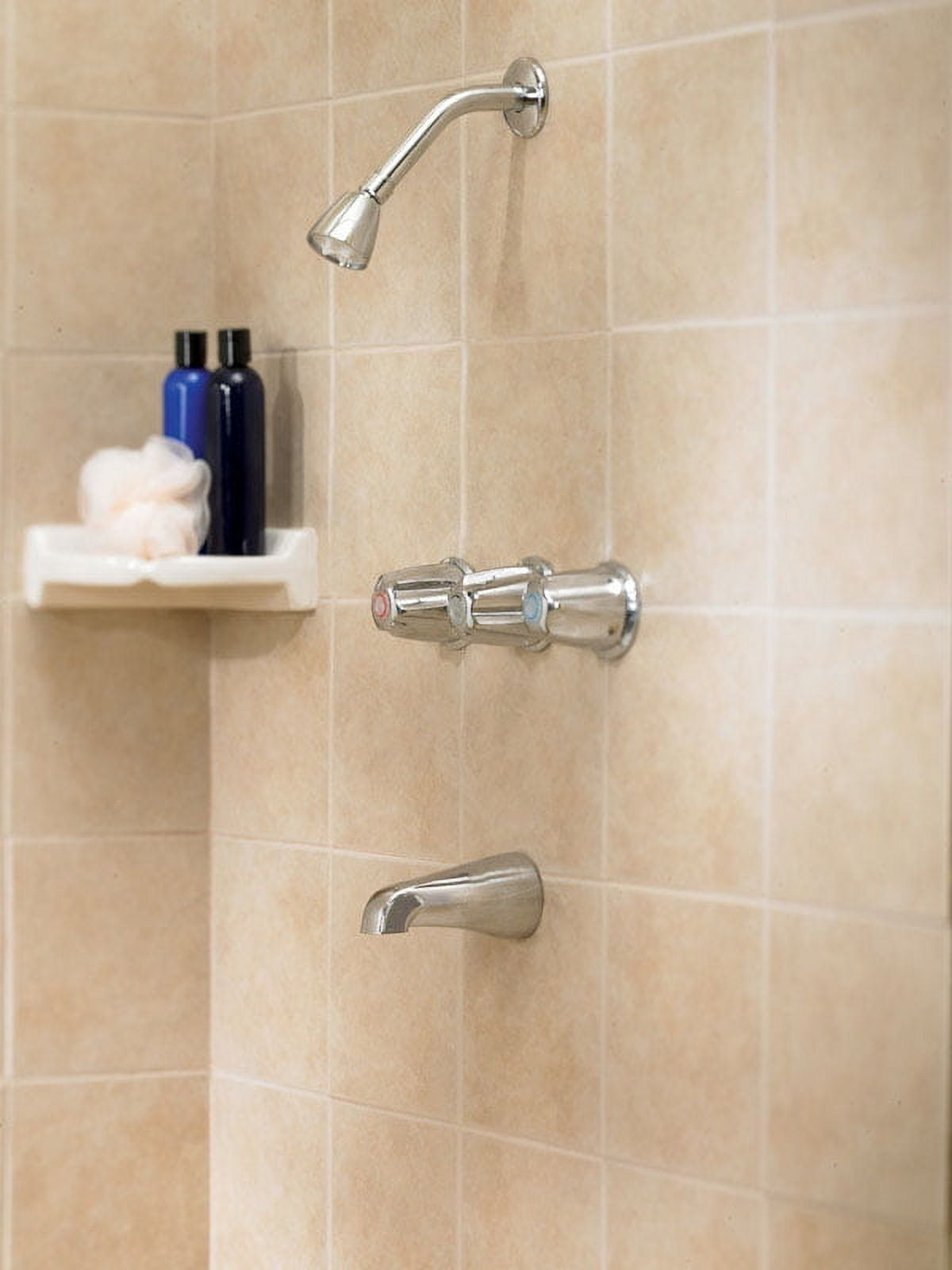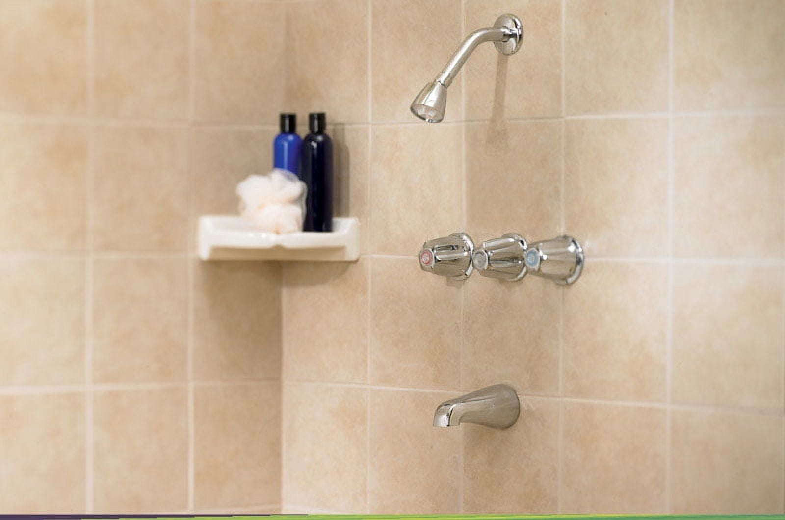 Three handle design for easy control of water flow and temperature Single-function showerhead Diverter tub spout included. 3 Metal Handles Washerless cartridge helps prevent leaks Limited Lifetime Warranty