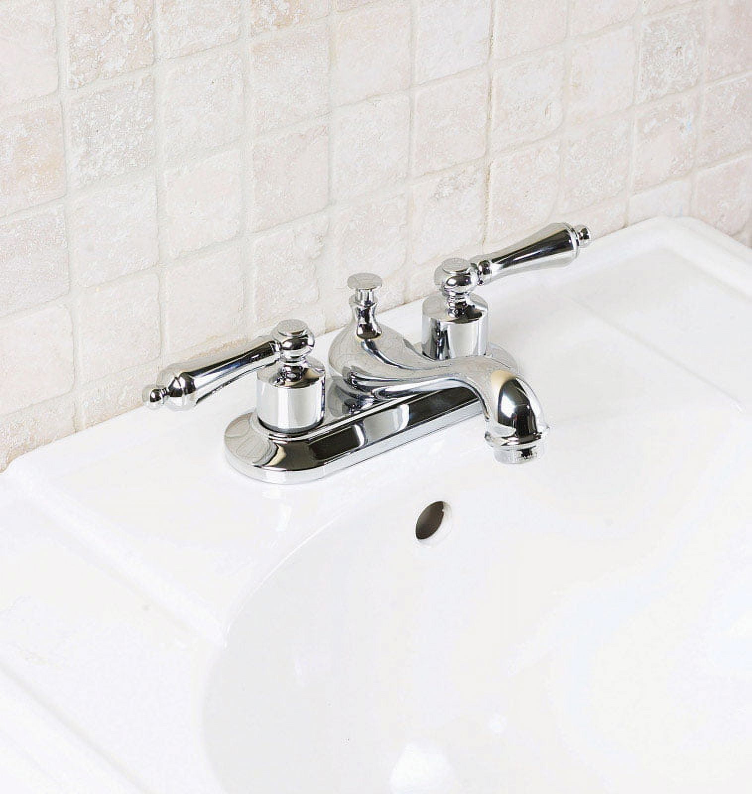 Polished Chrome Finish 3 hole – 4″ center set installation Featuring the Oak Brook Quick Pop-up drain assembly for quick and simple installation Washerless valves help prevent drips Limited Lifetime Warranty ADA Compliant