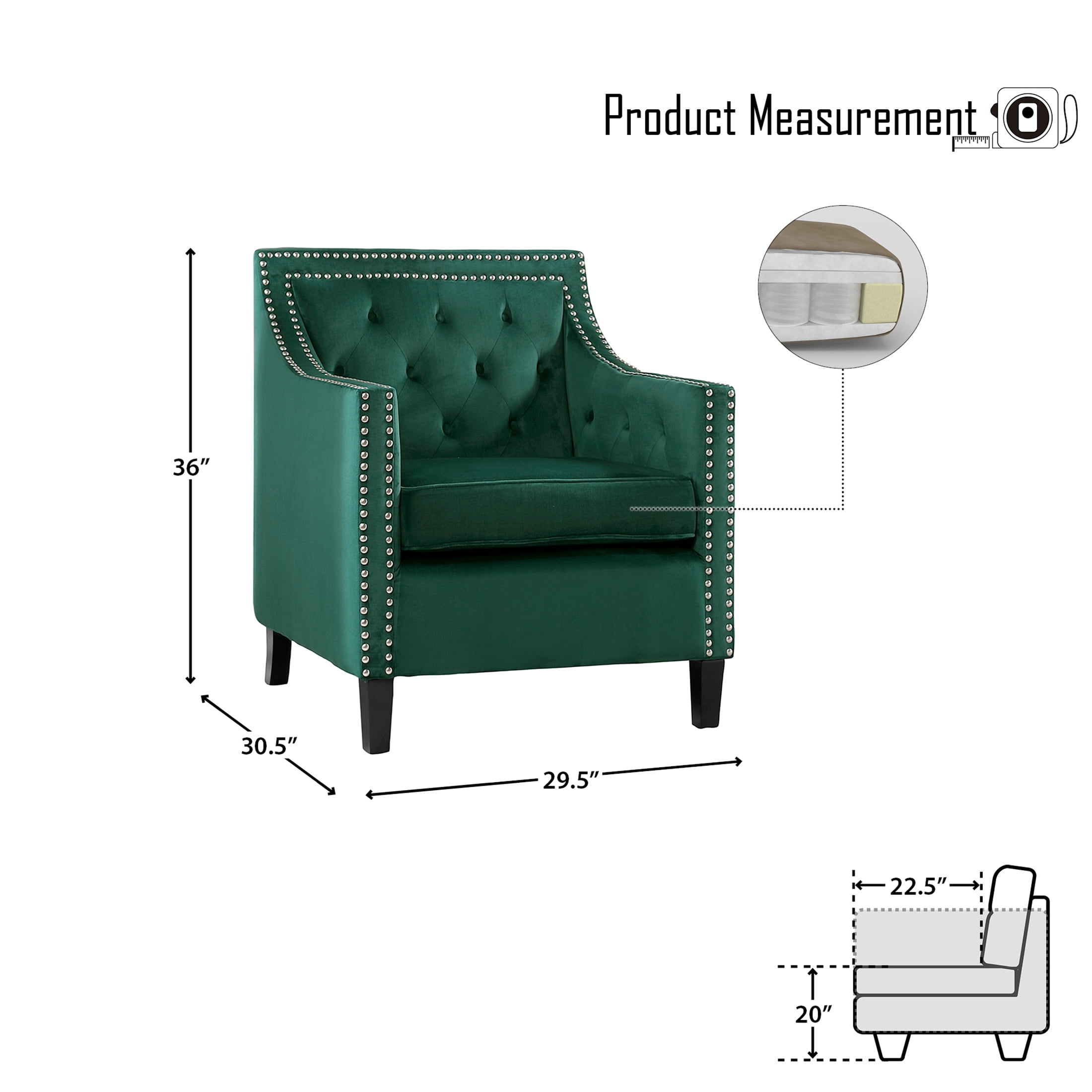 Accent Chair / Armchair Pine wood and plywood frame Forest green velvet fabric upholstery Sloped arms and straight back Diamond button tufted back Chrome finished nailhead trim Black finished rubber wood legs Cushion Construction Back Cushion (Attached): Foam; Seat Cushion (Reversible): Pocket Coil; Foam; Dacron; Product Dimension Overall Dimension: 29.5 x 30.5 x 36H inch Seat Width: 21.5 inch Seat Depth: 22.5 inch Seat Height: 20 Inch Other Specification Weight Capacity: 300 lbs Assembly Required: Yes Shipping Information Piece(s) per Box: 1 piece Box(es) per Shipment: 1 box Doorway Width: 31 inch Product Care Instruction Clean with dry cleaning solvent only Latourell Collection Accent Chair Disclaimer Please allow 0.5-1 inch difference due to manual measurement Product color may slightly vary due to photographic lighting sources or your monitor setting Documentation Installation Manual