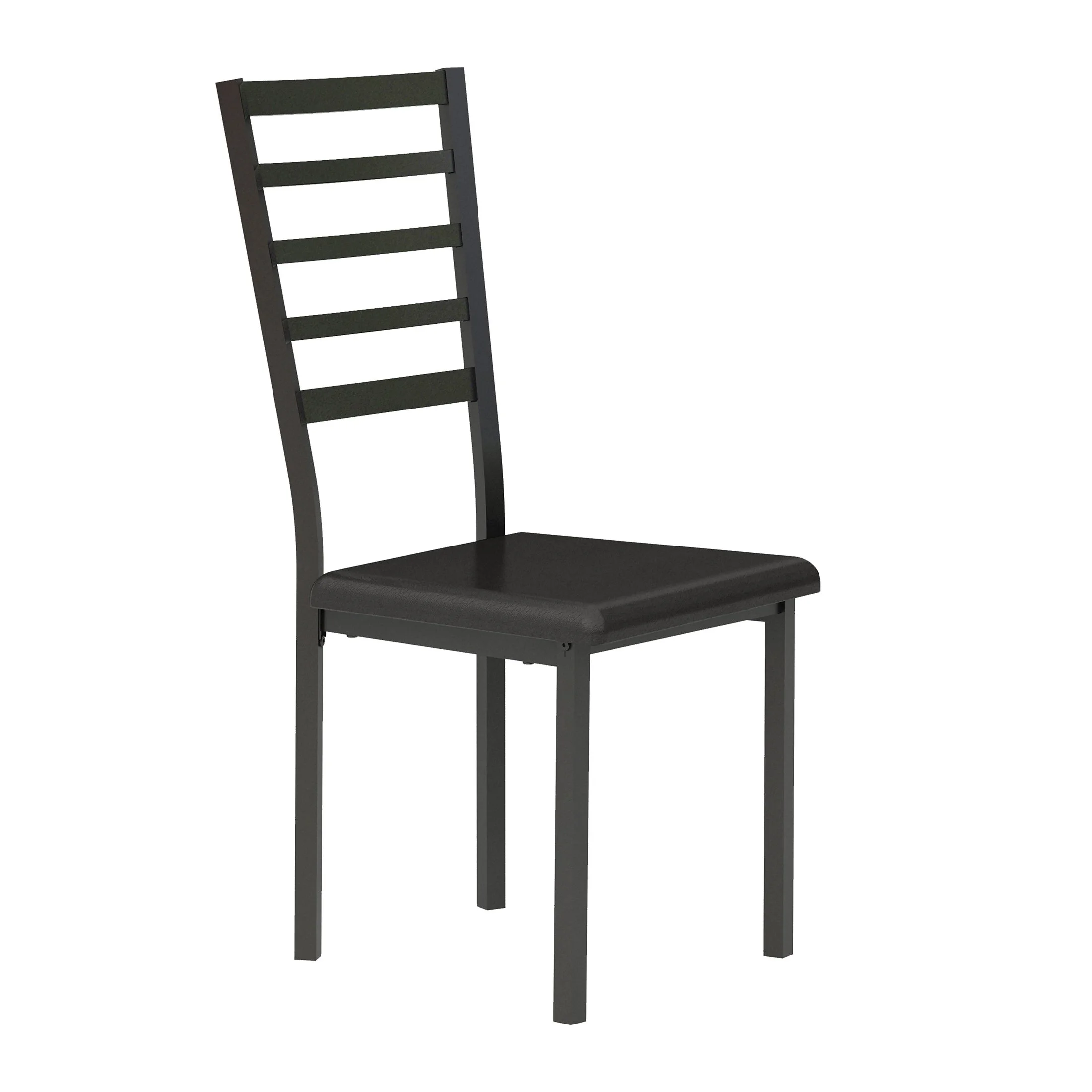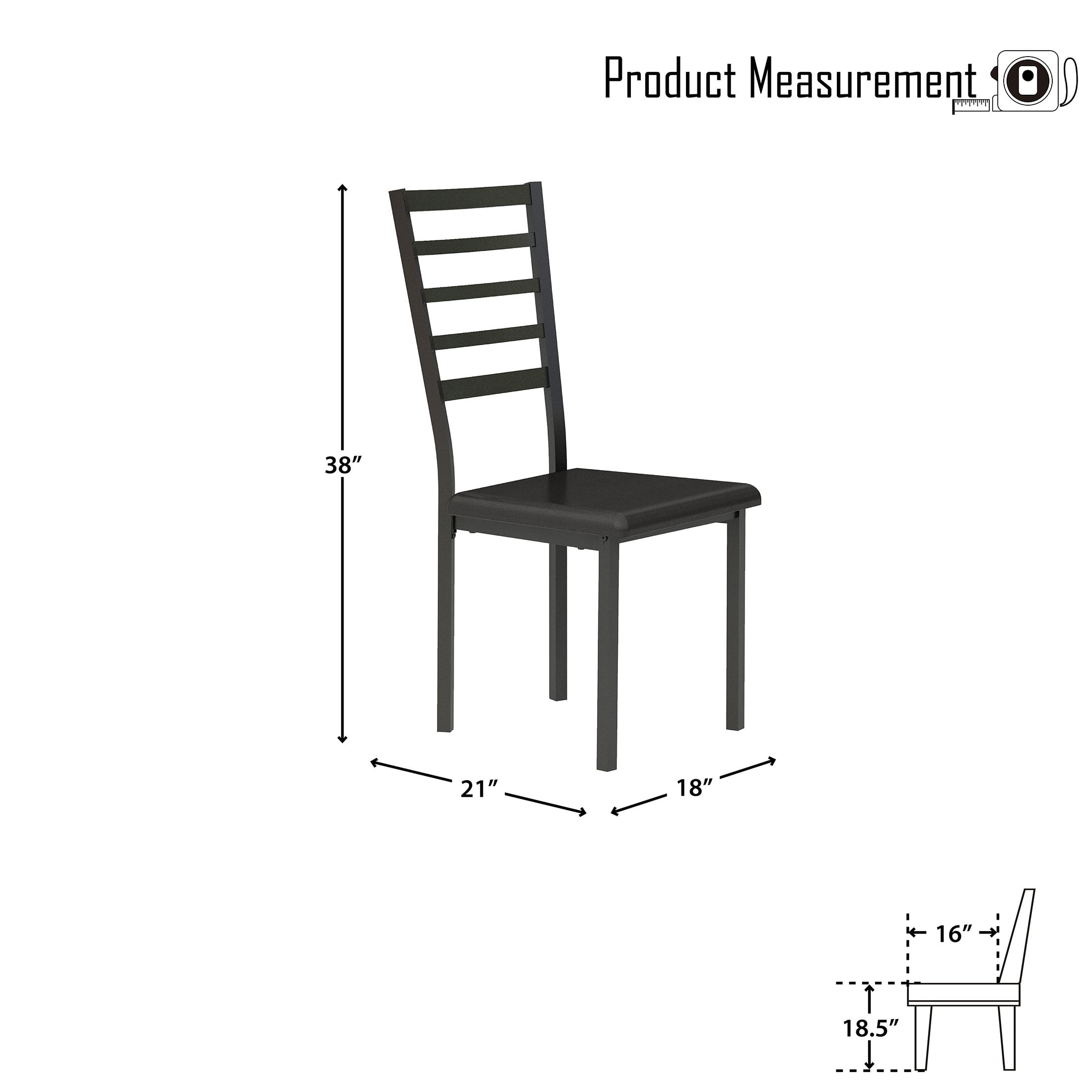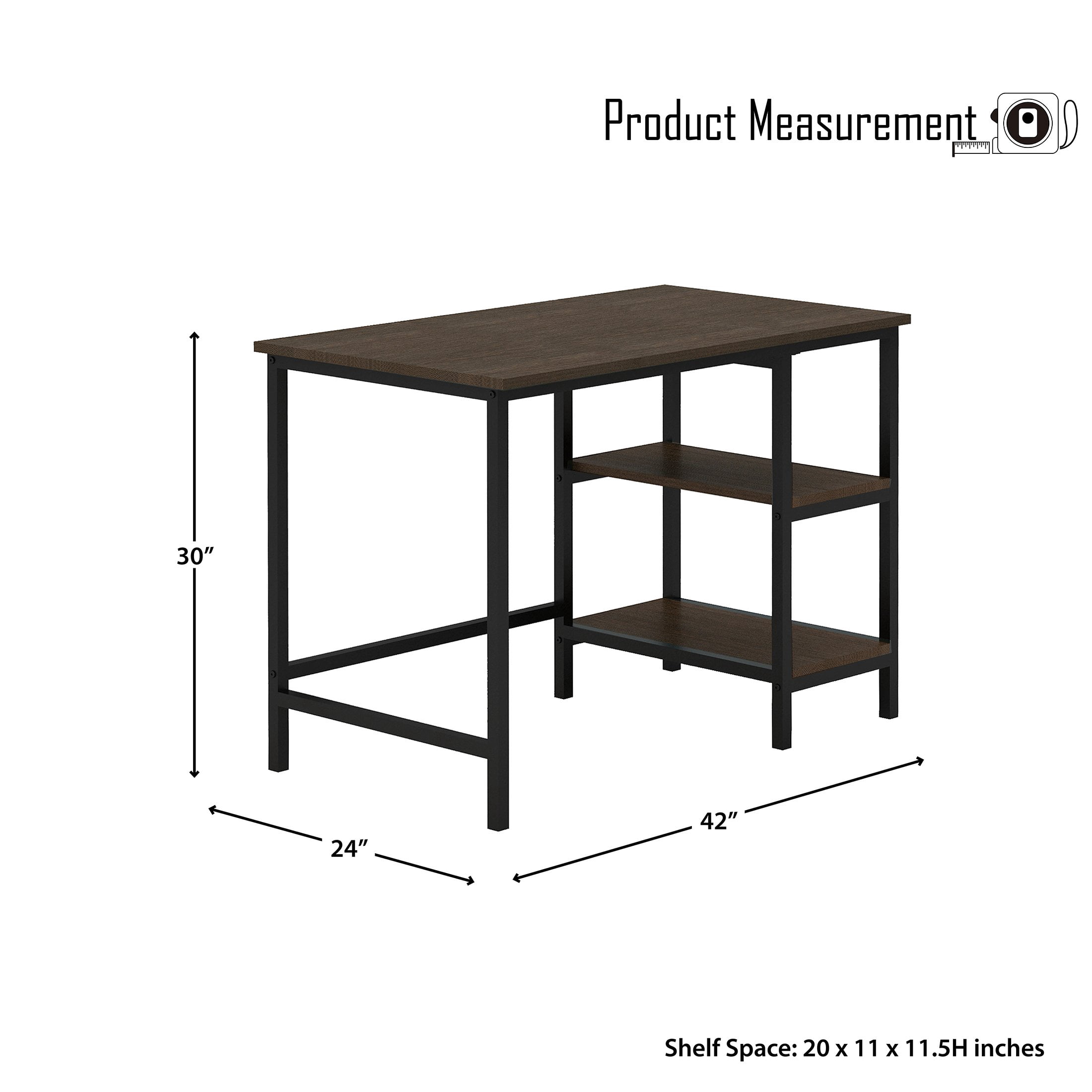 Writing Desk and Chair Set Includes (1) Desk and (1) Chair Brown vinyl wrapped wood board< Black metallic finished metal frame Black faux leather upholstered cushion Two (2) fixed open shelves at table base Ladder back chair with cushion seat Product Dimension Desk Overall Size: 42 x 24 x 30H inch Floor to Apron: 28.5H inch Leg to Leg Distance (Long): 27 inch Leg to Leg Distance (Short): 20 inch Open Shelf Space: 20 x 11 x 11.5H inch Chair Overall Size: 18 x 21 x 38H inch Seat Depth: 16 inch Seat Height: 18.5 inch Other Specification Weight Capacity Desk: 100lbs Chair: 250lbs Assembly Required: Yes Shipping Info Piece(s) per Box: 1 piece Box(es) per Shipment: 1 box Doorway Width: 6.5 inch Rory Collection Writing Desk and Chair Set Disclaimer Please allow 0.5-1 inch difference due to manual measurement Product color may slightly vary due to photographic lighting sources or your monitor setting Documentation Installation Manual