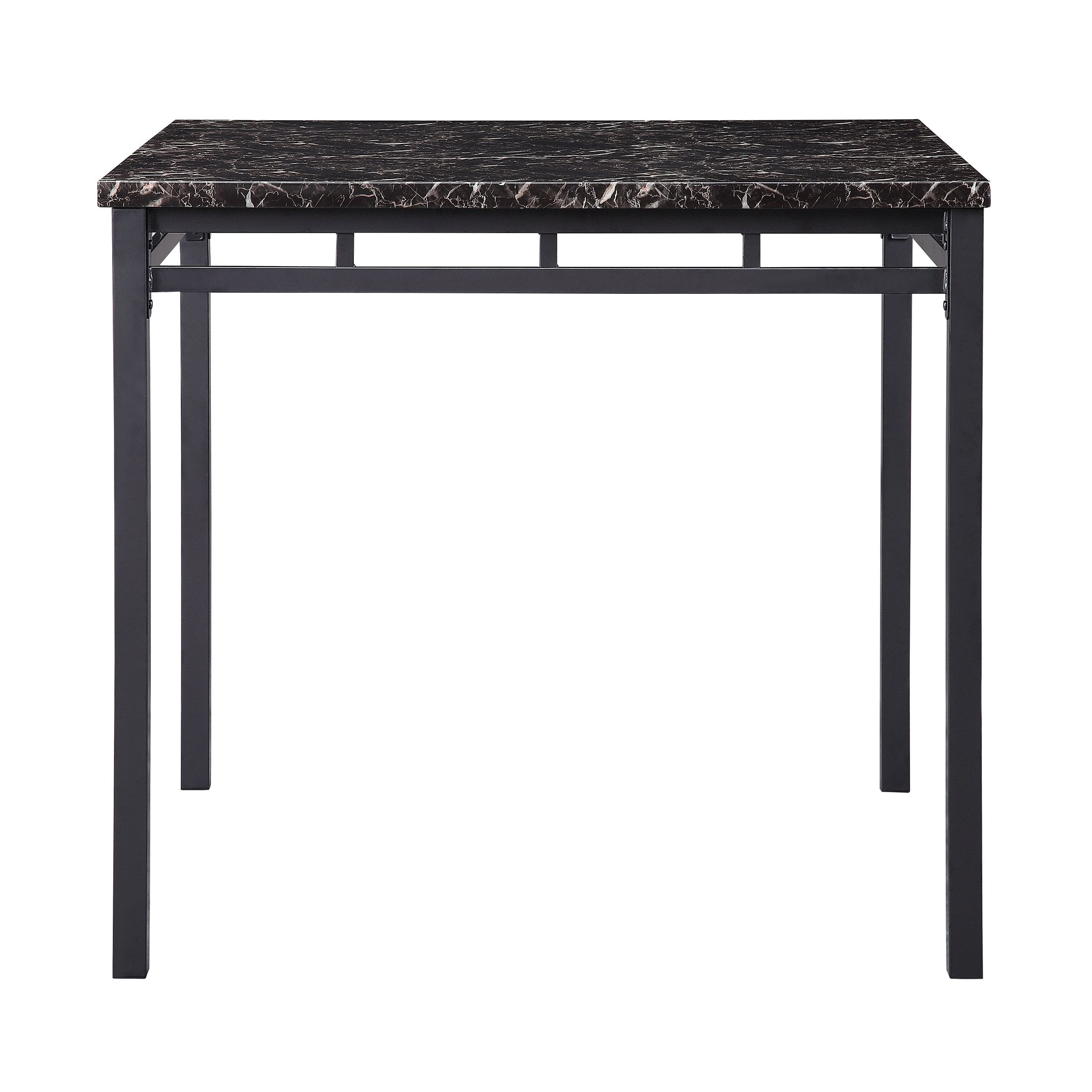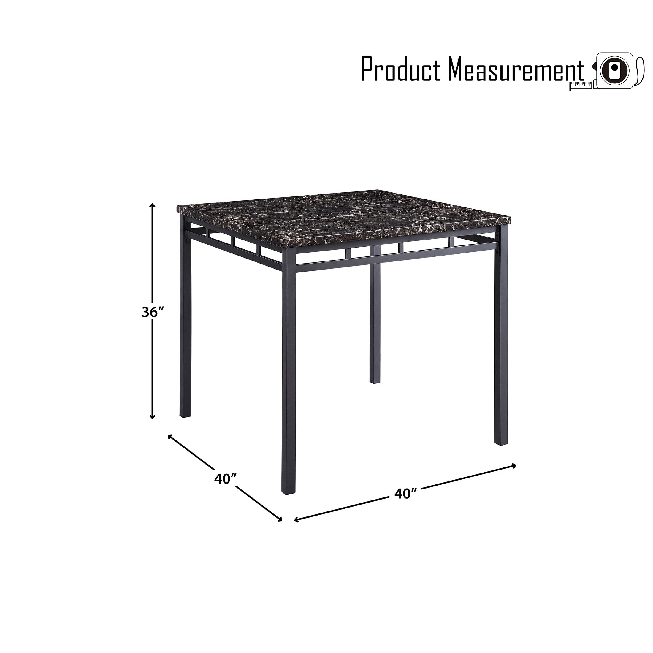 Counter Height Dining Set / Dinette Set Includes (1) table and (4) chairs Black finished metal frame The black faux marble tabletop Upholstered back and seat Dark brown faux leather upholstery Product Dimension Table Overall Size: 40 x 40 x 36 H inch Distance between Legs(Long): 36 inch Distance between Legs(Short): 36 inch Floor to Apron Height: 31 inch Stool Overall Size: 18 x 19.5 x 40.5 H inch Seat Length: 17.5 inches Seat Depth: 16 inch Seat Height: 24.5 inches Other Specification Stool Weight Capacity: 250 lbs Assembly Required: Yes Shipping Information Set(s) per Box: 1 set Box(es) per Shipment: 1 box Doorway Width: 9 inch Scottsbluff Collection Counter Height Dinette Set 5-Piece Pack Dinette Set Disclaimer Please allow 0.5-1 inch difference due to manual measurement Product color may slightly vary due to photographic lighting sources or your monitor setting Documentation Installation Manual