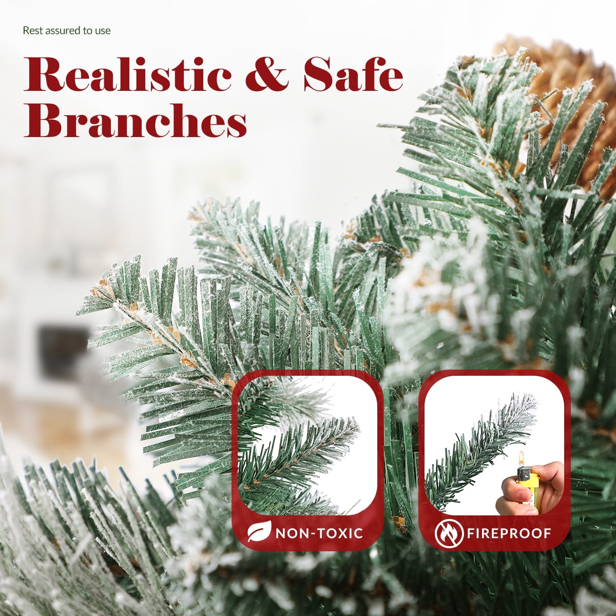 Standing at 6.5-Feet tall, 46 inch wide, this hinged Christmas tree is an eye-catching to stairs, living room or fireplace during the holidays Especially designed to capture the enchantment of a winter wonderland for your home, this tree is decked with warm tips green needles and large brown pine cones. The fresh green pine tips, dusted with snow for a crisp wintry ambiance, evoke cheerful images of family ski trips and snowball fights up in the Rockies. Its clear lights fill your home with an amber brightness. Pre-lit Christmas Tree with incandescent, warm white lights, ready to brighten up your room for the season OasisCraft Pre-lit Christmas Tree takes just minutes to set up and take down. The flocked Christmas with 1418 tips and 350 light and conveniently disassembles into 3 hinged sections for storage. Spend some time in Decorating with your family, memorize each moment in this lovely season. 7 self-support inventory covers 50 states on America. Fast delivery, Shipping soon. Provided 180-days Warranty, make you christmas without any scruple.