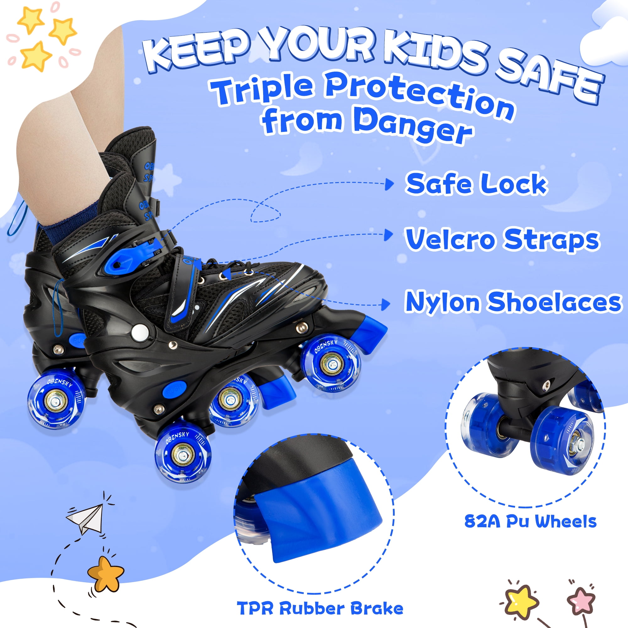4 SIZE ADJUSTABLE: Easy and concenient 1 push button to adjust different sizes, OBENSKY roller skates for kids toddler can be adjusted to 4 different sizes to fit different foot lengths easily. They are perfect choice for your kid’s growing feet. We have 3 sizes (S/M/L) for choosing, please must confirm the size before placing the order. 8 WHEELS ILLUMINATING: All wheels will shine when sliding. Especially at night, when your child puts on the quad roller skates, it is absolutely hard to resist the feeling like a star, and he will more confident and thrilled. The most convenient thing is that the wheels’ light are self-generated without any battery required. DURABLE & COMFORTABLE: Designed with triple protective, strap, buckle and shoelace are together to keep feet in the most comfortable position, give more support to your ankle, reduce fatigue and ensure safety. 82A PU wheels and ABEC-7 bearings are durable that re perfect for both indoor rink use and outdoor street skating. Procide safe ankle support and protece you along the way. PERFECT GIFTS for KIDS: Beautiful gift box packaging, exquisite cartoon pattern design, unique shining fabric, fashionable color matching, this is our roller skates. Which is lovely and dazzling, be loved by boys and girls, Designed with two row wheels are more stable and easy for kids beginners, That exactly a best gift for kids or friends in birthdays, holidays and special enents. BEAUTIFUL STICKERS for FREE: This set inclueds the fun and colourful stickers. It is free for OBENSKY fans and colourful stickers. You can stick stickers on shoes or other places. make it your unique skates.