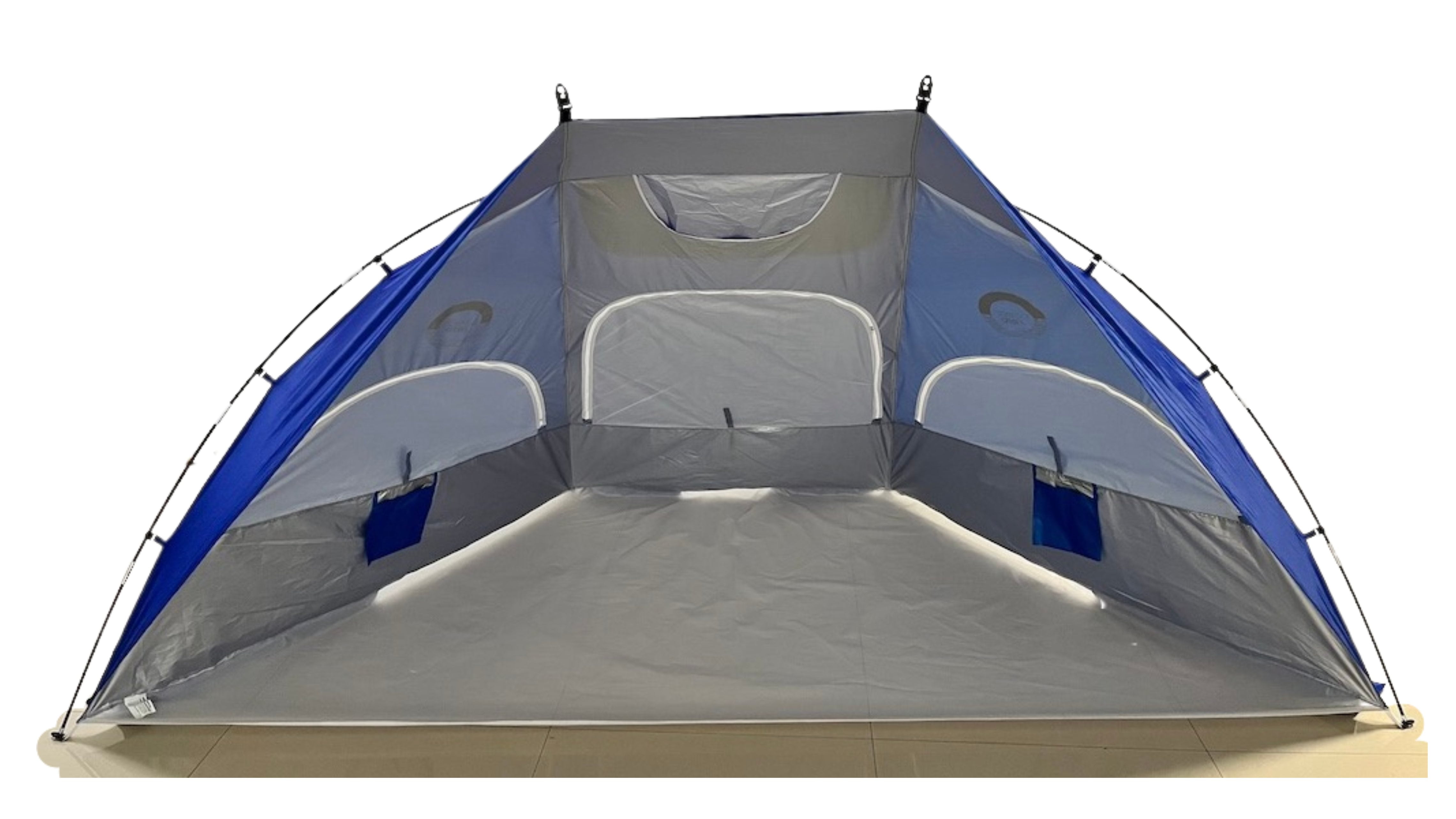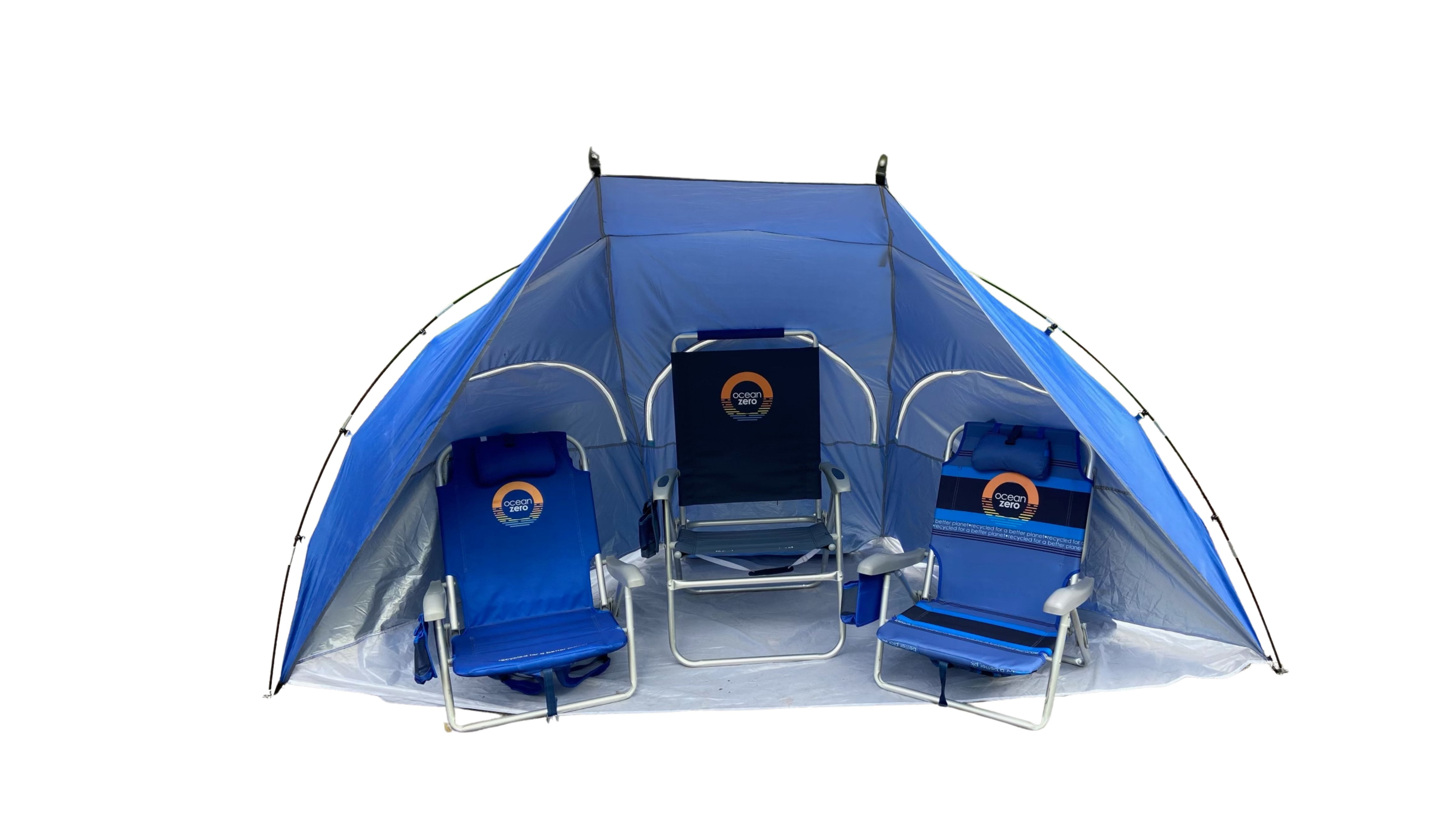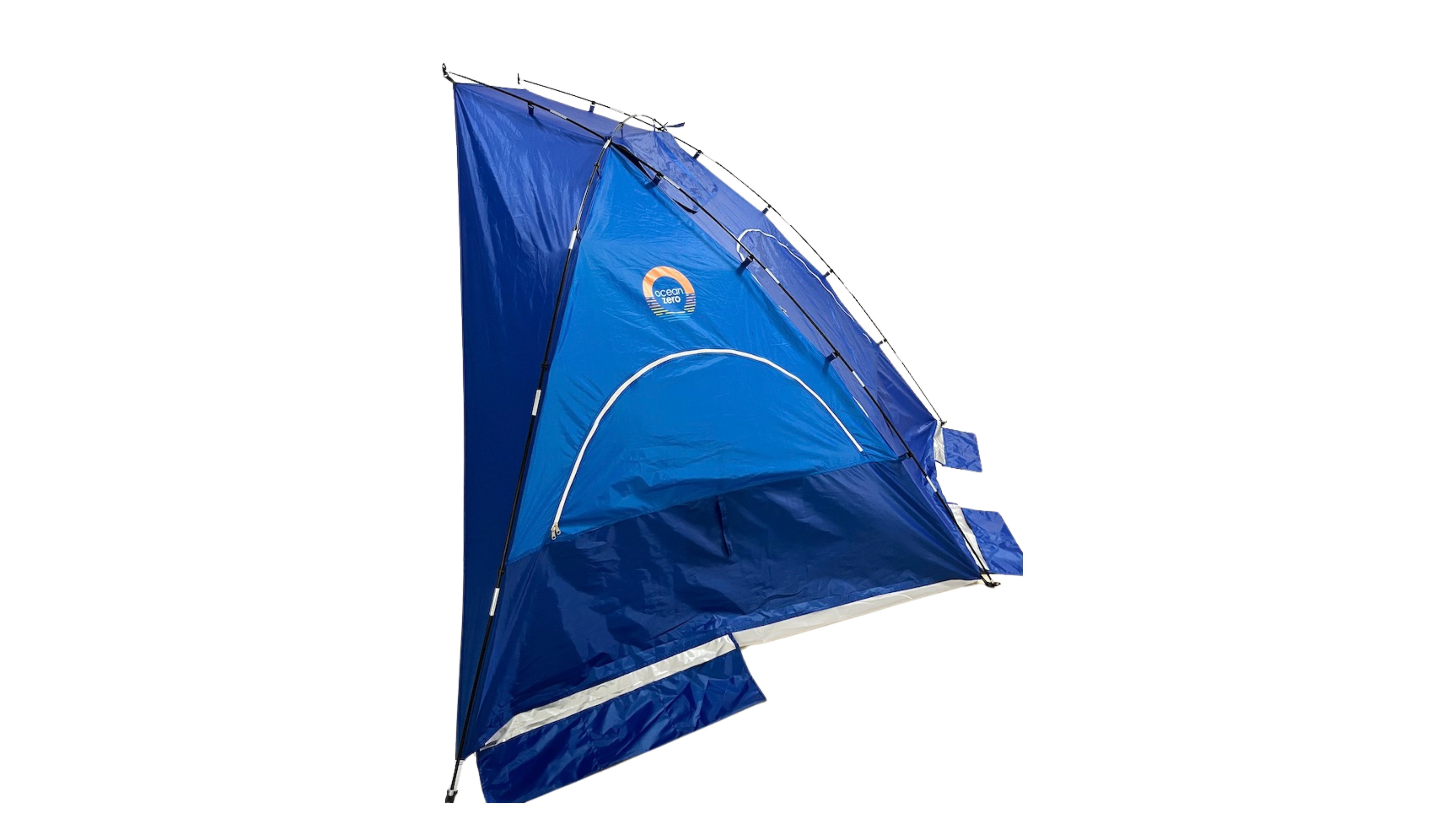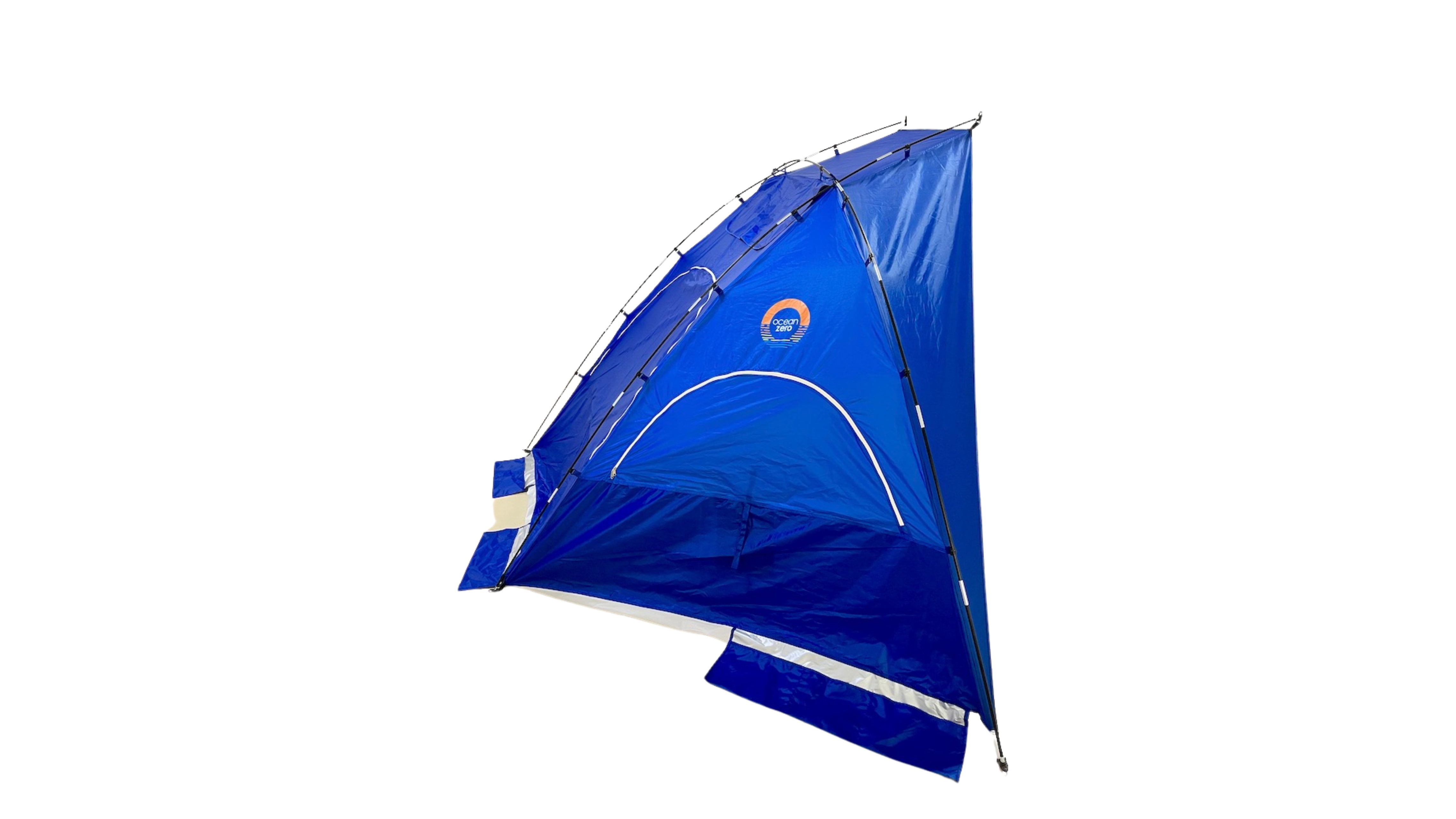 Ocean Zero Beach Shade Fabric and plastic parts are made from 100% post consumer, recycled plastic UPF 50+ Quick and easy to set up Carry bag with shoulder strap Spacious and can accommodate 4 people Three large zippered windows Wind vent Sand pockets to secure beach shade Storage pockets for personal items