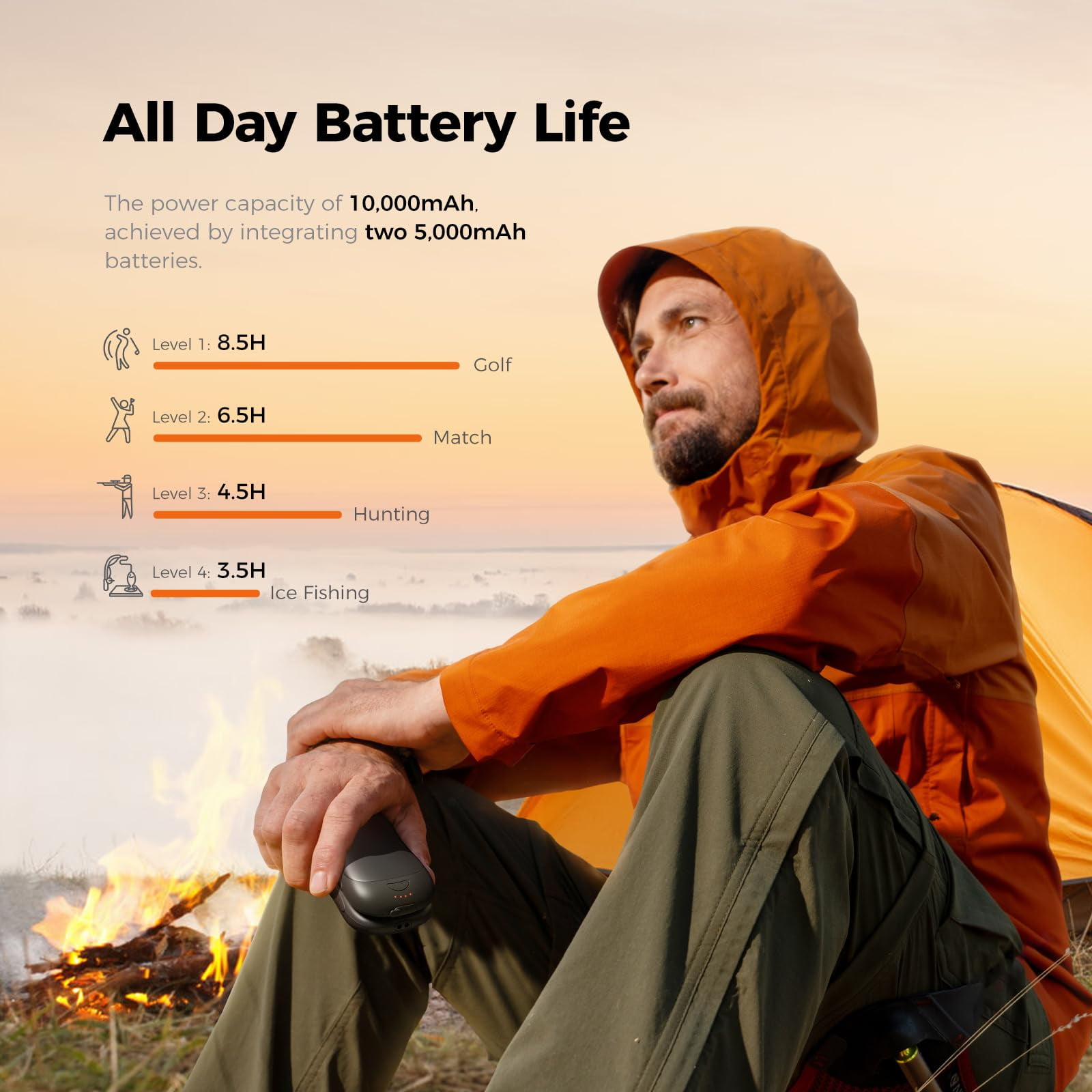 Upon snapping,the external side continues to heat while the internal heating is paused. When separated, both sides of each one activate heating, providing all-around warmth. UT3 PRO offers 4 levels of heating, from 100℉ to 138℉, to meet your needs in all conditions. The heater will remember the level you last chose, so you can easily turn on the same heat again. A dual purpose, UT3 PRO is also your portable powerhouse! Armed with a 5v USB-A charging port and producing a 2A max output, it can charge your phone up to 3.5+ times at full capacity. Your smart watch, earbuds, lighting, and more can be charged. Each piece of UT3 PRO is equipped with a 5000mAh rechargeable battery, which allows it to create a large heat output run time of 8+ hours on low, 4.5+ hours on medium and 3+ hours on its highest heat setting, varying by conditions. Excellent experience in every aspect. Safety certified temperature control chip, a single ergonomic button for all operations, a dust-resistant USB cover, and a silicone wrist band are all included. Through hundreds of refinements, Just for a comfortable grip. You’ll have an awesome grip feel a with velvety smoothness surface and slim waist in hand.