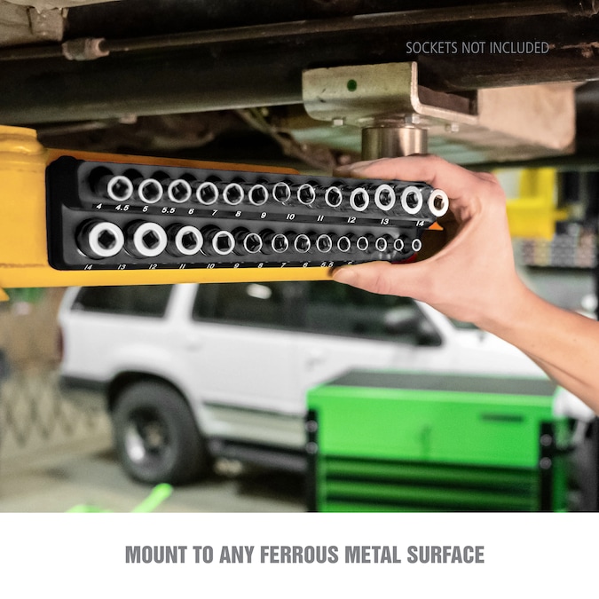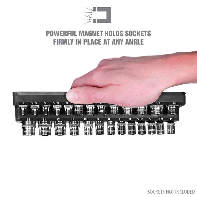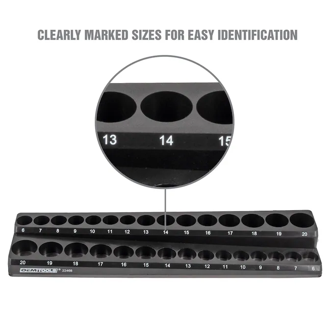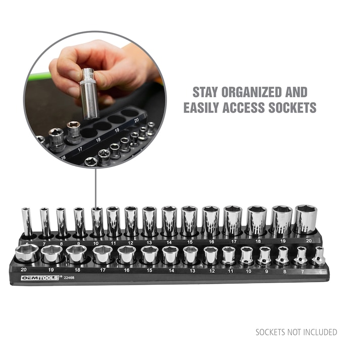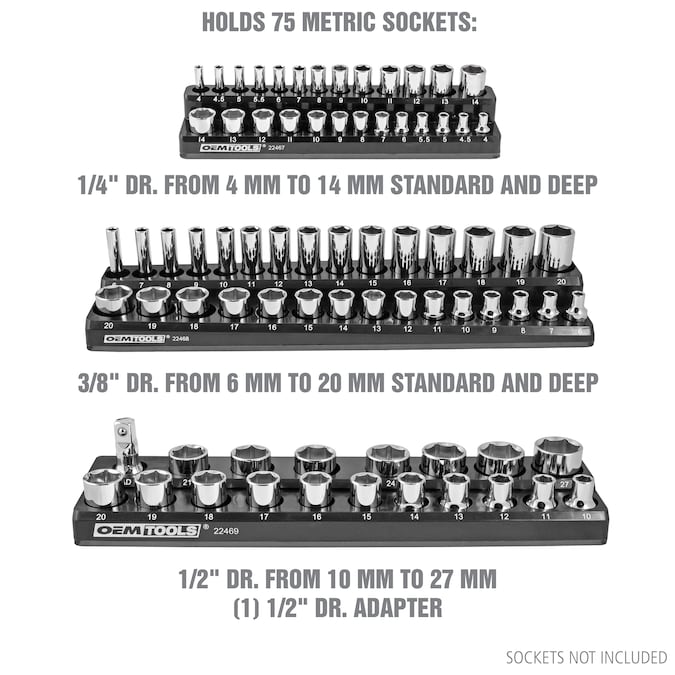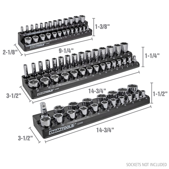 No more sockets rolling around in your drawers. Find the socket you need fast and keep all your sockets organized within an arm’s reach with OEMSTOOLS magnetic socket organizers. This three-piece set holds up to 68 sockets in 1/4 in, 3/8 in and 1/2 in drives. The powerful magnet keeps your sockets and the socket organizer tray from shifting in the drawer. Use the individual tray as a socket holder on the site. Strong magnetic backs on each tray will stick to any metallic surface, including your toolbox, wall board or creeper seat. The non-marring base protects metal surfaces from scratches and dings. Locate the socket you need quickly. All socket trays are clearly marked with individual sizes for deep and shallow sockets.