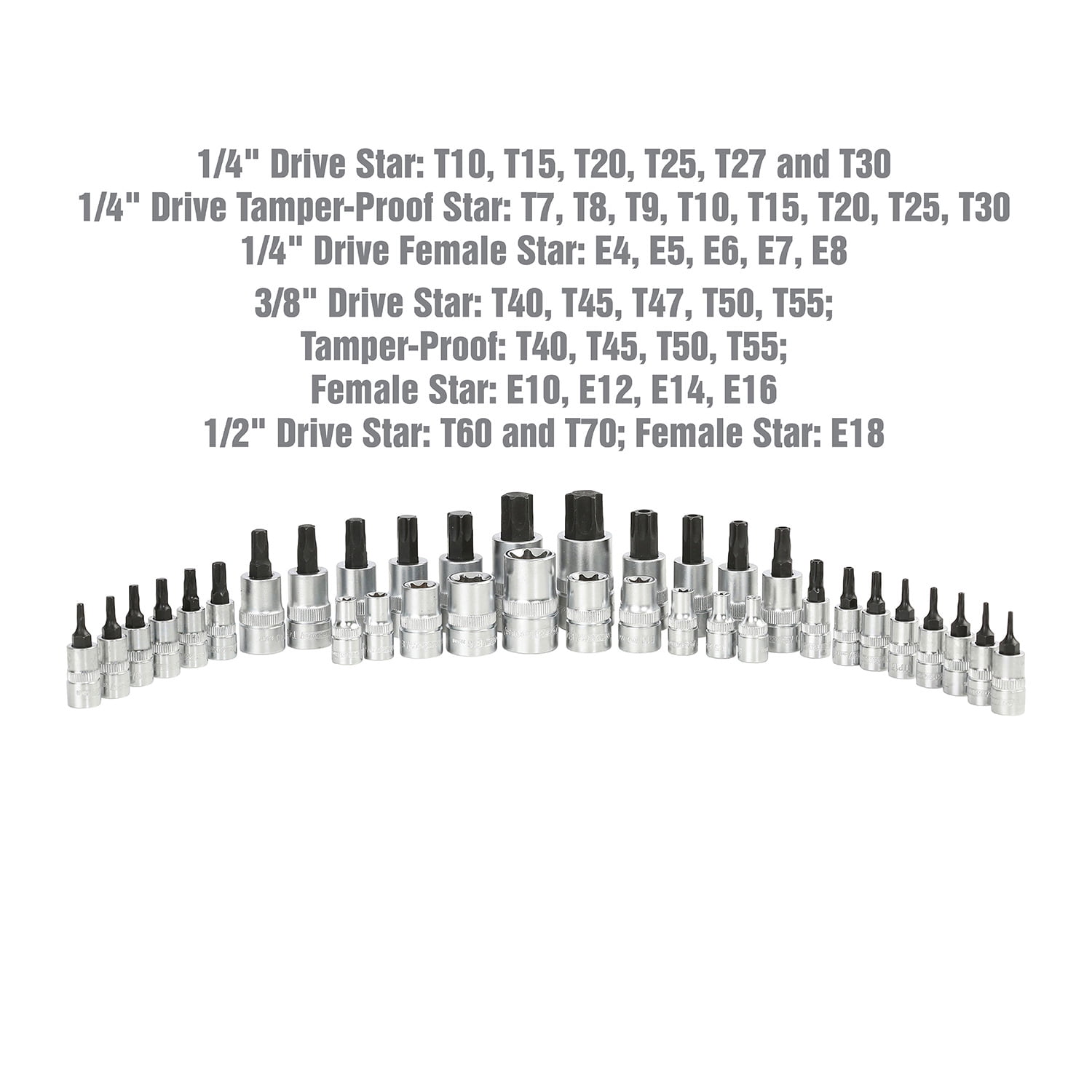 The OEM TOOLS 35 Piece Multi-Drive Star Socket Set comes with a variety of star sockets for the most common jobs. This socket set comes in an EVA Tray, which is a tough tool box foam organizer, and this green socket organizer is designed to fit securely in your cabinet or tool box. Our OEM socket organizer seats each socket perfectly, so you’ll never need to worry about dislodged sockets due to tool box movement. And the OEMTOOLS Socket Tray features custom tool-shaped cuts in a Hi-Vis green, making it noticeable when a star tool is missing. The OEM tool socket organizer also includes marked sizes for easy identification of the right socket for the job. Each socket in our torx socket organizer set is made with a heat-treated alloy steel for more strength and longevity, and sockets in this torx socket tray feature a satin chrome finish that is easy to clean, prevents rust, and won’t show prints. These torx socket sets have a no-slip design with off-corner loading for greater torque and more socket-to-fastener contact, which prevents fastener rounding. OEM TOOLS SOCKET SET INCLUDES: 1/4″ Drive Star: T10, T15, T20, T25, T27, and T30; 1/4″ Drive Tamper-Proof Star: T7, T8, T9, T10, T15, T20, T25, and T30; 3/8″ Drive Star: T40, T45, T47, T50, and T55; 3/8″ Drive Tamper-Proof Star: T40, T45, T50, and T55; 3/8″ Drive Female Star: E10, E12, E14, and E16; 1/2″ Drive Star: T60 and T70; 1/2″ Drive Female Star: E18.