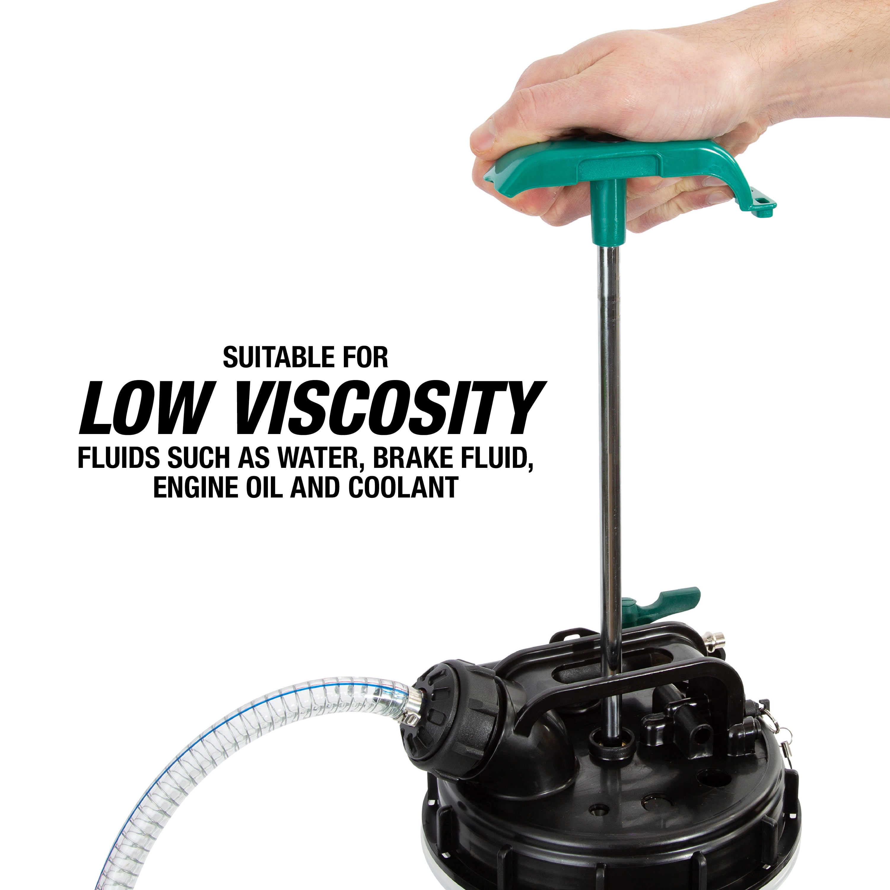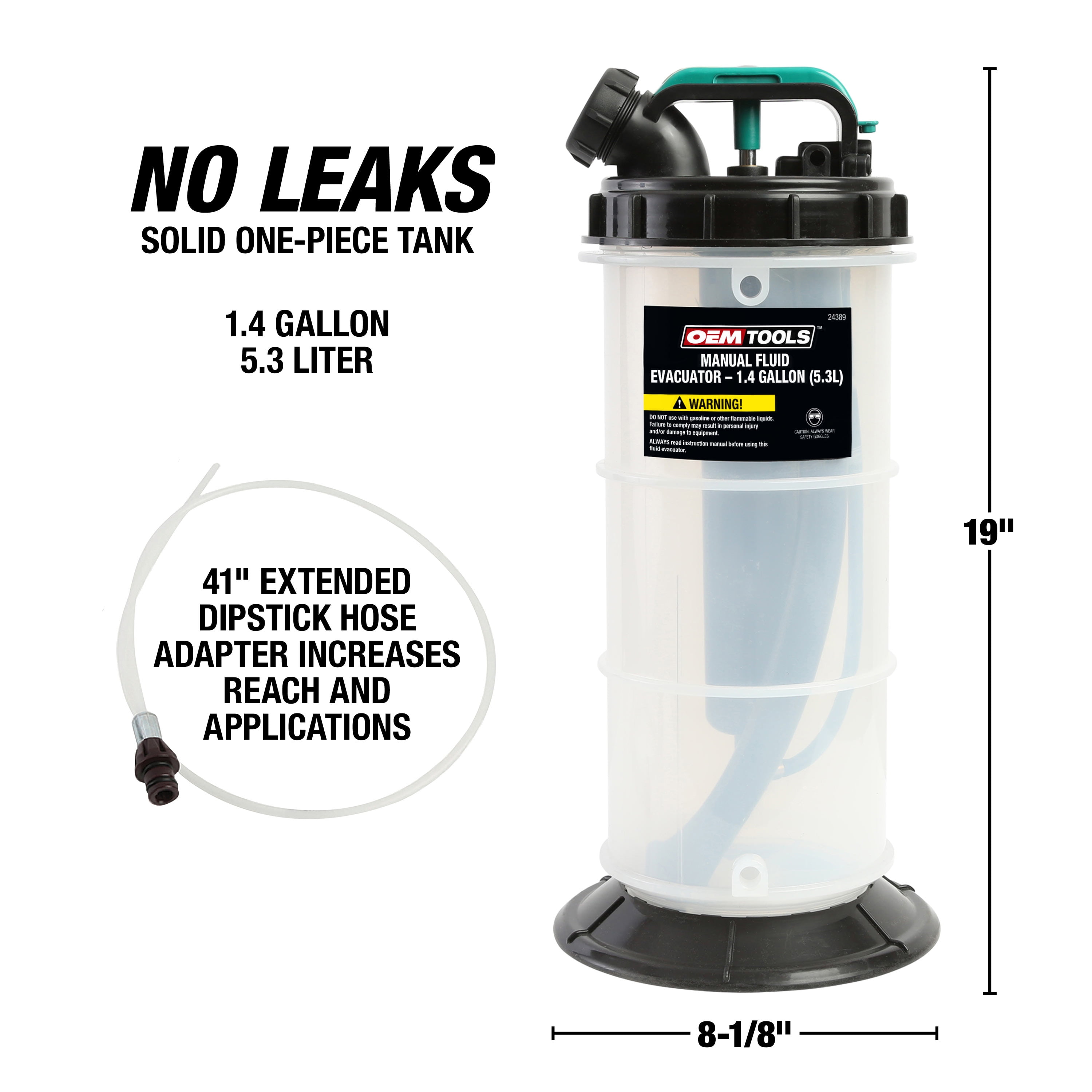 CAREFREE CAR AND BOAT CARE: This versatile fluid evacuator pump allows for the easy removal of engine oil, transmission fluid, power steering fluid, gear oil, coolant, and more EASY OIL CHANGE: No more crawling under cars for oil changes; This topside oil extractor pump pulls oil from the dipstick, allowing you to stay right side up the whole time MOVE FLUID WITH LESS MESS: The automatic shutoff valve and single piece construction are the cleanliness dream team, helping you keep the fluid off your floor. LONGER REACH: The 5 foot long flexible main suction hose connects to the improved 41 inch long dipstick hose adapter or to the 17 inch long suction hose adapter for plenty of reach PUMP FOR JOY: The manual extraction pump quickly extracts up to 1.4 gallons (5.3L); No compressed air is required for fast, easy, and effective fluid extraction Includes 5 Ft. of Flex Hose and (2) Dipstick Hoses Single Piece Structure Has Leak Proof Bottom Suitable for Low Viscosity Fluid Such as Water or Coolant Overflow Shutoff Valve Prevents Fluid from Overflowing Oversized Handle for Easy Use
