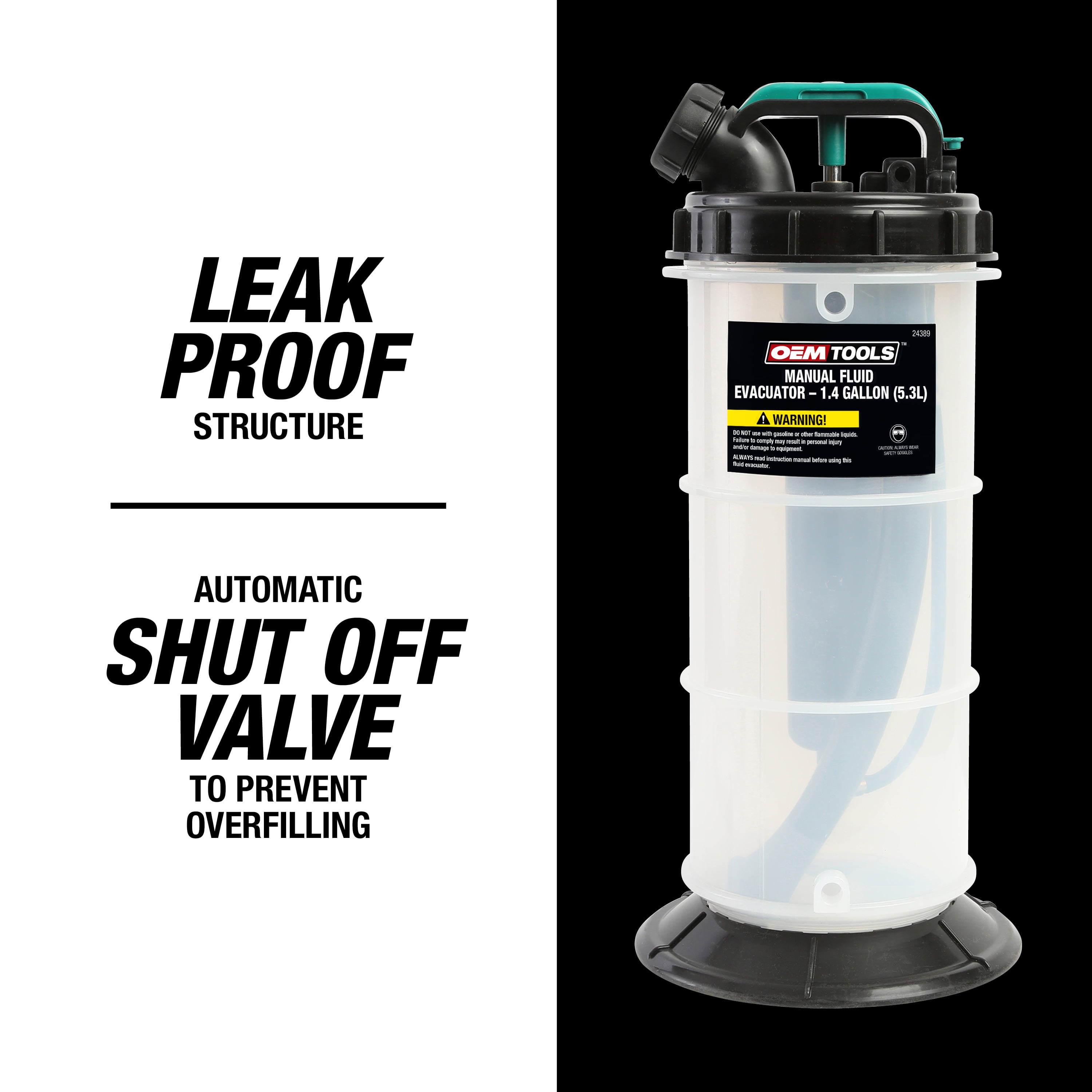 The OEMTOOLS 24389 Manual Fluid Extractor is built for easy fluid removal, holding up to 1.4 gallons (5.3L) for car and watercraft applications. This handy vacuum pump simplifies oil changes by pulling out engine oil, transmission fluid, power steering fluid, gear oil, coolant, and more—all without going under the vehicle. Simply insert the tube into the dipstick for a quick, standing operation. With a 5-foot main hose, a 41-inch dipstick hose adapter, and a 17-inch suction hose, this tool offers great reach. Its one-piece build and automatic shutoff valve prevent spills, keeping your workspace tidy. The OEMTOOLS 24389 is a top choice for clean and easy fluid extraction.