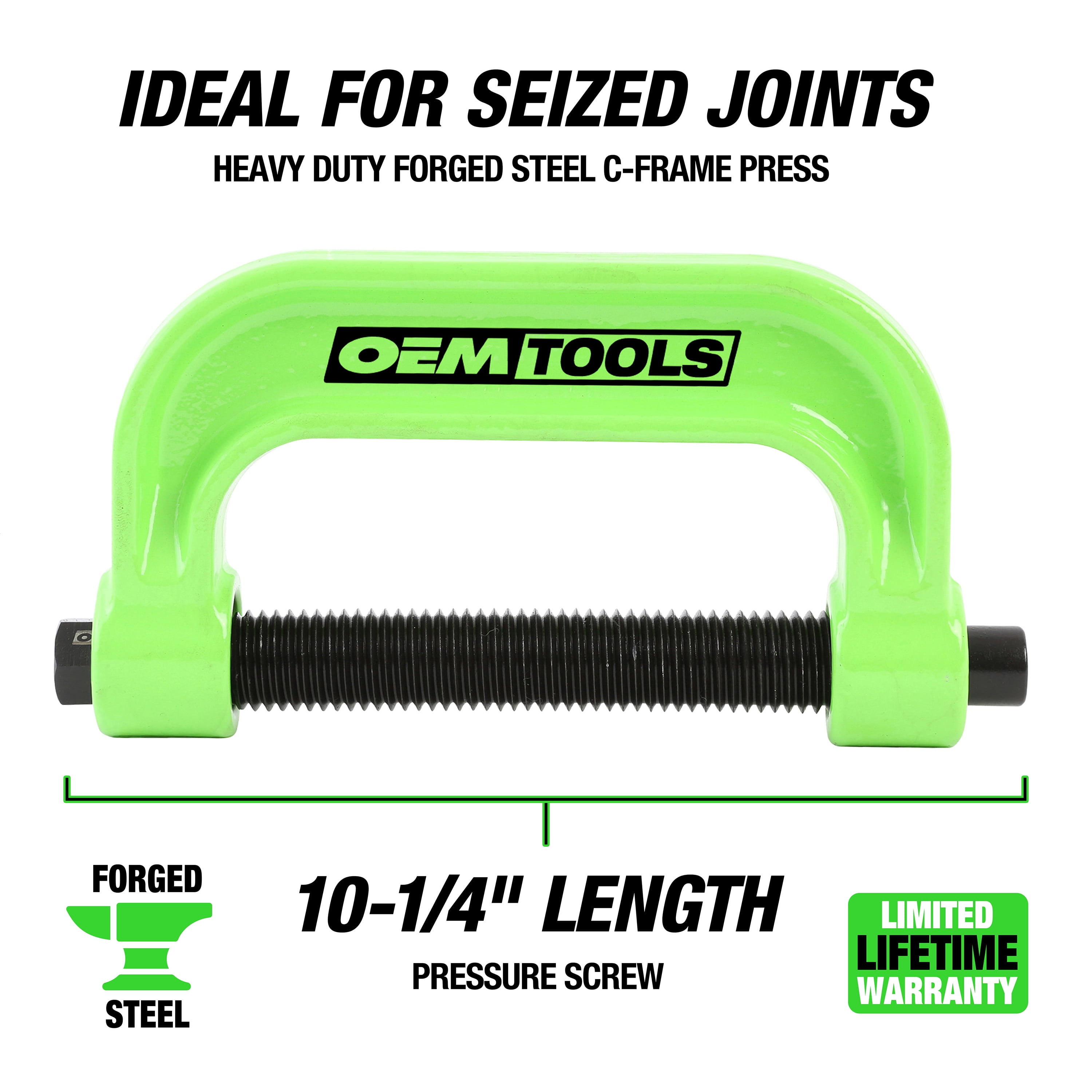 Remove and Replace Ball Joints on Many Vehicles Same as the OEMTOOLS Ball Joint/U-Joint Press Set 27023 with the Addition of the Adapters Needed to Remove and Install the Upper and Lower Ball Joints on 1/2 to 3/4 Ton 4 Wheel Drive Vehicles Equipped with the Dana 44 Series Front Axle (1967 and Newer) Rust Resistant finish on All Parts Includes Adapters to Service 1/2 to 3/4 Ton 4 Wheel Drive Vehicles Equipped with Dana 44 Series Front Axle Forged C Body for Toughness C-Clamp Frame Press Also Removes and Replaces U-Joints