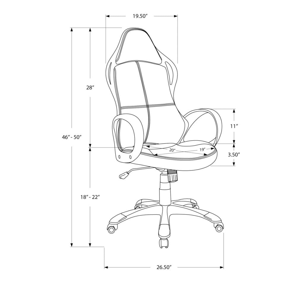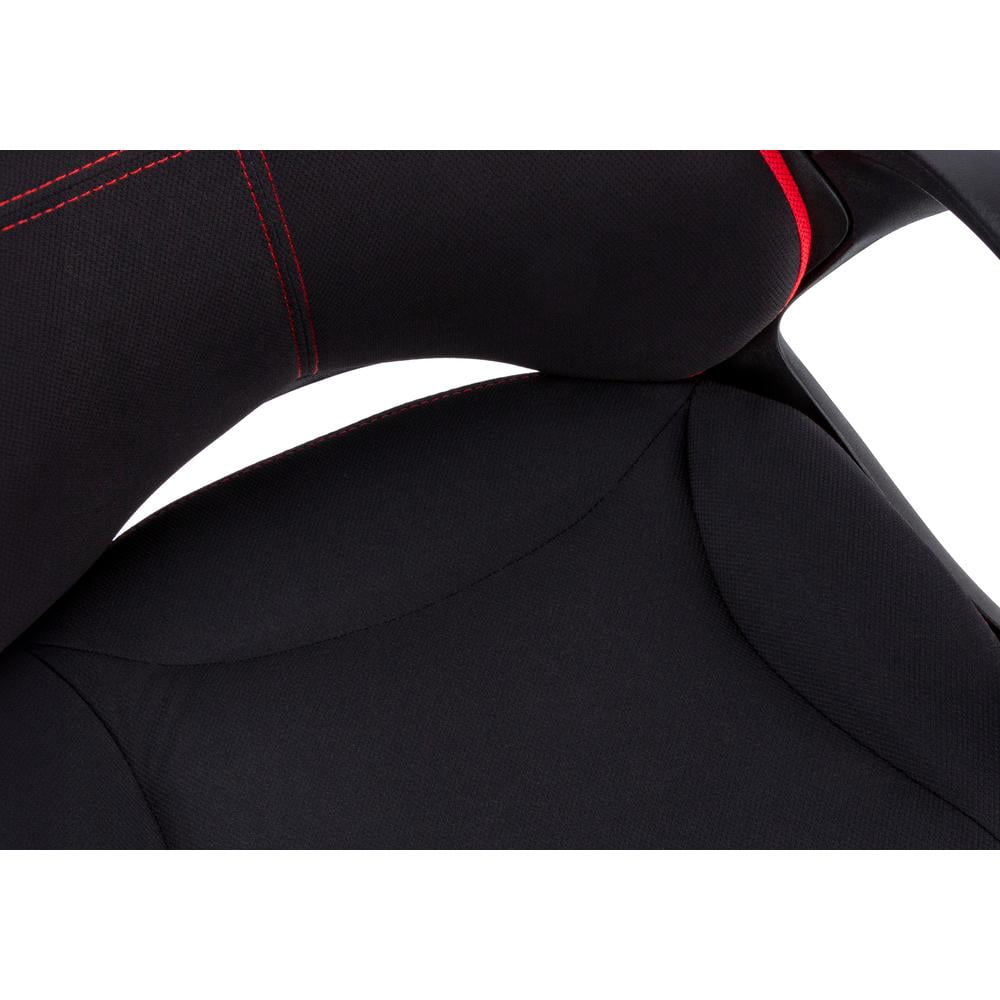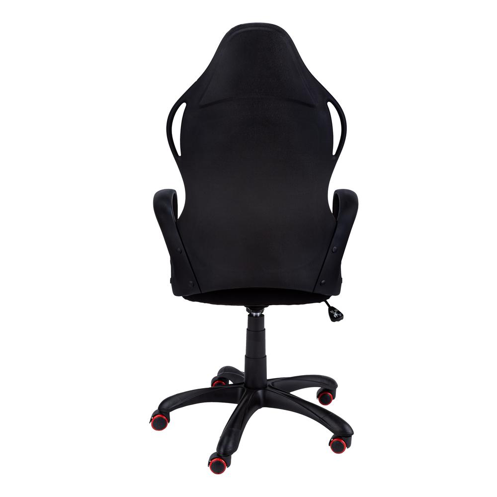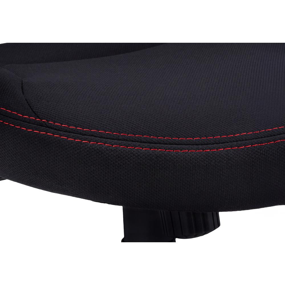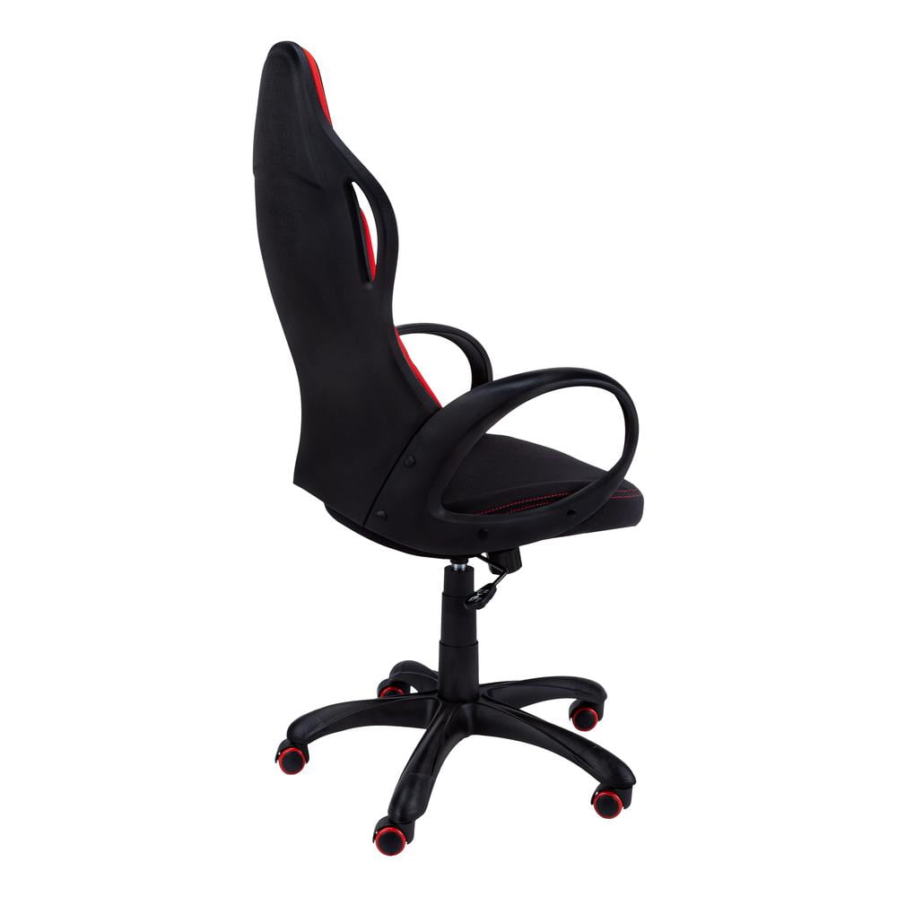 This racing-style office chair puts you in the driver’s seat as you navigate between work and play. Generous padding on both the wide, extra-tall backrest with an integrated headrest and the thick, wide, extra-deep seat give this adjustable-height gaming chair a soft feel so you can sit comfortably for long periods. The black 5-star base with casters, swivel seat, and tilt function let you control the movement of the chair while you remain seated. With rounded, fixed armrests and bright red accents on the backrest, seat, and wheels, this high-back desk chair with black fabric has a slick look that is ideal for a game room, man cave, or home office. Features: Finish: Black and Red Material: Foam, MDF, Metal, Nylon, Polypropylene, Polyester Blend BIFMA certified for home or commercial use Adjustable seat height with tilt back lock-in / free mechanism for supreme comfort Upholstered in durable and breathable thick black polyester with red accents Ergonomic, sleek modern design with curved back support and thick cushioned seat 5 hooded nylon castors on a metal base for easy mobility Specifications: Product Dimensions: 46″ H x 25″ W x 25″ D Product Weight: 31 lbs
