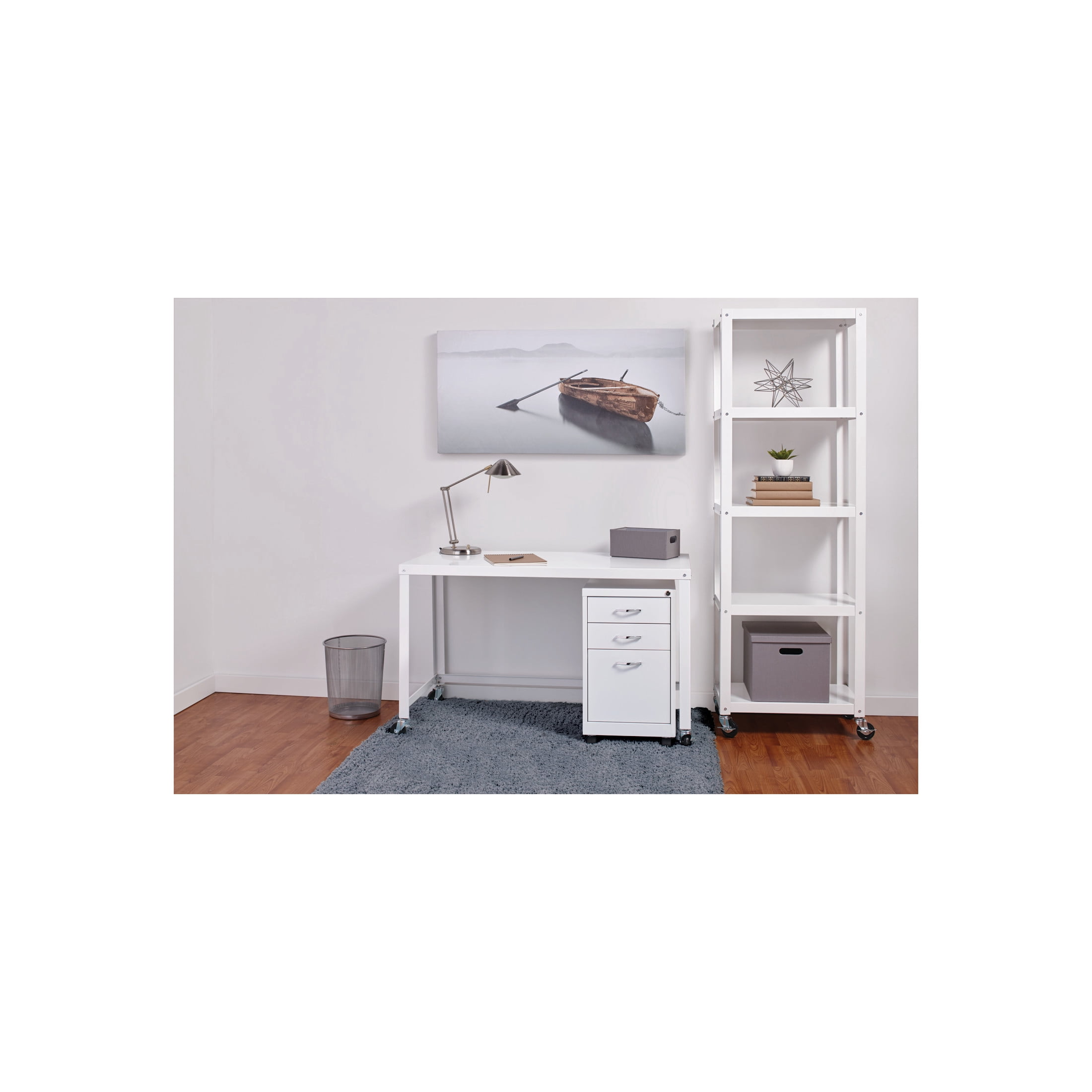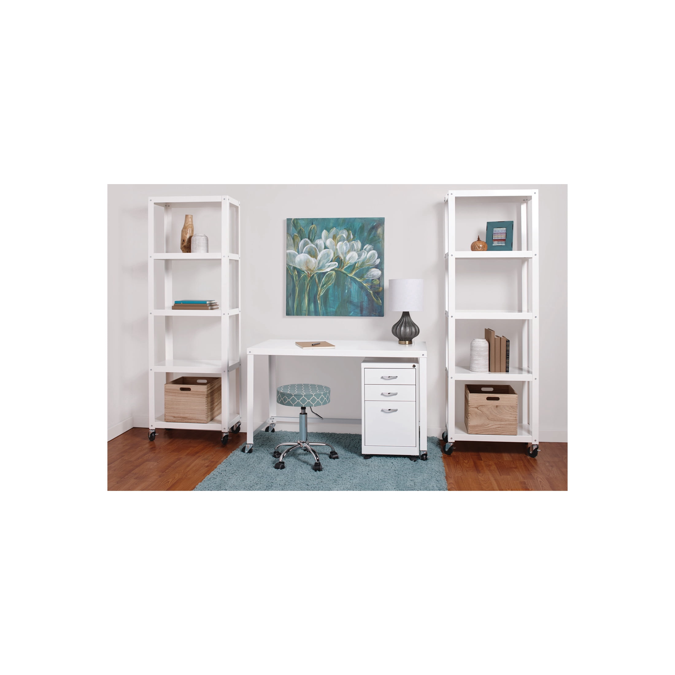 Sleek design provides substantial yet stylish storage Durable steel construction for added support Wheels make it easy to move, two lock in place to stabilize Open shelving offers various storage solutions Easy to assemble Eco-friendly. Contains up to 30% recycled material Office Dimensions 72″ High Rolling 5 Shelf Bookcase, Industrial Metal, White