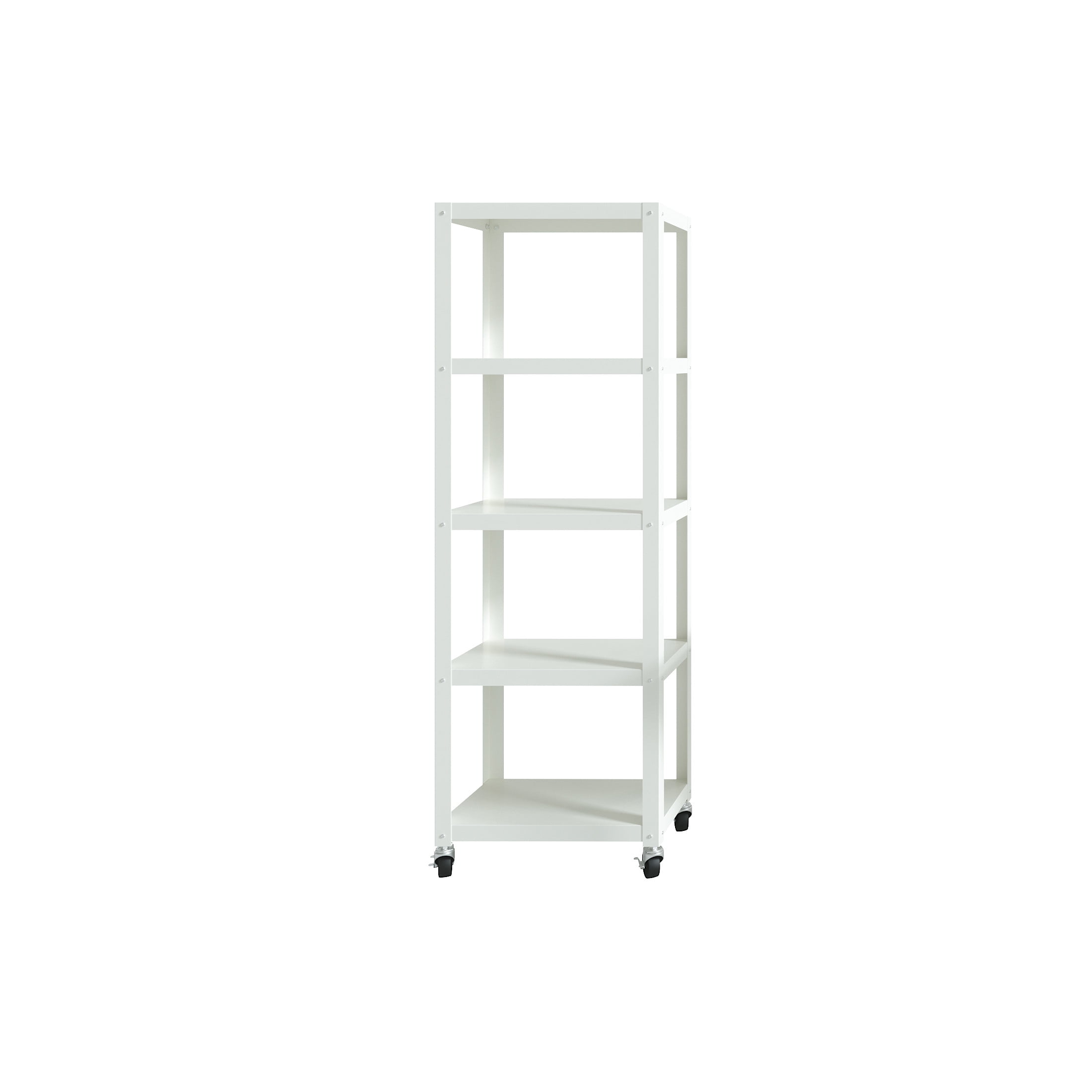 The Five Shelf Tower is great in any room. This steel construction heavy-duty shelving unit is durable enough for most uses and sports a modern design. It is an excellent storage solution for craft rooms, offices, kitchen, pantries, or more. Sized at 72″ x 24″ x 14″, this attractive and strong shelving unit gives you flexibility for whatever your storage and organization needs are. Whether you need a shelf for your printer, books, craft supplies, or additional kitchen storage, this 5-shelf tower is the answer. The additional wheels also allow this shelving unit to be easily moved as needed. Assembly is required. Color: White