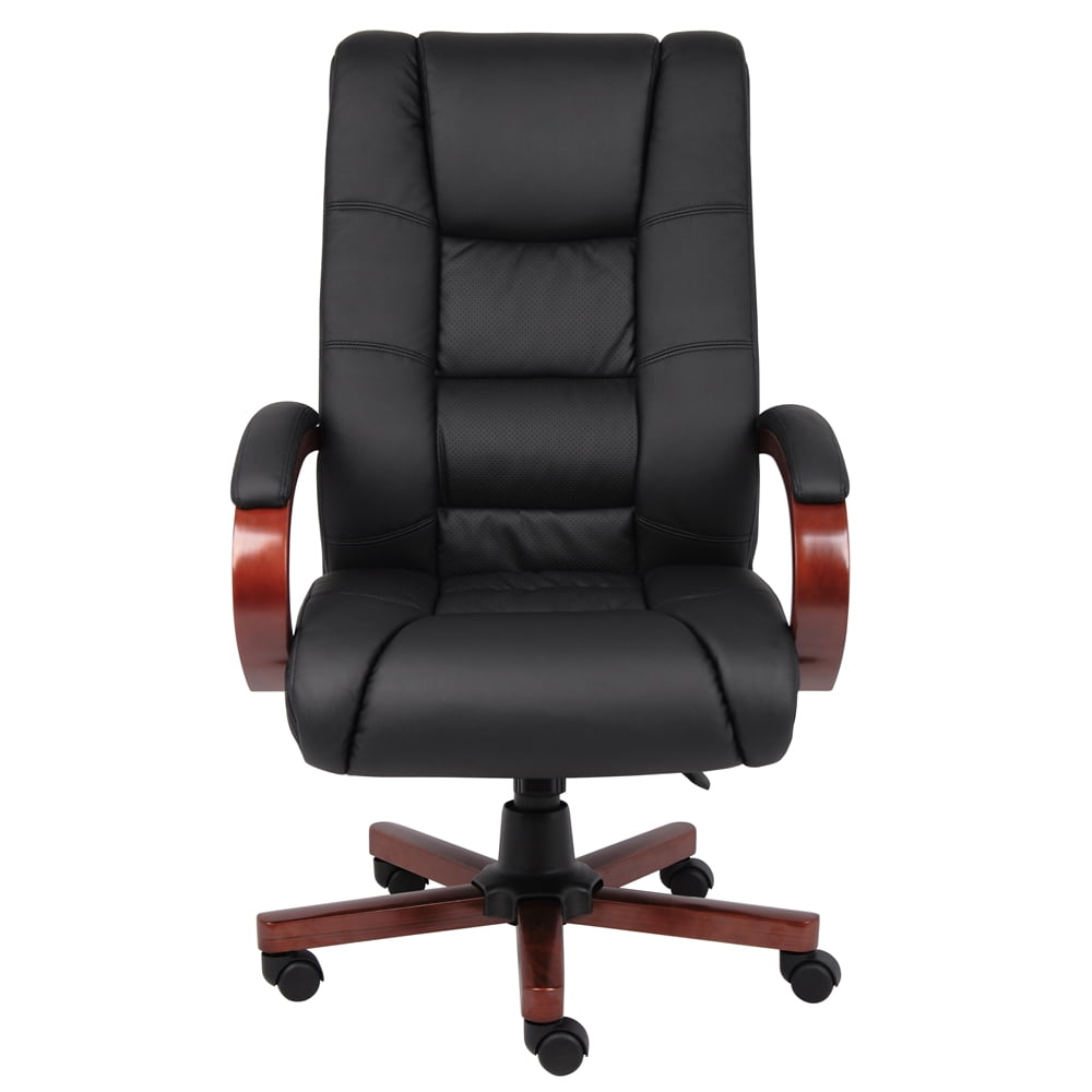 The Boss high back executive chair combines timeless elegance with modern comfort. Featuring a classic cherry finished wood design, this chair is beautifully upholstered in breathable Caressoftplus Vinyl for durability and a premium look. Plush Dacron-filled top cushions with perforated centers add an extra layer of comfort and style. The chair is equipped with a heavy-duty dual paddle spring tilt mechanism with infinite lock, allowing for smooth reclining and secure positioning. Adjustable tilt tension control lets users customize their seating experience, while the pneumatic gas lift seat height adjustment provides effortless customization of seat height. All of these features rest upon a sturdy 27-inch nylon base with five hooded double wheel casters, ensuring optimal mobility and stability for any executive workspace.