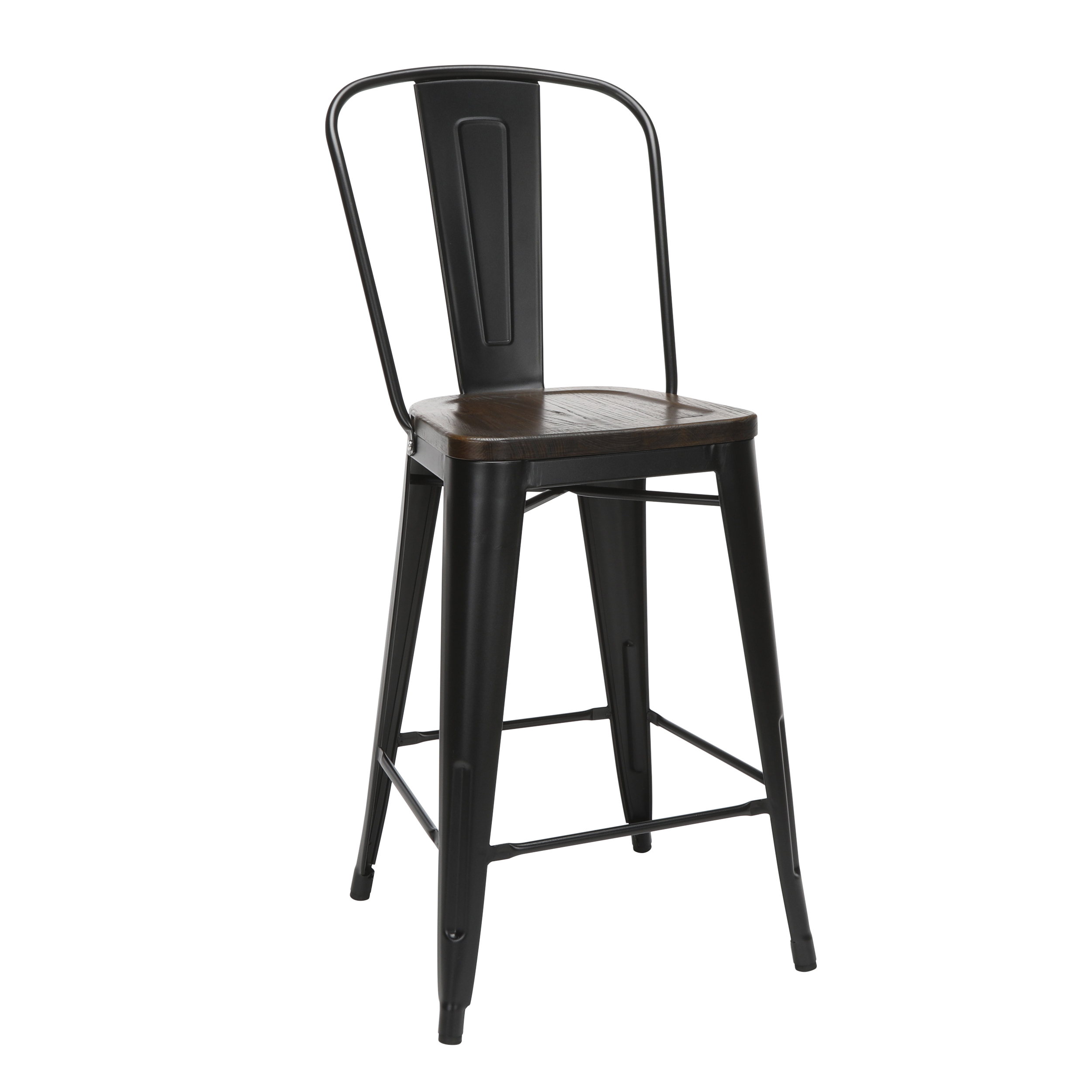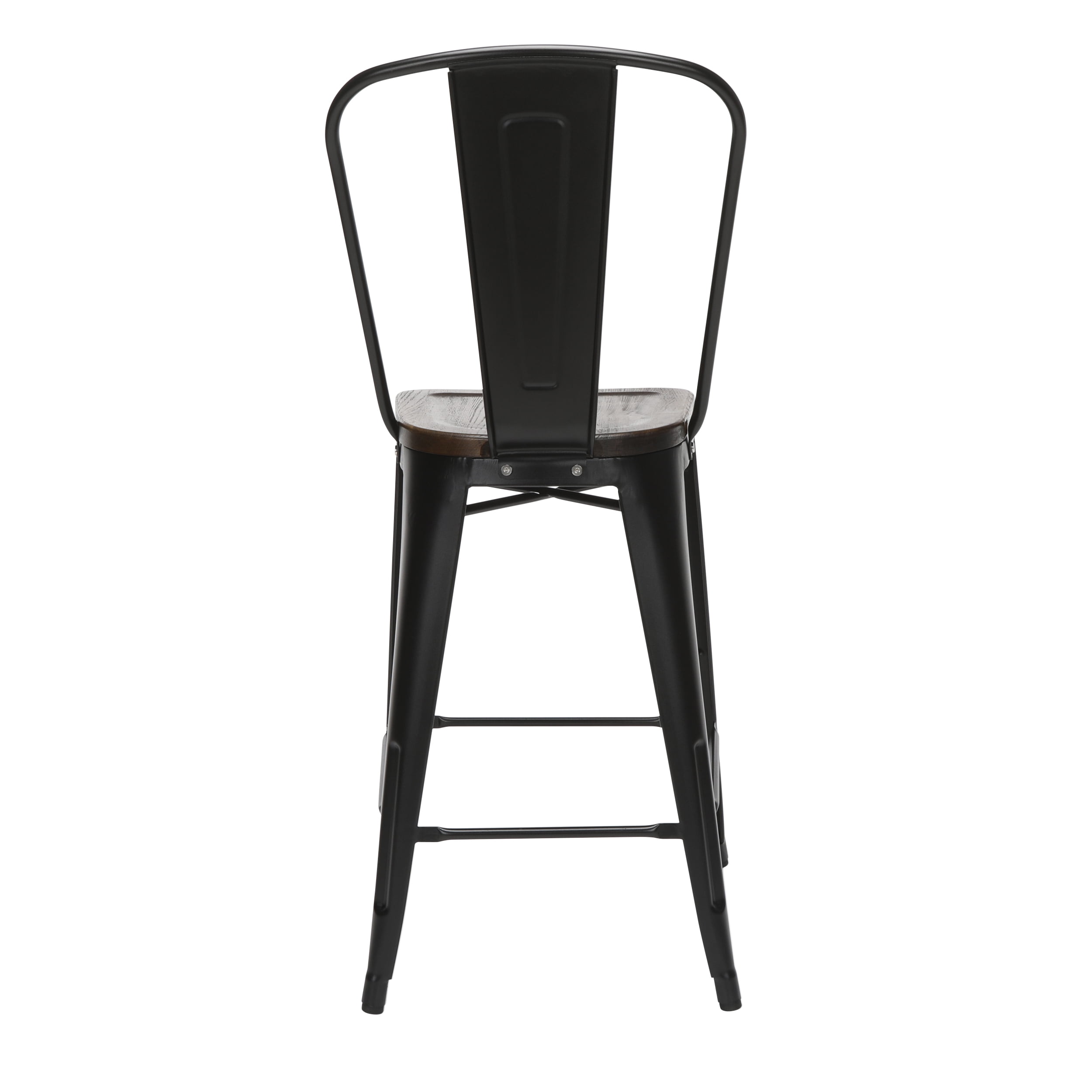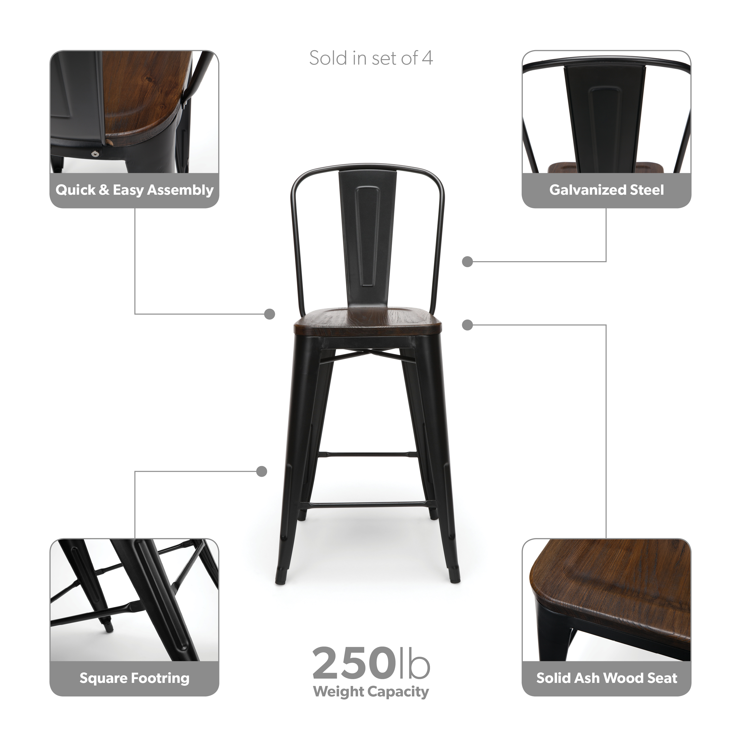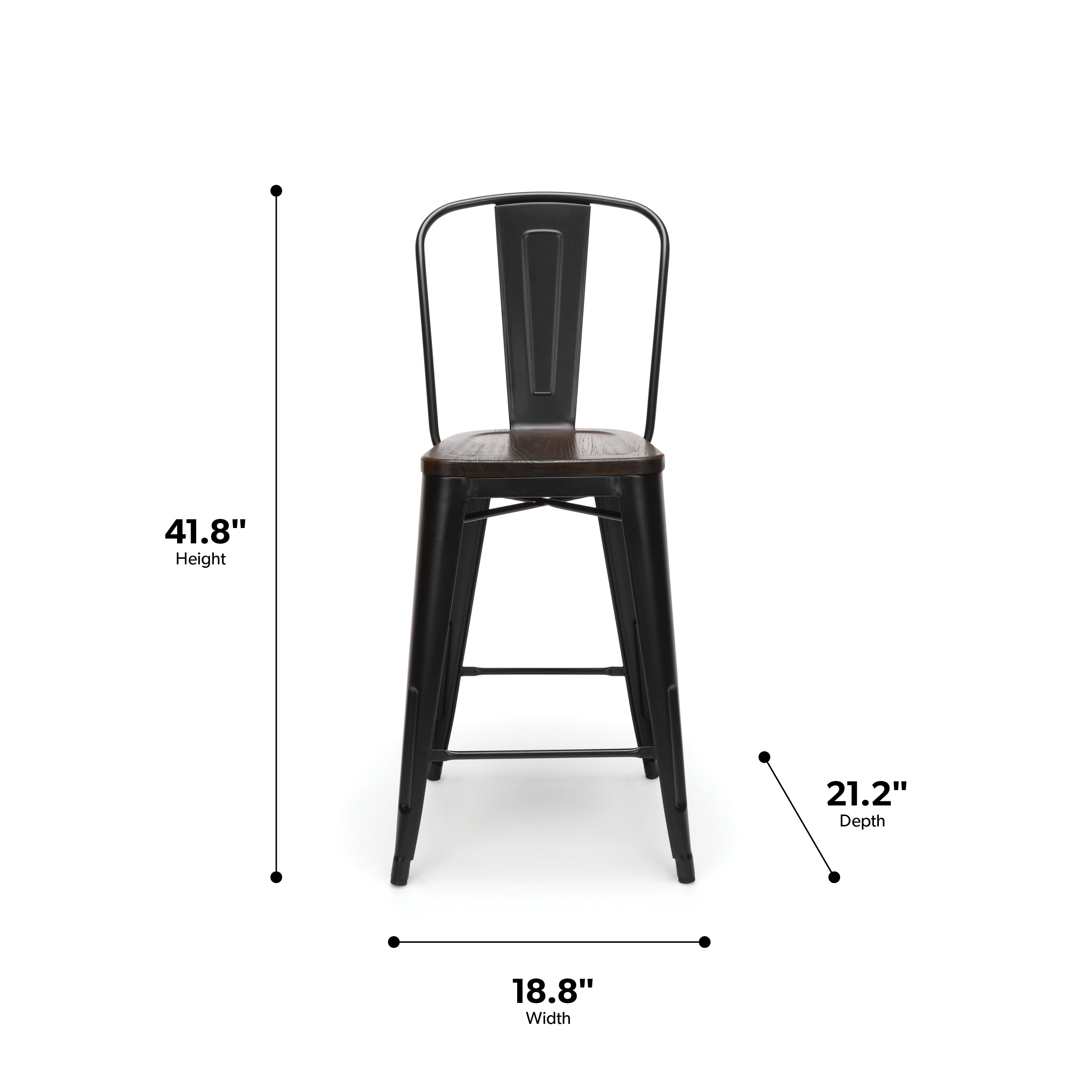 Features Set of 4 high back counter height metal frame wood seat stools perfect for kitchens, patios, cafes, pubs, bistros, and restaurants These metal stools are quick and easy to assemble, just 4 screws are needed to attach the chair back to the stool frame A squared foot ring provides added stability and a resting place for your feet Galvanized steel helps to prevent rust and provides a more durable, hard to scratch finish The stool’s base is matte Black and the seat is made of solid ash wood with a Walnut finish An anti-UV powder is applied to the chairs to prevent heat retention, making these stools comfortable even in full sun The metal and wood surface makes these bar stools easy to clean, simply wipe with a damp cloth The stools feature an x-brace, beneath the seat, that provides additional support and added stability Patio stools hold at least 250 lb and measure 18.8″ W x 21.2″ D x 41.8″ H Bistro stools have plastic, non-marring protective floor glides that help prevent sliding and scratching