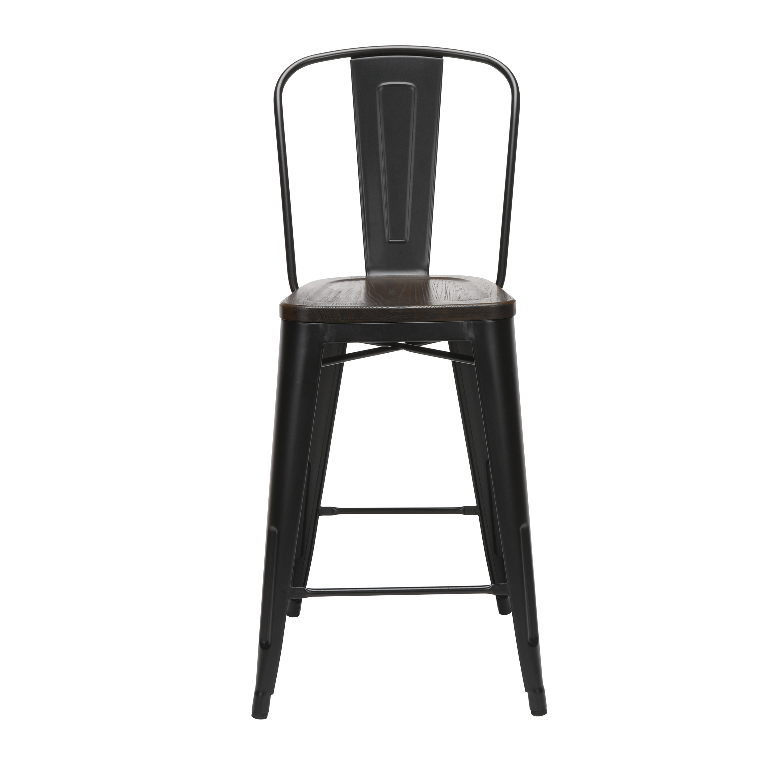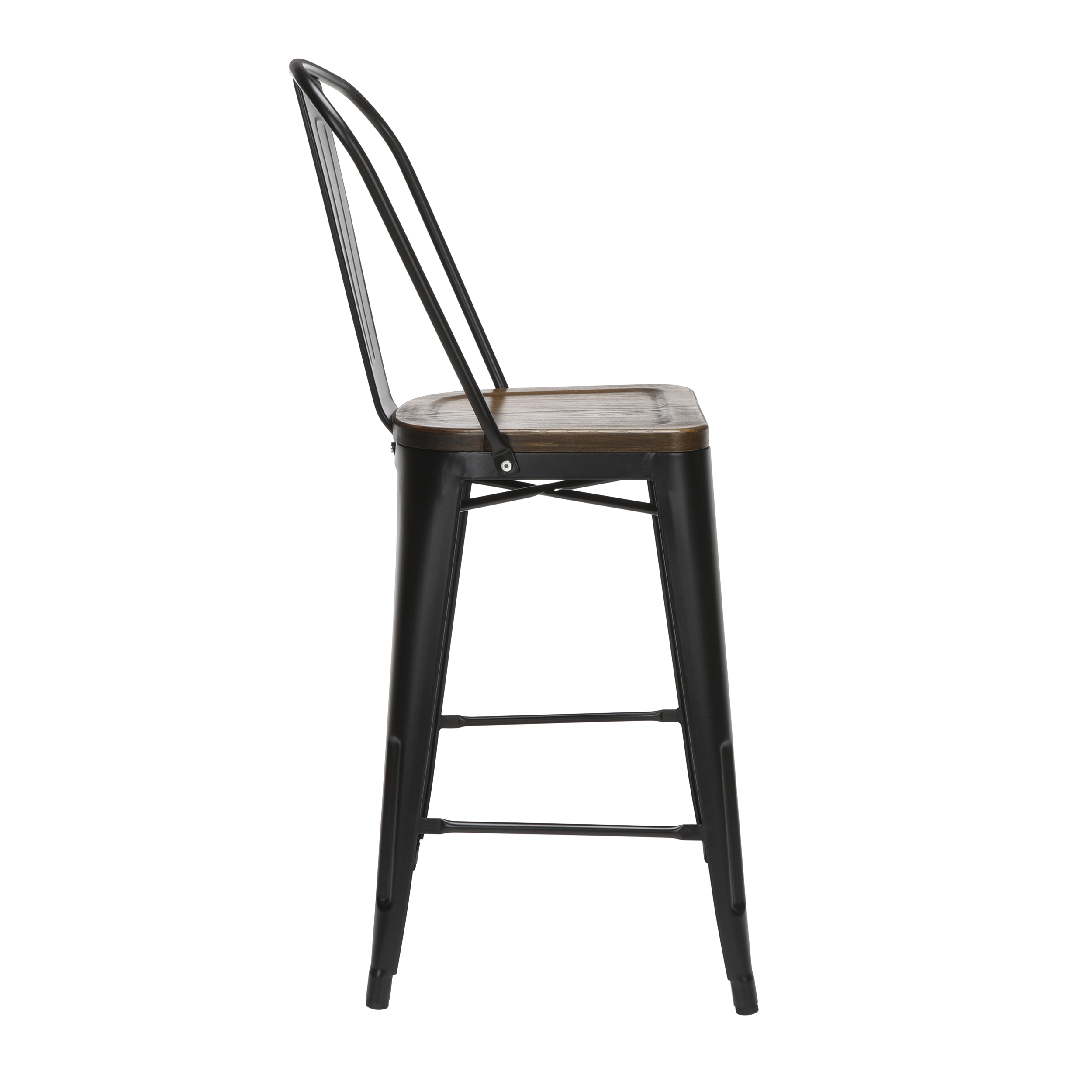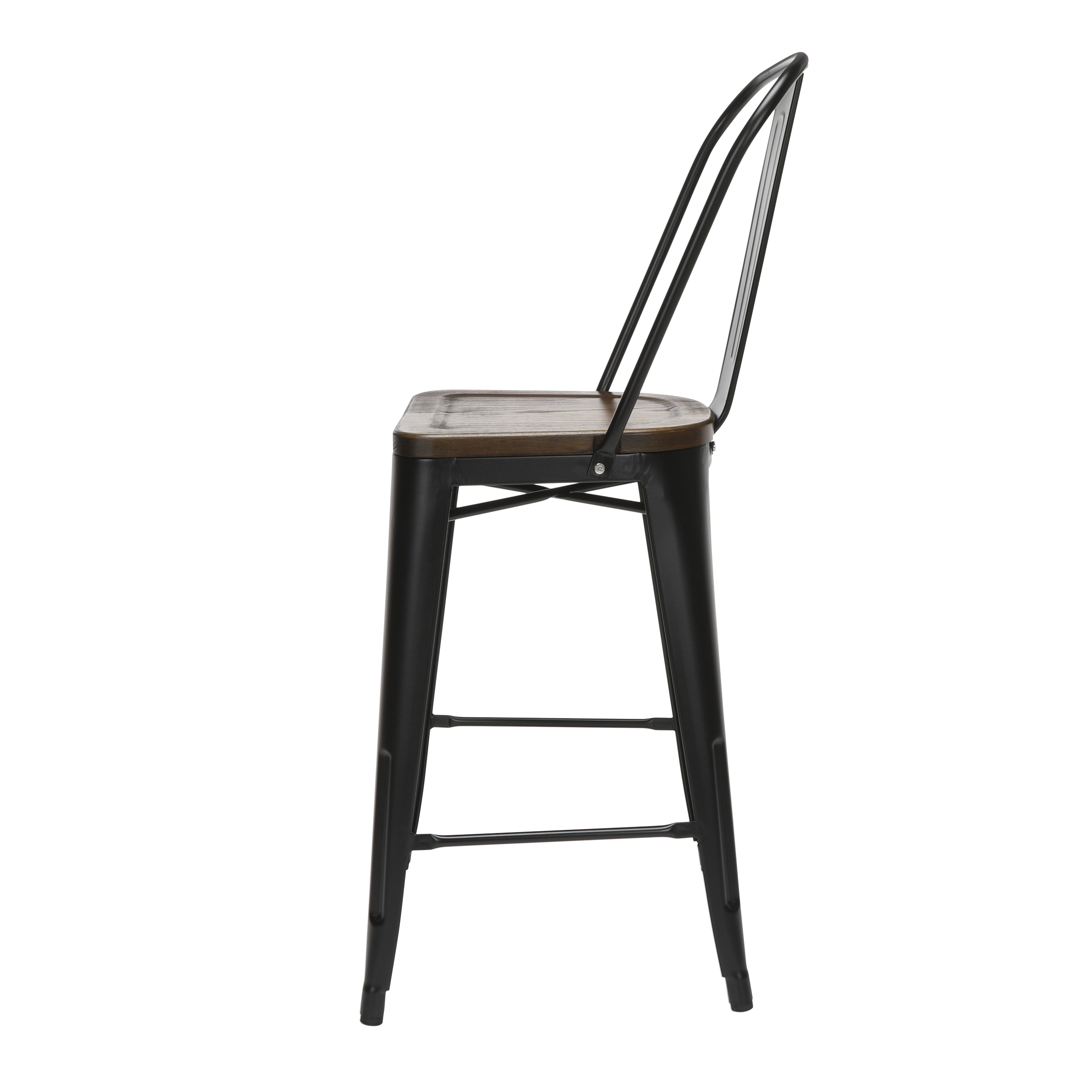 Features Set of 4 high back counter height metal frame wood seat stools perfect for kitchens, patios, cafes, pubs, bistros, and restaurants These metal stools are quick and easy to assemble, just 4 screws are needed to attach the chair back to the stool frame A squared foot ring provides added stability and a resting place for your feet Galvanized steel helps to prevent rust and provides a more durable, hard to scratch finish The stool’s base is matte Black and the seat is made of solid ash wood with a Walnut finish An anti-UV powder is applied to the chairs to prevent heat retention, making these stools comfortable even in full sun The metal and wood surface makes these bar stools easy to clean, simply wipe with a damp cloth The stools feature an x-brace, beneath the seat, that provides additional support and added stability Patio stools hold at least 250 lb and measure 18.8″ W x 21.2″ D x 41.8″ H Bistro stools have plastic, non-marring protective floor glides that help prevent sliding and scratching