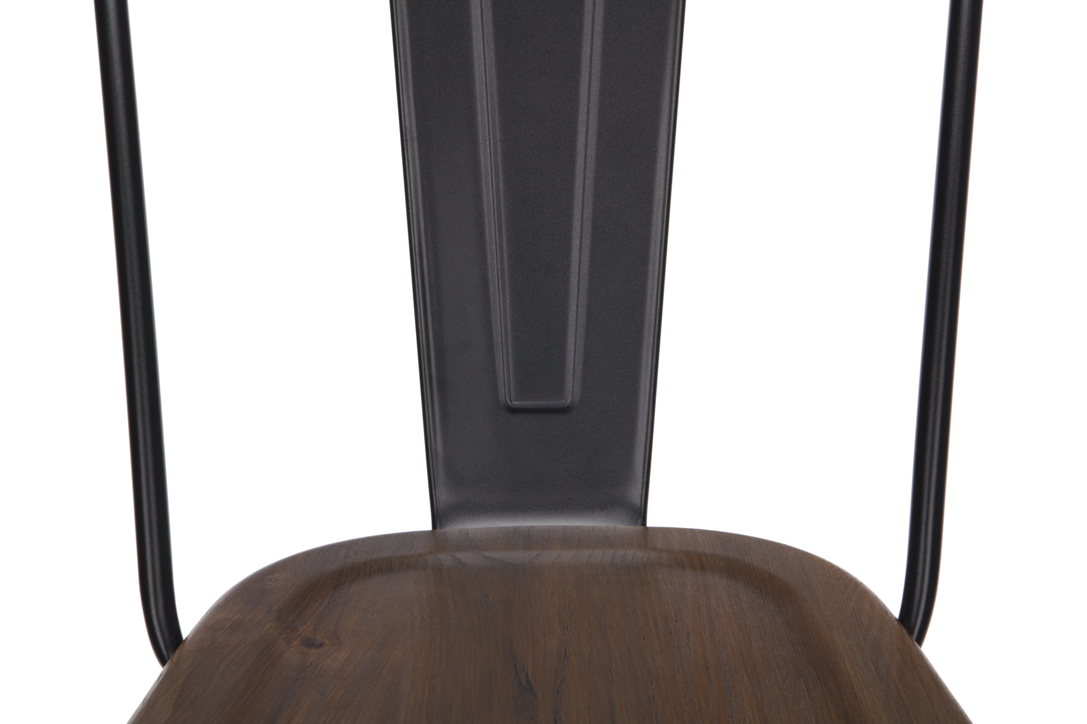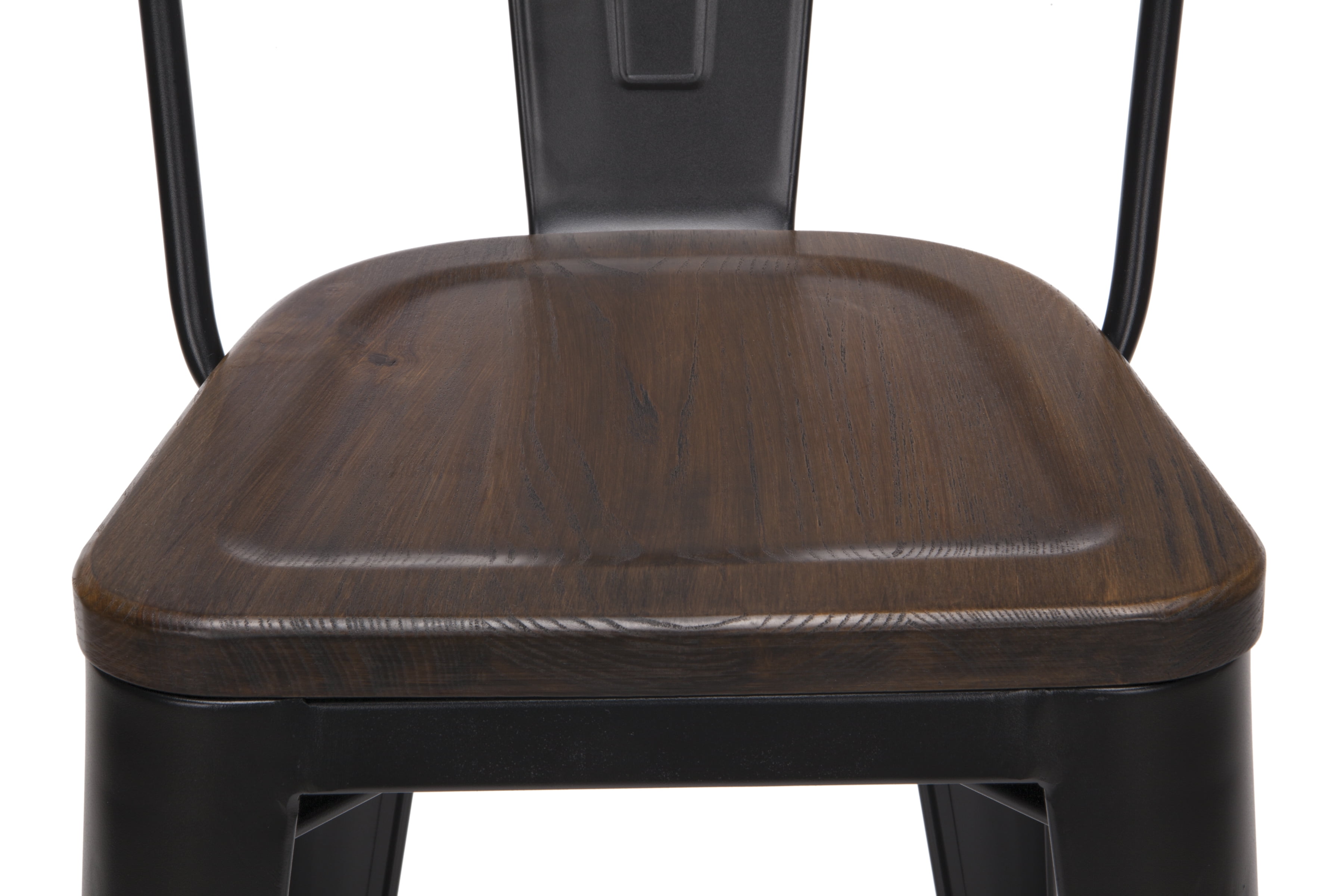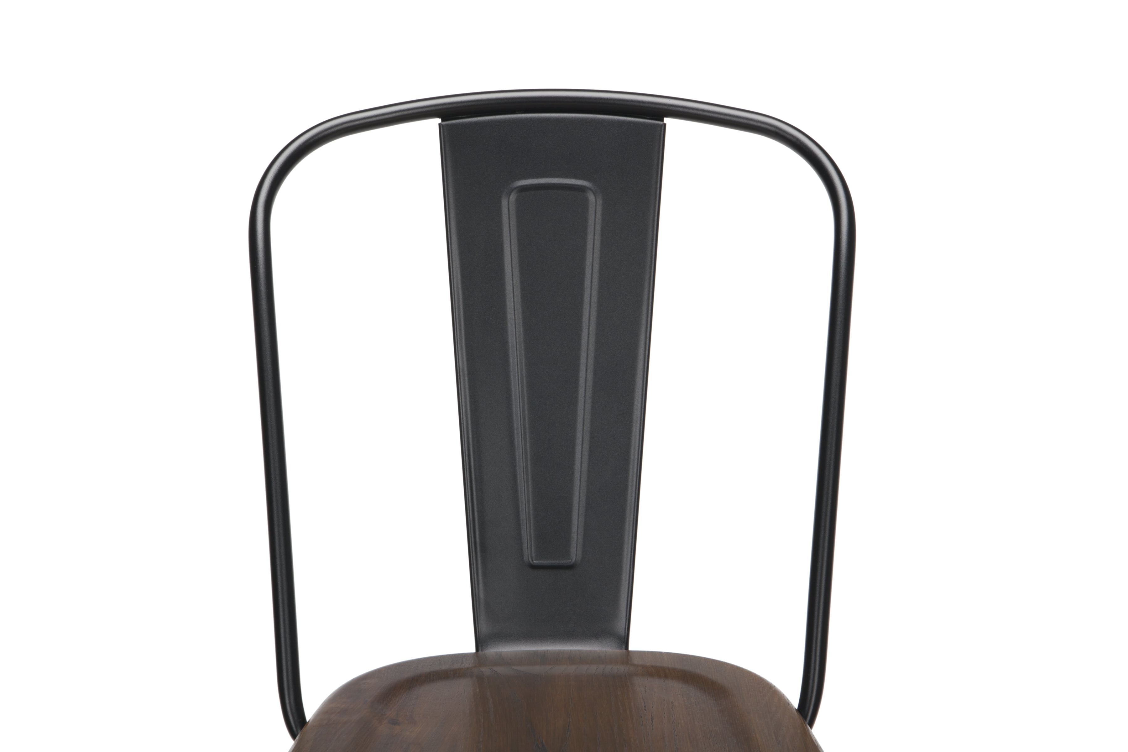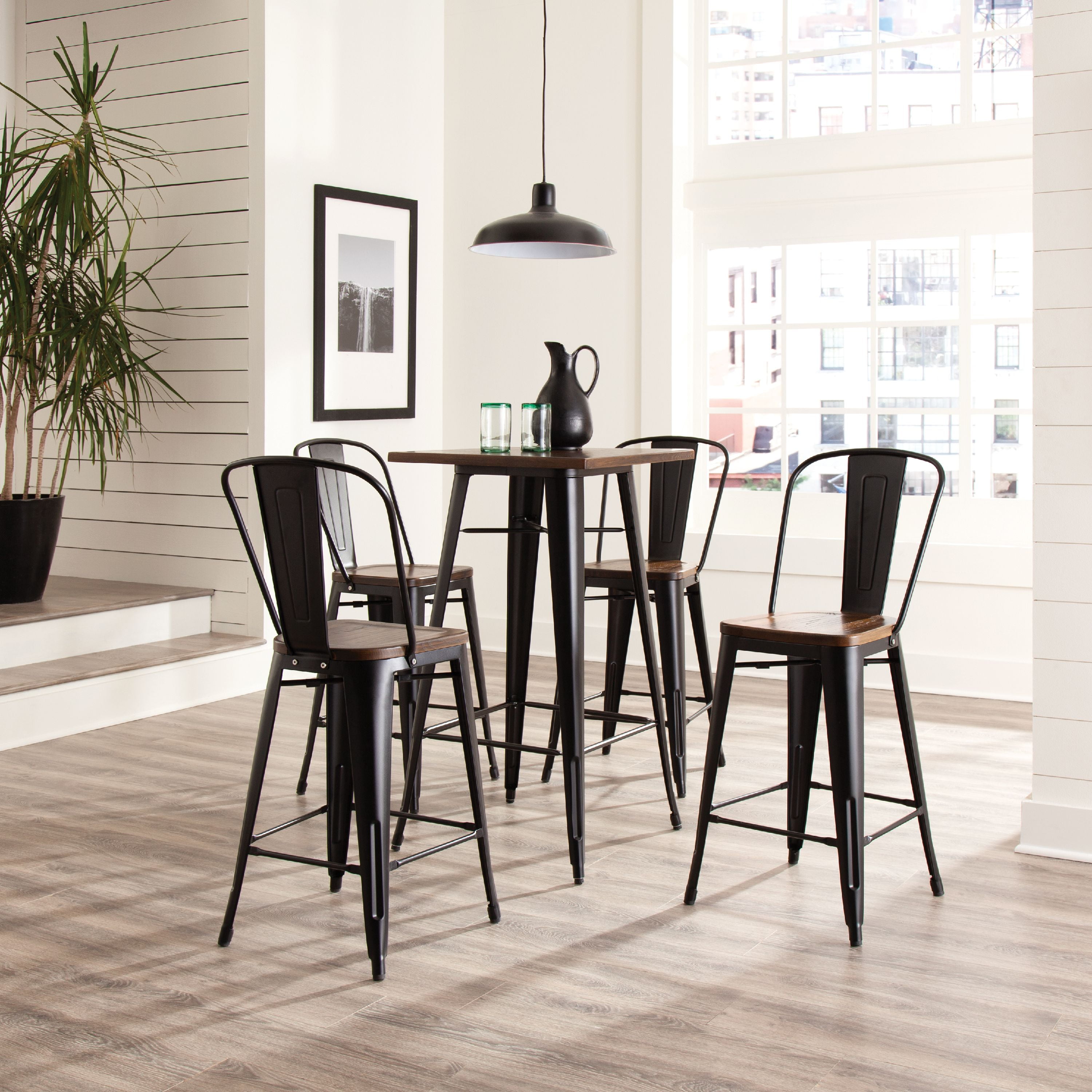 Features Set of 4 high back counter height metal frame wood seat stools perfect for kitchens, patios, cafes, pubs, bistros, and restaurants These metal stools are quick and easy to assemble, just 4 screws are needed to attach the chair back to the stool frame A squared foot ring provides added stability and a resting place for your feet Galvanized steel helps to prevent rust and provides a more durable, hard to scratch finish The stool’s base is matte Black and the seat is made of solid ash wood with a Walnut finish An anti-UV powder is applied to the chairs to prevent heat retention, making these stools comfortable even in full sun The metal and wood surface makes these bar stools easy to clean, simply wipe with a damp cloth The stools feature an x-brace, beneath the seat, that provides additional support and added stability Patio stools hold at least 250 lb and measure 18.8″ W x 21.2″ D x 41.8″ H Bistro stools have plastic, non-marring protective floor glides that help prevent sliding and scratching