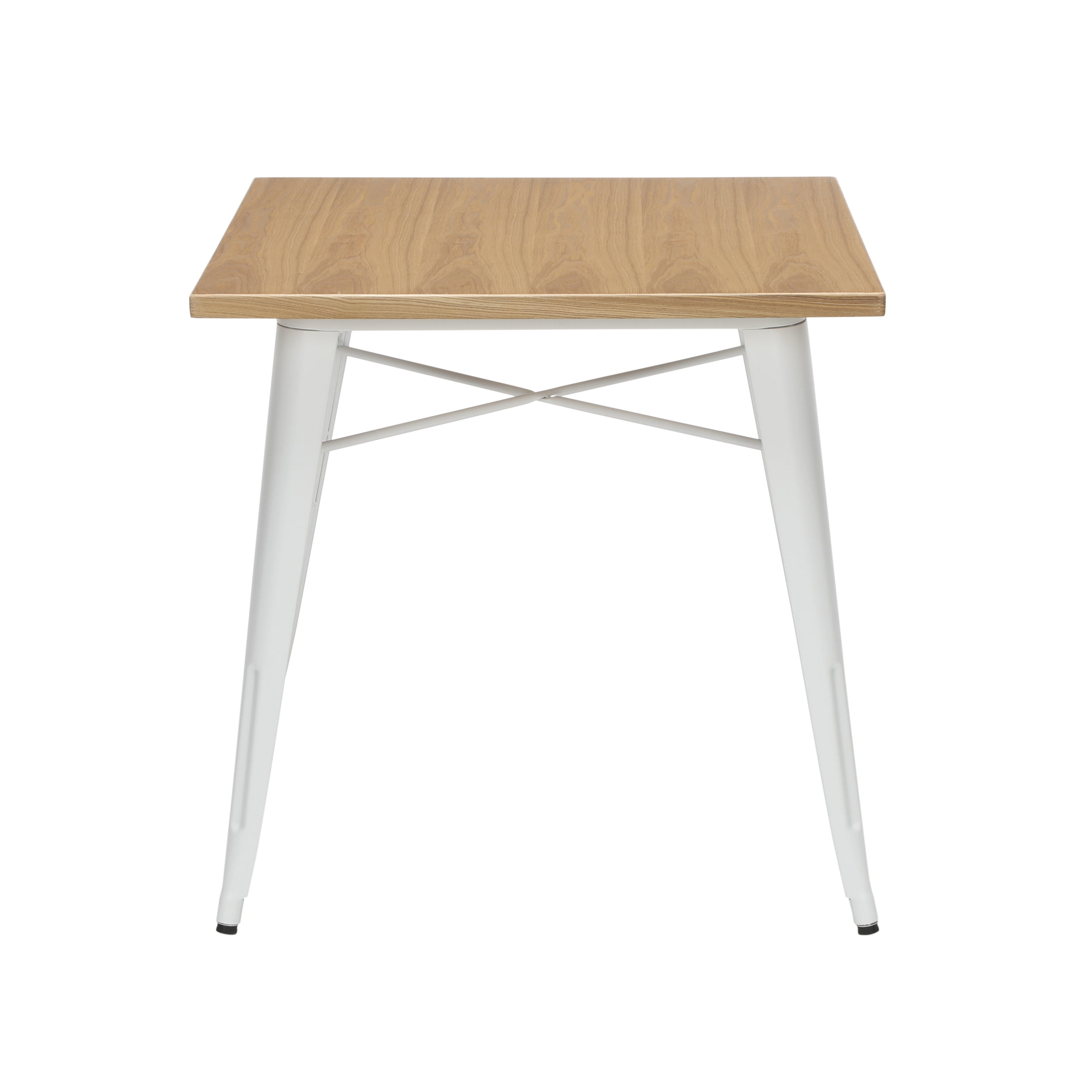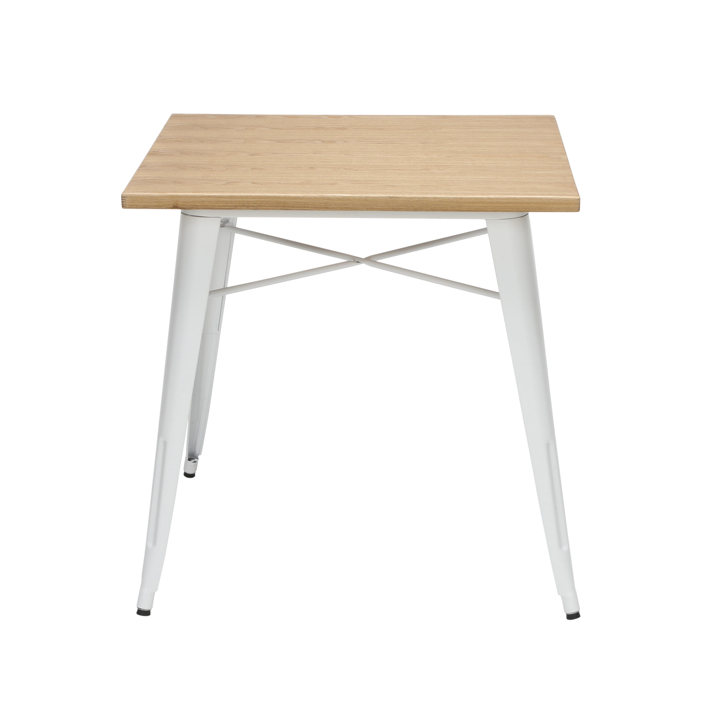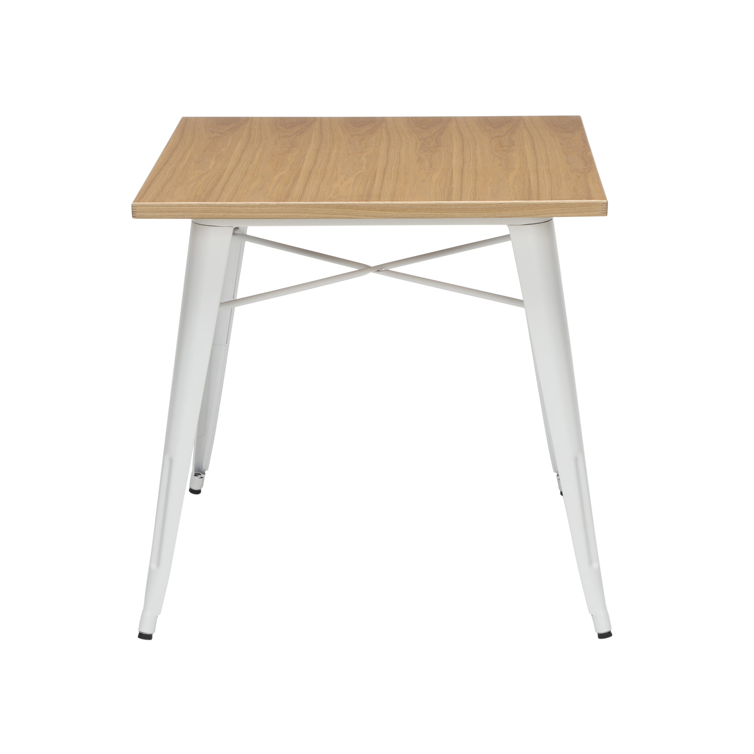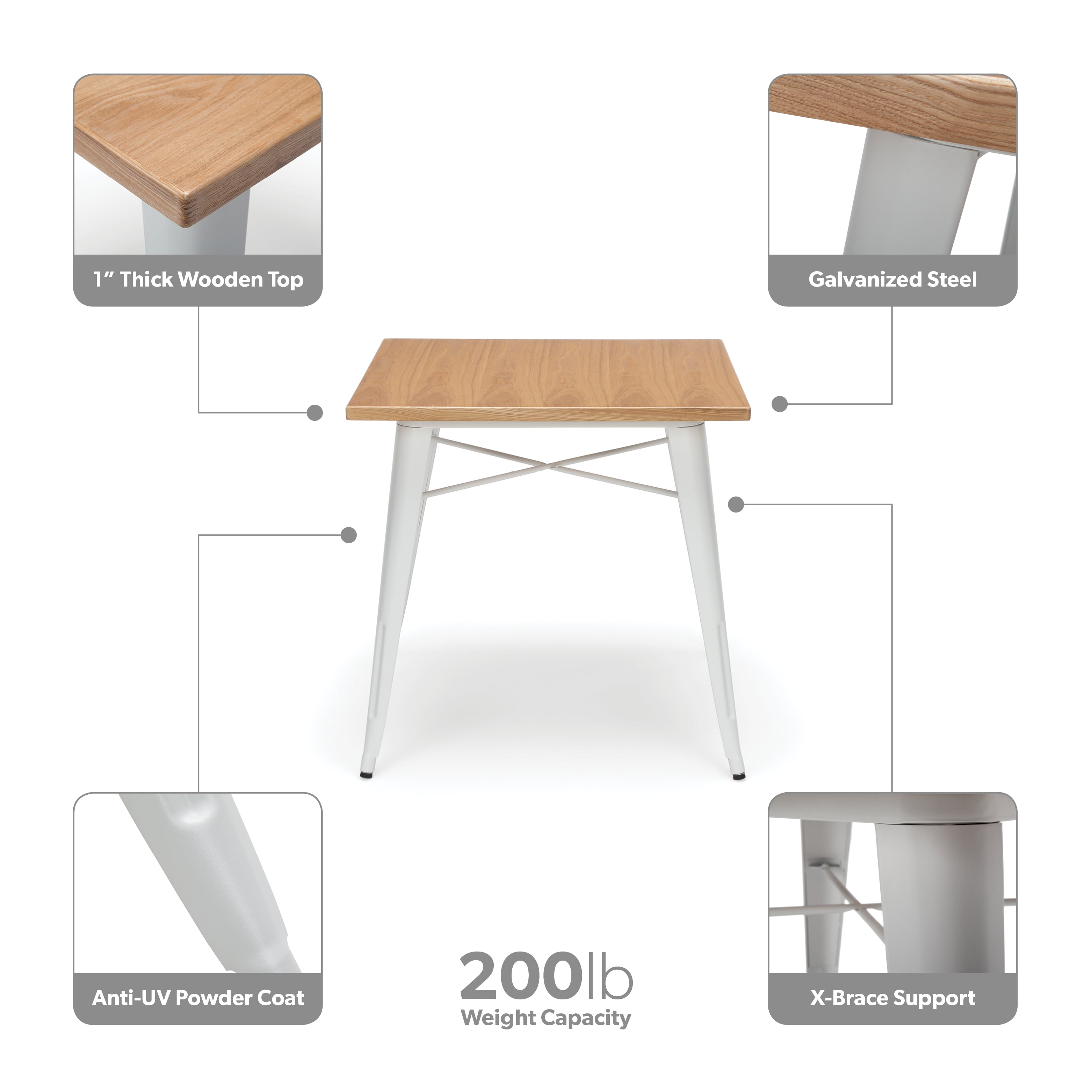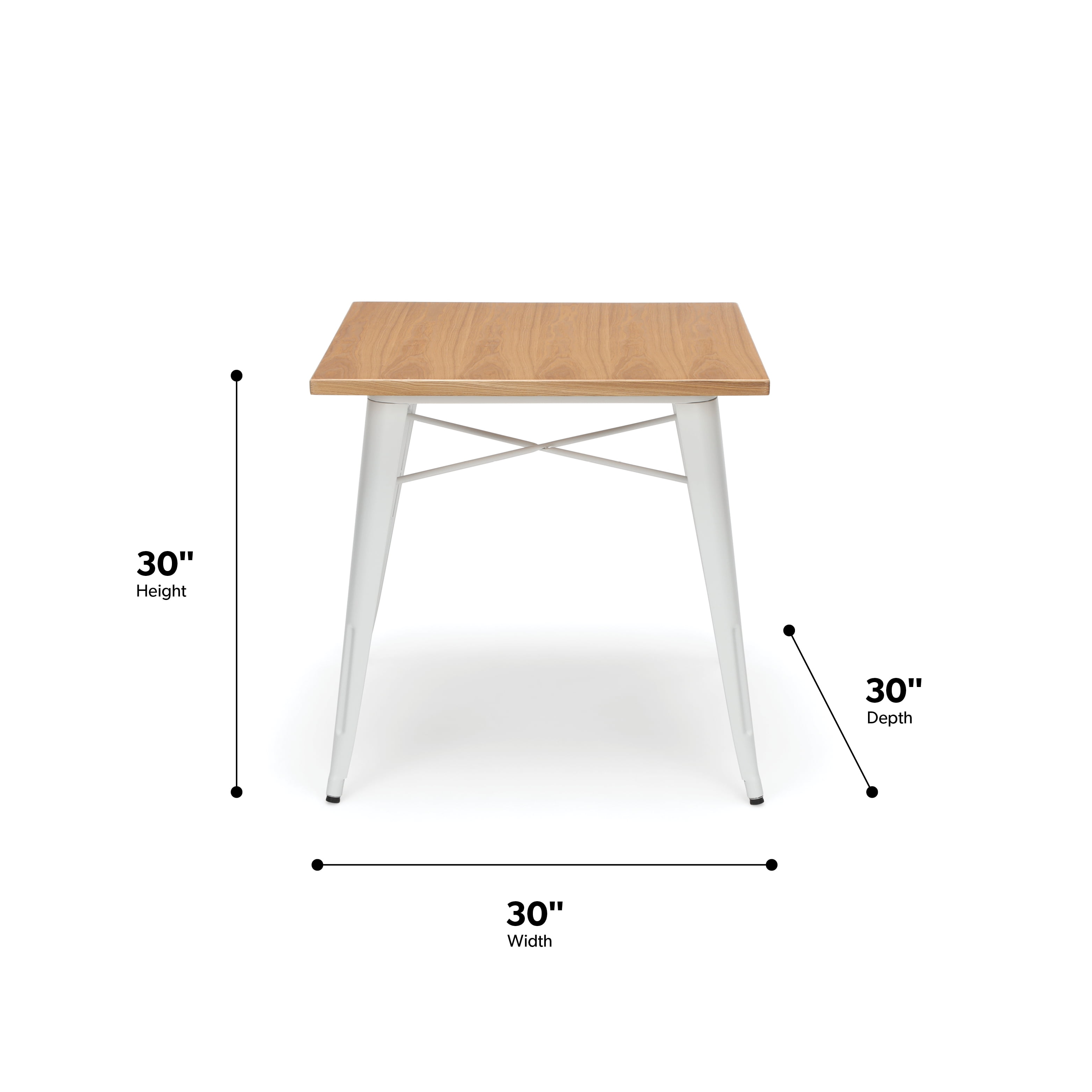 30″ x 30″ square dining table is 30″ high and perfect for kitchens, cafes, dining rooms, pubs, bistros, and restaurants 1″ thick robust wooden tabletop gives warmth and weight to this industrial look Galvanized steel helps to prevent rust and provides a more durable, hard to scratch finish An anti-UV powder is applied to the table to prevent heat retention, making this restaurant table comfortable even in full sun Matte White metal finish and light Natural wooden tabletop finish The wood surface makes this table easy to clean, simply wipe with a damp cloth The table features an x-brace, beneath the top, that provides additional support and added stability The kitchen table holds 200 lb and measures 30.0 D x 30.0 W x 30.0 H The patio table has plastic, non-marring protective floor glides that help prevent sliding and scratching A full BIFMA rating means that you are investing in a product that meets strict standards for performance