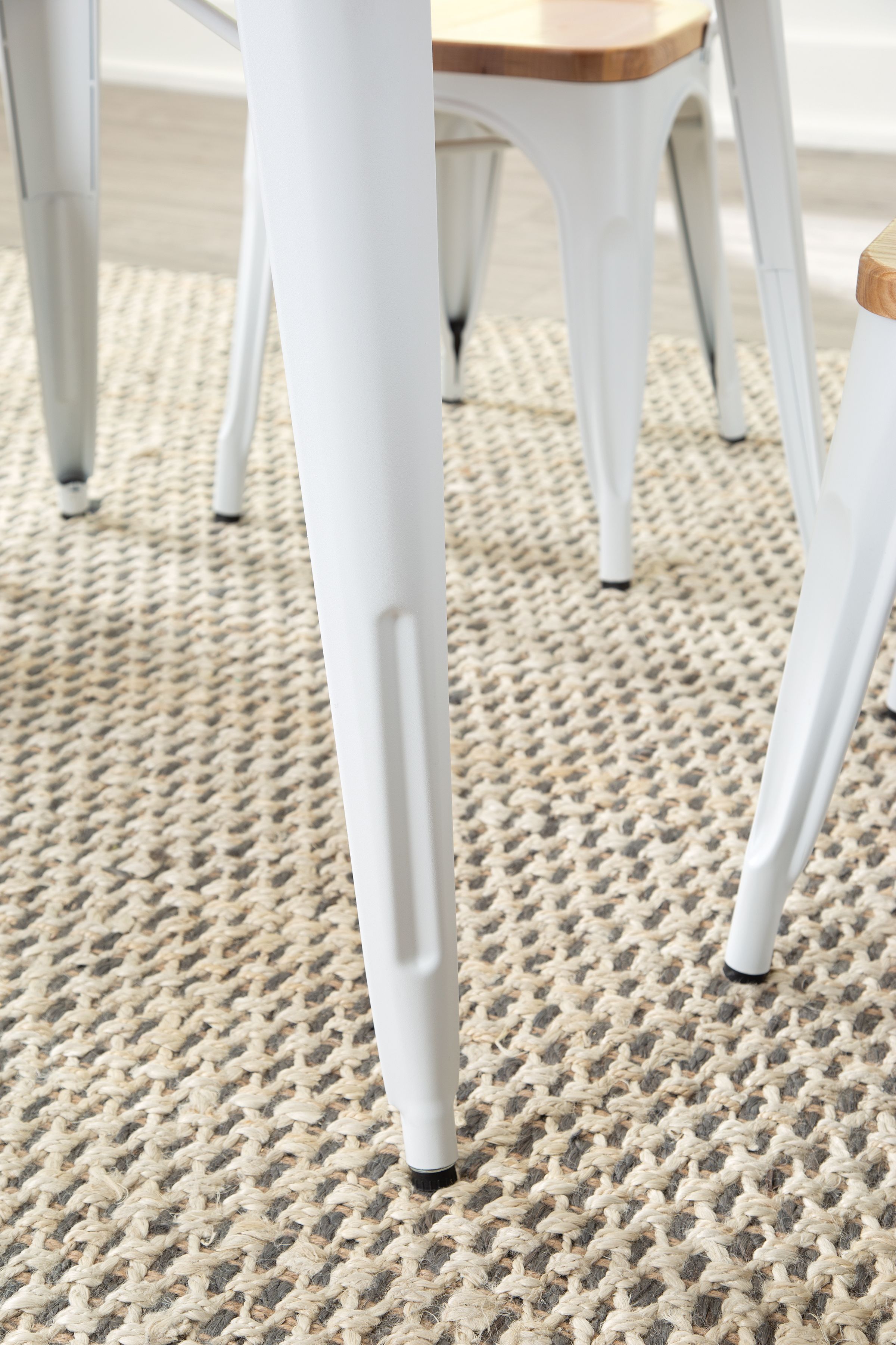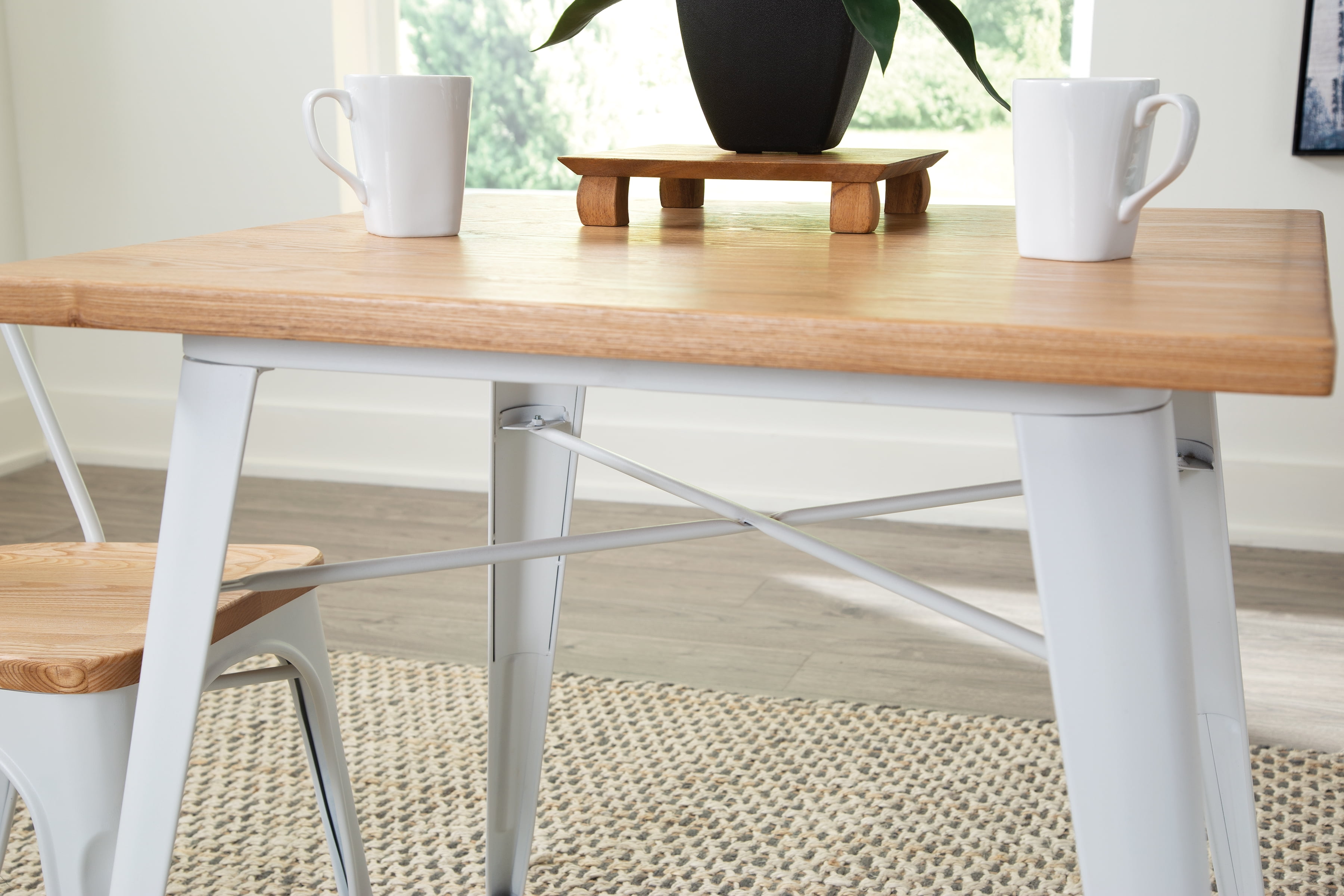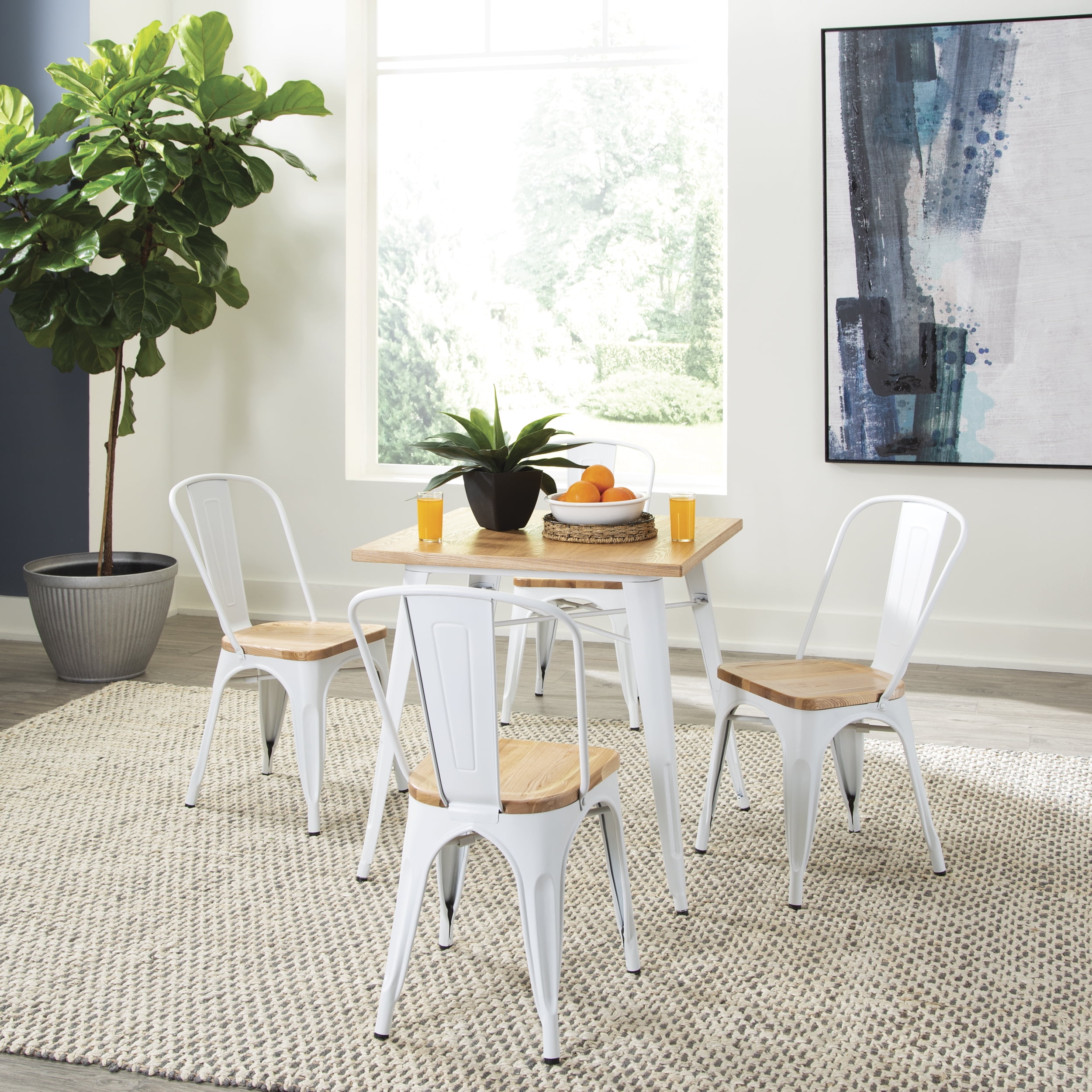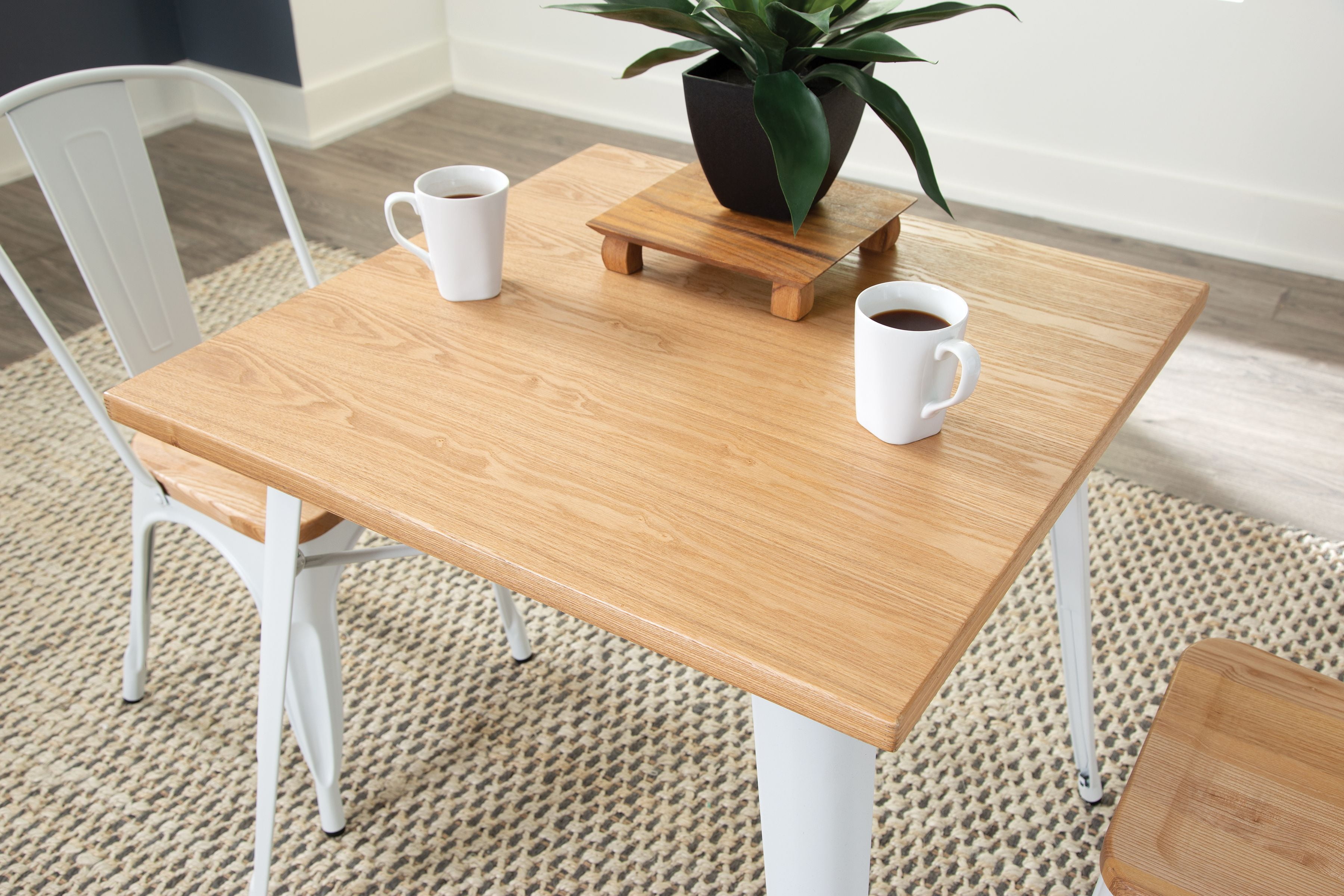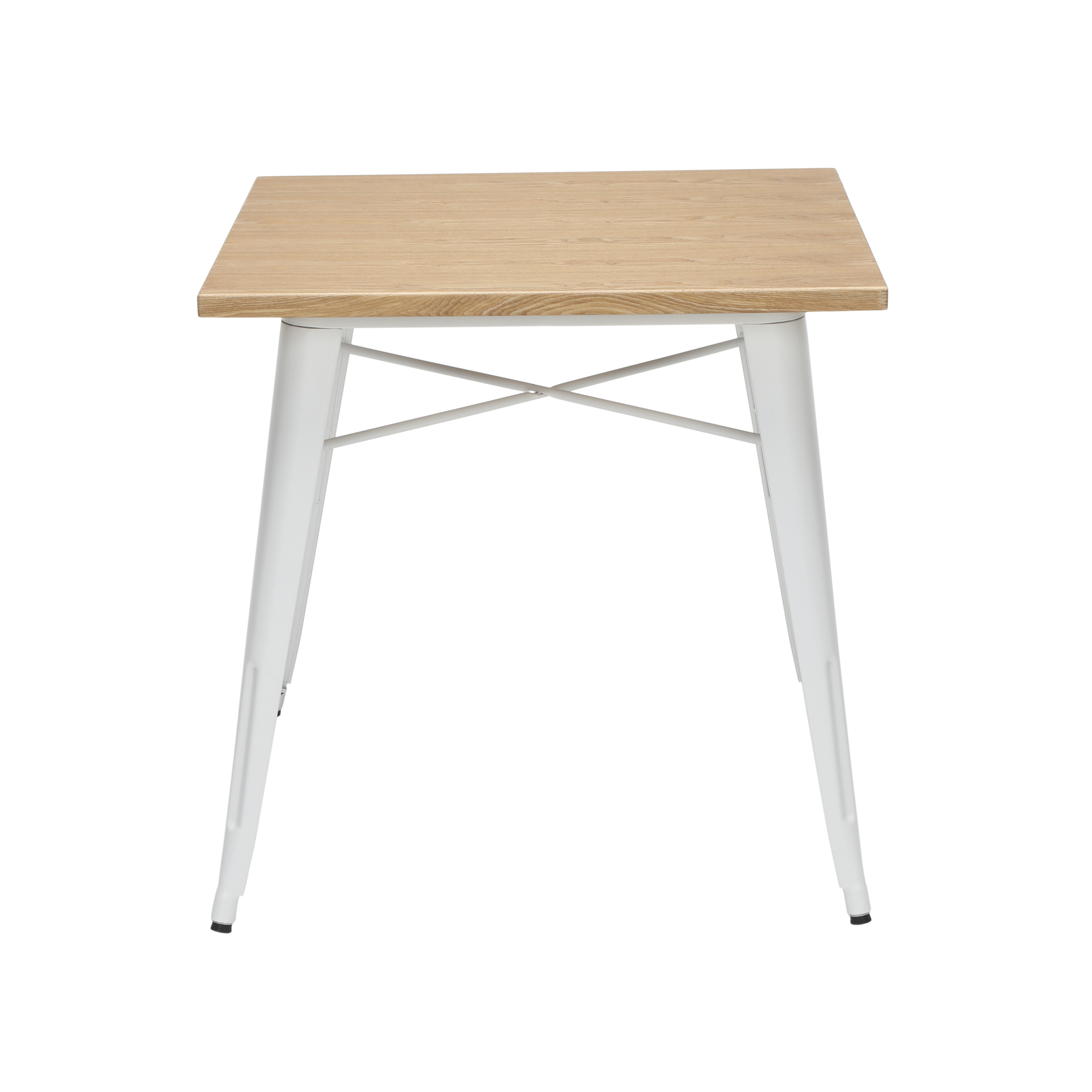 30″ x 30″ square dining table is 30″ high and perfect for kitchens, cafes, dining rooms, pubs, bistros, and restaurants 1″ thick robust wooden tabletop gives warmth and weight to this industrial look Galvanized steel helps to prevent rust and provides a more durable, hard to scratch finish An anti-UV powder is applied to the table to prevent heat retention, making this restaurant table comfortable even in full sun Matte White metal finish and light Natural wooden tabletop finish The wood surface makes this table easy to clean, simply wipe with a damp cloth The table features an x-brace, beneath the top, that provides additional support and added stability The kitchen table holds 200 lb and measures 30.0 D x 30.0 W x 30.0 H The patio table has plastic, non-marring protective floor glides that help prevent sliding and scratching A full BIFMA rating means that you are investing in a product that meets strict standards for performance