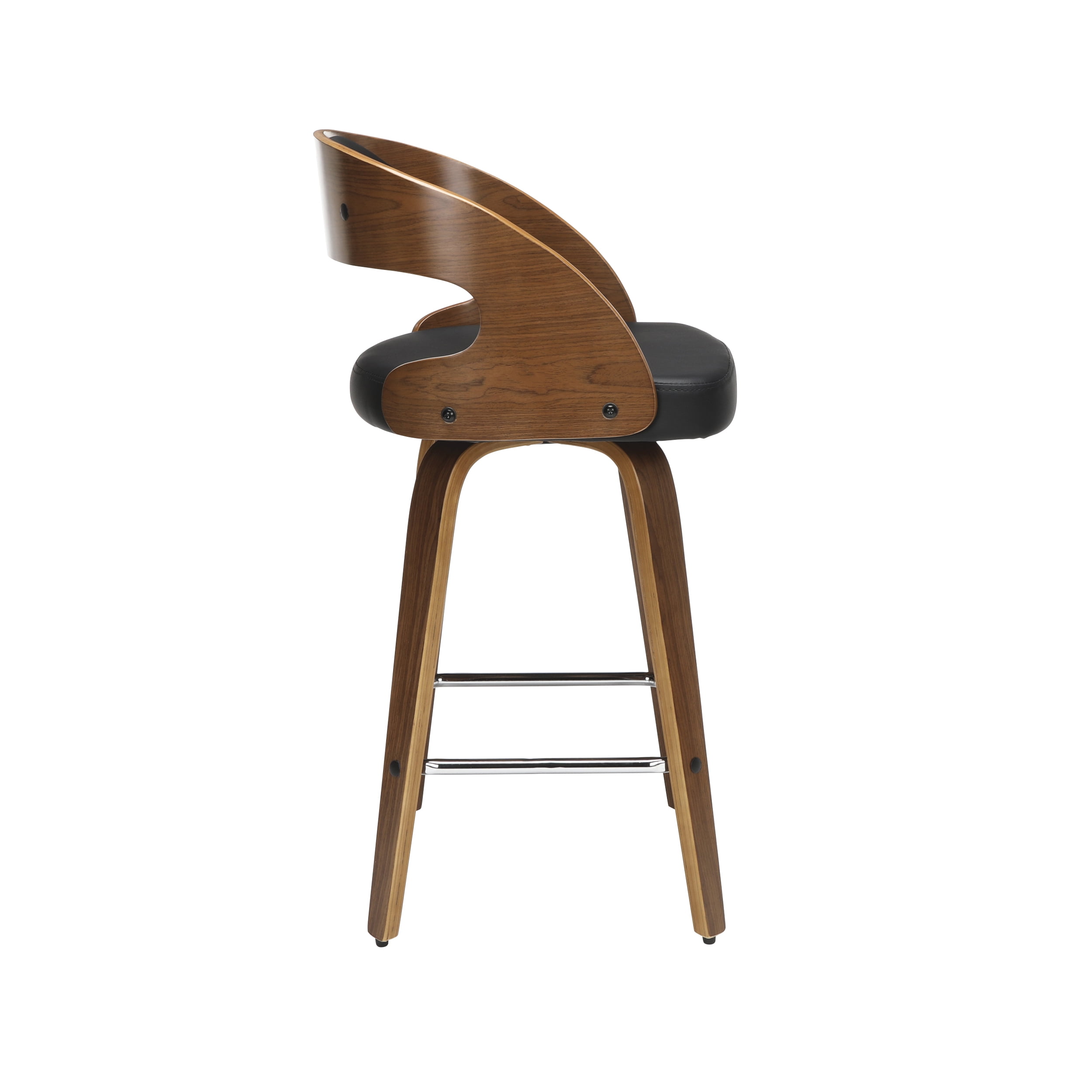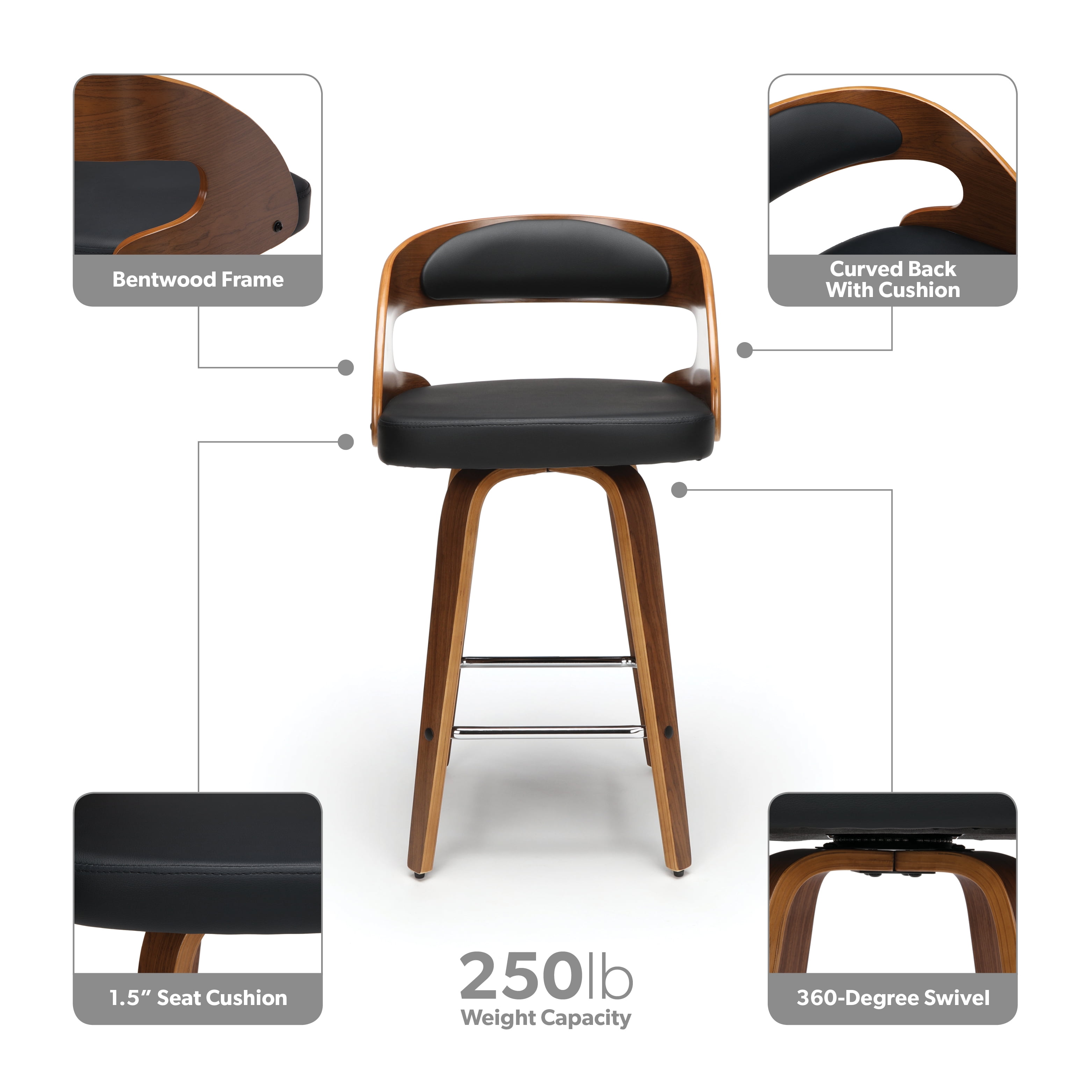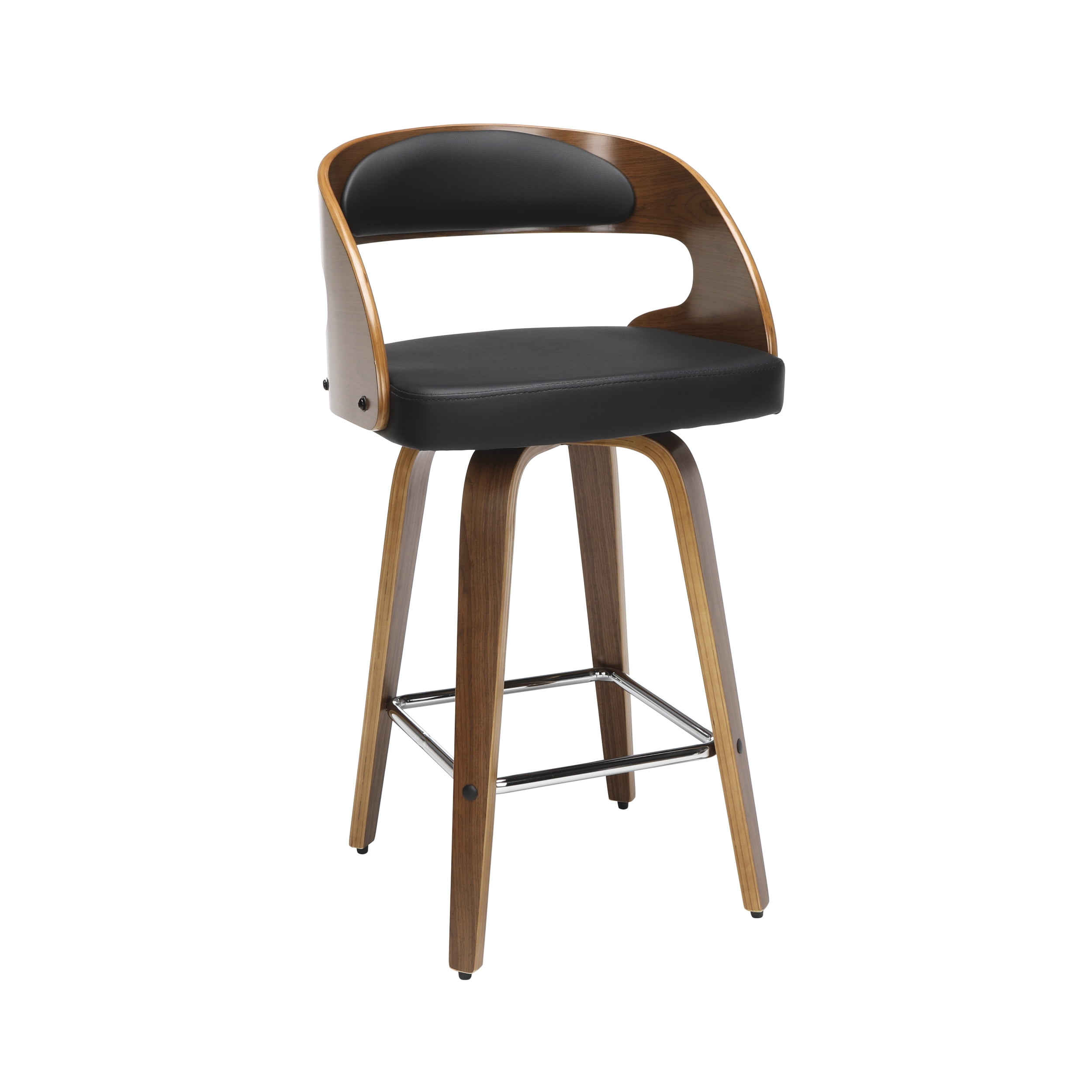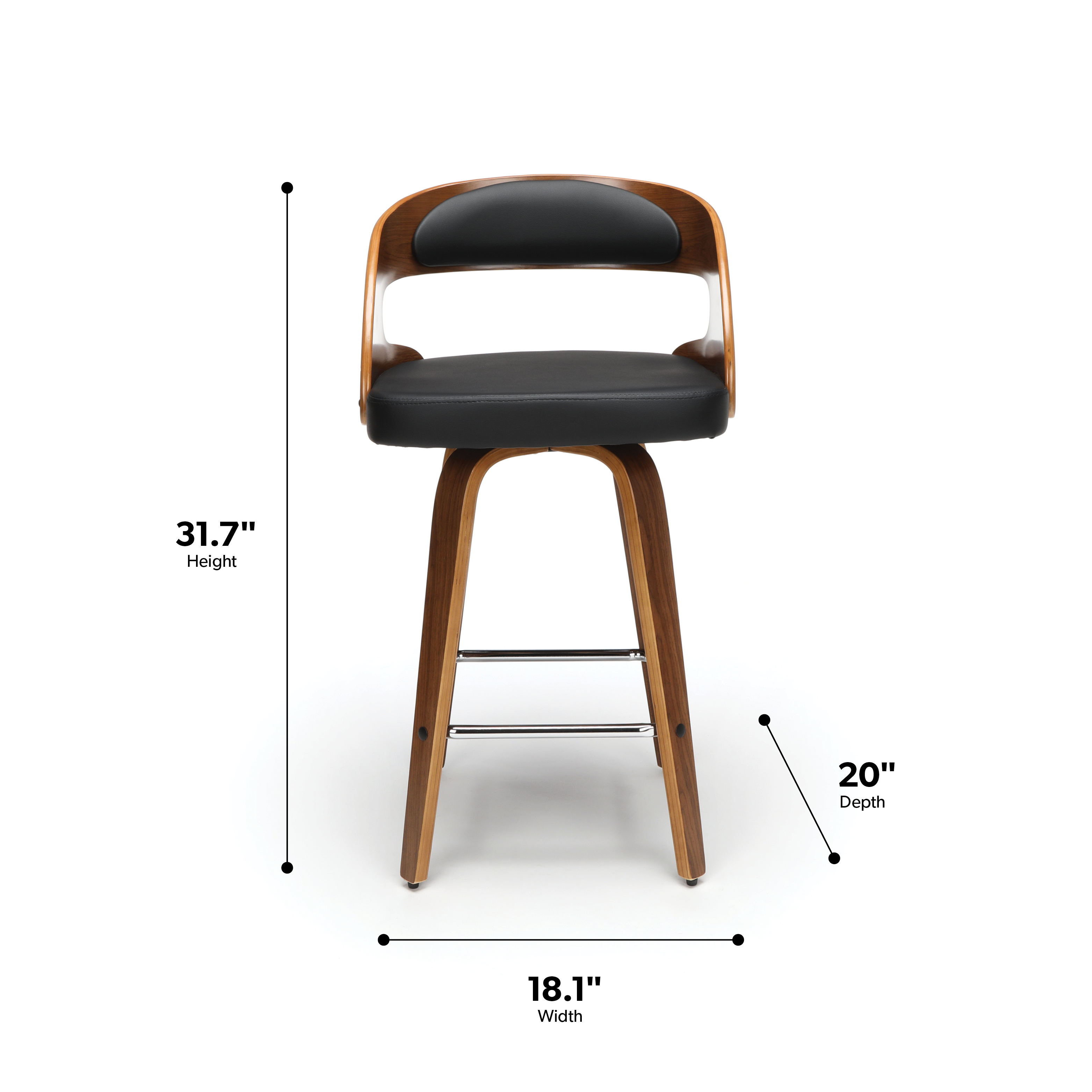 Mid century modern 26″ high swivel seat stool The dining chair stool features a bentwood frame with a rich Walnut finish This minimalist stool features a 1.5″ thick Black vinyl seat cushion for extra comfort Swivel seat stool allows for unrestricted 360-degree movement The curved bentwood seat back features a Black vinyl cushion for comfort and support Mid century modern stool features an artful solid wood waterfall leg with a Walnut finish This stool features a unique and stylish square shaped chrome footrest for comfort Installation is easy, simply affix waterfall legs to the chair base Standing height chair comes with plastic floor protectors, to prevent floor surface scratches and marks This retro stool can be used in multiple applications including kitchens, cafes, bars, and standing height desks Standard 26″ counter height chair measures 20″ D x 18″ W x 31.75″ H and holds users up to 250 lb This stool is backed by our 5 Year Limited Warranty