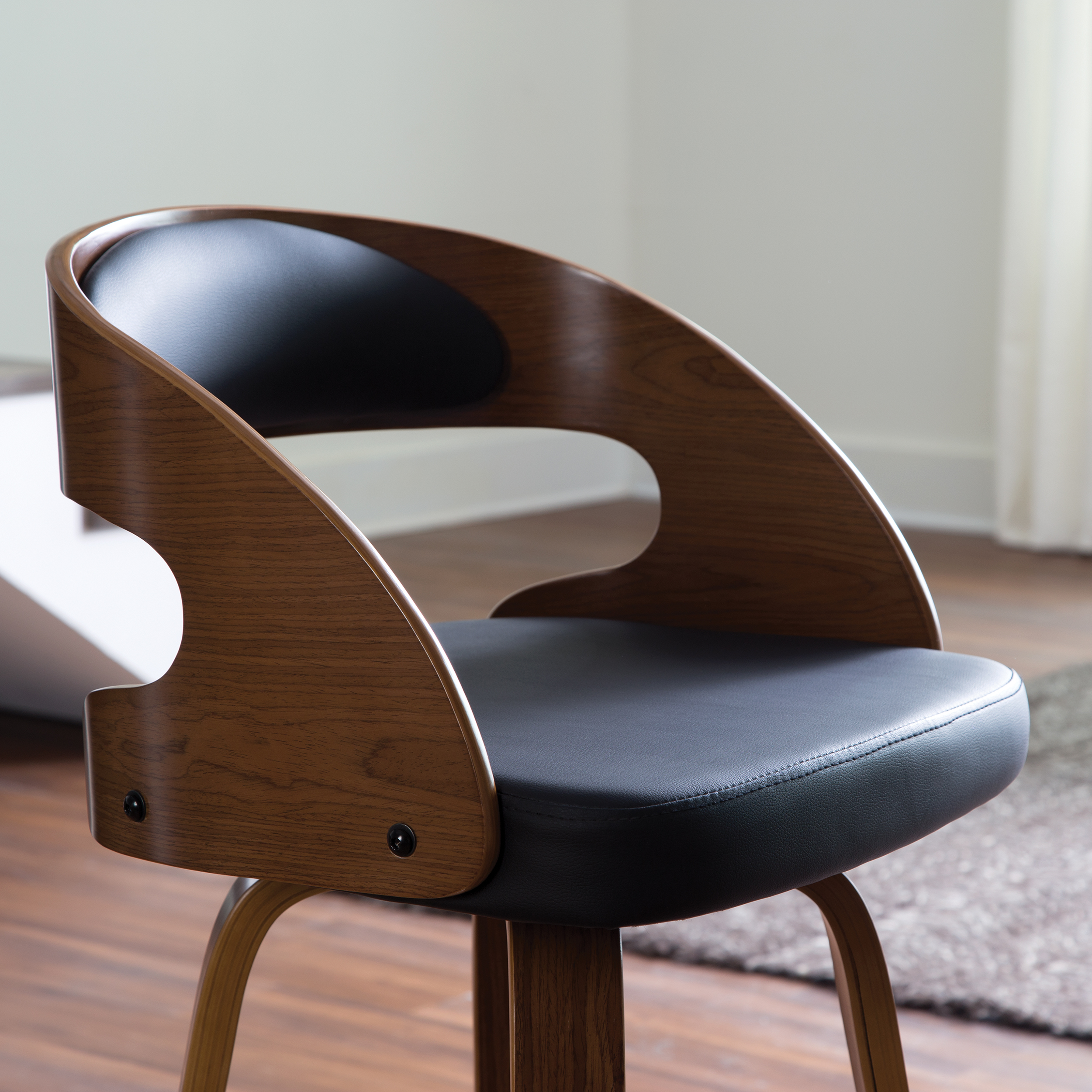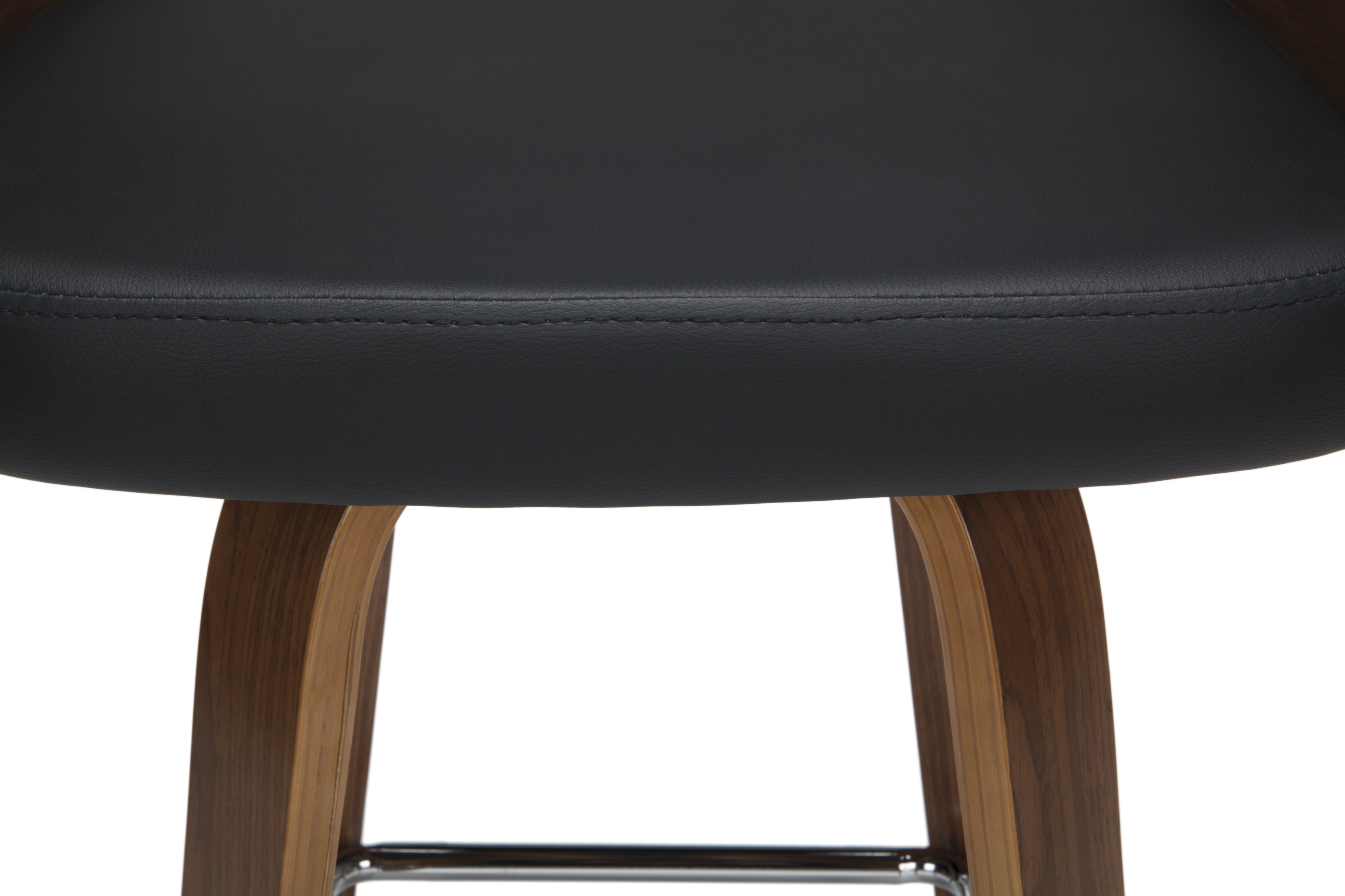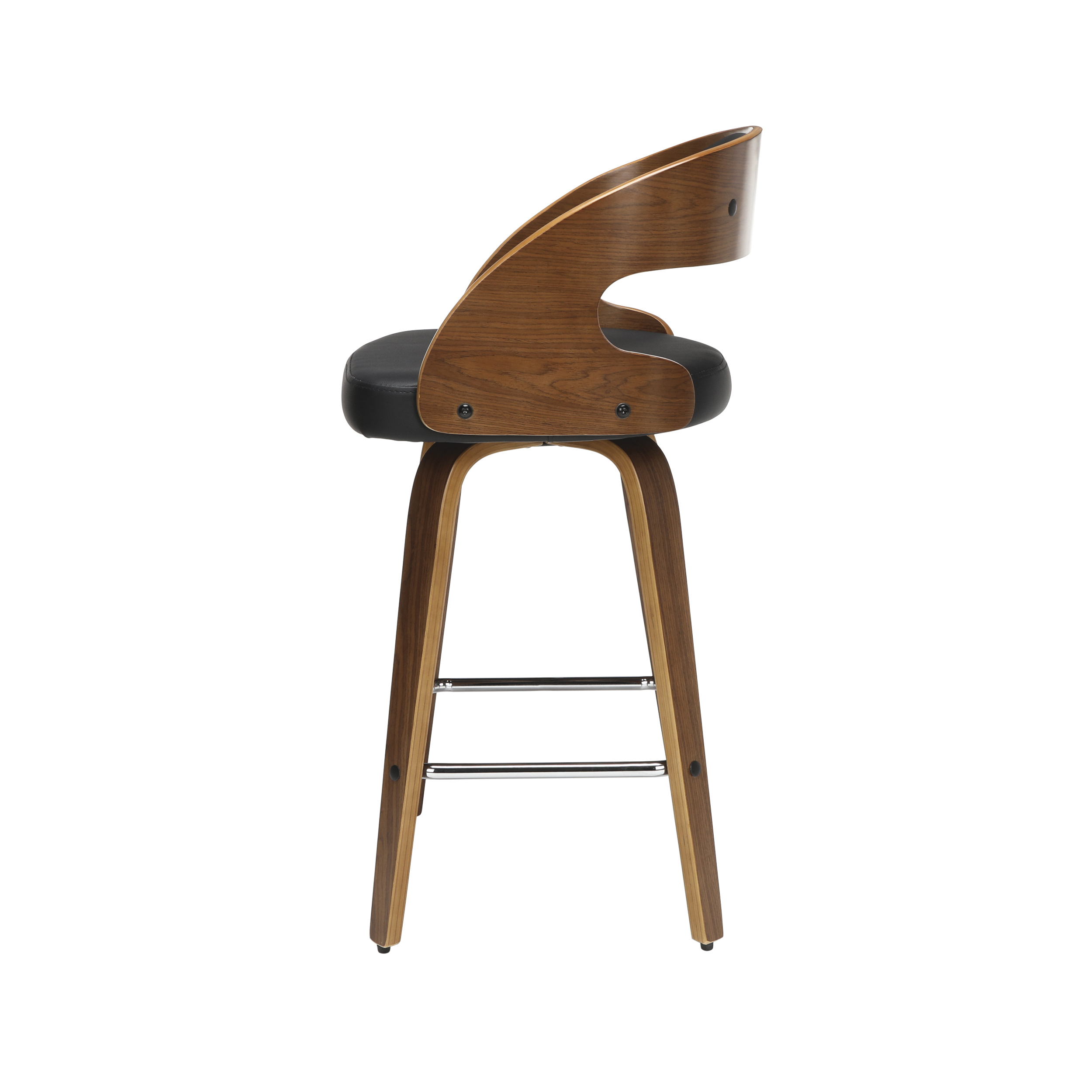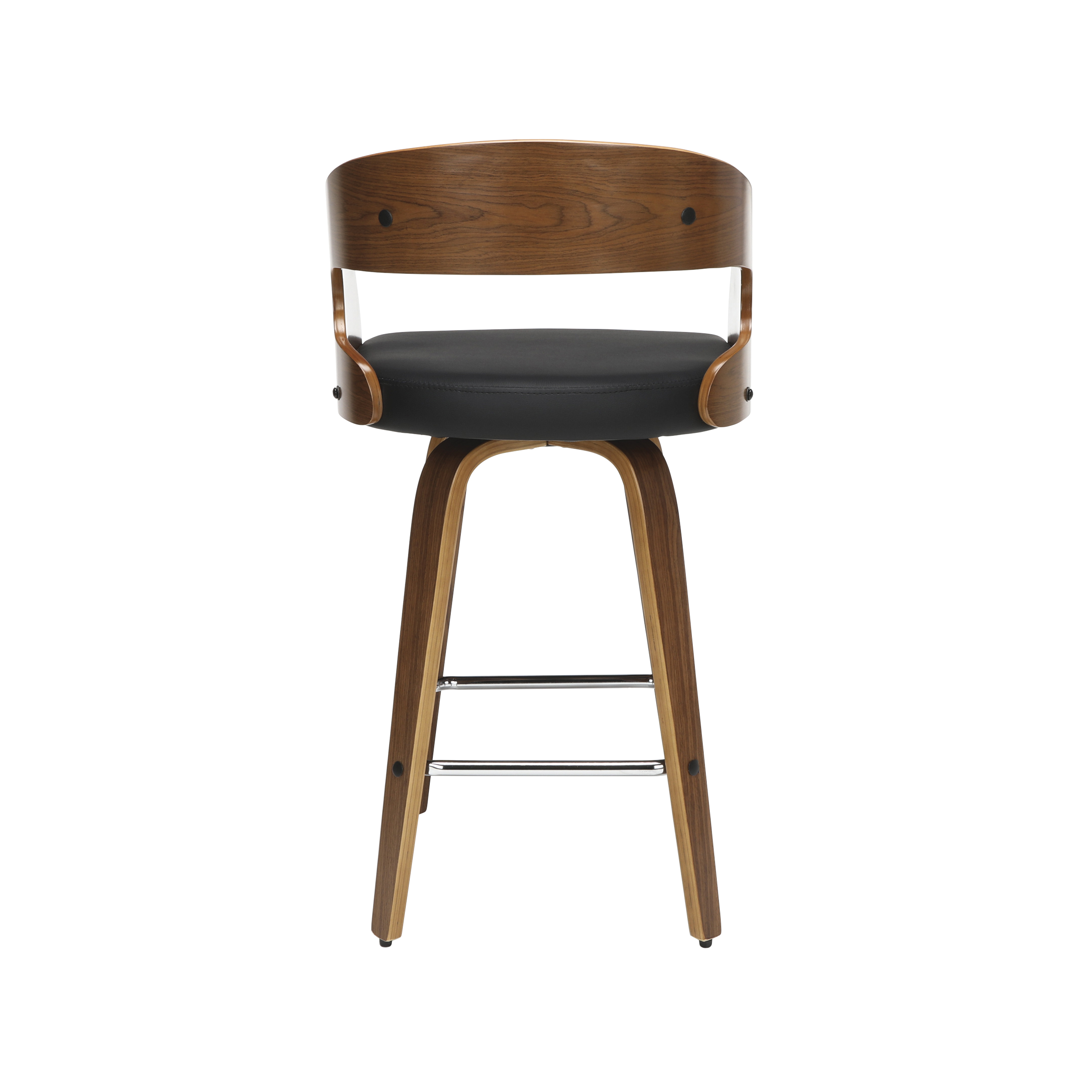 Mid century modern 26″ high swivel seat stool The dining chair stool features a bentwood frame with a rich Walnut finish This minimalist stool features a 1.5″ thick Black vinyl seat cushion for extra comfort Swivel seat stool allows for unrestricted 360-degree movement The curved bentwood seat back features a Black vinyl cushion for comfort and support Mid century modern stool features an artful solid wood waterfall leg with a Walnut finish This stool features a unique and stylish square shaped chrome footrest for comfort Installation is easy, simply affix waterfall legs to the chair base Standing height chair comes with plastic floor protectors, to prevent floor surface scratches and marks This retro stool can be used in multiple applications including kitchens, cafes, bars, and standing height desks Standard 26″ counter height chair measures 20″ D x 18″ W x 31.75″ H and holds users up to 250 lb This stool is backed by our 5 Year Limited Warranty