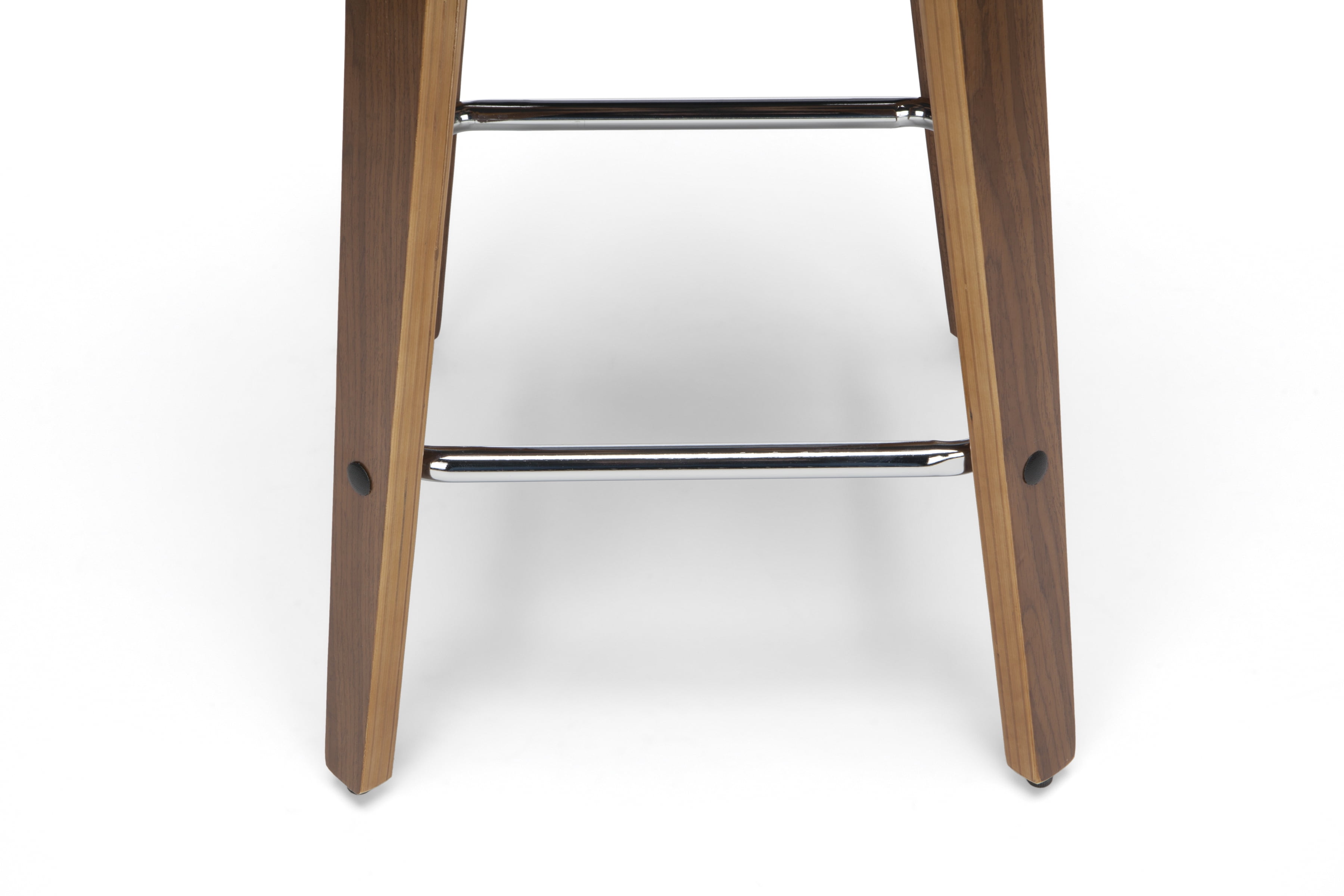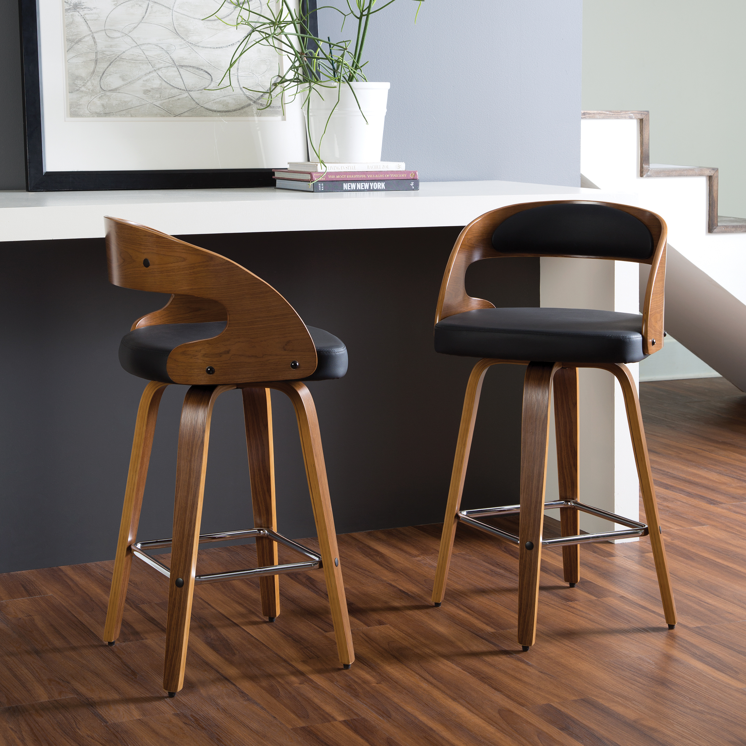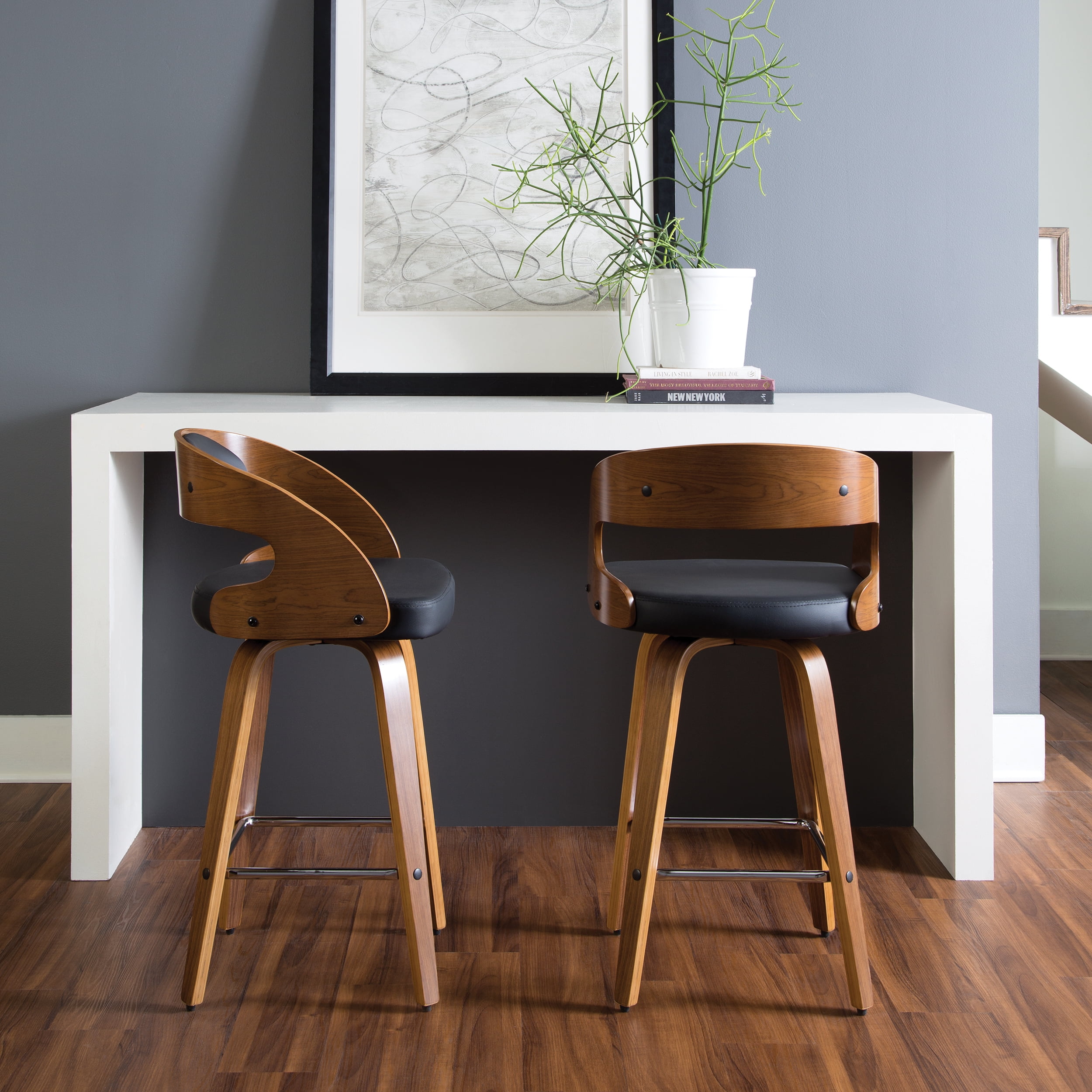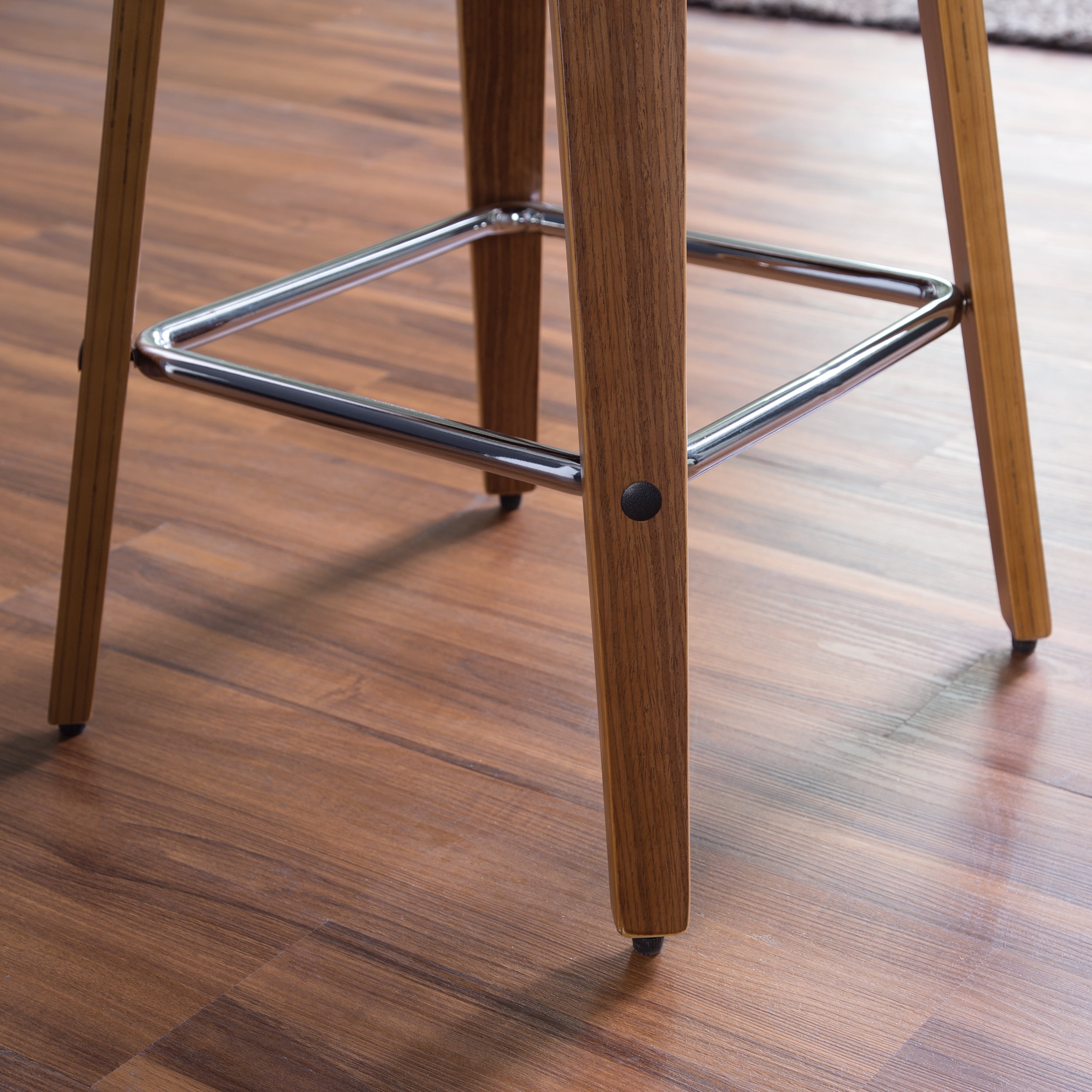 Mid century modern 26″ high swivel seat stool The dining chair stool features a bentwood frame with a rich Walnut finish This minimalist stool features a 1.5″ thick Black vinyl seat cushion for extra comfort Swivel seat stool allows for unrestricted 360-degree movement The curved bentwood seat back features a Black vinyl cushion for comfort and support Mid century modern stool features an artful solid wood waterfall leg with a Walnut finish This stool features a unique and stylish square shaped chrome footrest for comfort Installation is easy, simply affix waterfall legs to the chair base Standing height chair comes with plastic floor protectors, to prevent floor surface scratches and marks This retro stool can be used in multiple applications including kitchens, cafes, bars, and standing height desks Standard 26″ counter height chair measures 20″ D x 18″ W x 31.75″ H and holds users up to 250 lb This stool is backed by our 5 Year Limited Warranty