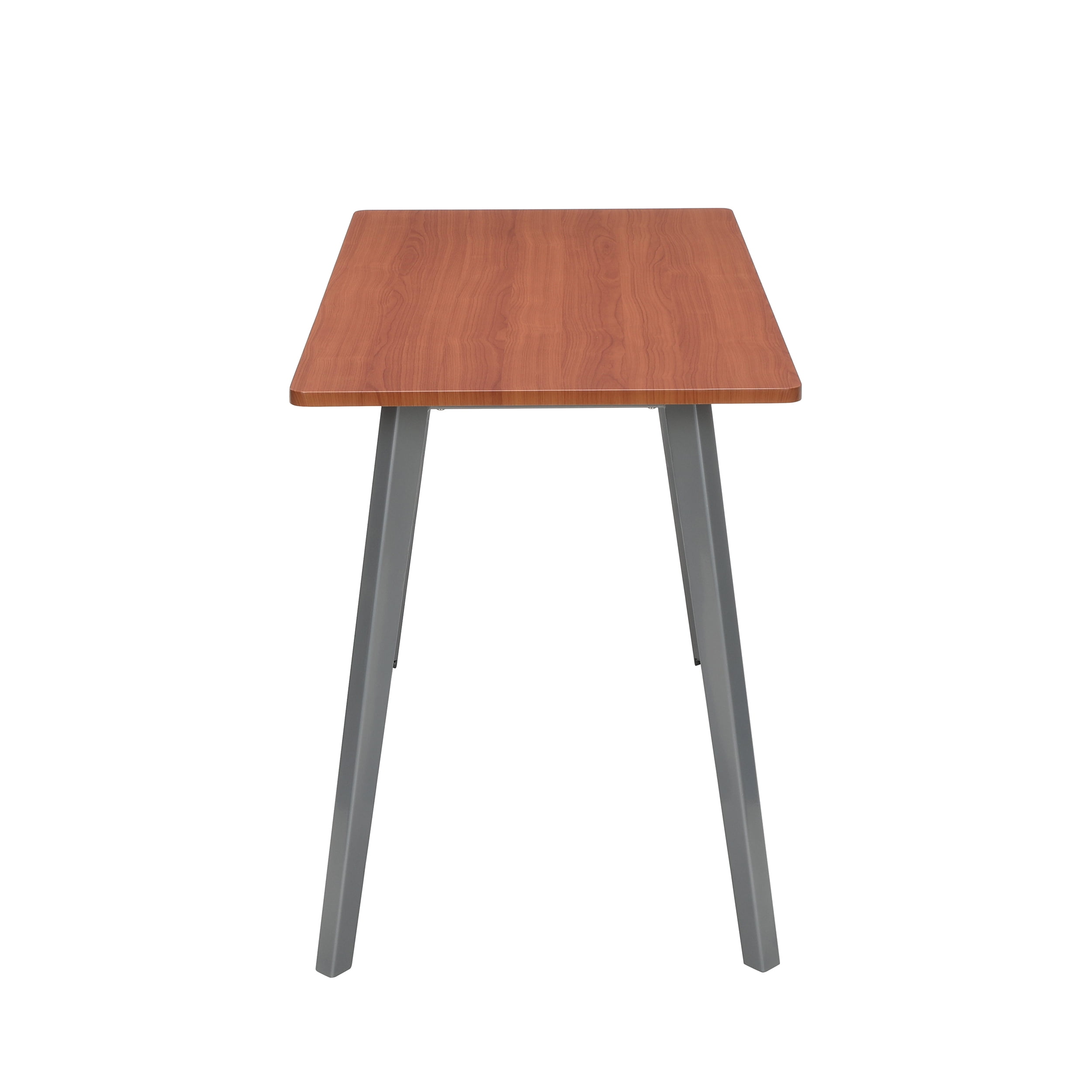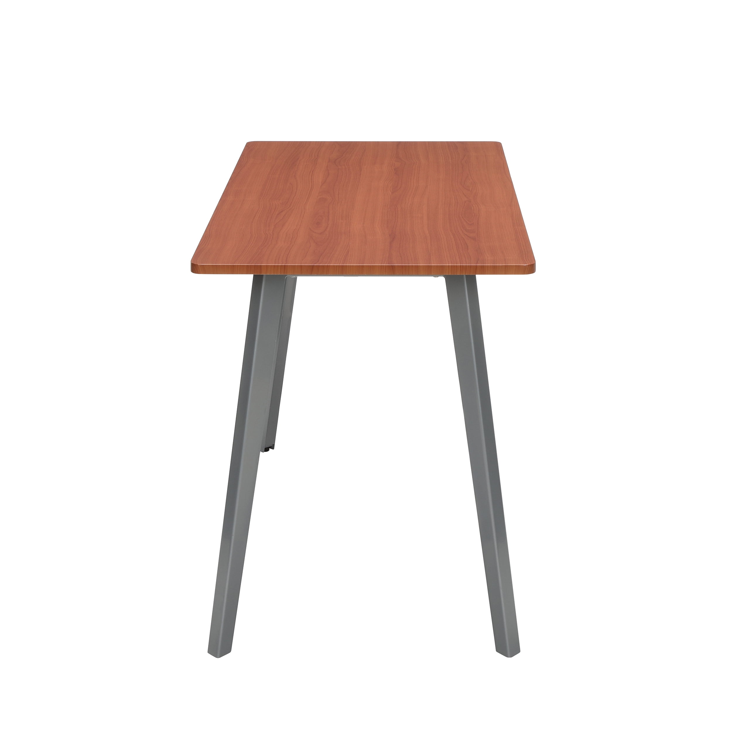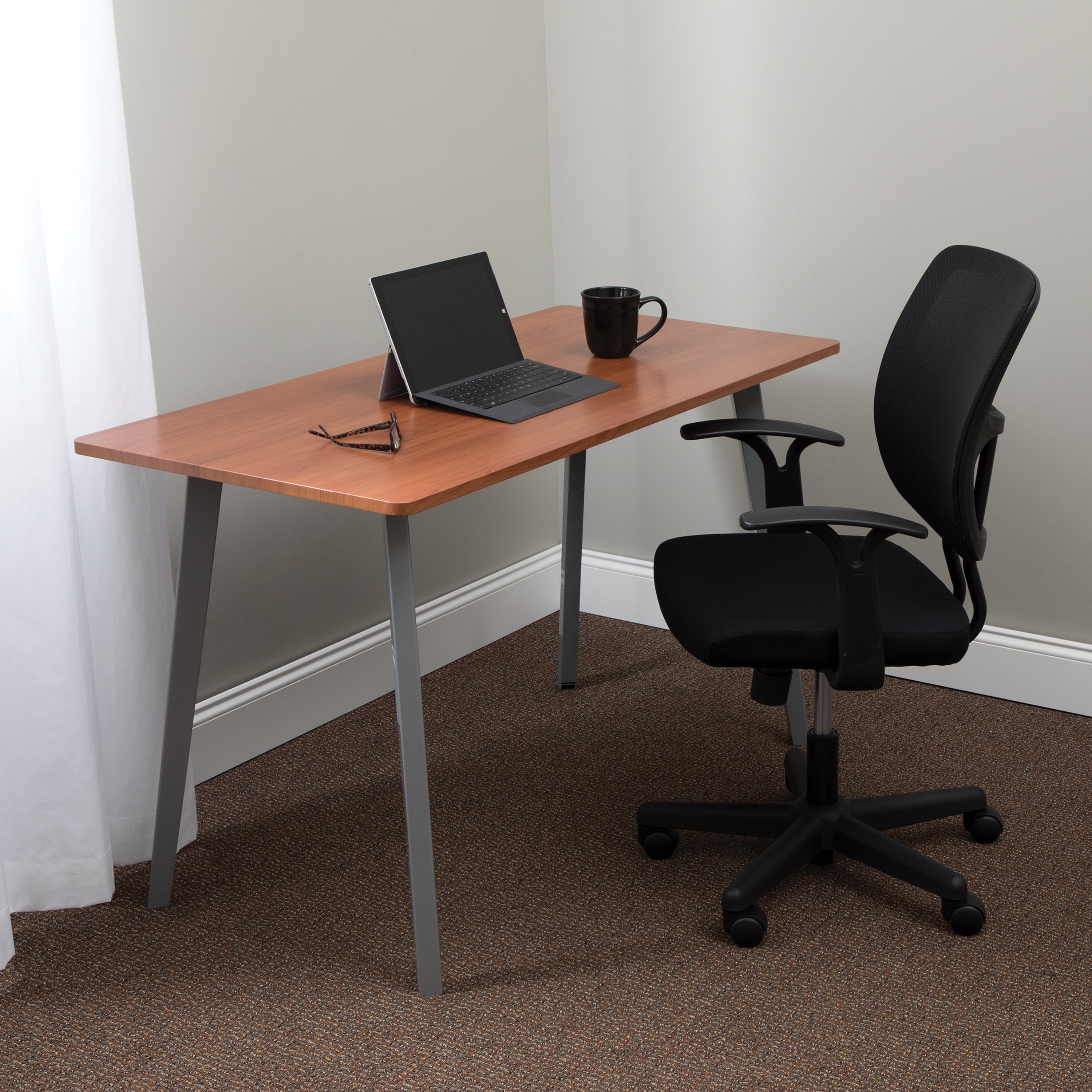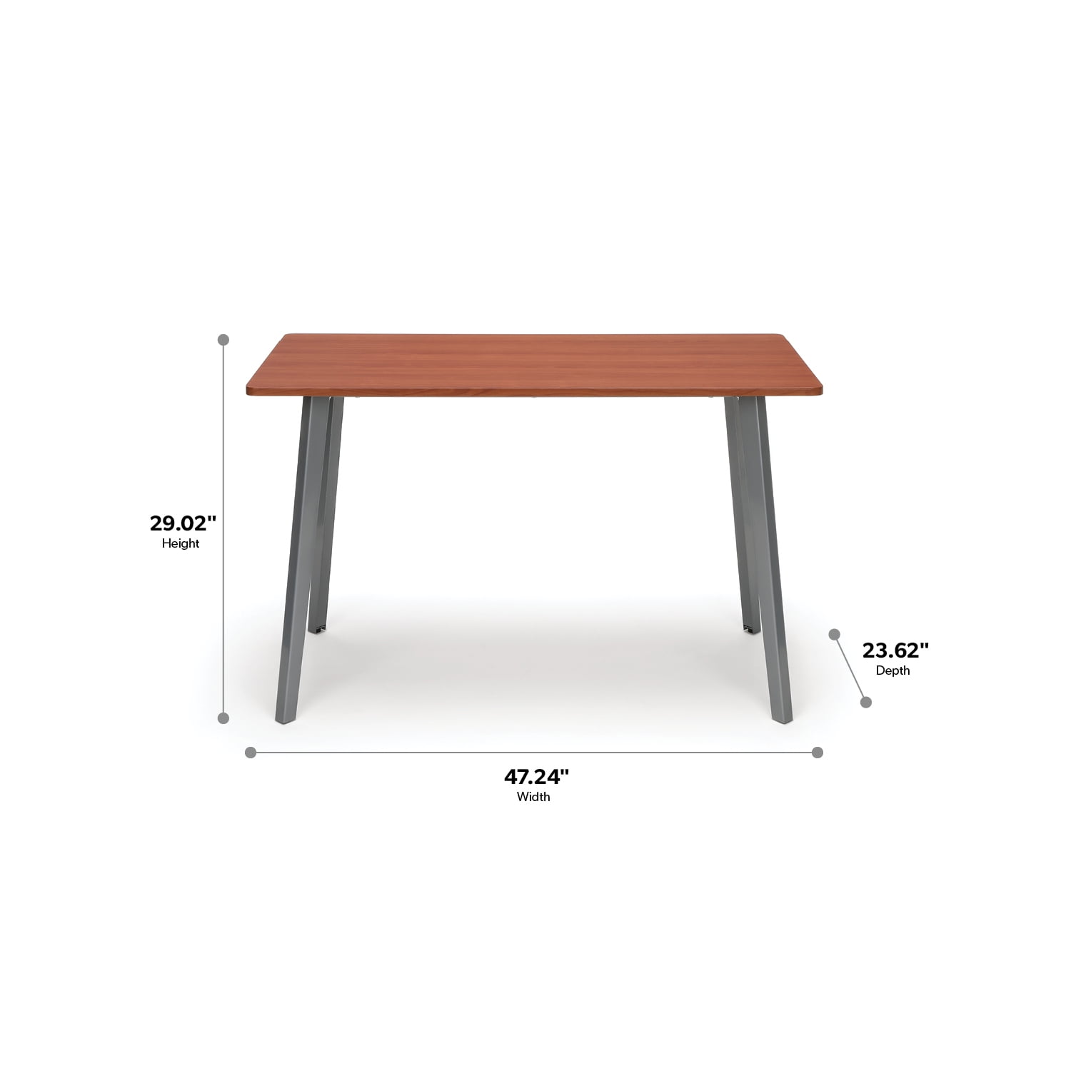 The industrial modern computer desk has simple,sleek silver angled legs that easily fit a home or office setting The durable MDF desktop core is wrapped in PVC for a stylish and long lasting Cherry tabletop finish Rounded table edges, 3/4″ thick surface, and strong angled legs mixes up delicate with industrial for an edgy look Weighing less than 40 lb, it might seem like a lightweight desk, but it holds a hefty 200 lb of weight This desk features simple and sleek lines and that also means it’s easy and quick to assemble Adjustable leg glides allow incremental height to be added to any of the legs to account for an unlevel floor surface With overall dimensions of 47.24″ L x 23.62″ D x 29.02″ H, the use options for this contemporary office desk are nearly endless This stunning wooden desk is backed by the OFM 10-Year Limited Warranty