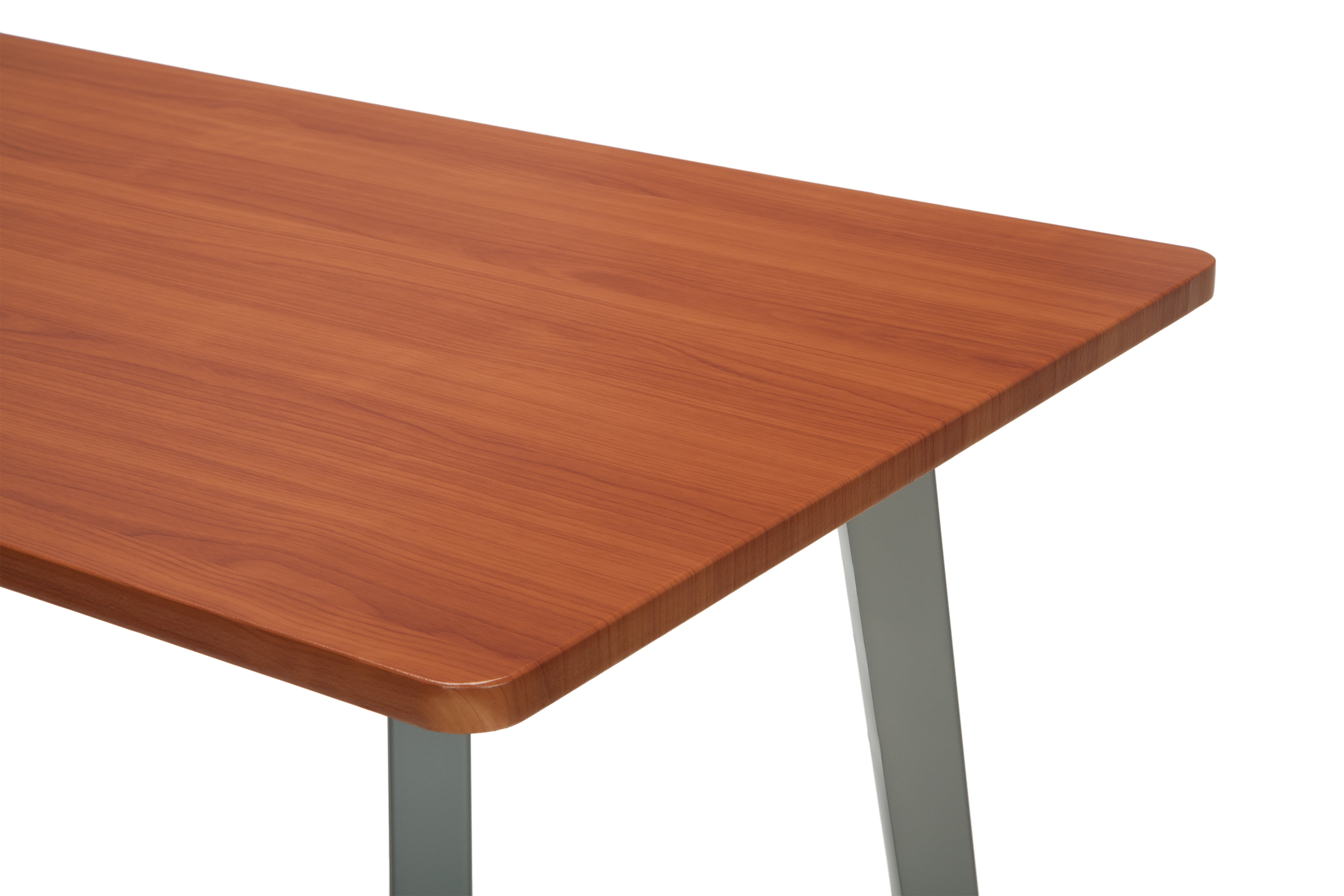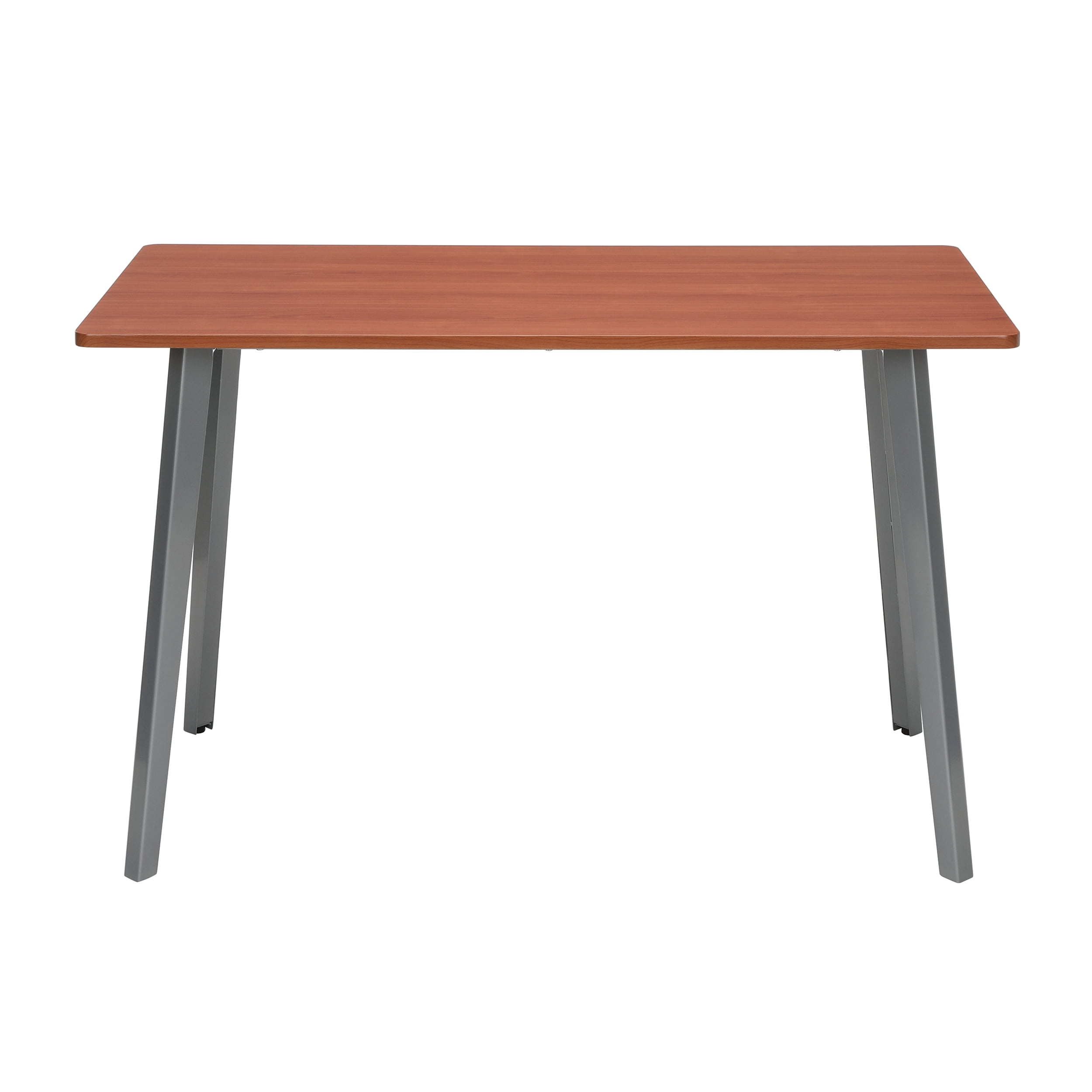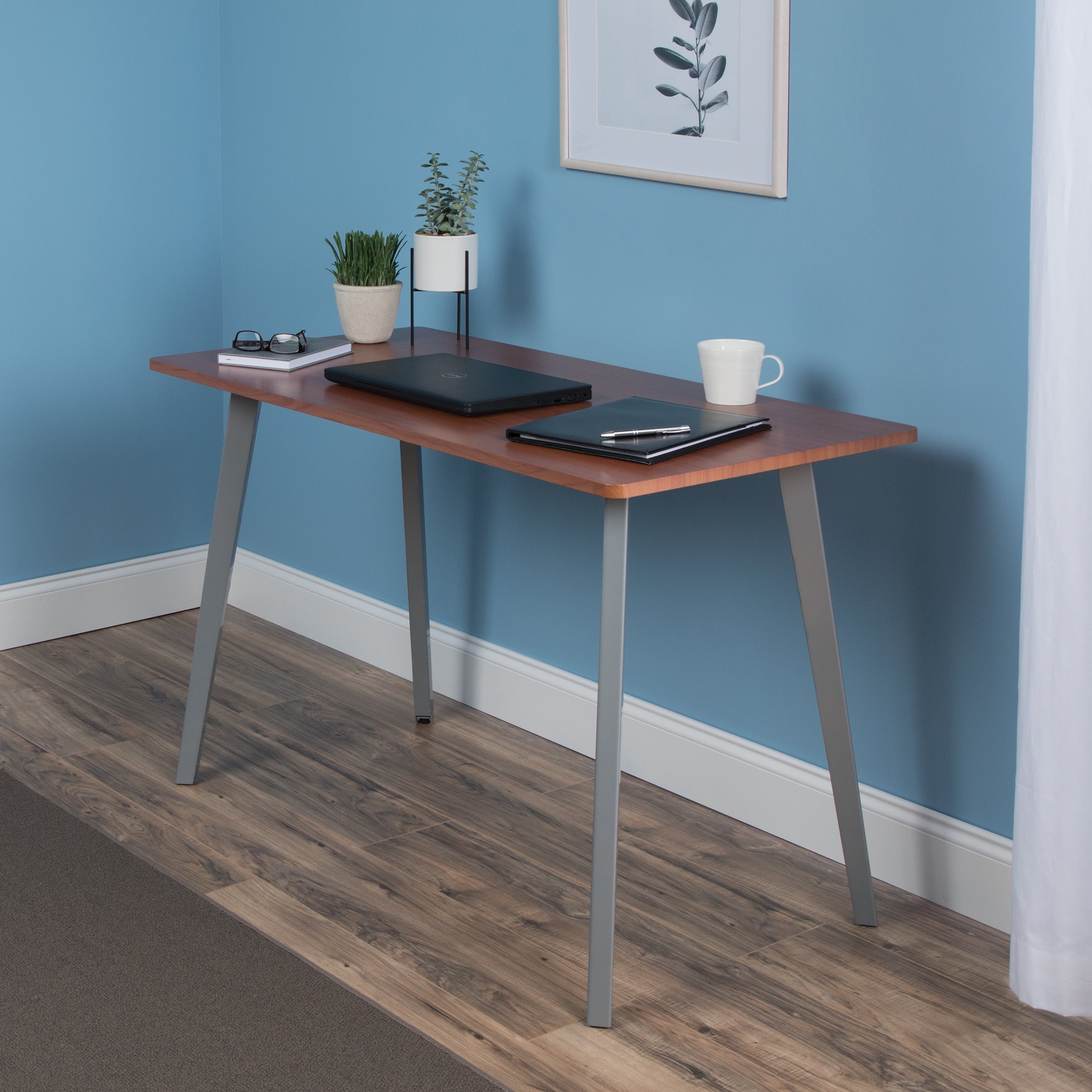 The industrial modern computer desk has simple,sleek silver angled legs that easily fit a home or office setting The durable MDF desktop core is wrapped in PVC for a stylish and long lasting Cherry tabletop finish Rounded table edges, 3/4″ thick surface, and strong angled legs mixes up delicate with industrial for an edgy look Weighing less than 40 lb, it might seem like a lightweight desk, but it holds a hefty 200 lb of weight This desk features simple and sleek lines and that also means it’s easy and quick to assemble Adjustable leg glides allow incremental height to be added to any of the legs to account for an unlevel floor surface With overall dimensions of 47.24″ L x 23.62″ D x 29.02″ H, the use options for this contemporary office desk are nearly endless This stunning wooden desk is backed by the OFM 10-Year Limited Warranty