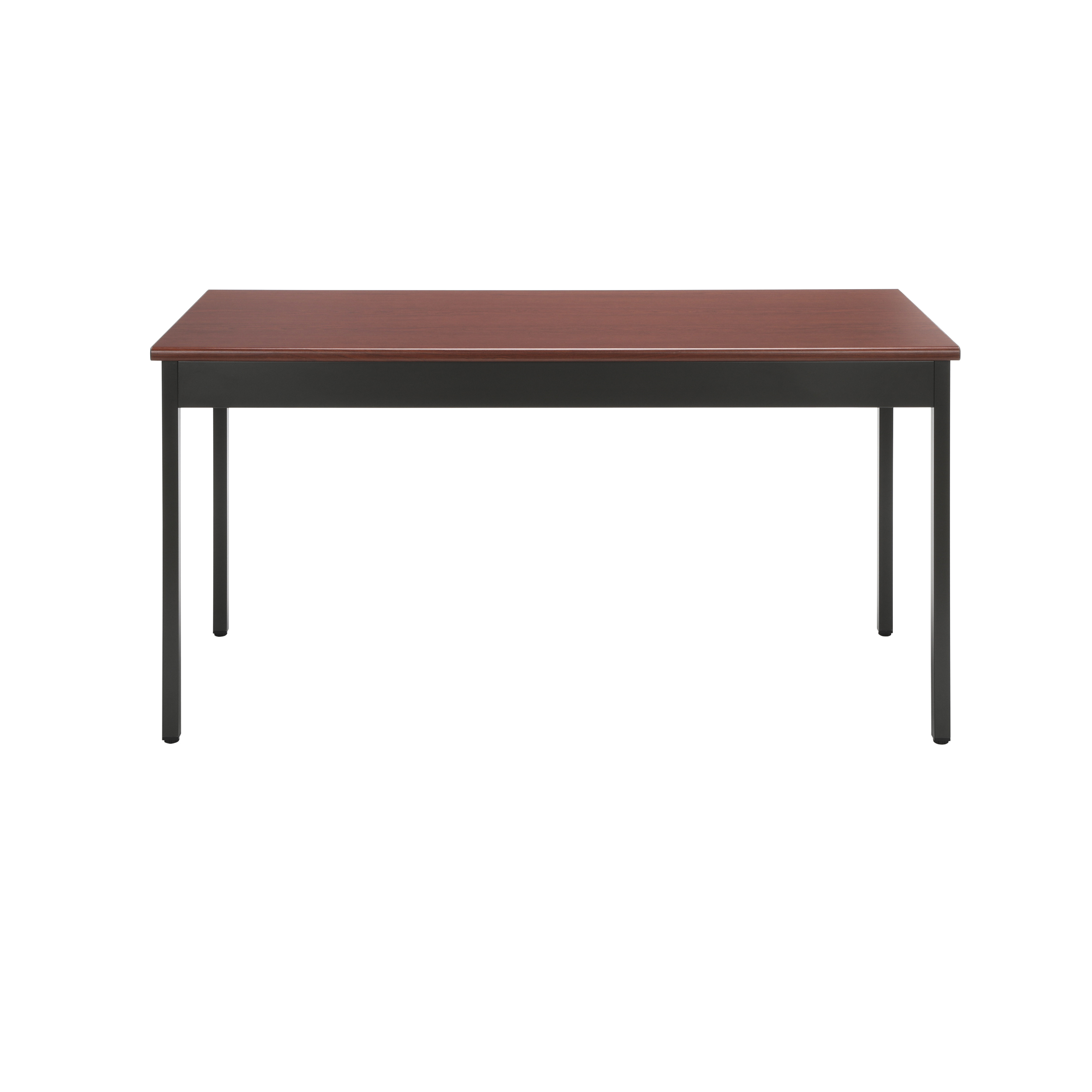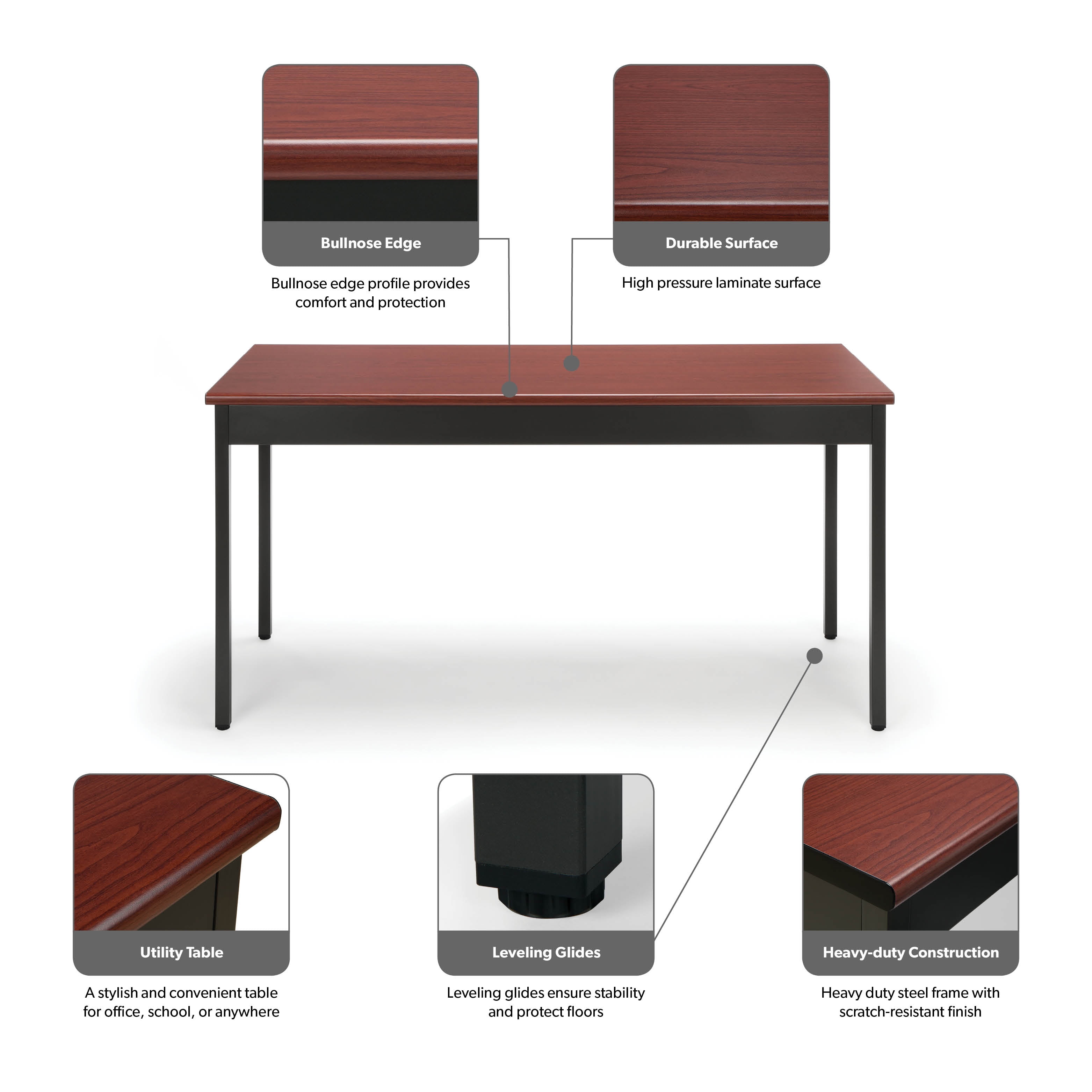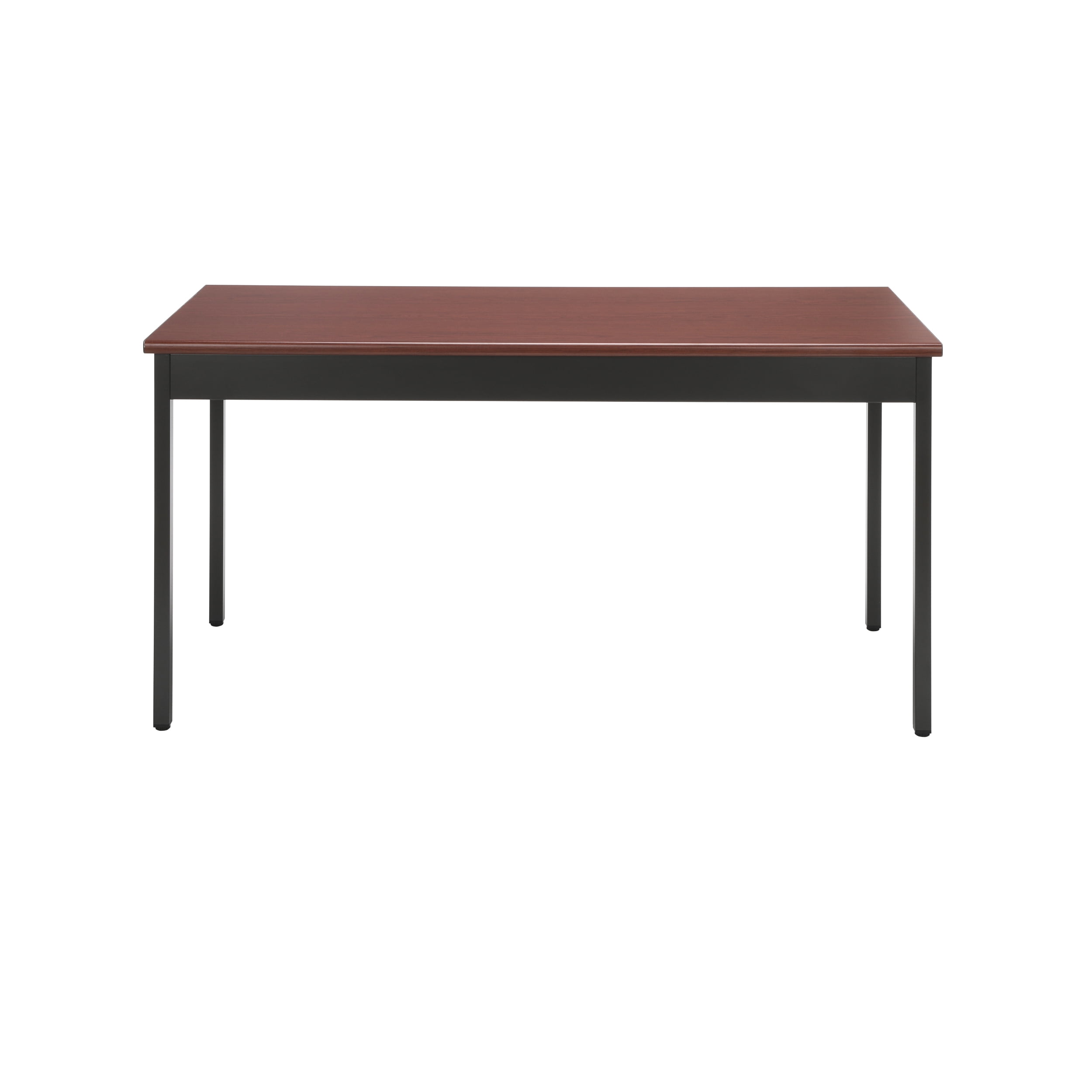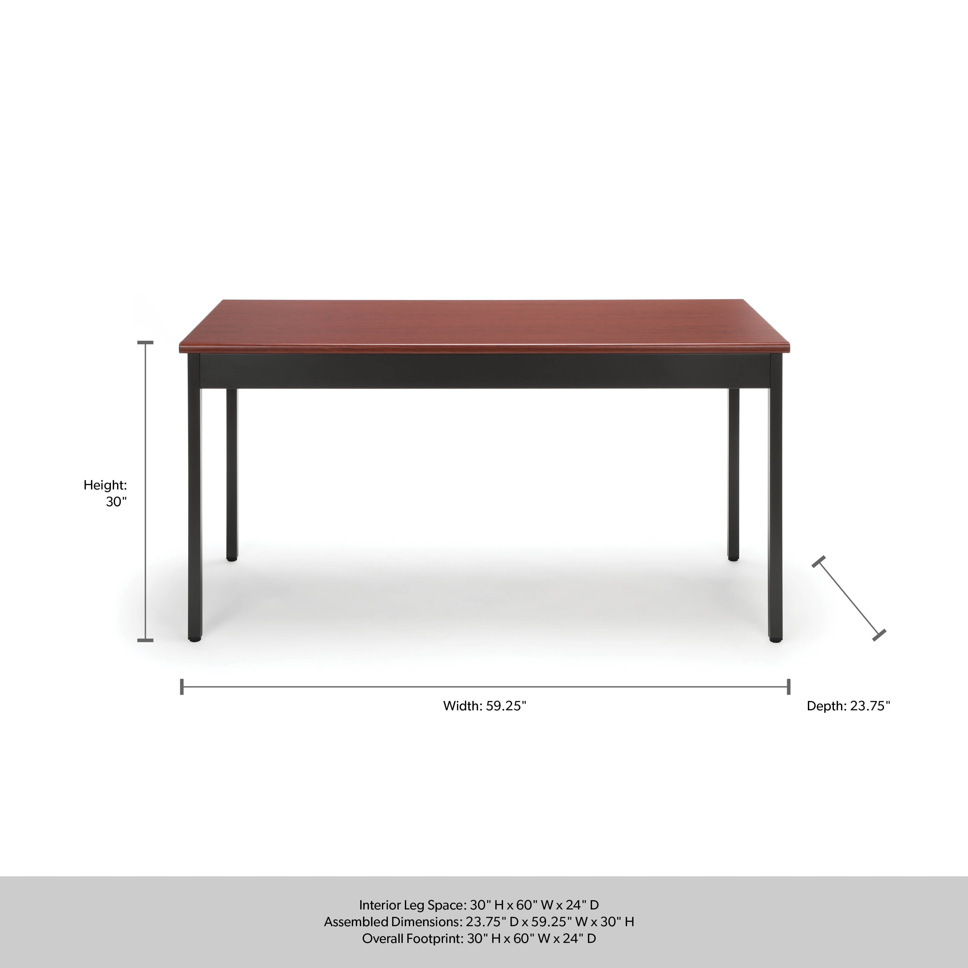 Color: Cherry Mar-proof high pressure laminate surface Built-in floor glides Designed and built for commercial use Pictured in Cherry Overall: 60 in. L x 24 in. D x 30 in. H This attractive and functional 24 in. x 60 in. utility table is perfect for any library, school, office, or other work environment. The contemporary design with bull nose edges and hi-pressure laminate tabletop will complement any decor. It is both strong and sturdy, with 14 gauge steel and built-in adjustable leg glides. Easy assembly.