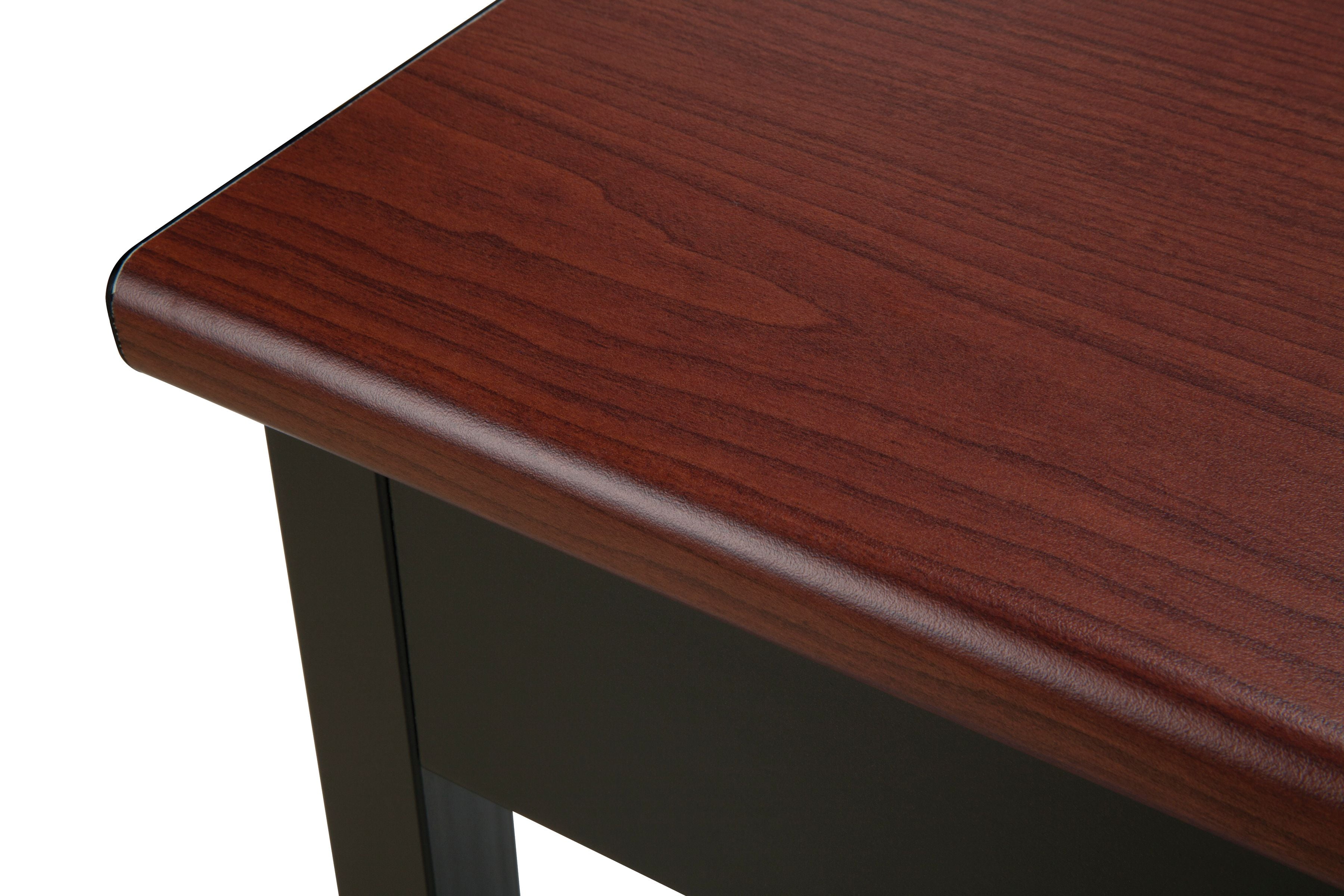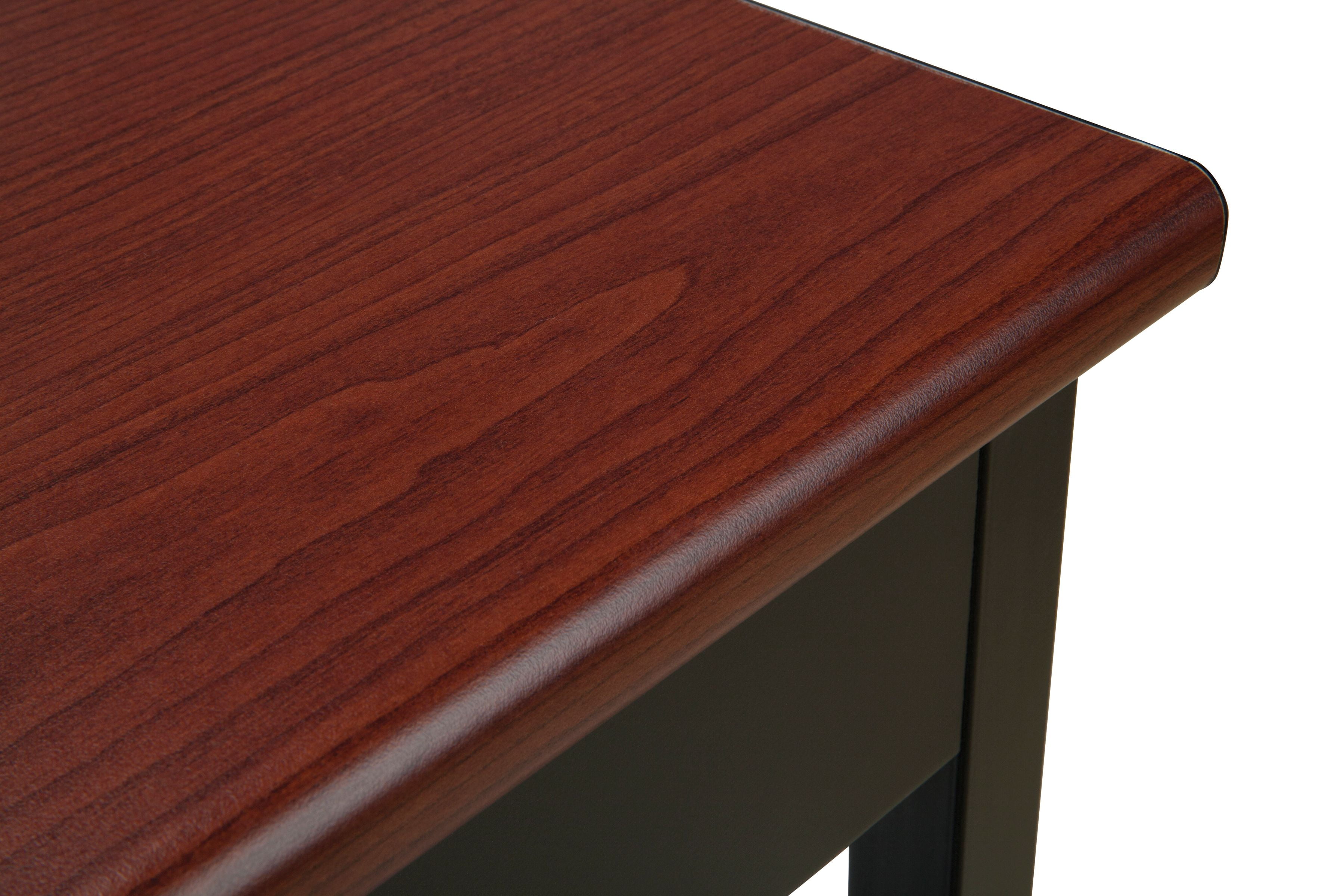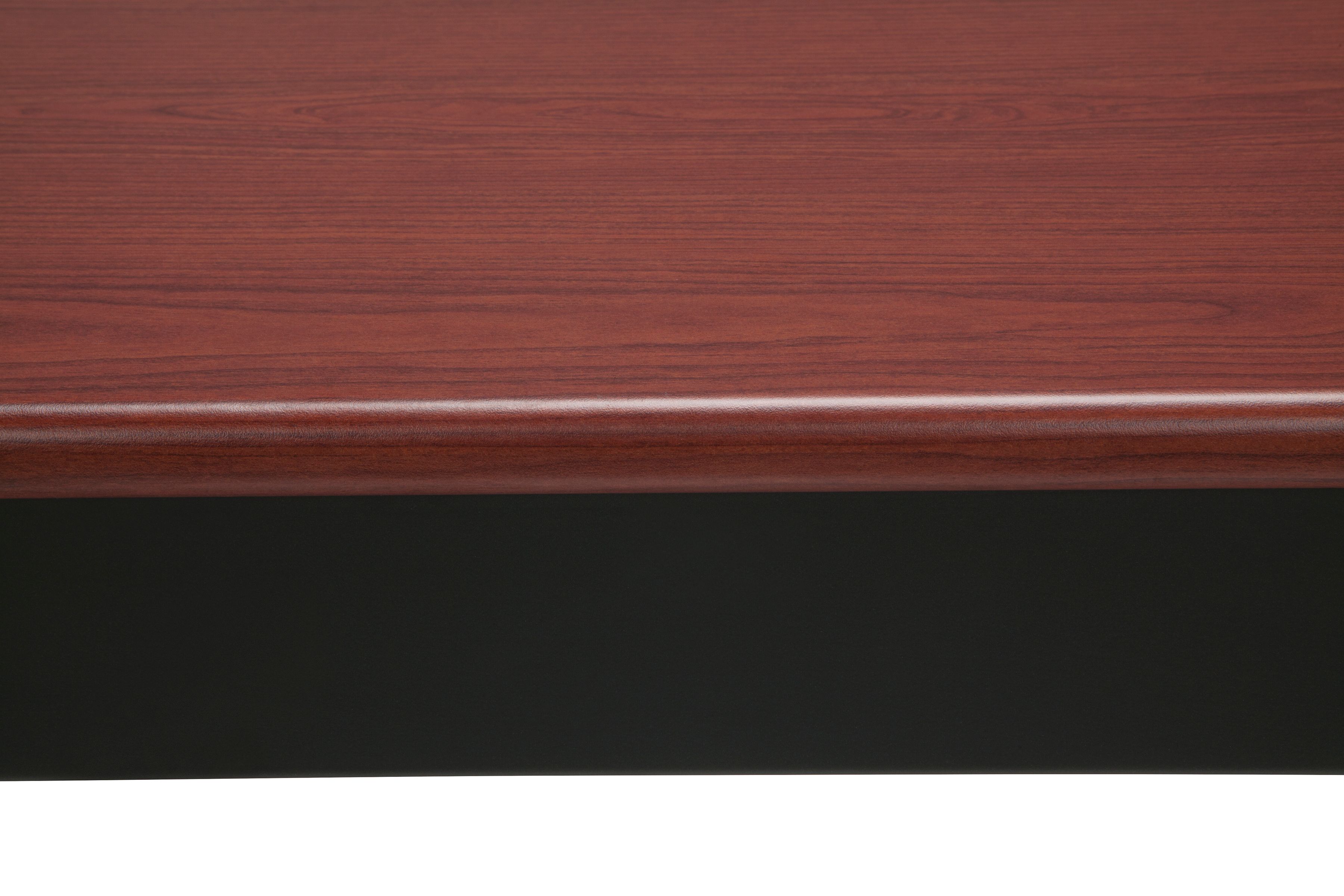 Color: Cherry Mar-proof high pressure laminate surface Built-in floor glides Designed and built for commercial use Pictured in Cherry Overall: 60 in. L x 24 in. D x 30 in. H This attractive and functional 24 in. x 60 in. utility table is perfect for any library, school, office, or other work environment. The contemporary design with bull nose edges and hi-pressure laminate tabletop will complement any decor. It is both strong and sturdy, with 14 gauge steel and built-in adjustable leg glides. Easy assembly.