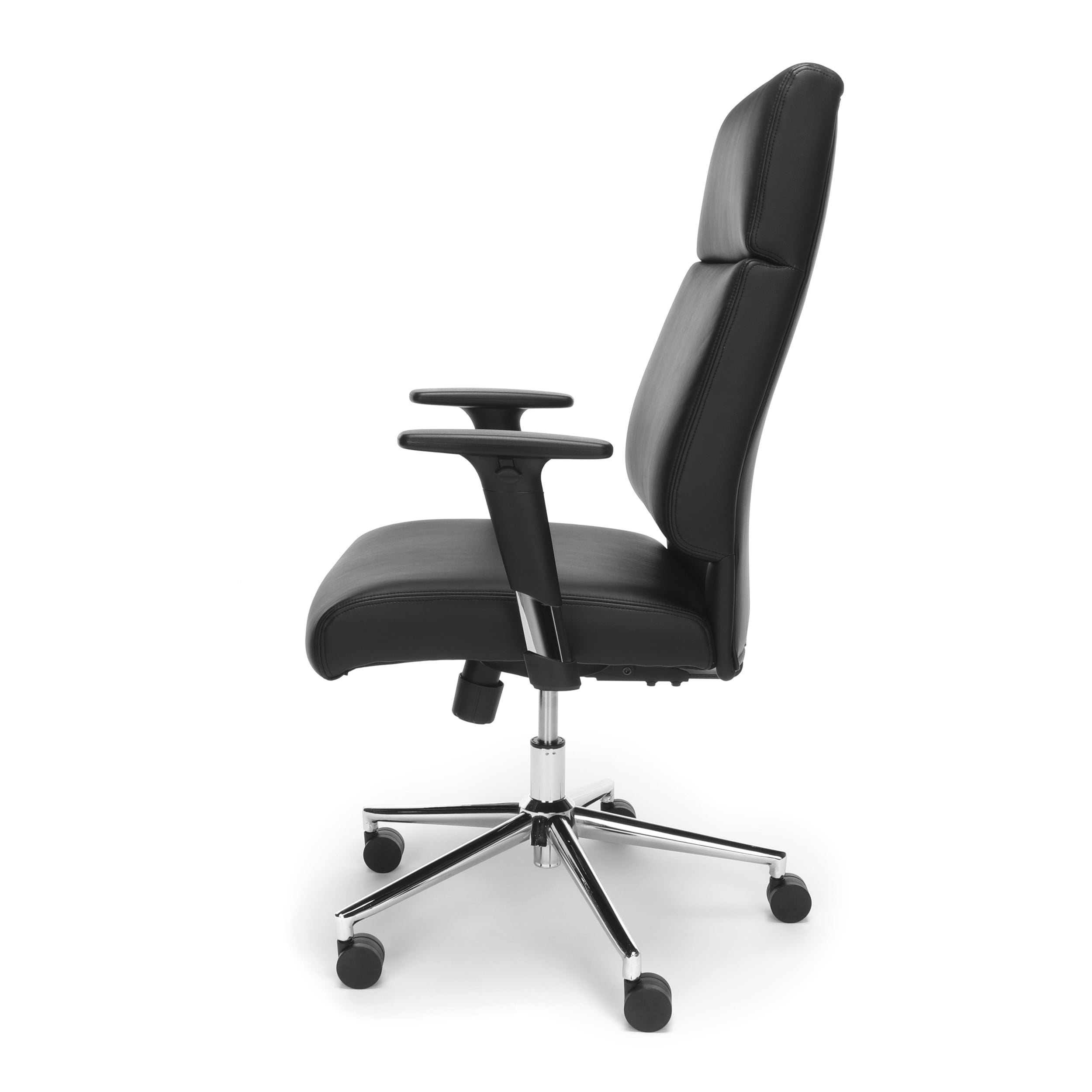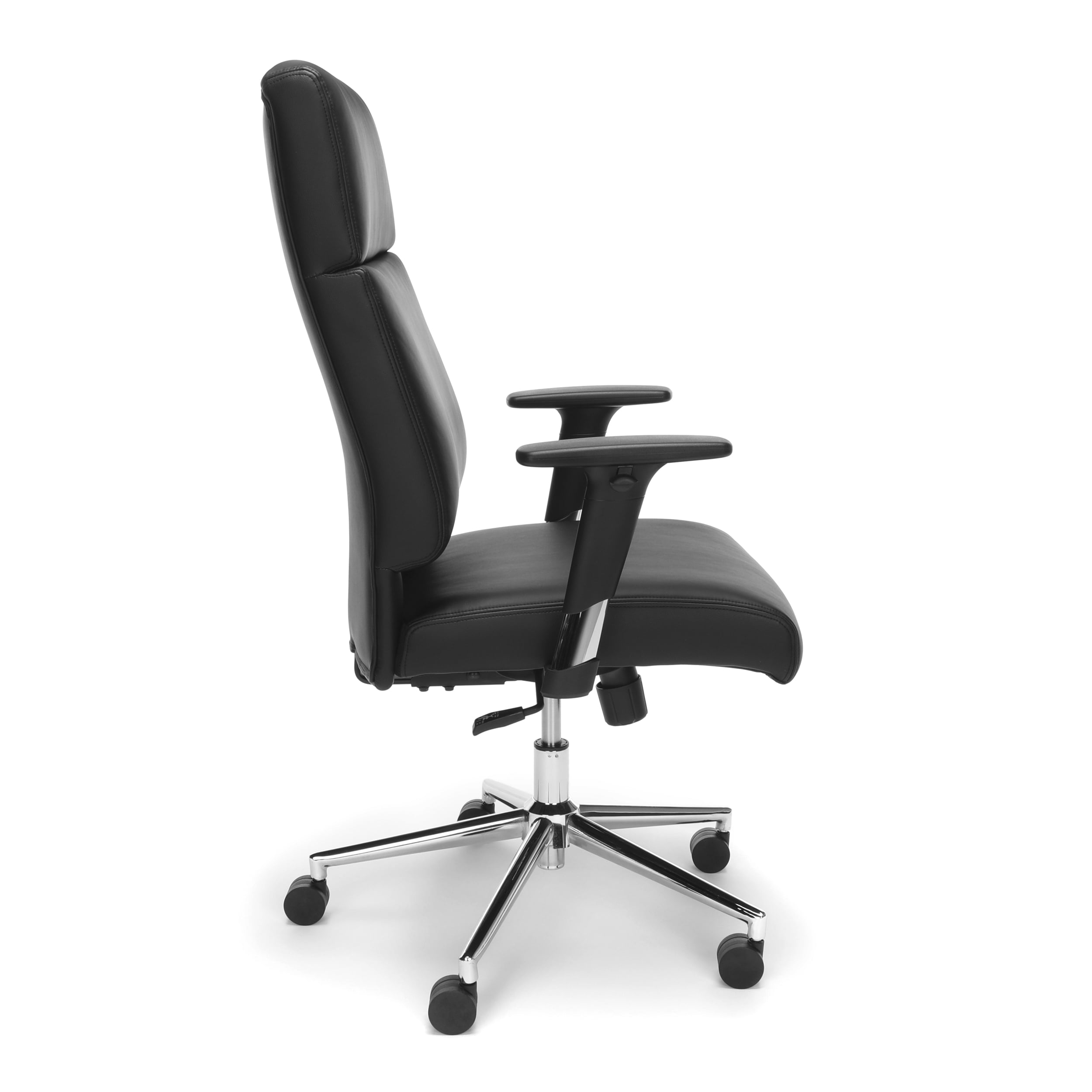 LEATHER WORK CHAIR: Provide the ultimate relaxation and comfort behind your desk with this chair’s extra thick back support ERGONOMIC ADJUSTMENTS: The lock and tilt mechanism for this chair allows for easy recline or lock in the upright position DURABLE OFFICE FURNITURE: The chrome base of this chair gives an elegant accent to your office space CHAIR with ARMS: This chair has height adjustable arms for total upper-body support OFFICE CHAIR with WARRANTY: The twin-wheel casters on the base provide easy mobility, and allow a weight capacity up to 250 lb. Backed by the OFM 10-Year Limited Warranty.