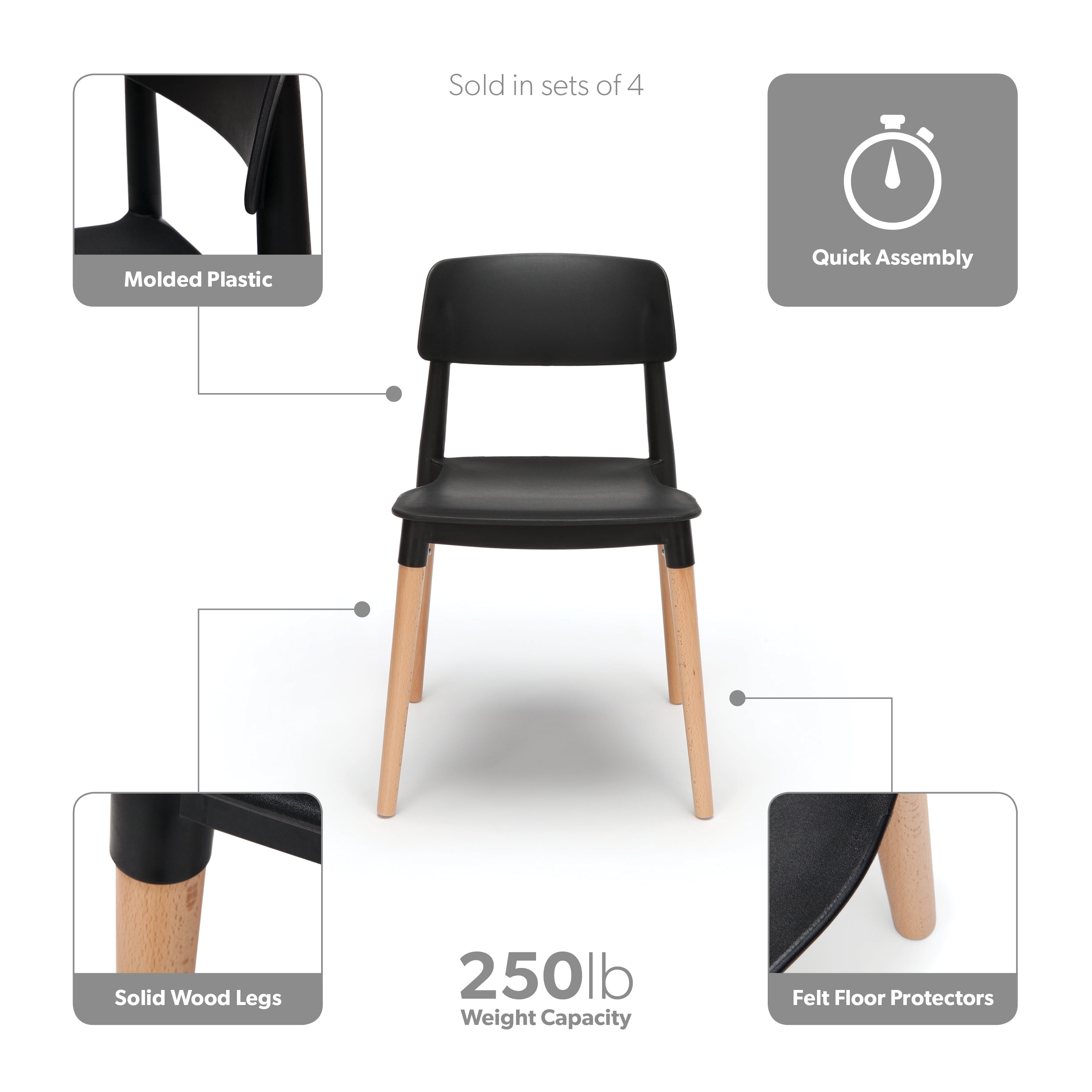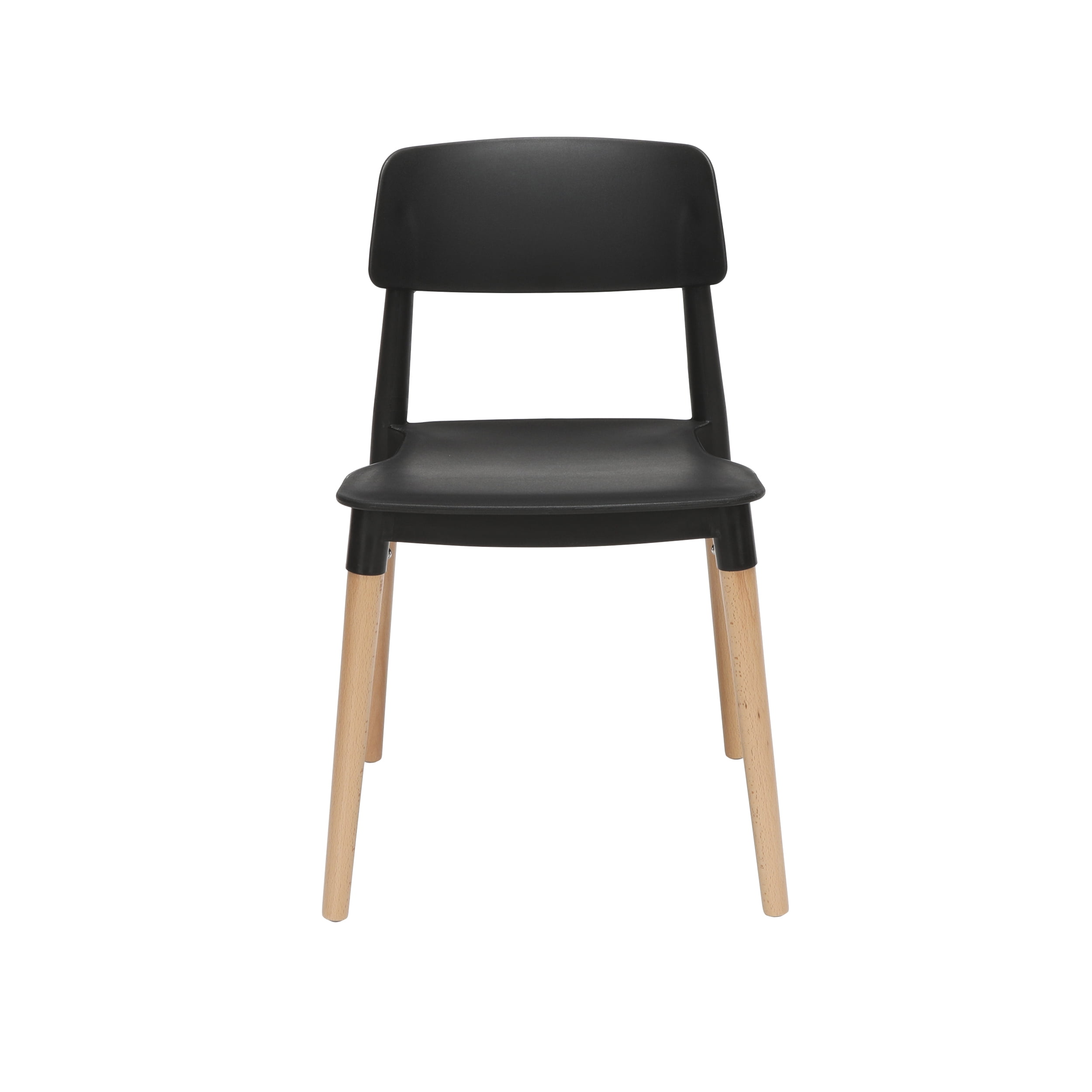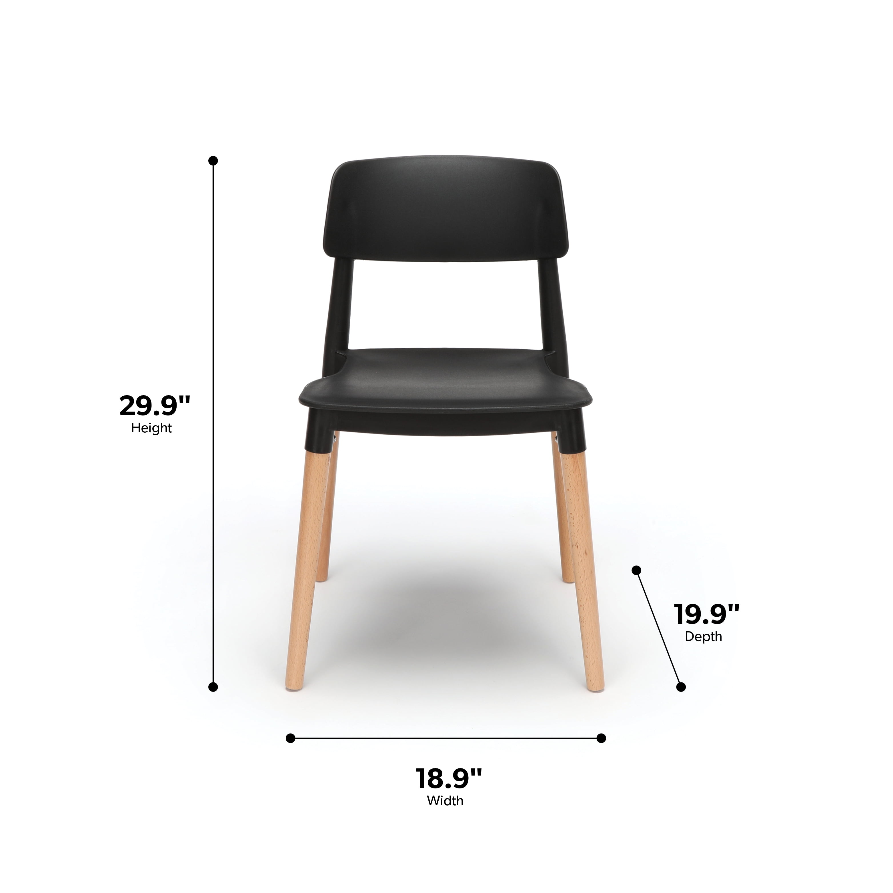 This mid-century modern dining chair delivers chic simplicity and is sold in sets of 4 The dining chair seat and back are made of a durable molded plastic The ergonomic seat shape provides easy sitting Solid natural wood legs provide support to hold users up to 250 lb The plastic seat makes it easy to clean and ideal for high traffic areas Installation is quick and easy, the sturdy wood legs simply screw into chair base Dining chairs come with felt floor protectors to prevent floor surface scratches and marks This chair can be used in multiple locations including kitchens, bedrooms, living rooms, waiting rooms, lobbies, and reception areas Standard 18″ dining chairs measure 19.29″ D x 16.90″ W x 29.92″ H