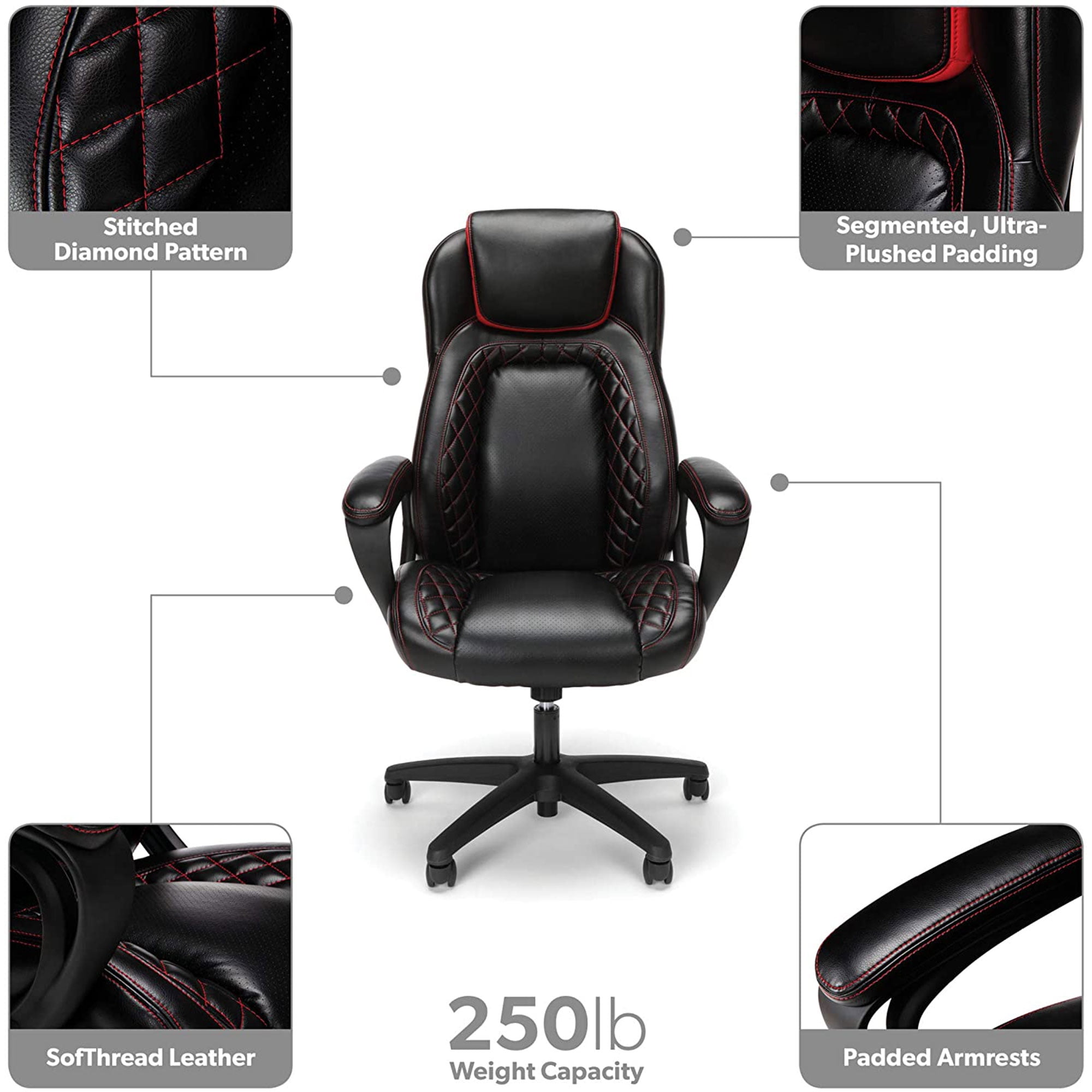Experience premium comfort and support for those long days at the desk with the ESS Collection Racing Style SofThread Leather High Back Office Chair from OFM. With premium make and materials, this chair provides superior luxury and comfort that will last for years to come. Unlike any other ordinary office chair, this chair elevates your seating experience with a premium red thread stitched diamond pattern that provides a sophisticated detail and adds an extra dimension of comfort. This computer chair features contoured, segmented ultra-plush padding and is upholstered in pitted, breathable SofThread leather that provides a luxurious feel to the touch. The integrated headrest and arms are padded for all-day comfort and support with a 5-star base that is molded from reinforced resin with a 360-degree swivel. The center-tilt mechanism rotates the chair seat and reclines comfortably into your ideal position while the tilt tension controls the rate and ease of recline. With a wide seat and a 250-pound weight capacity, this seat can accommodate virtually everyone with comfort. Get expert comfort and style all-in-1 with the OFM ESS Collection Racing Style SofThread Leather High Back Office Chair.
