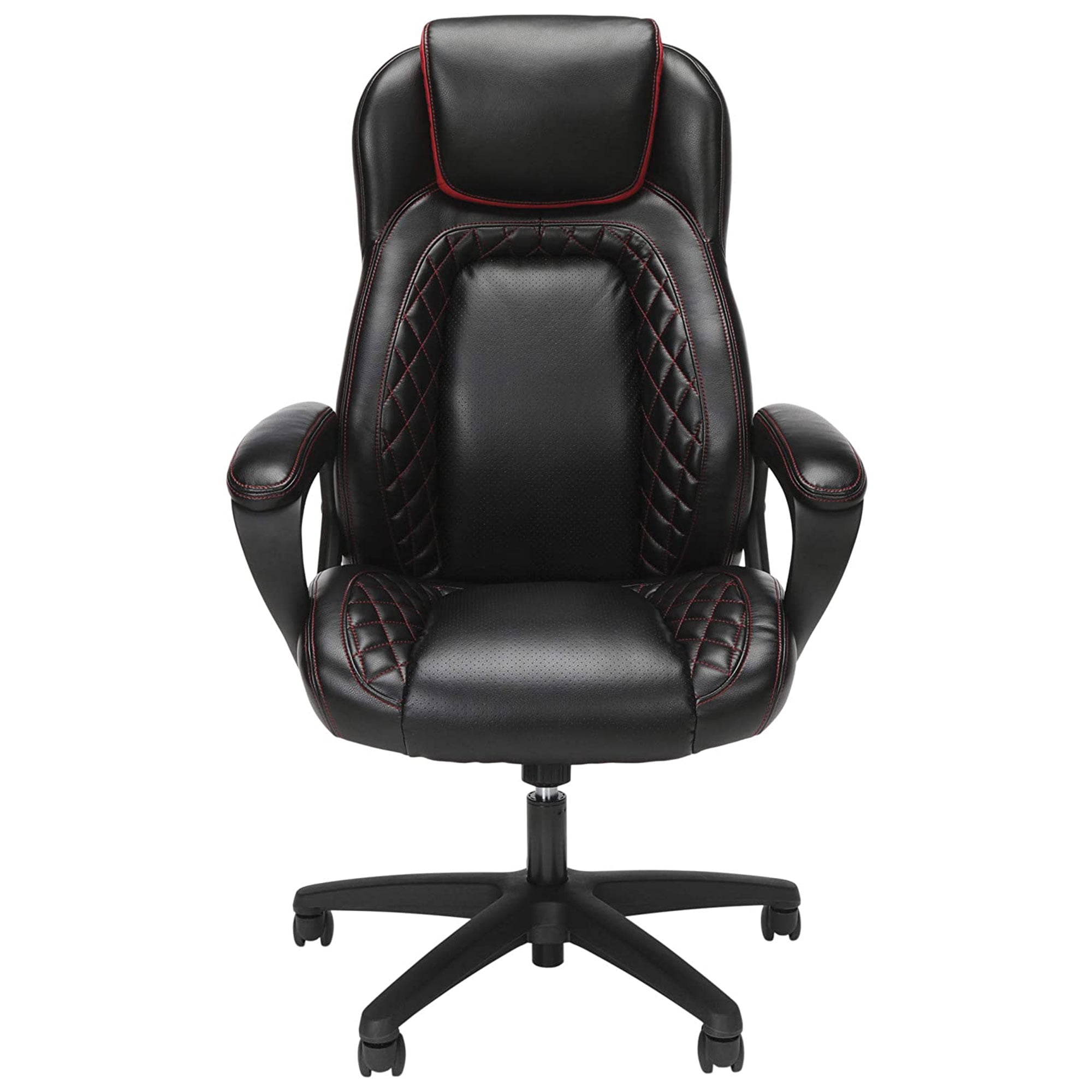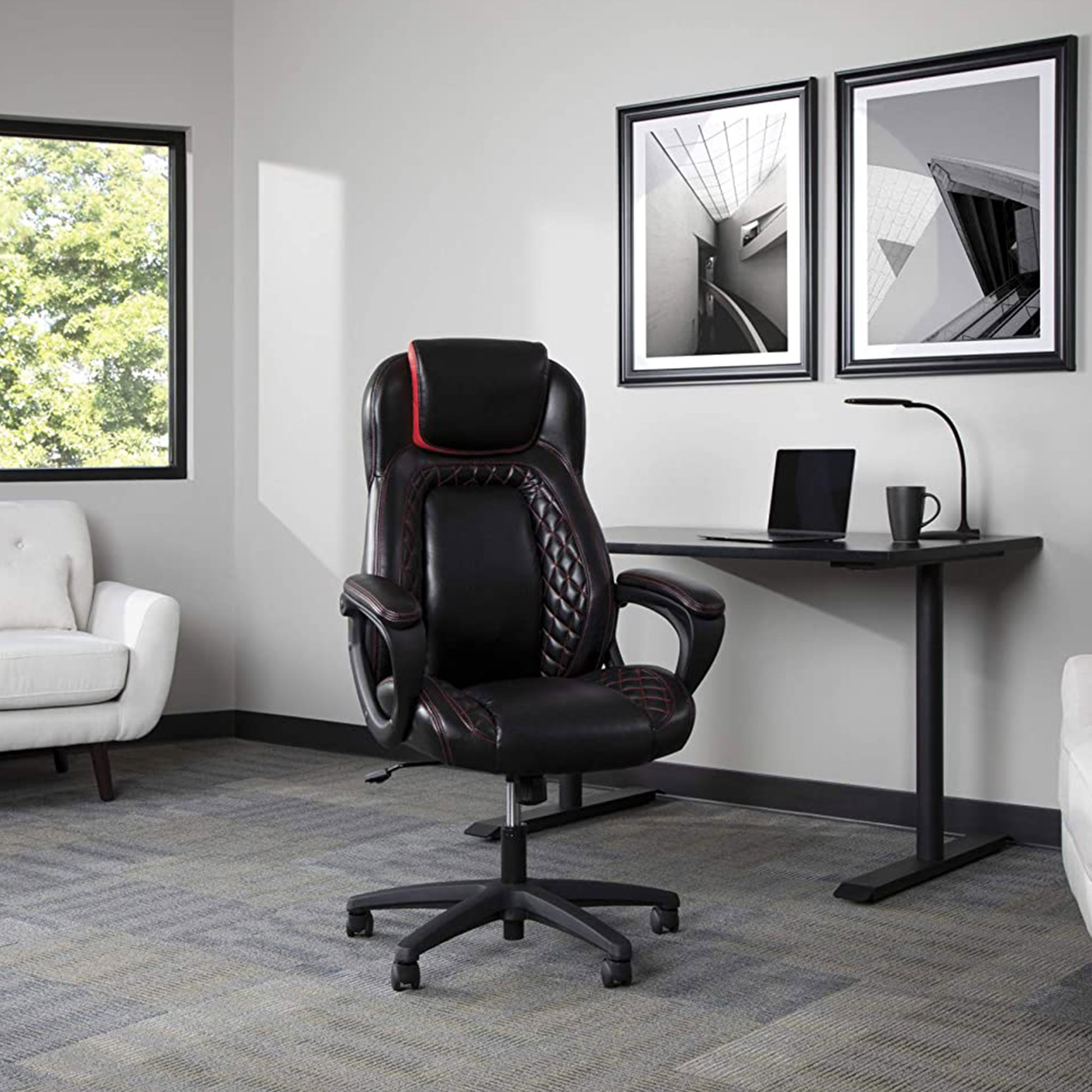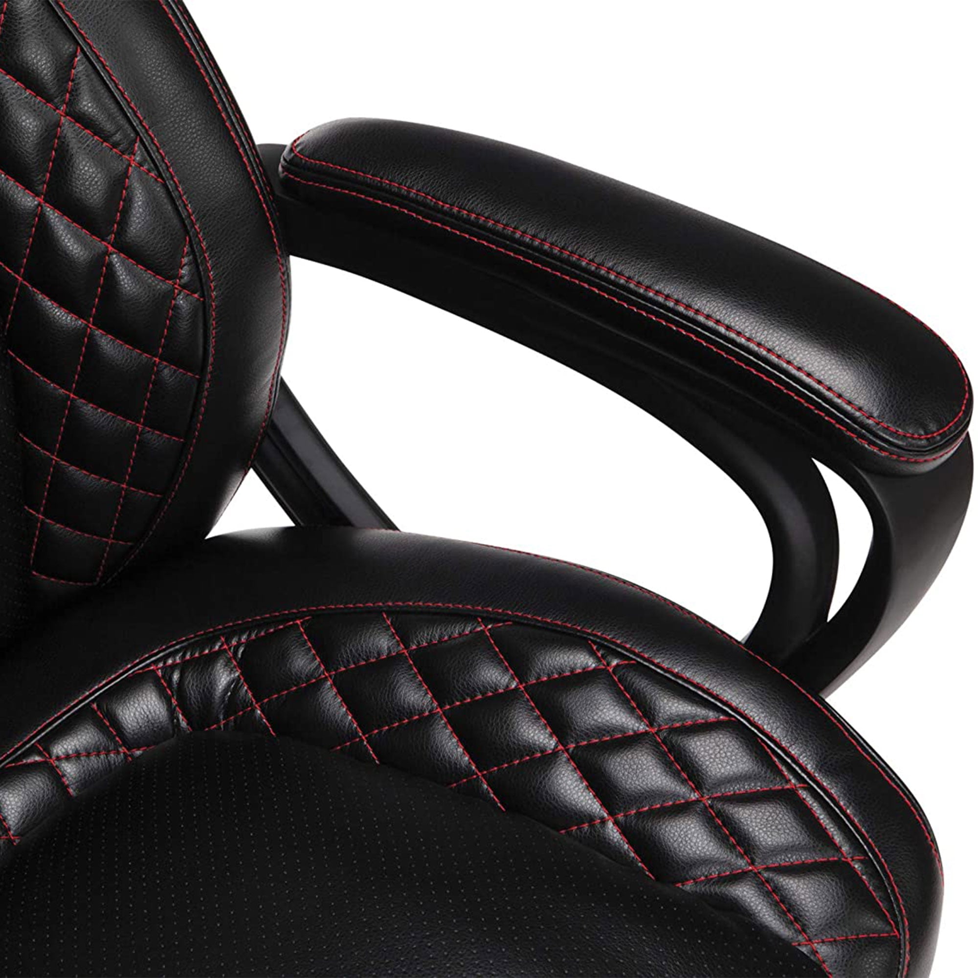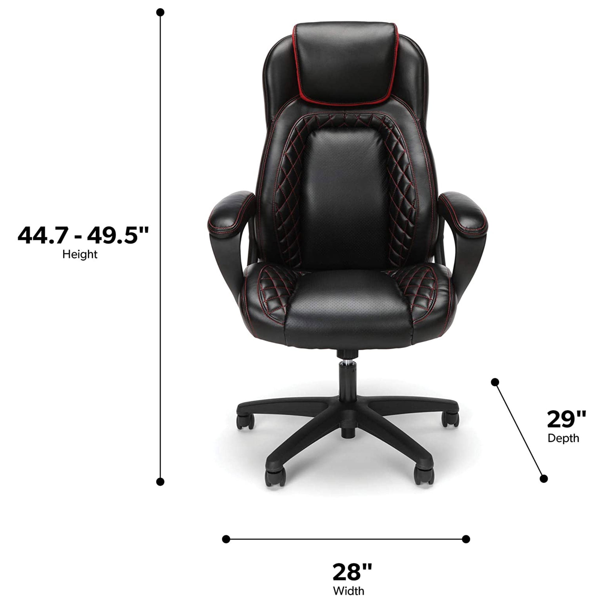 With premium make and materials, this chair provides superior luxury and comfort even during long intense work hours Features contoured, segmented ultra-plush padding that is covered in breathable bonded leather for a luxurious feel Integrated headrest and arms are padded for all-day comfort and support with a 5-star base that is molded from reinforced resin with a 360-degree swivel The center-tilt mechanism rotates the chair seat and reclines comfortably into your ideal position while the tilt tension controls the rate and ease of recline The premium red thread stitched diamond pattern provides a sophisticated detail that stands out against the black leather Material: Leather, plastic Color: Black, red Dimensions (L x W x H): 28.89 x 28 x 49.5 inches Weight: 41.89 pounds Manufacturer warranty: 2-year warranty