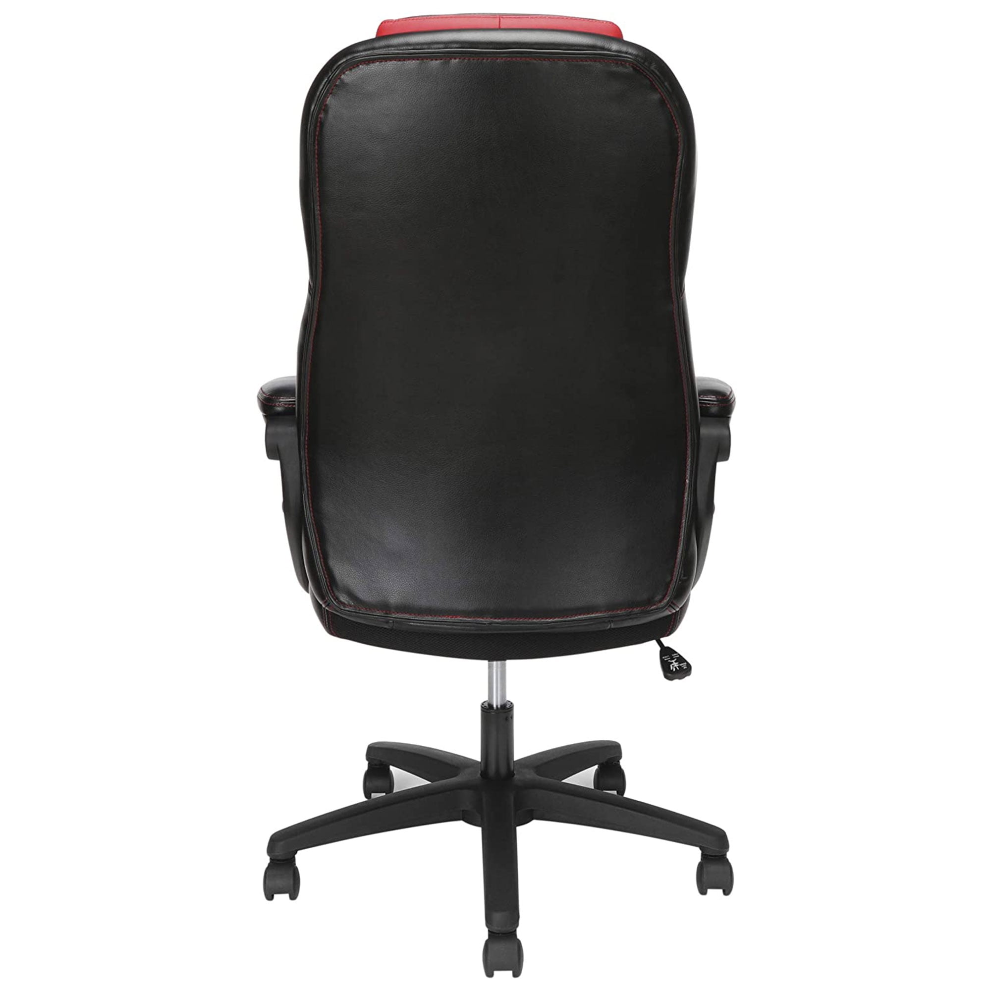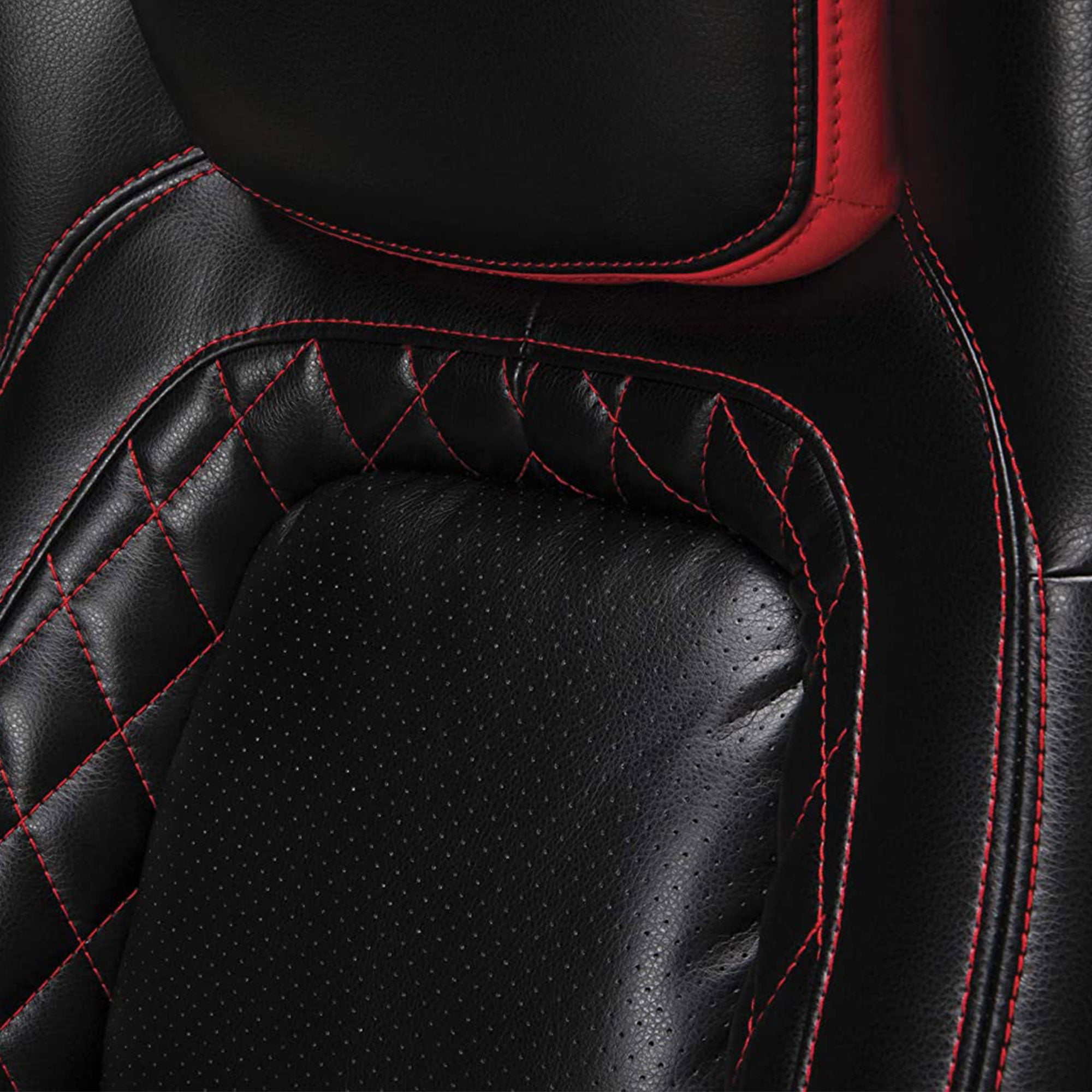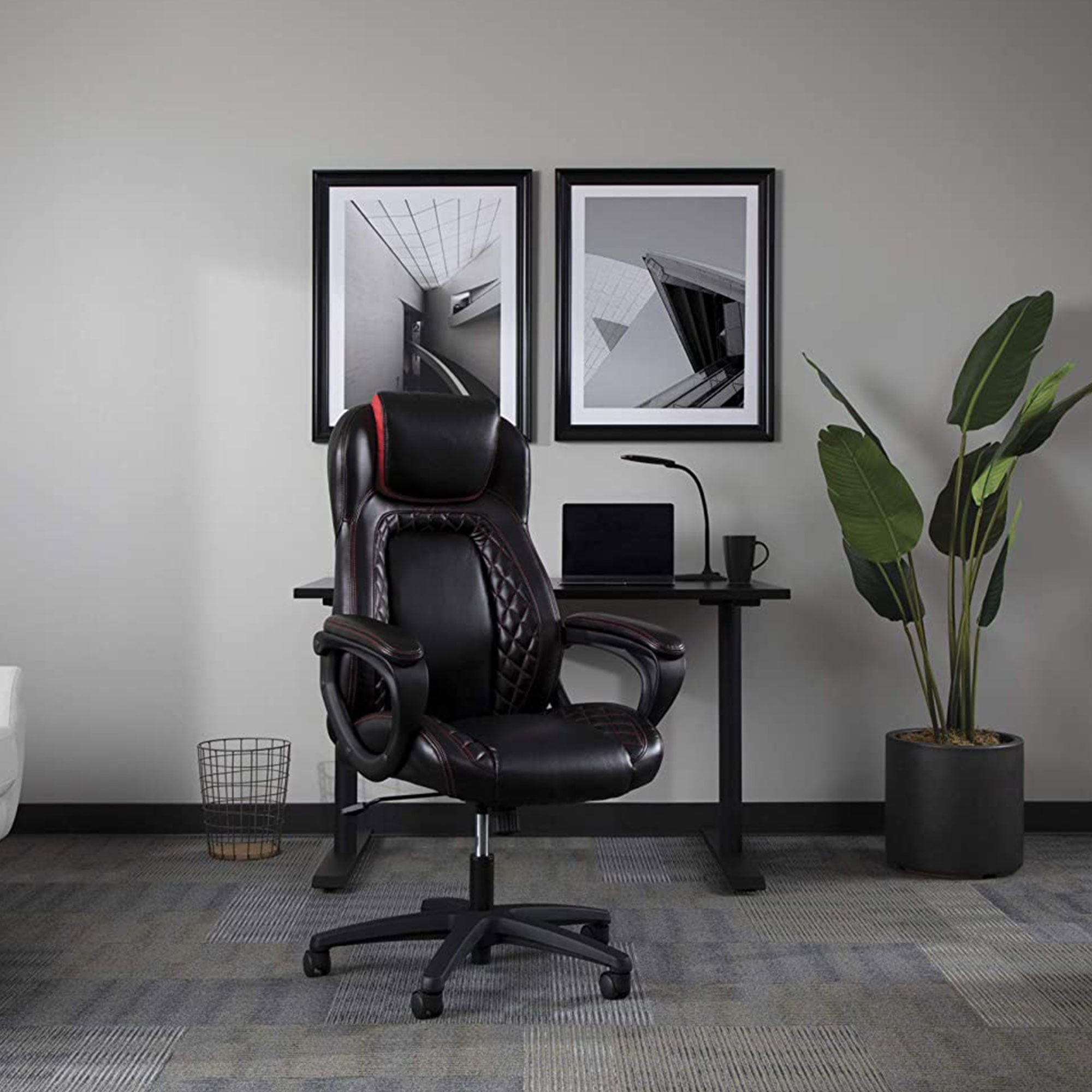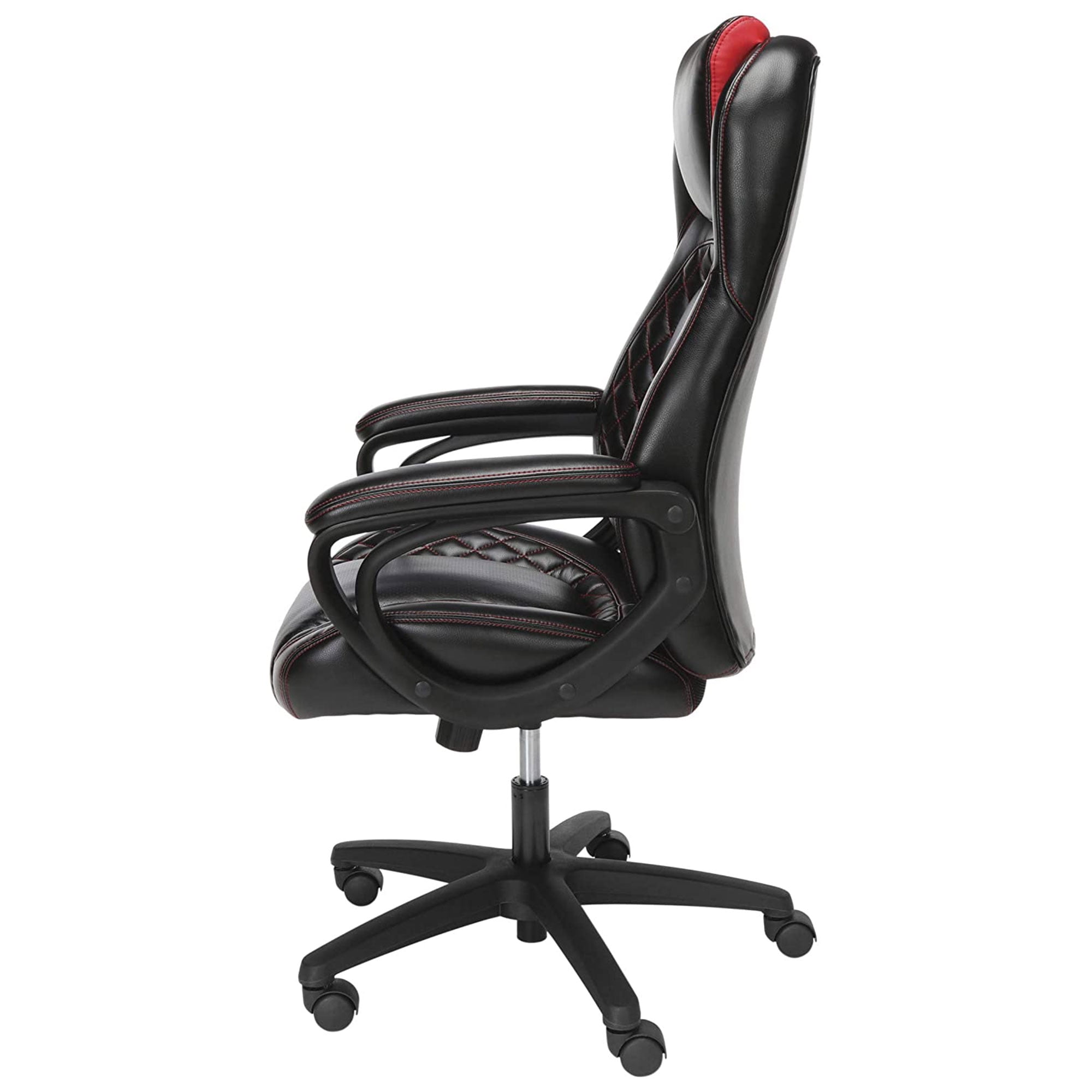 With premium make and materials, this chair provides superior luxury and comfort even during long intense work hours Features contoured, segmented ultra-plush padding that is covered in breathable bonded leather for a luxurious feel Integrated headrest and arms are padded for all-day comfort and support with a 5-star base that is molded from reinforced resin with a 360-degree swivel The center-tilt mechanism rotates the chair seat and reclines comfortably into your ideal position while the tilt tension controls the rate and ease of recline The premium red thread stitched diamond pattern provides a sophisticated detail that stands out against the black leather Material: Leather, plastic Color: Black, red Dimensions (L x W x H): 28.89 x 28 x 49.5 inches Weight: 41.89 pounds Manufacturer warranty: 2-year warranty