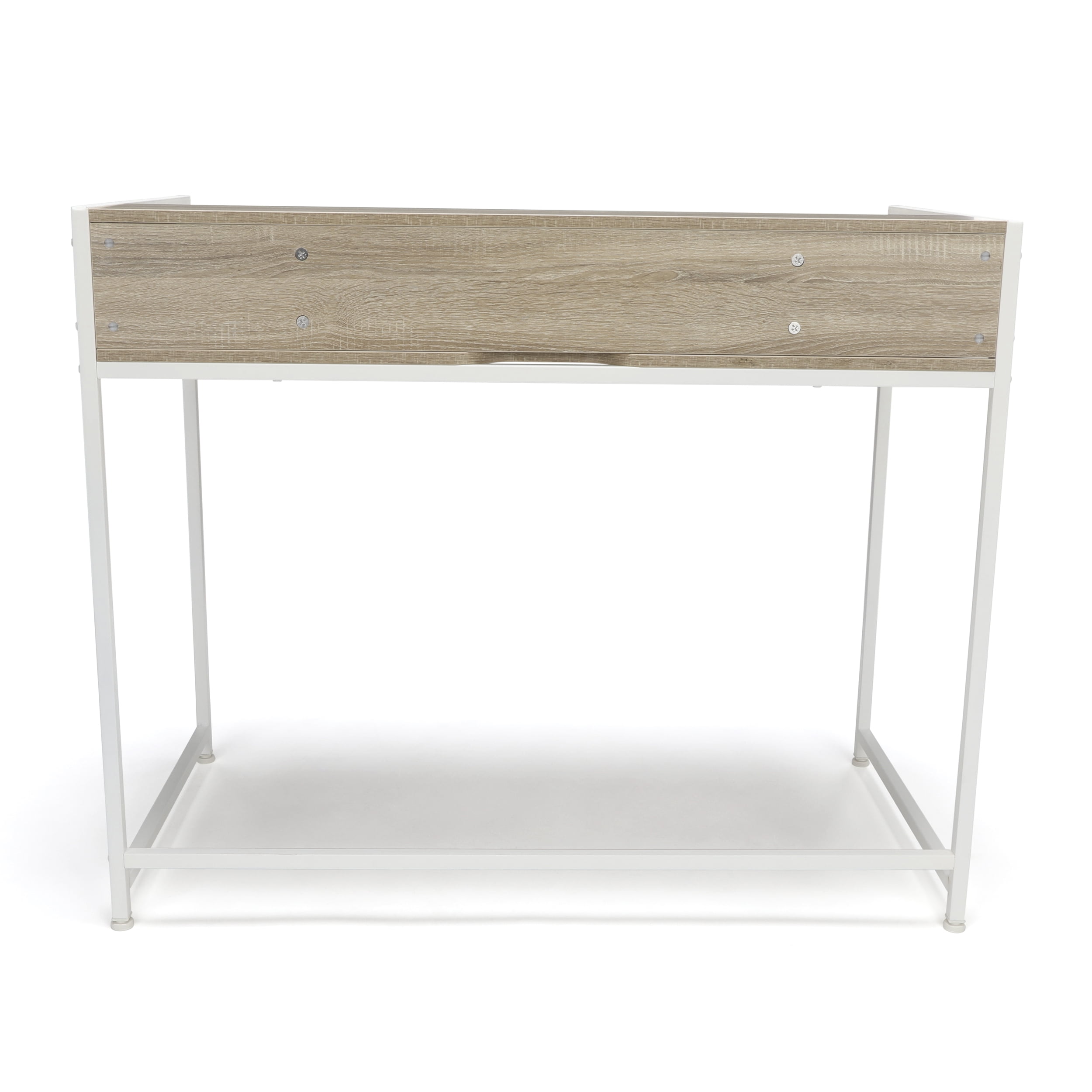 Dimensions: 43.5W x 23.6D x 35.8H in. Metal and wood construction Choose from available finishes Cutout for cord management 1 shelf for storage