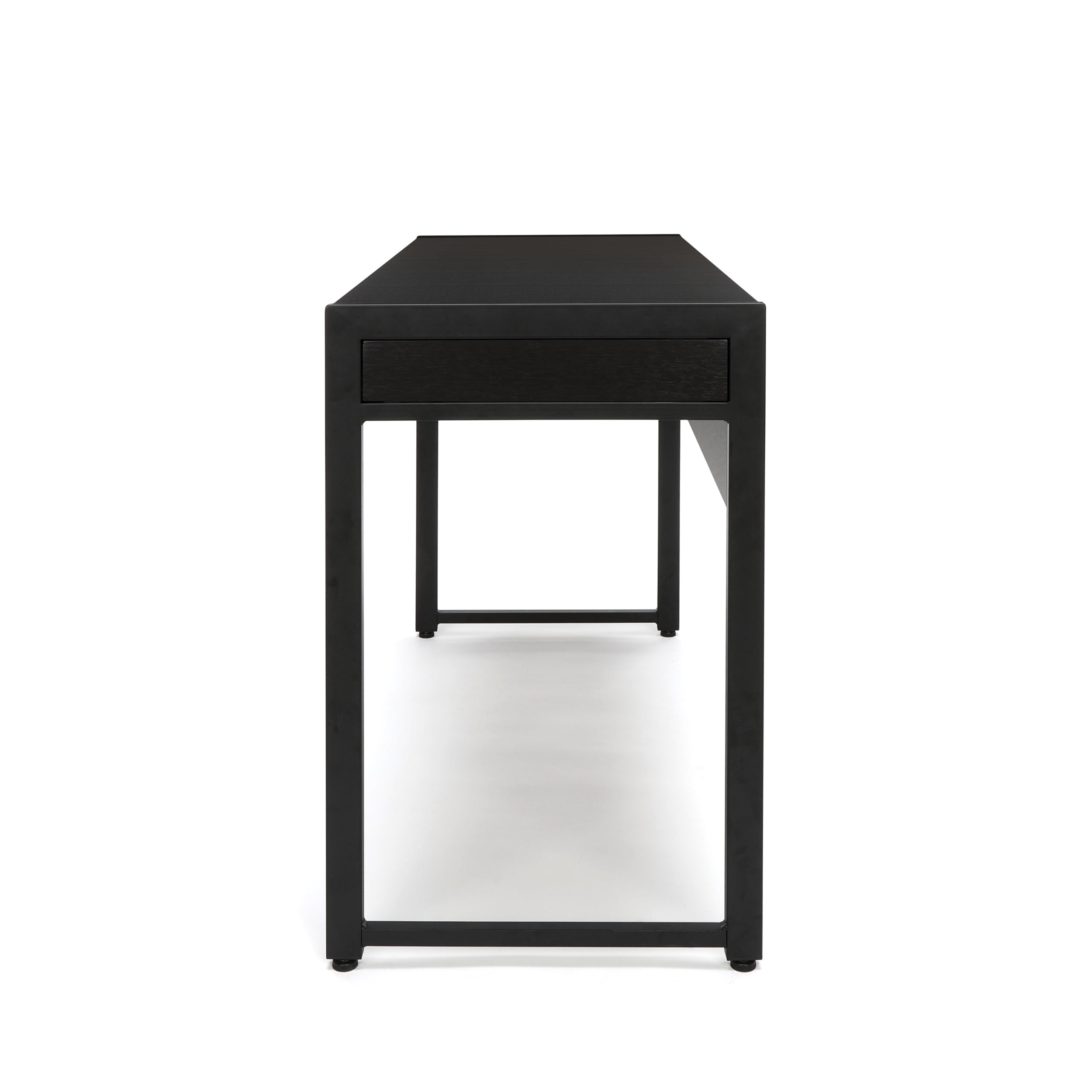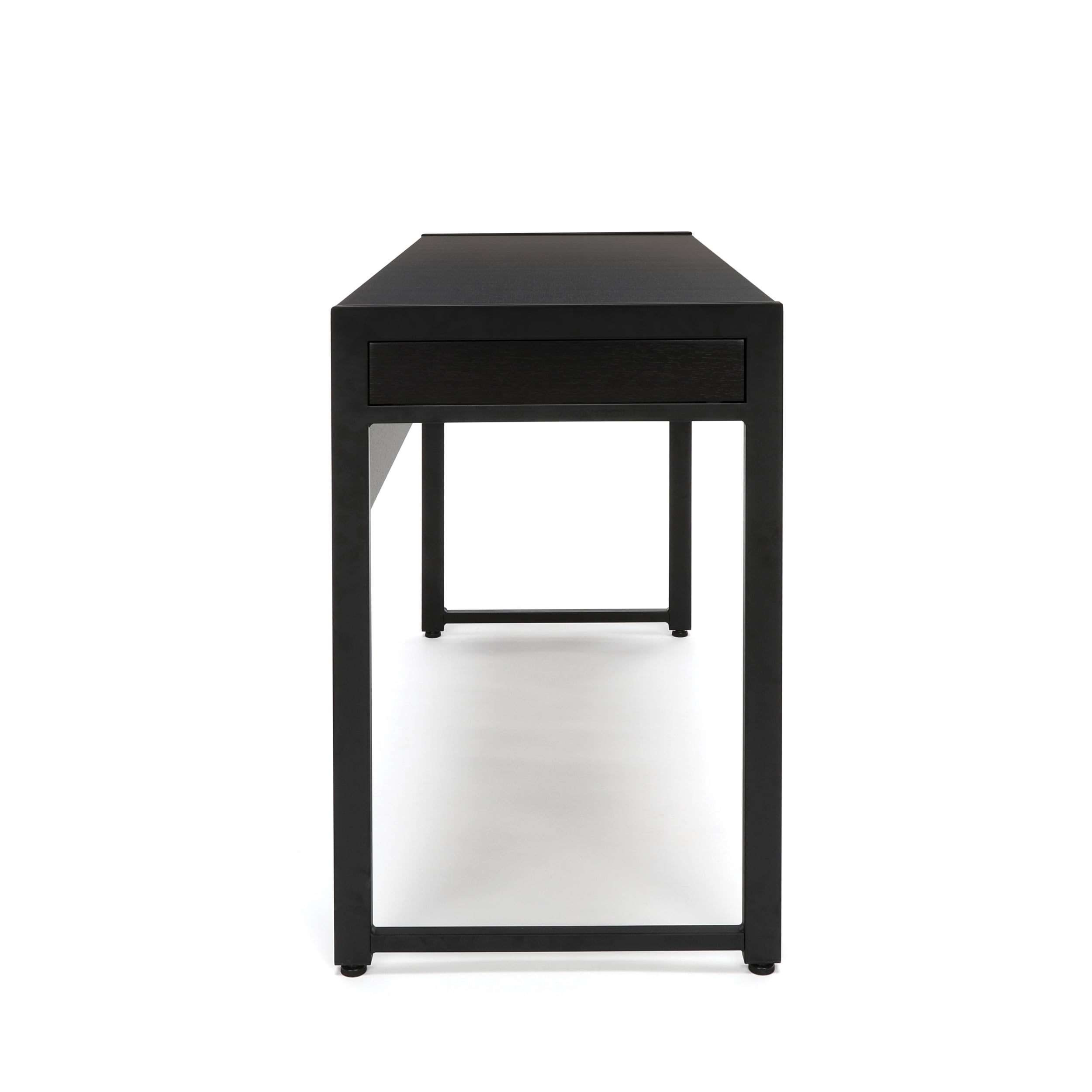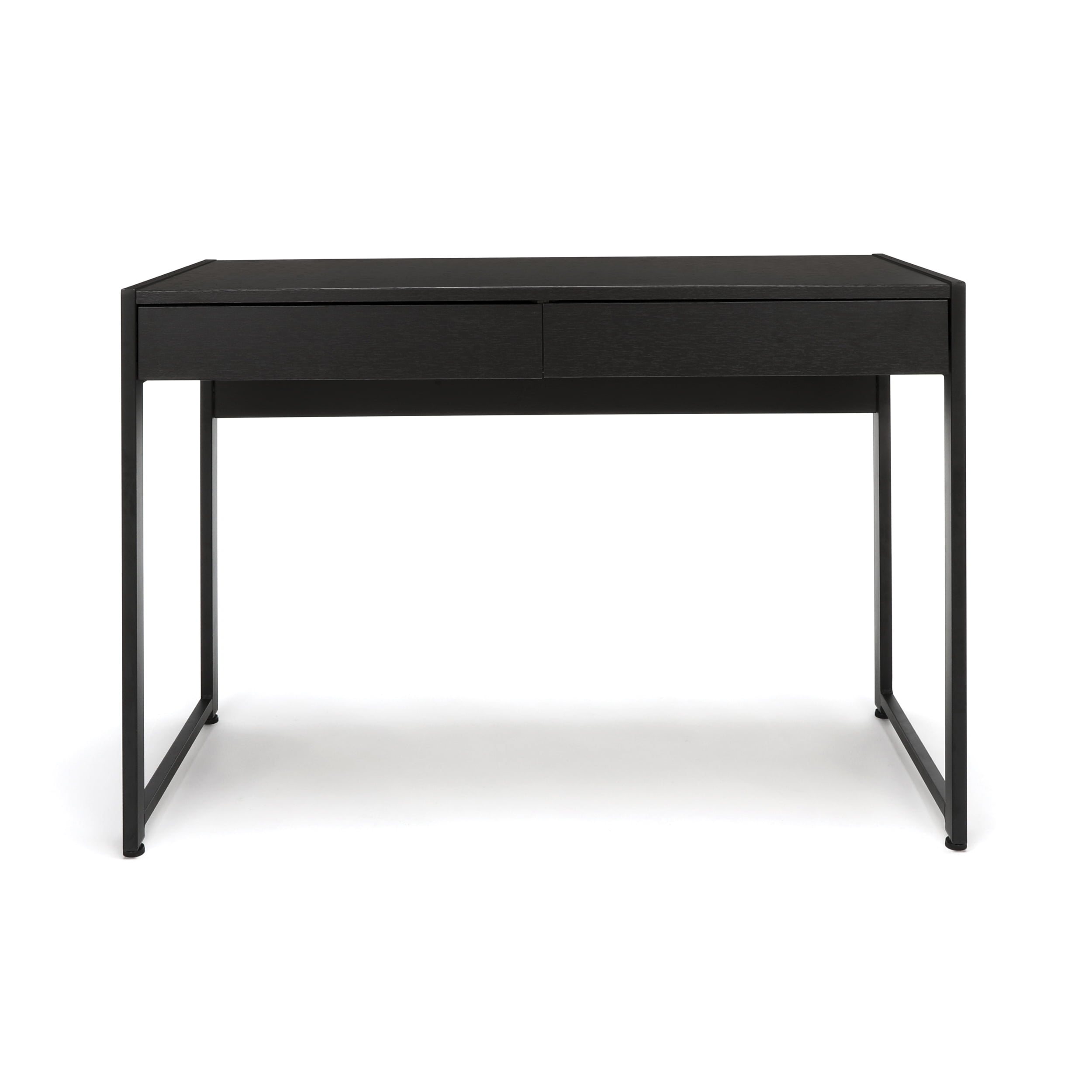 Modern, clean design blends well with any environment and maximizes under-desk space Sturdy powder-coated steel frame construction and leveling feet to ensure stability Features two drawers for office supplies and extra storage Desk surface features realistic wood grain look and texture Easy to assemble desk will have you up and working quickly