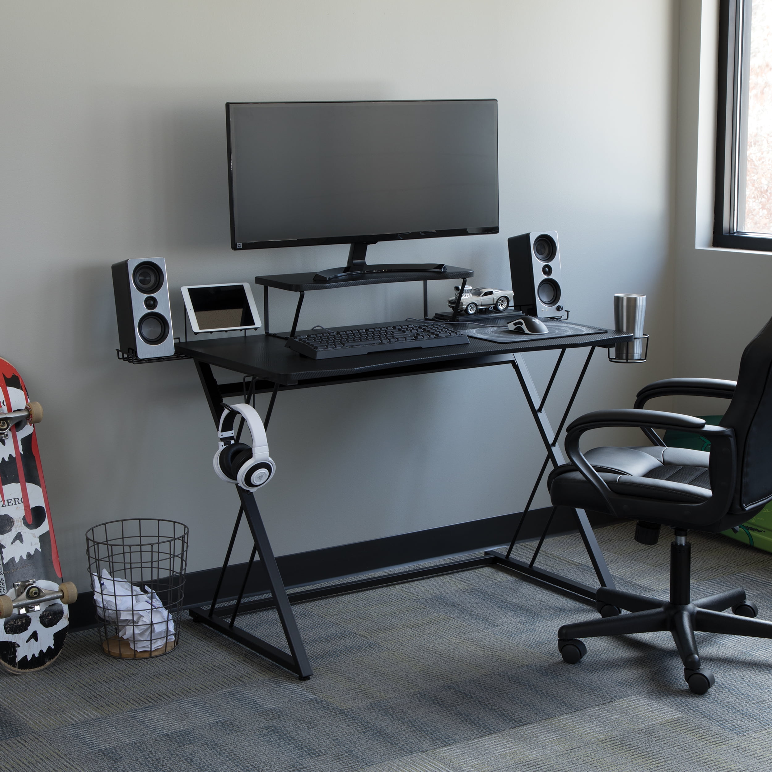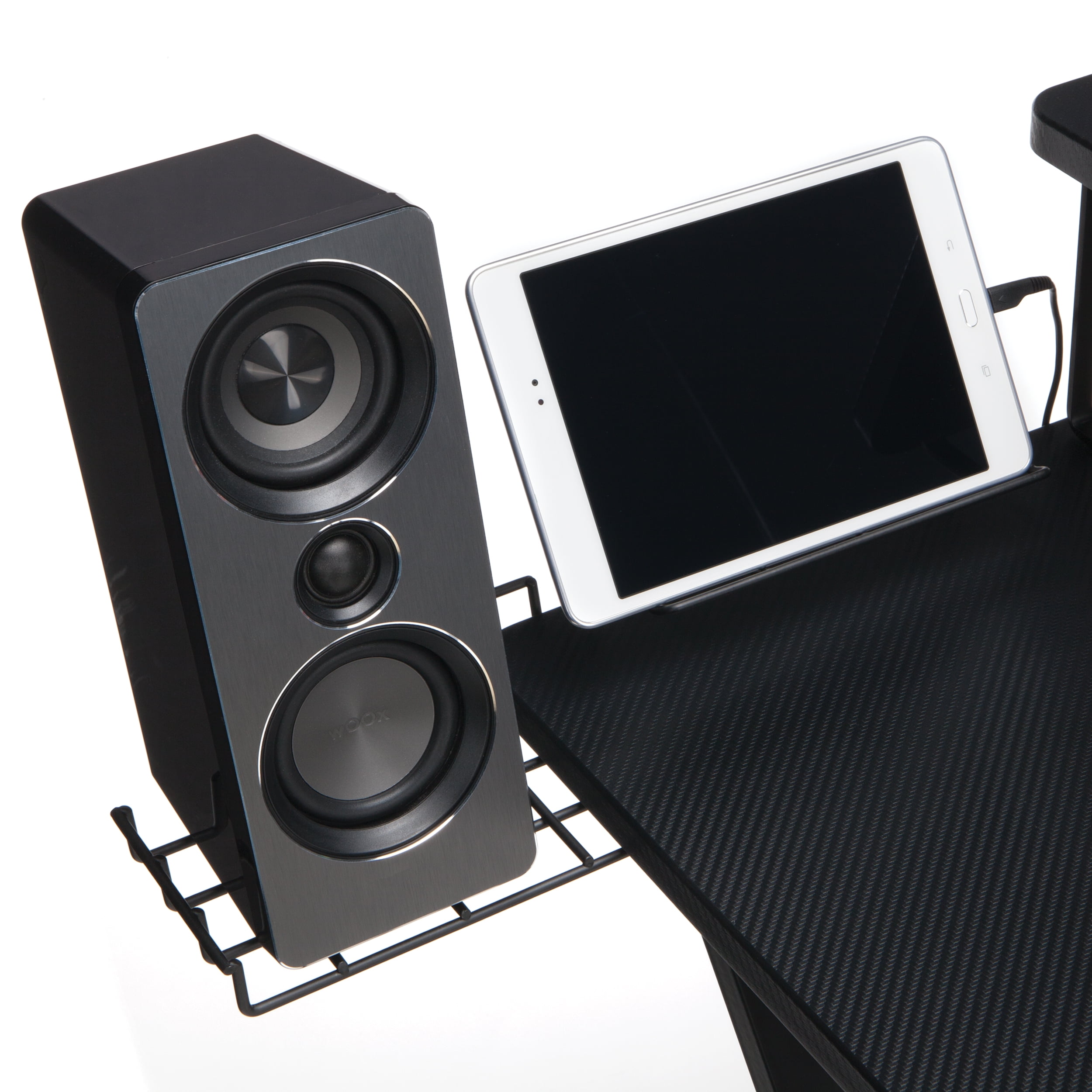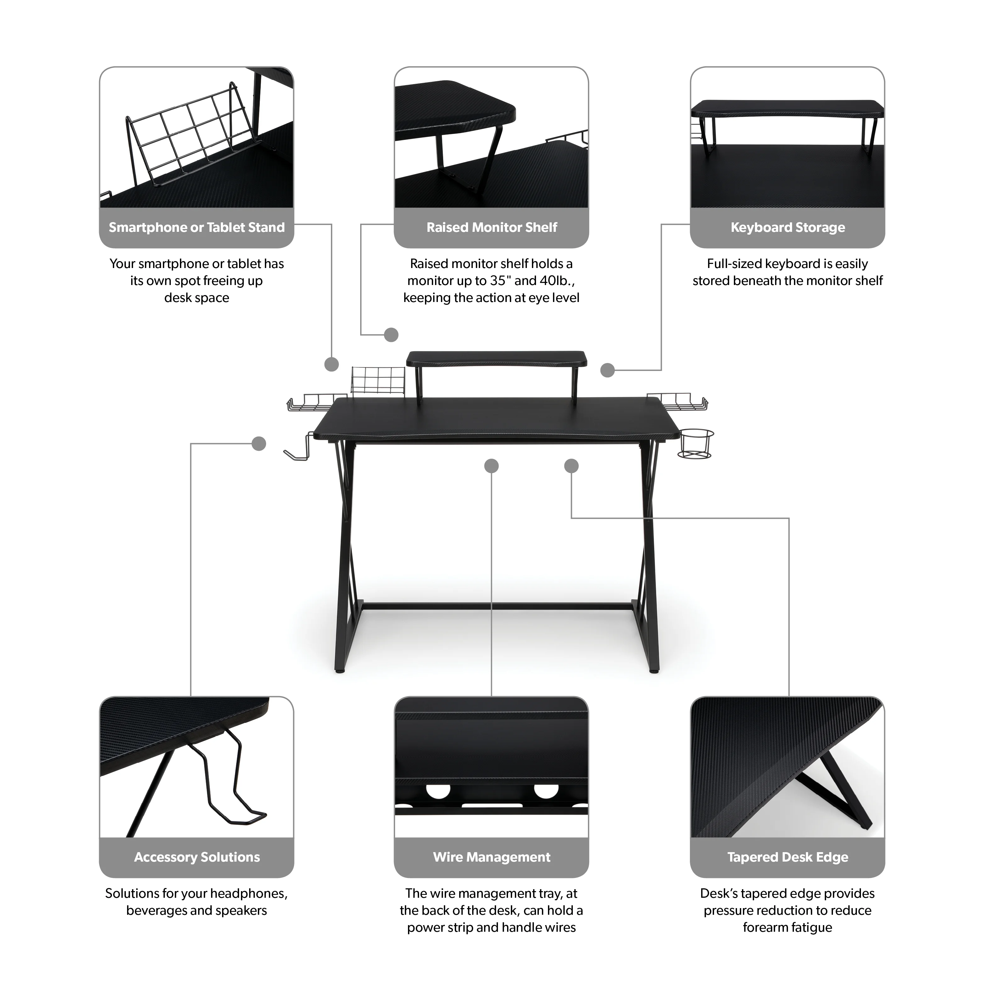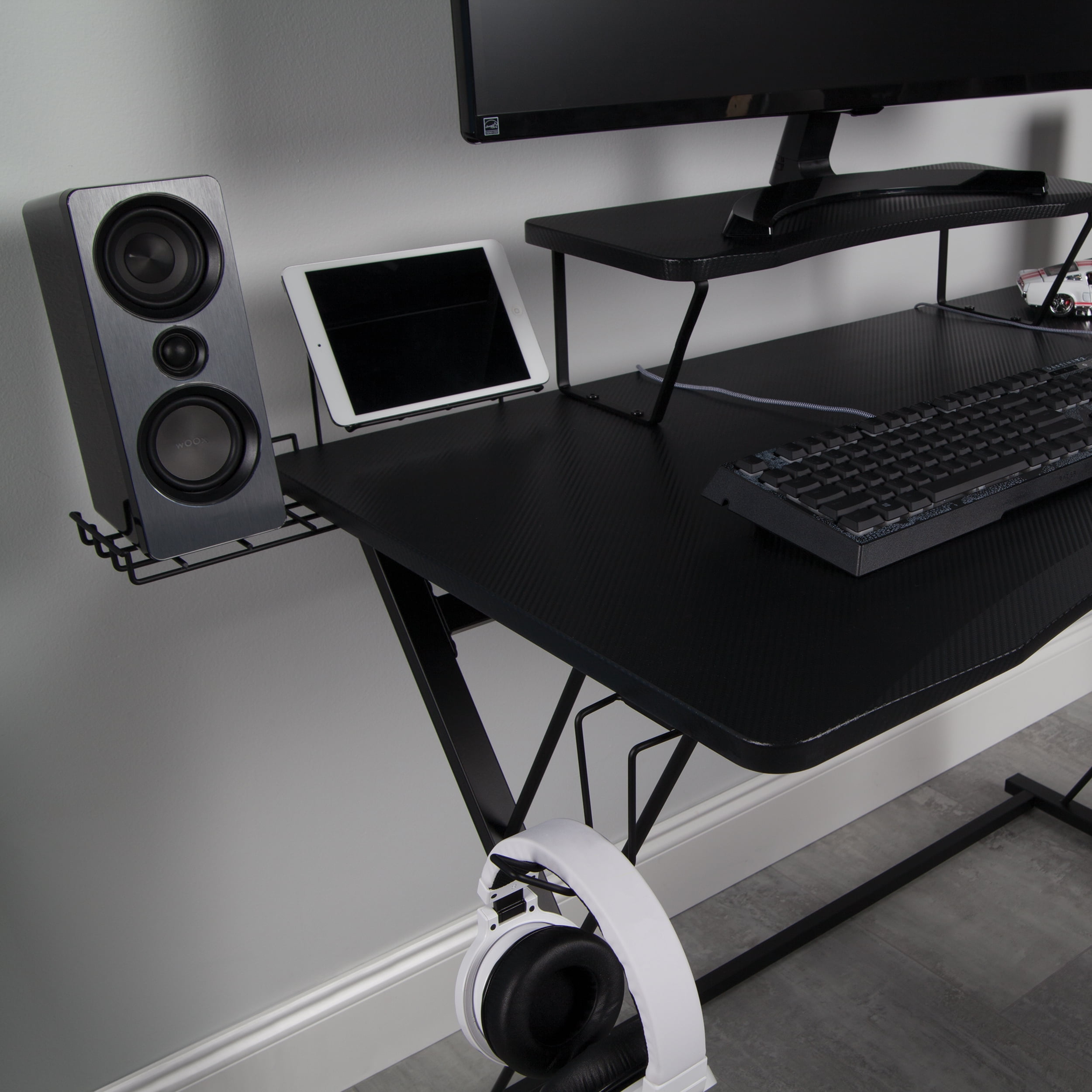 This gamer focused computer desk was built with a gamer’s needs in mind but is perfect for home or work applications The desk’s heavy duty carbon fiber thermoformed PVC wrap delivers style and durability over 42.5″ of workspace The raised monitor shelf can hold a monitor up to 35″ and 40 lb and with measurements of 22 3/4″ L x 8.5″ D x 6″ H it fits a standard sized keyboard beneath, providing a clutter-free desk surface Solutions for your headphones and beverages keep your important gaming accessories within arm’s reach and can be installed on either side of the desk Your smartphone or tablet has its own spot with the integrated stand, keeping desk space free and can be installed left or right of the monitor shelf Speaker stands measure 5″ 9/16″ x 4 5/8″ to provide ample room for your sound solutions The gaming desk features an ergonomic tapered edge providing a sleek design and pressure reduction for your forearms This gaming desk delivers a lot of leg room with 37.5″ L x 24″ D of open space to stretch out Pre-drilled holes tapped with metal inserts make assembly quick and easy, there are also extra holes to allow for freedom of accessory placement Computer desk features a wire management tray, at the back of the desk, that can hold a power strip and handle wires The gaming computer desk is 54.5″ L x 23.625″ D and 35.625″ H, including accessory solutions, and desk surface, without accessory solutions, measures 42.5″ L x 23.625″ D x 29.375″ H Gaming desk has height adjustable glides to adjust legs for unlevel floor surfaces Easily pair your gaming desk with matching Essentials Collection gaming chairs This desk holds up to 200 lb and is backed by the OFM Essentials 5-Year Limited Warranty
