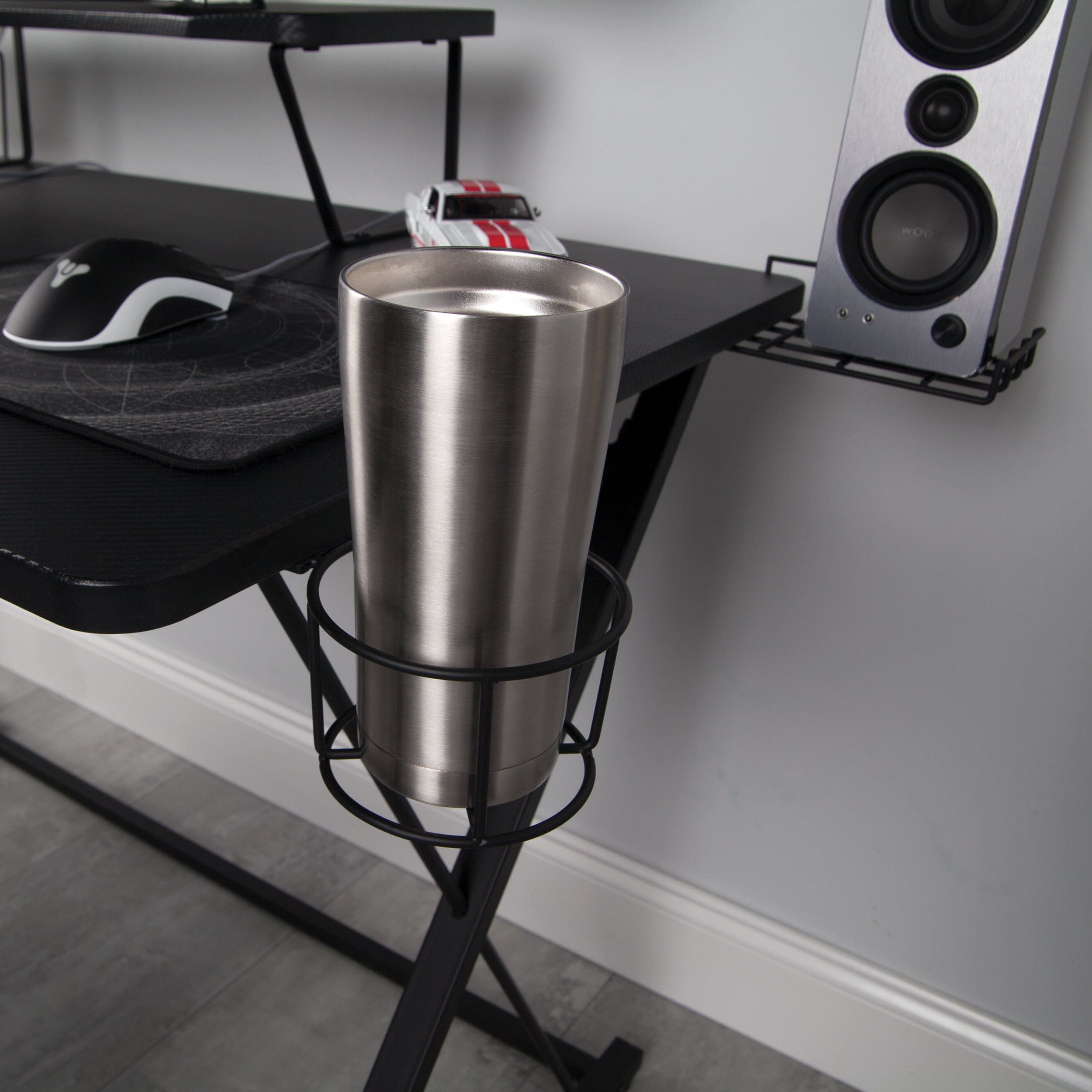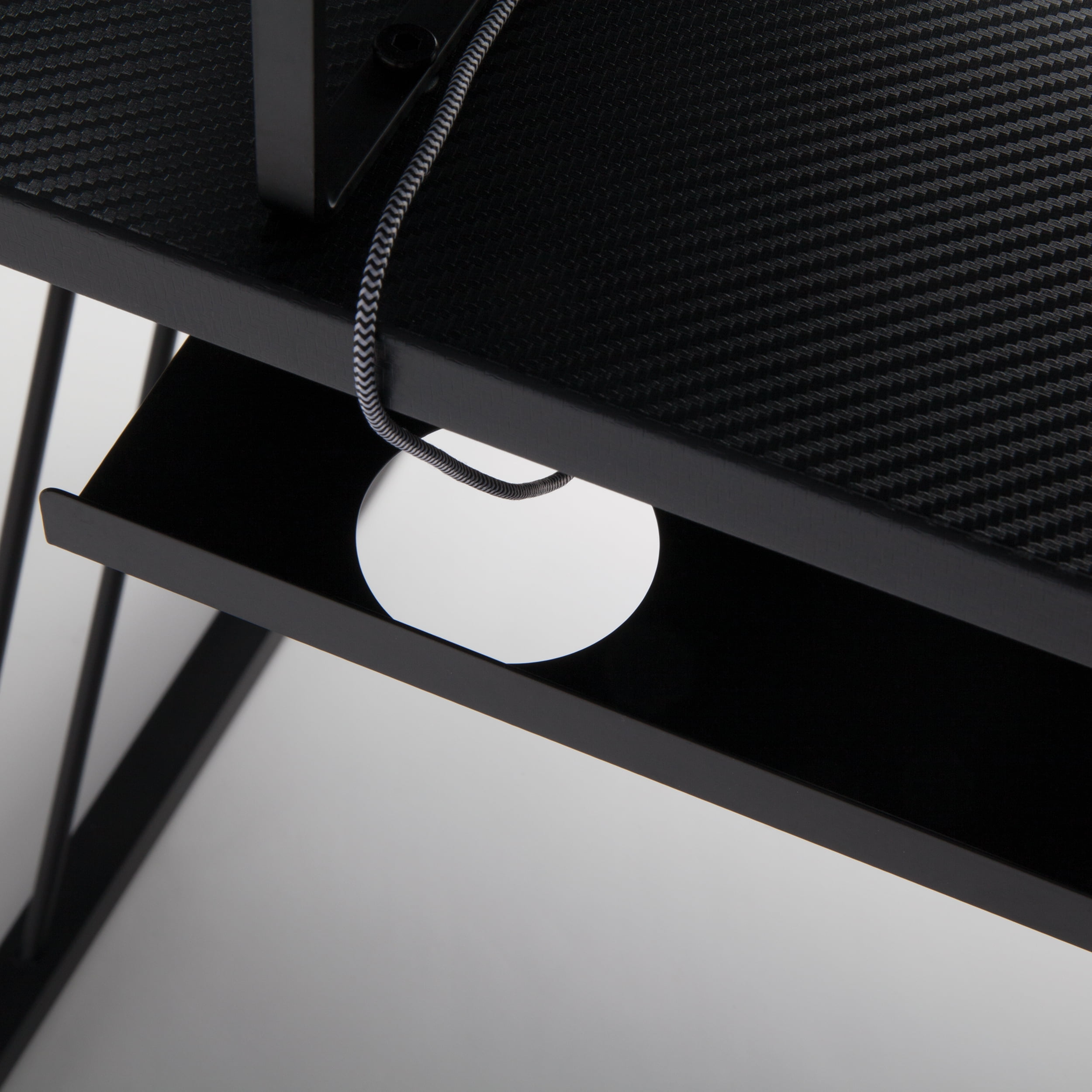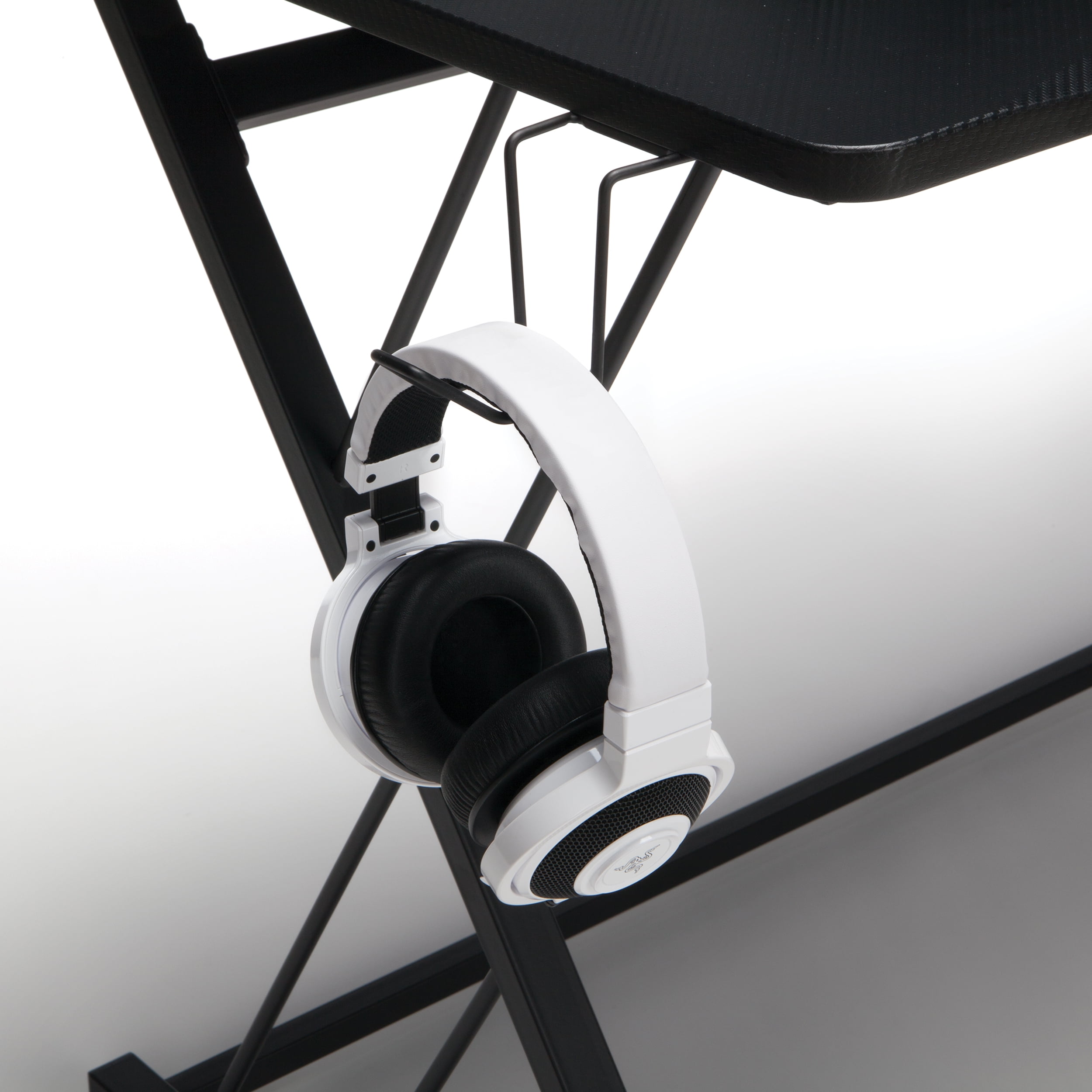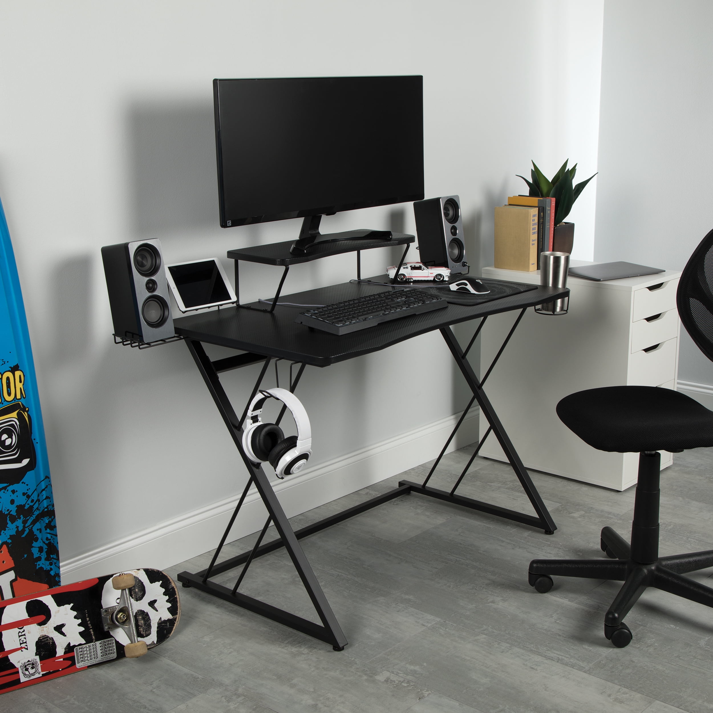 This gamer focused computer desk was built with a gamer’s needs in mind but is perfect for home or work applications The desk’s heavy duty carbon fiber thermoformed PVC wrap delivers style and durability over 42.5″ of workspace The raised monitor shelf can hold a monitor up to 35″ and 40 lb and with measurements of 22 3/4″ L x 8.5″ D x 6″ H it fits a standard sized keyboard beneath, providing a clutter-free desk surface Solutions for your headphones and beverages keep your important gaming accessories within arm’s reach and can be installed on either side of the desk Your smartphone or tablet has its own spot with the integrated stand, keeping desk space free and can be installed left or right of the monitor shelf Speaker stands measure 5″ 9/16″ x 4 5/8″ to provide ample room for your sound solutions The gaming desk features an ergonomic tapered edge providing a sleek design and pressure reduction for your forearms This gaming desk delivers a lot of leg room with 37.5″ L x 24″ D of open space to stretch out Pre-drilled holes tapped with metal inserts make assembly quick and easy, there are also extra holes to allow for freedom of accessory placement Computer desk features a wire management tray, at the back of the desk, that can hold a power strip and handle wires The gaming computer desk is 54.5″ L x 23.625″ D and 35.625″ H, including accessory solutions, and desk surface, without accessory solutions, measures 42.5″ L x 23.625″ D x 29.375″ H Gaming desk has height adjustable glides to adjust legs for unlevel floor surfaces Easily pair your gaming desk with matching Essentials Collection gaming chairs This desk holds up to 200 lb and is backed by the OFM Essentials 5-Year Limited Warranty