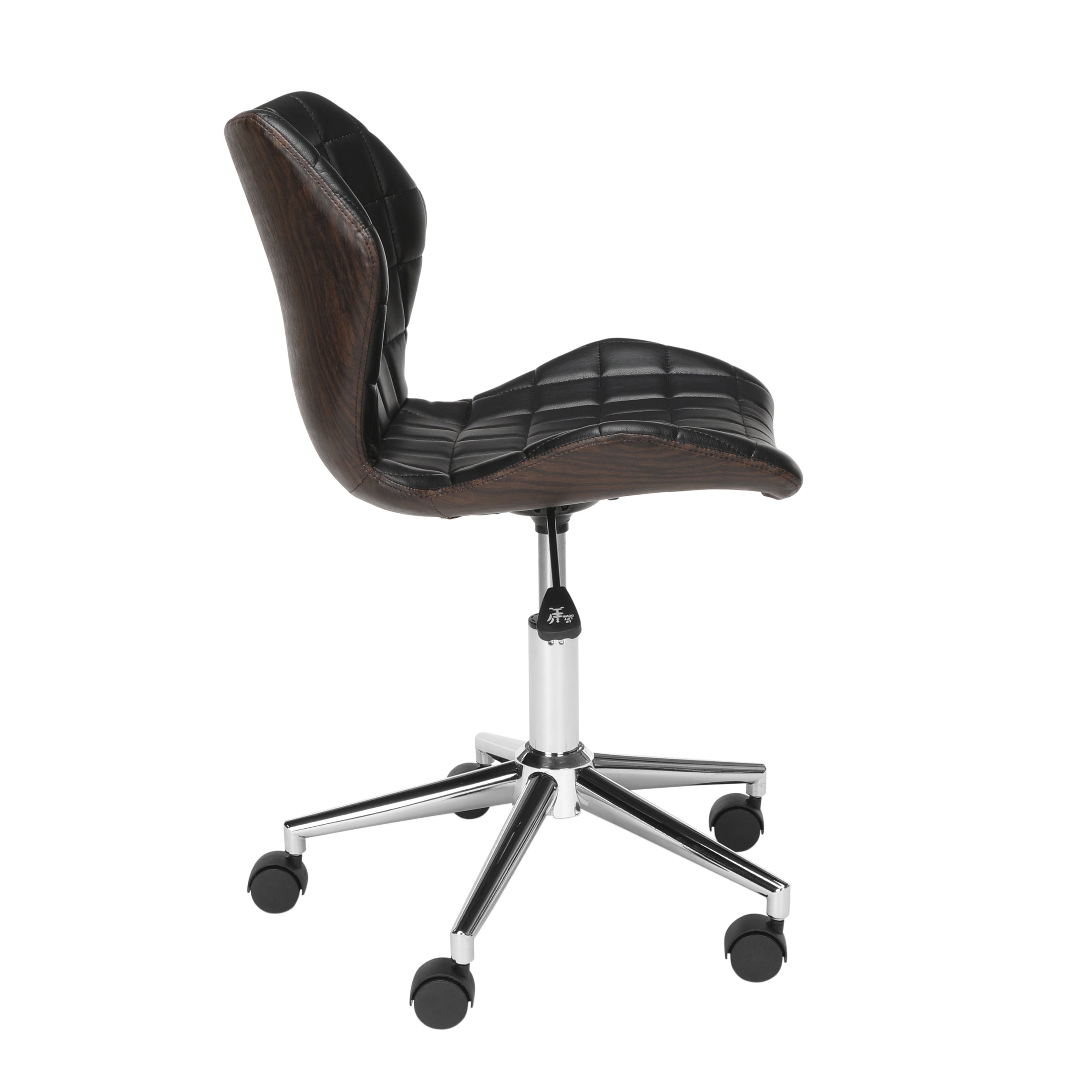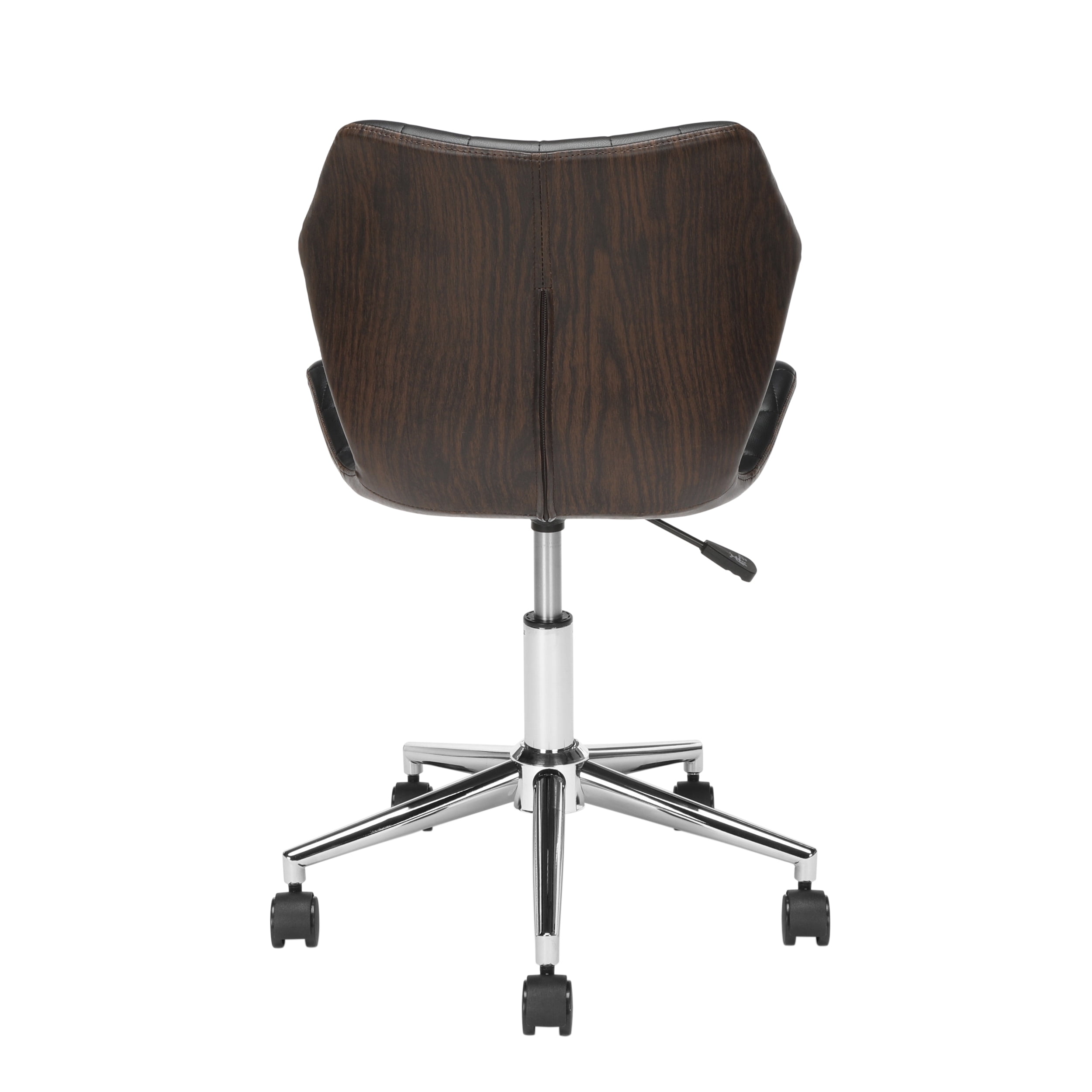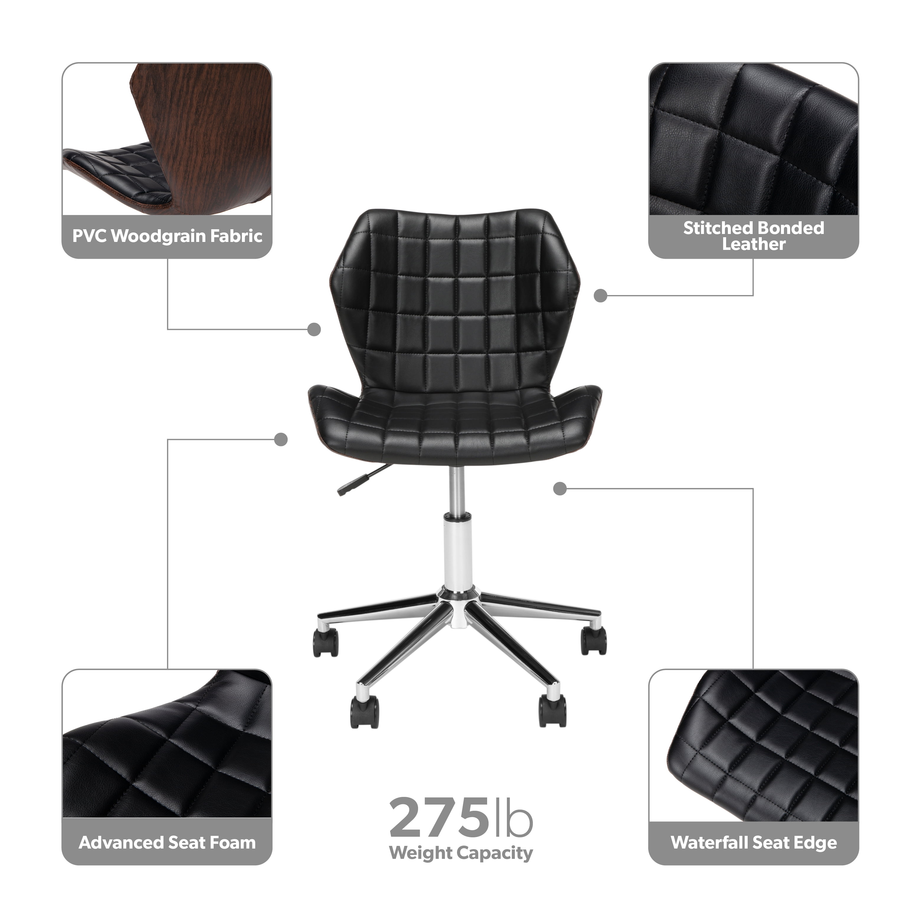 The seatback features a PVC woodgrain fabric that mimics the look of wood at a fraction of the cost The seat front features stitched bonded leather in a grid pattern that adds to its unique designer look Advanced seat foam provides a comfortable sit The stylized single-piece seat frame provides a modern look with a seat and back shape that cradle you Assembly is quick and easy, simply affix casters to the 5-star base and affix the single-piece seat frame to the base The waterfall seat edge takes pressure off of the back of your thighs, providing a more comfortable seating experience The office chair features a five-star base with 360-degree swivel that provides freedom of movement Pneumatic seat height adjustment controls the seat’s height from 17.9″ to 21.9 to adapt to user height or task needs This task chair measures 24.8″ D x 22″ W x 29.1″ – 33.1″ and holds users up to 275 lb This office chair is backed by the OFM Essentials 5-Year Limited Warranty