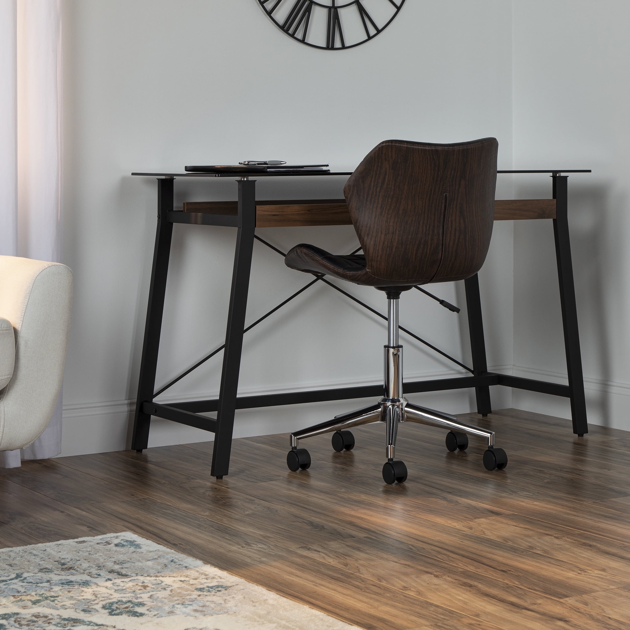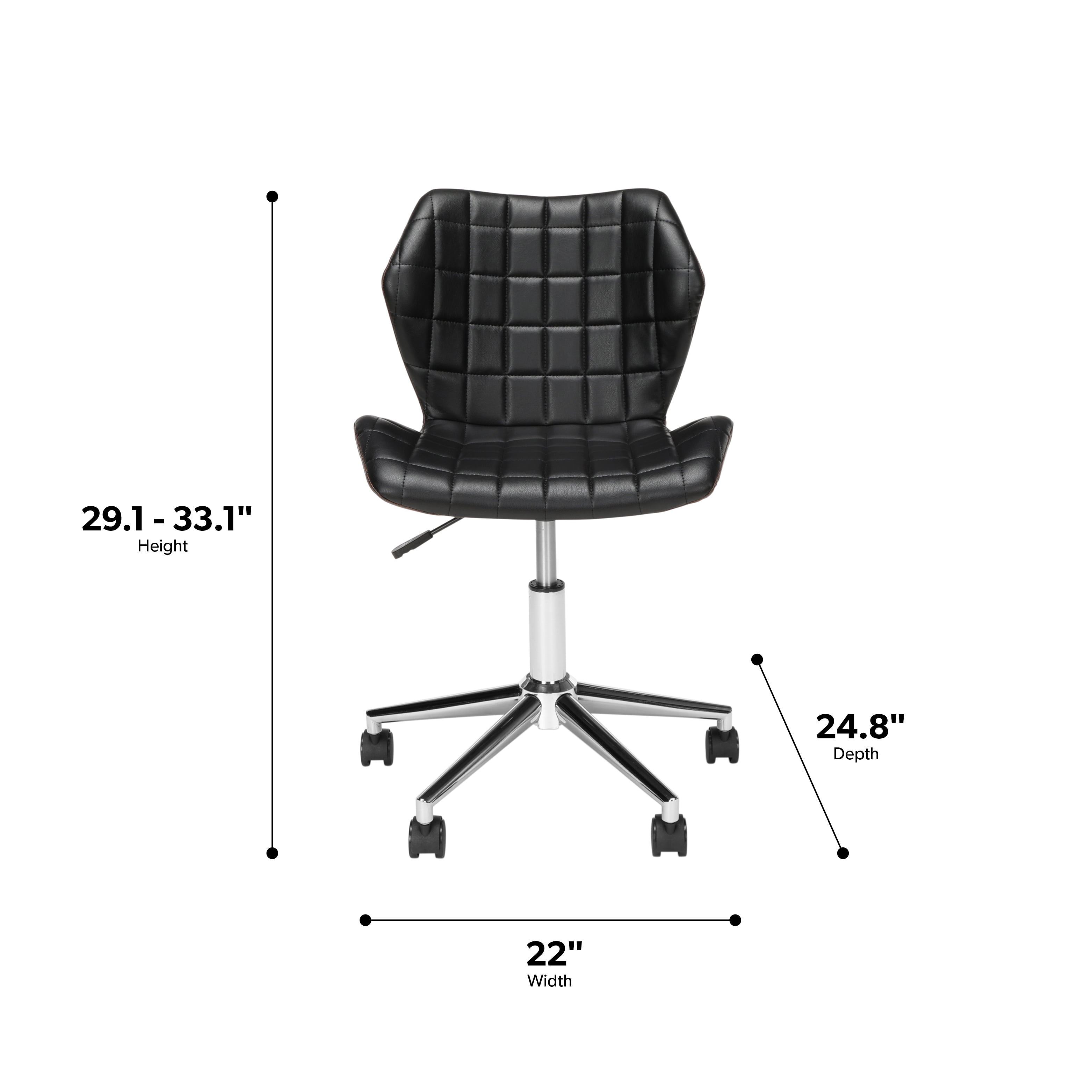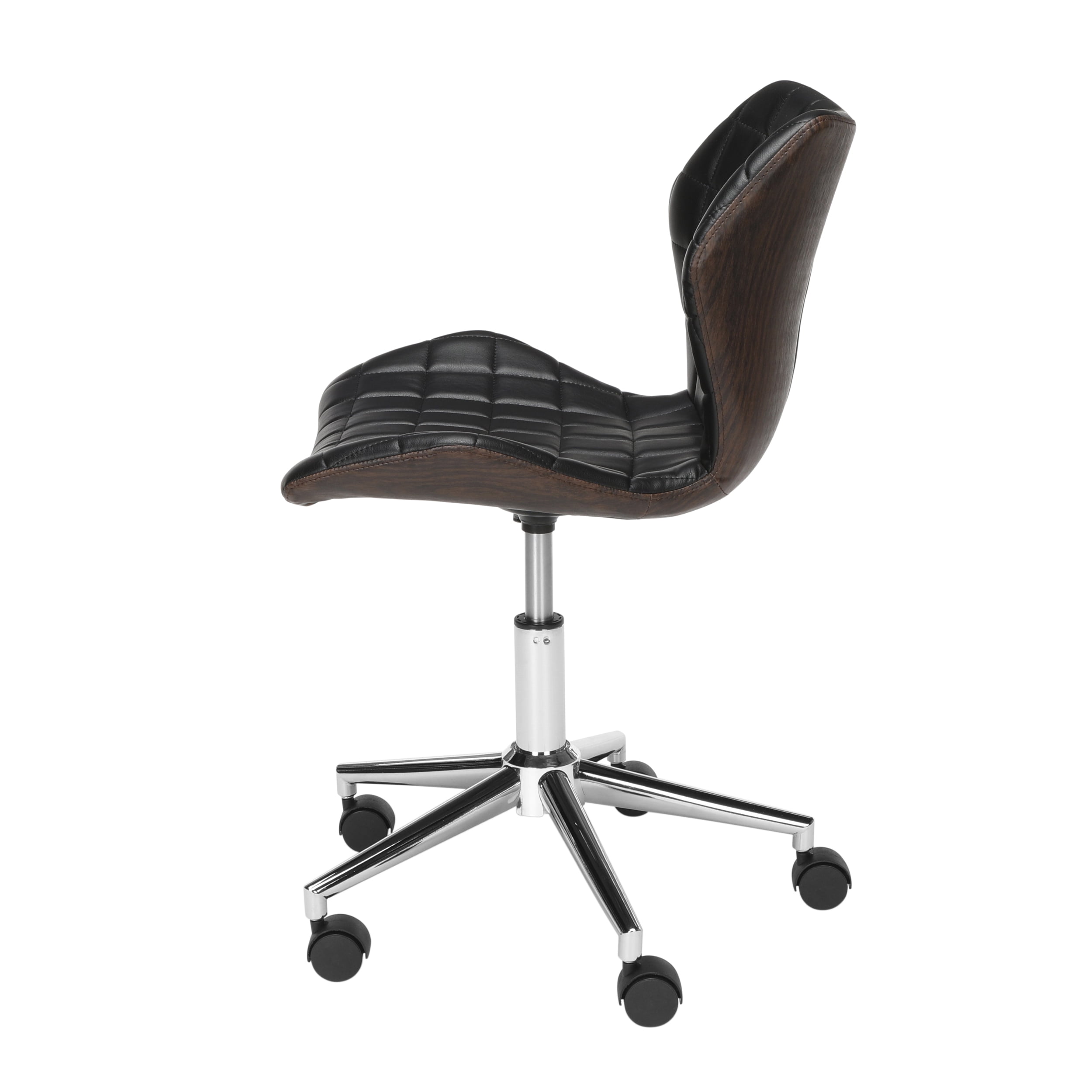 The seatback features a PVC woodgrain fabric that mimics the look of wood at a fraction of the cost The seat front features stitched bonded leather in a grid pattern that adds to its unique designer look Advanced seat foam provides a comfortable sit The stylized single-piece seat frame provides a modern look with a seat and back shape that cradle you Assembly is quick and easy, simply affix casters to the 5-star base and affix the single-piece seat frame to the base The waterfall seat edge takes pressure off of the back of your thighs, providing a more comfortable seating experience The office chair features a five-star base with 360-degree swivel that provides freedom of movement Pneumatic seat height adjustment controls the seat’s height from 17.9″ to 21.9 to adapt to user height or task needs This task chair measures 24.8″ D x 22″ W x 29.1″ – 33.1″ and holds users up to 275 lb This office chair is backed by the OFM Essentials 5-Year Limited Warranty
