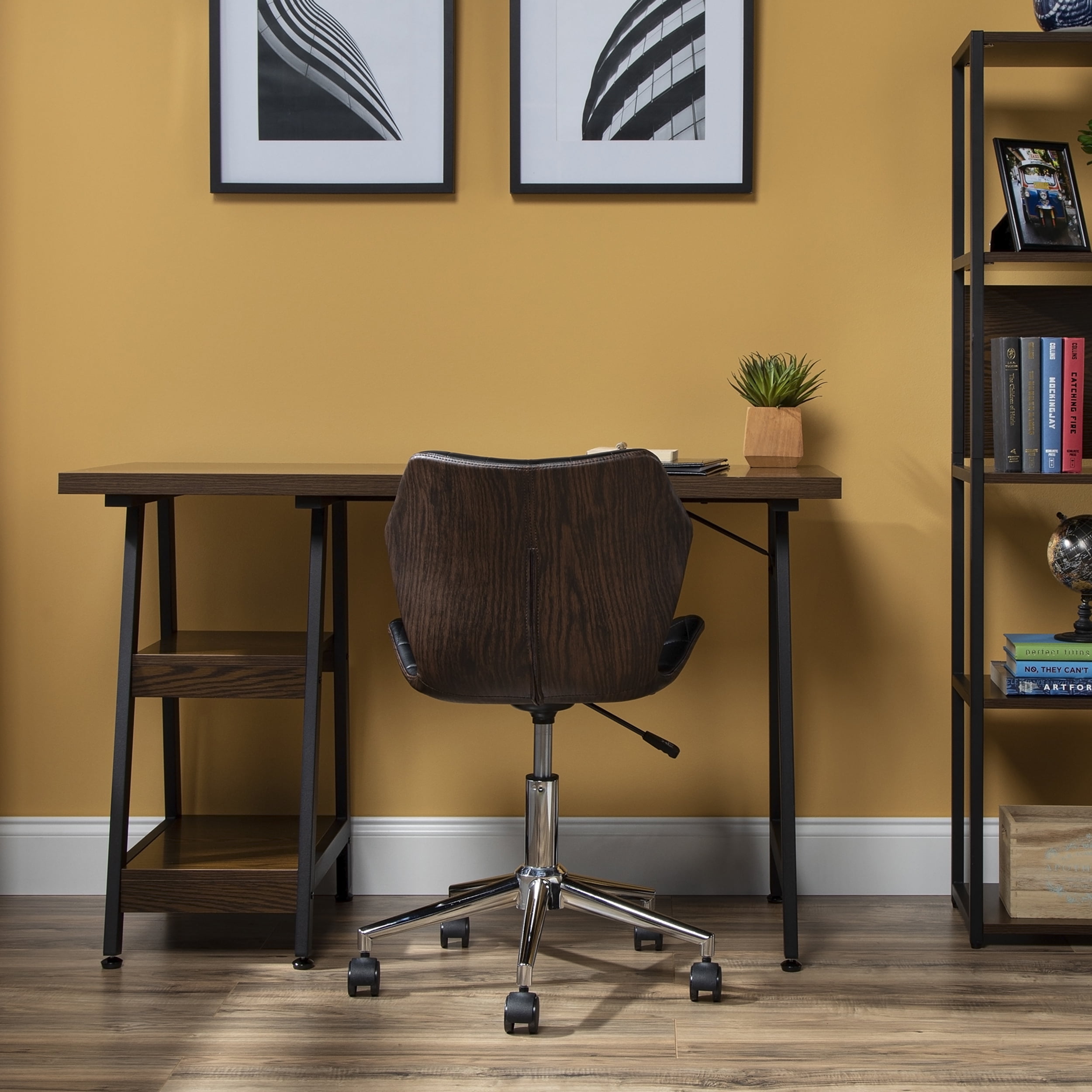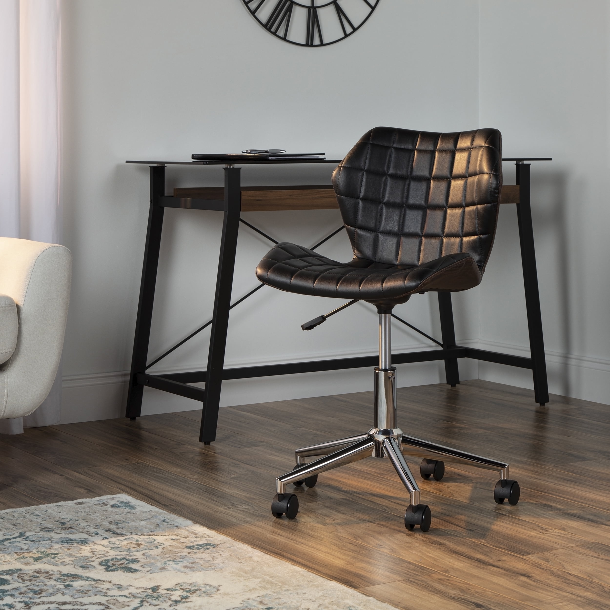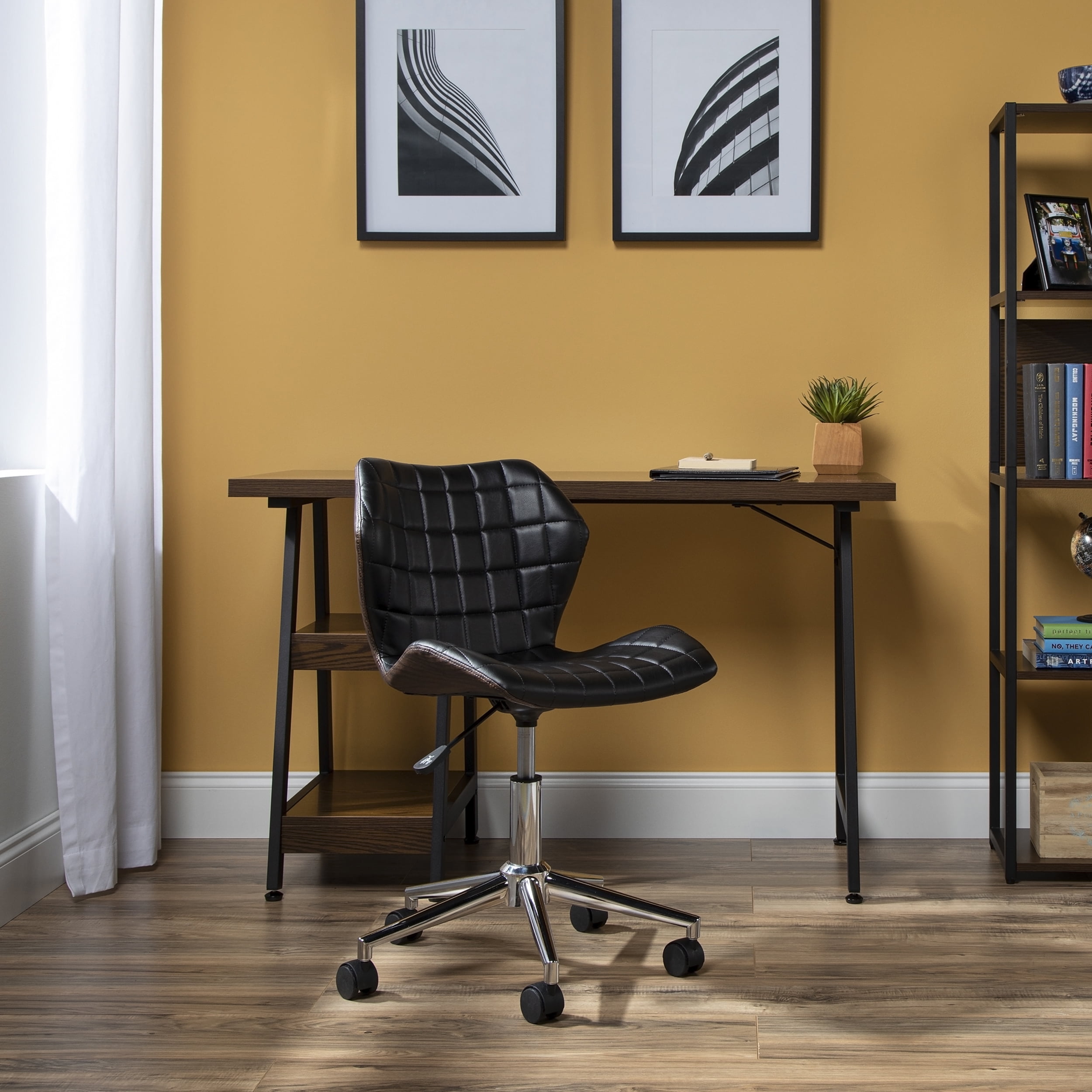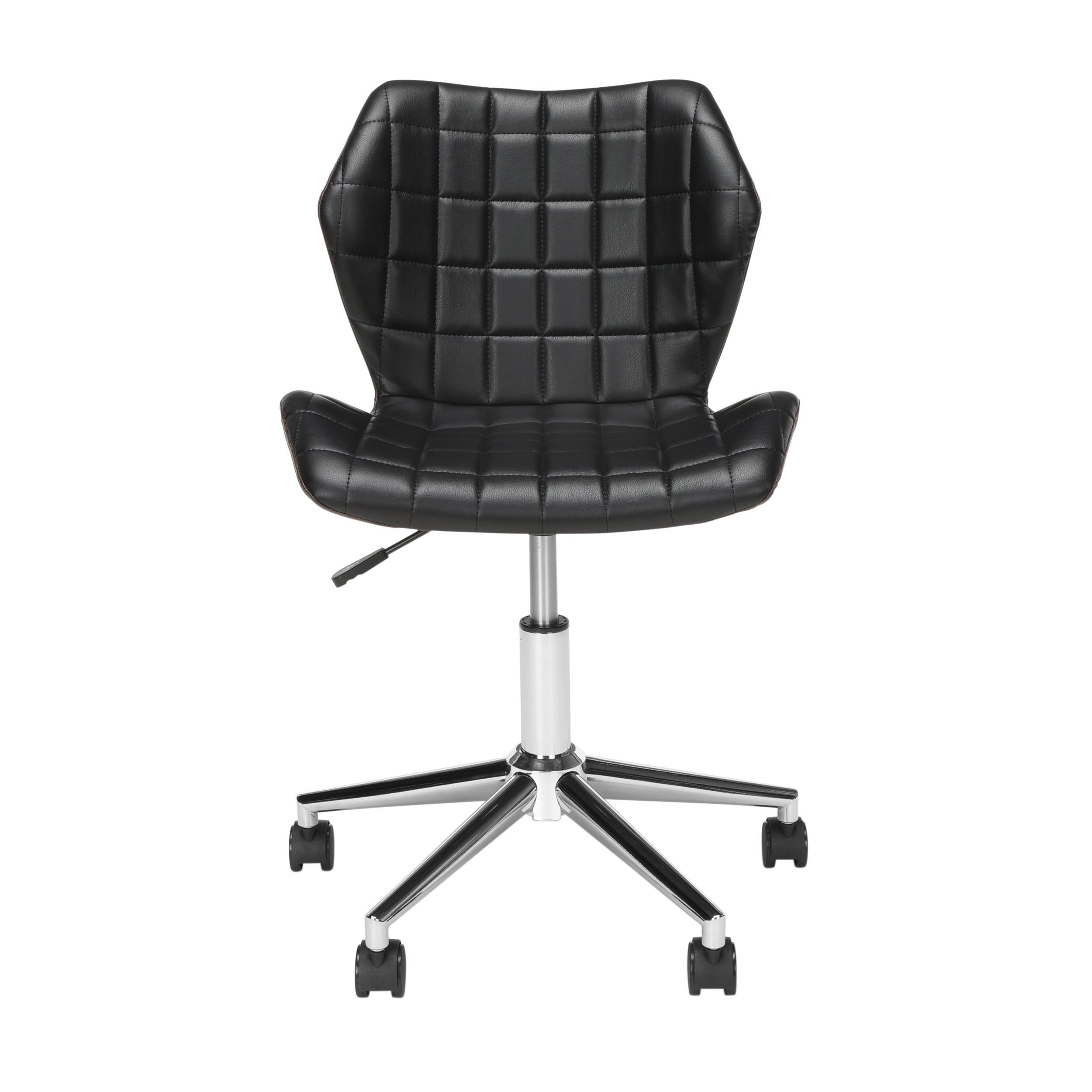 Featuring a unique designer look with a seat front featuring stitched bonded leather in a geometric grid pattern combined with a PVC woodgrain fabric seatback that mimics the look of wood, the OFM Essentials Collection Bonded Leather Task Chair delivers style at a fraction of the cost. This office chair features advanced seat foam that provides a comfortable sit. The stylized single-piece seat frame whose seat and back shape provides a subtle bend that cradles you in comfort. The desk chair assembly is quick and easy, simply affix the casters to the 5-star base and then affix the single-piece seat frame to the base. Ergonomic chair features include a waterfall seat edge, takes the pressure off of the back of your thighs, a 5-star base with 360-degree swivel, and pneumatic seat height adjustment that adjusts the seat 4″ from 17.9″ to 21.9″ in height. The computer chair measures 24.8″ D x 22″ W x 29.1″ – 33.1″ and holds users up to 275 lb. This office chair is backed by the OFM Essentials 5-Year Limited Warranty.