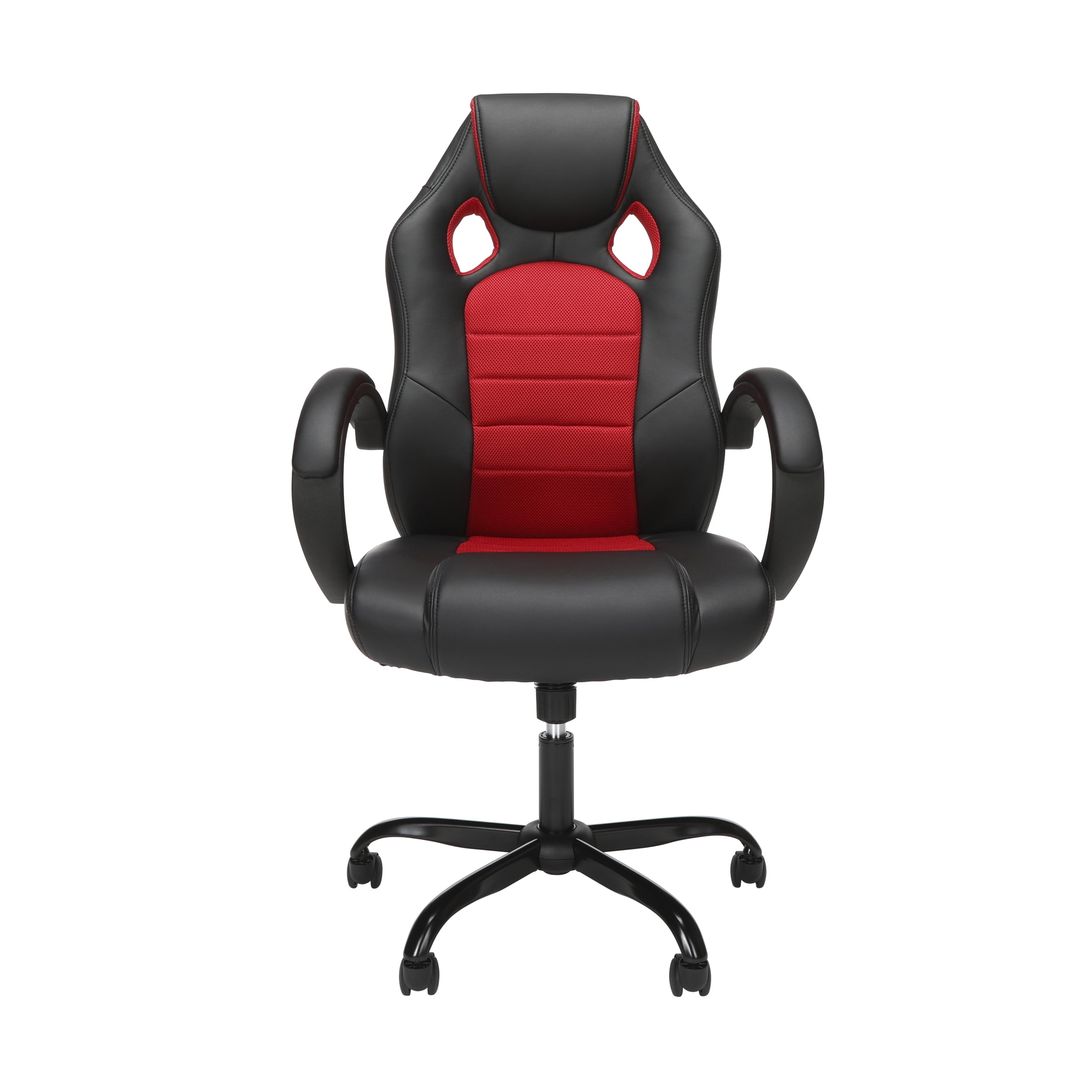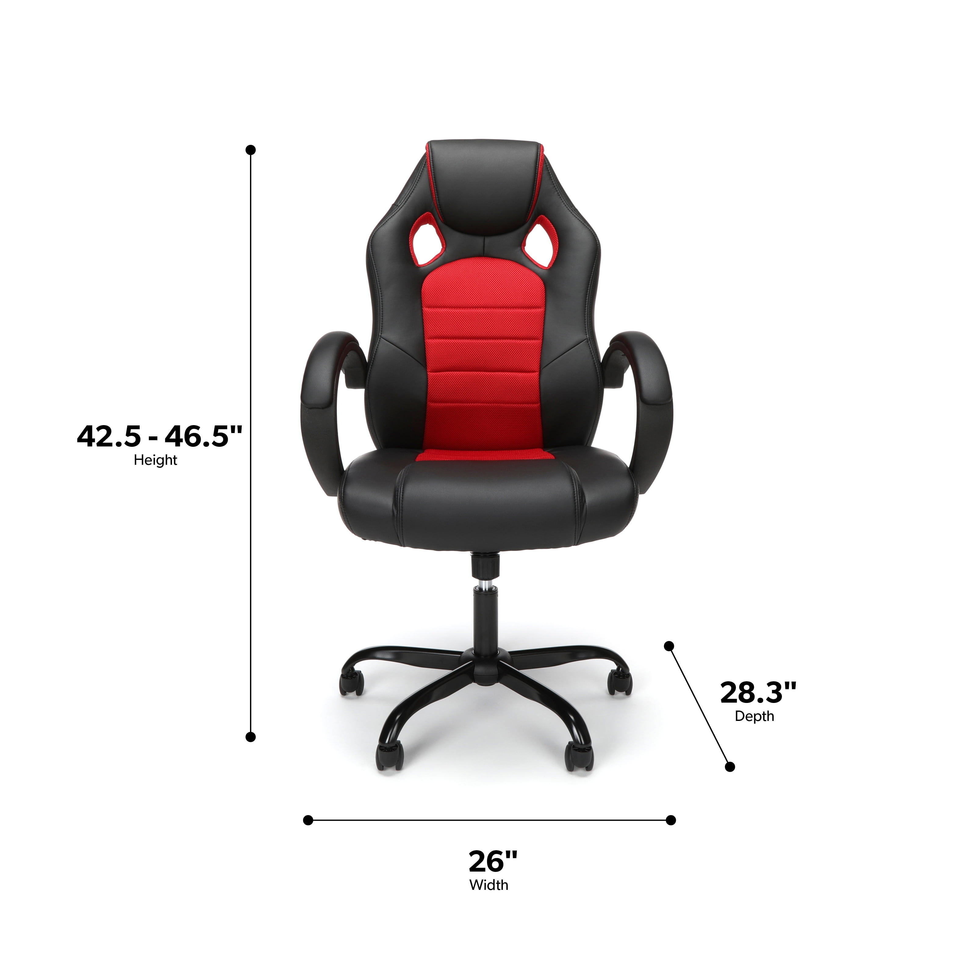 This multipurpose with a racecar-style design feature breathable mesh fabric and PU leather keeps you cool while you work or do some gaming Gaming chair provides integrated lumbar support to keep you comfortable while playing or working Get that higher score while the integrated padded headrest cradles your head and neck Ergonomic padded loop arm pads rest your arms so that you can extend those long hours working or gaming Whether you like to be upright or laid back, this chair allows for a generous tilt to suit your mood Tilt tension can be easily adjusted, beneath the seat, to slow down or speed up your rate of tilt The 360-degree swivel lets you stay on the move while the pneumatic height-adjustment allows for different heights The durable five-star metal base and steel frame keeps you feeling supported as you work or game This gaming chair has a seat thickness of 3.5″ and has the overall dimensions of 28.3″ D x 26″ W x 42.5″- 46.5″ H The weight limit for this chair is 275 lb and our chairs are backed by the OFM Essentials 5-Year Limited Warranty