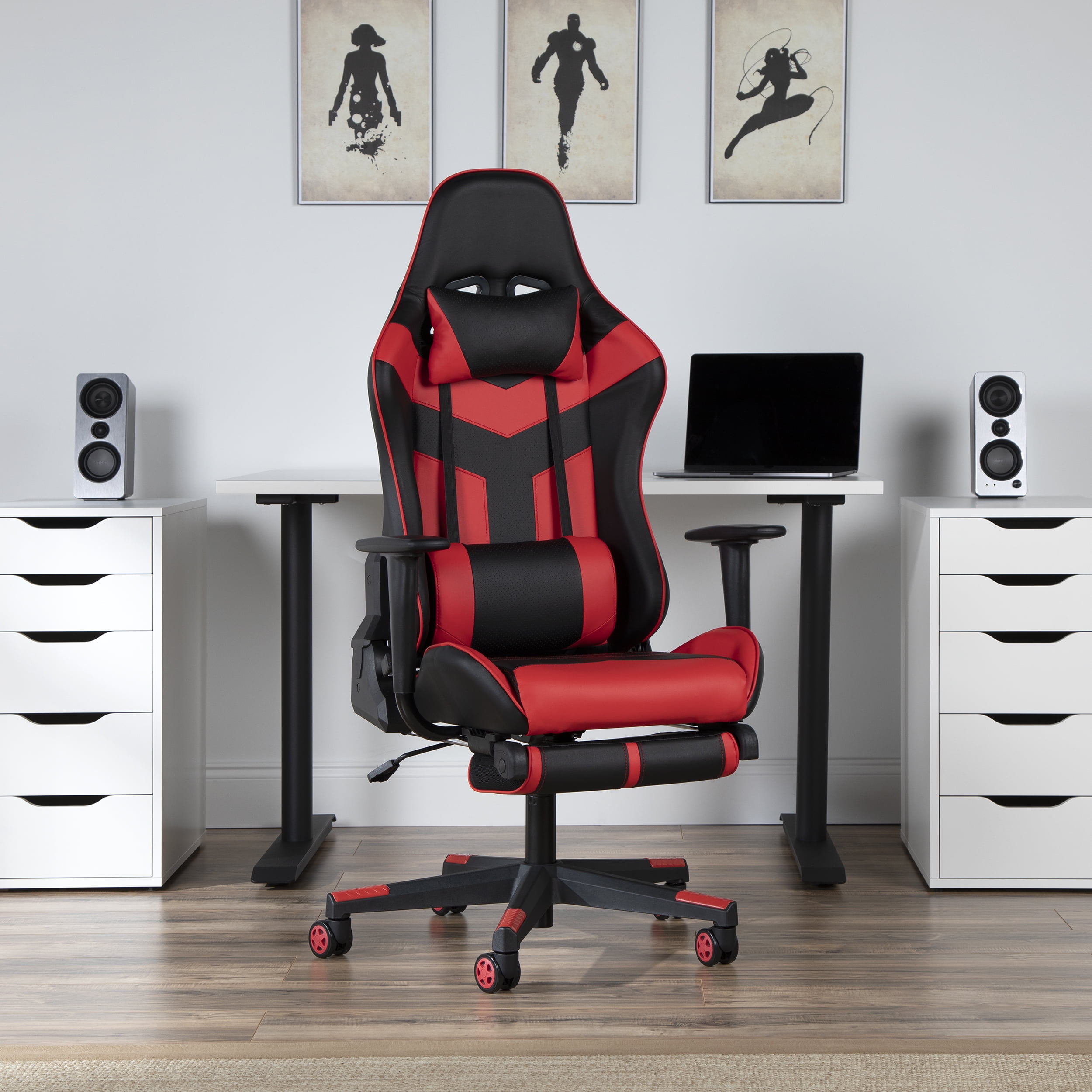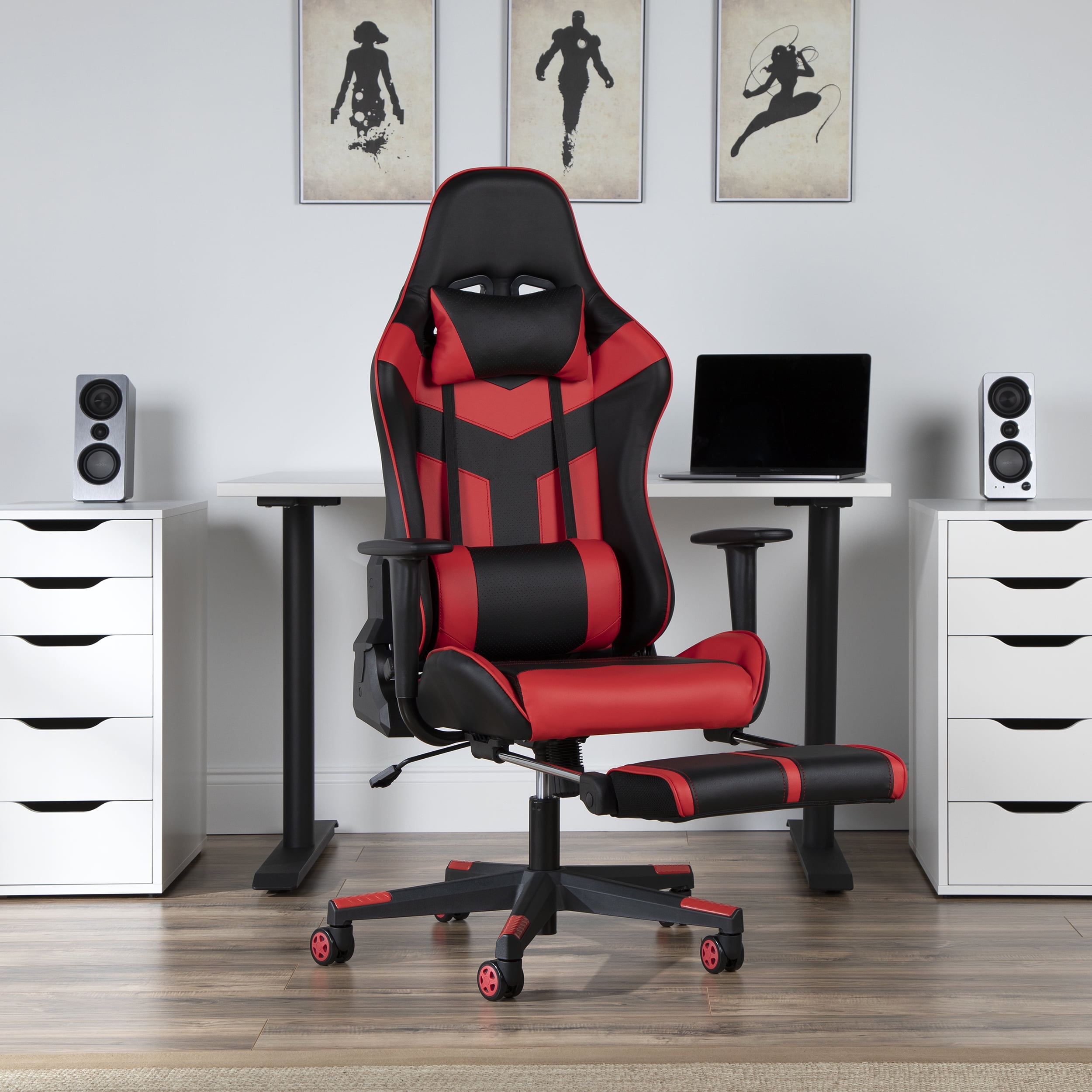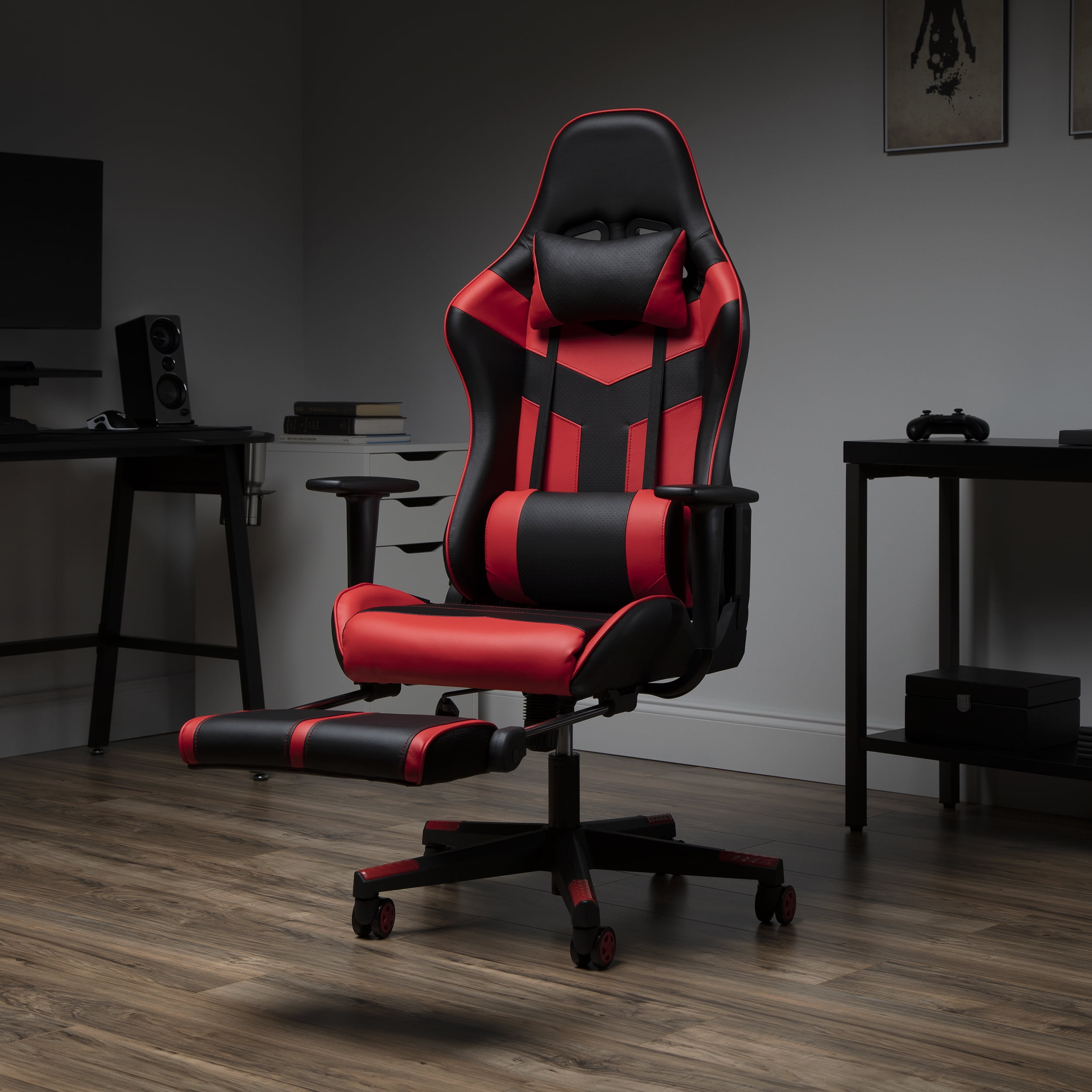 OFM Essentials Collection High Back PU Leather Gaming Chair, with Extendable Footrest, in Red (ESS-6075FR-RED)