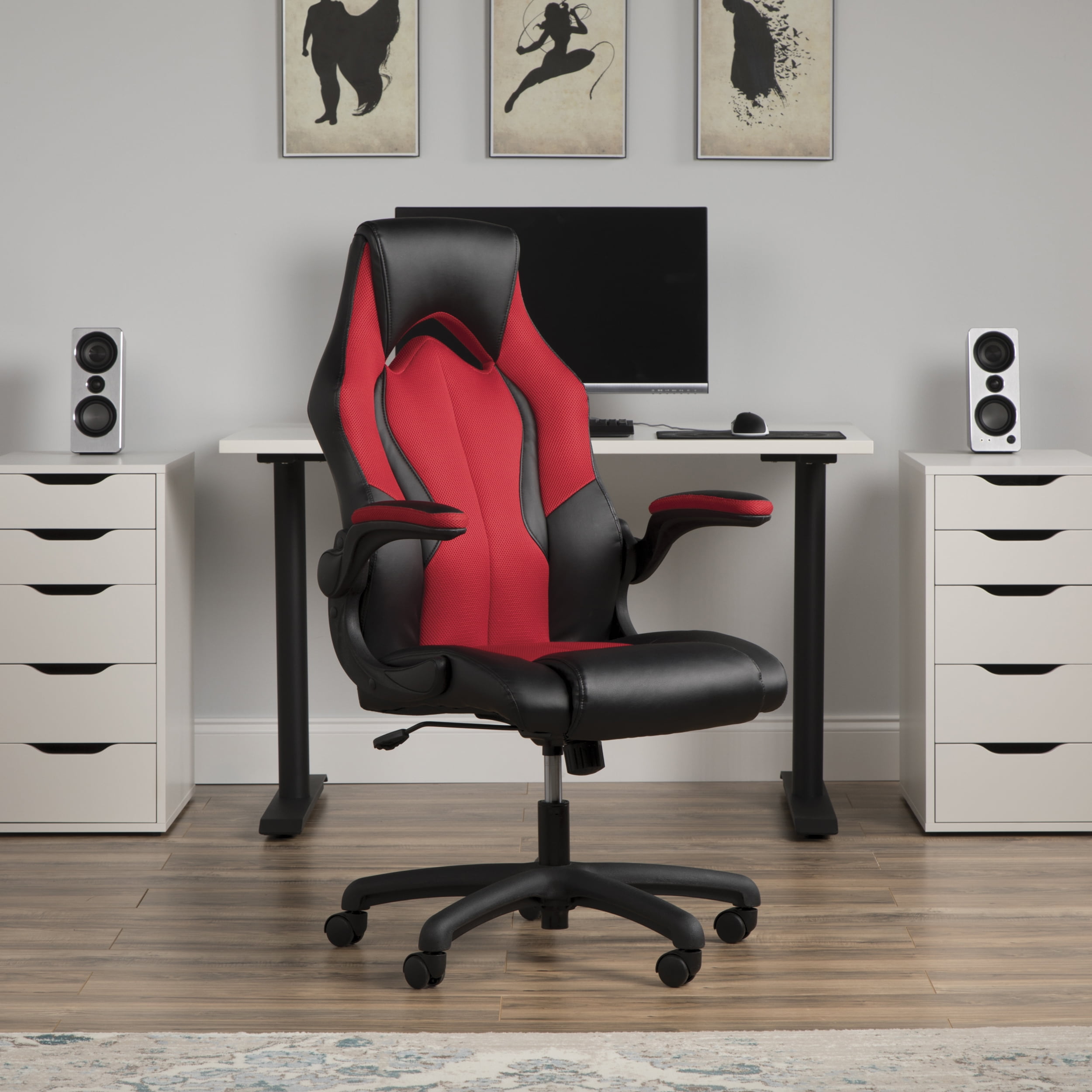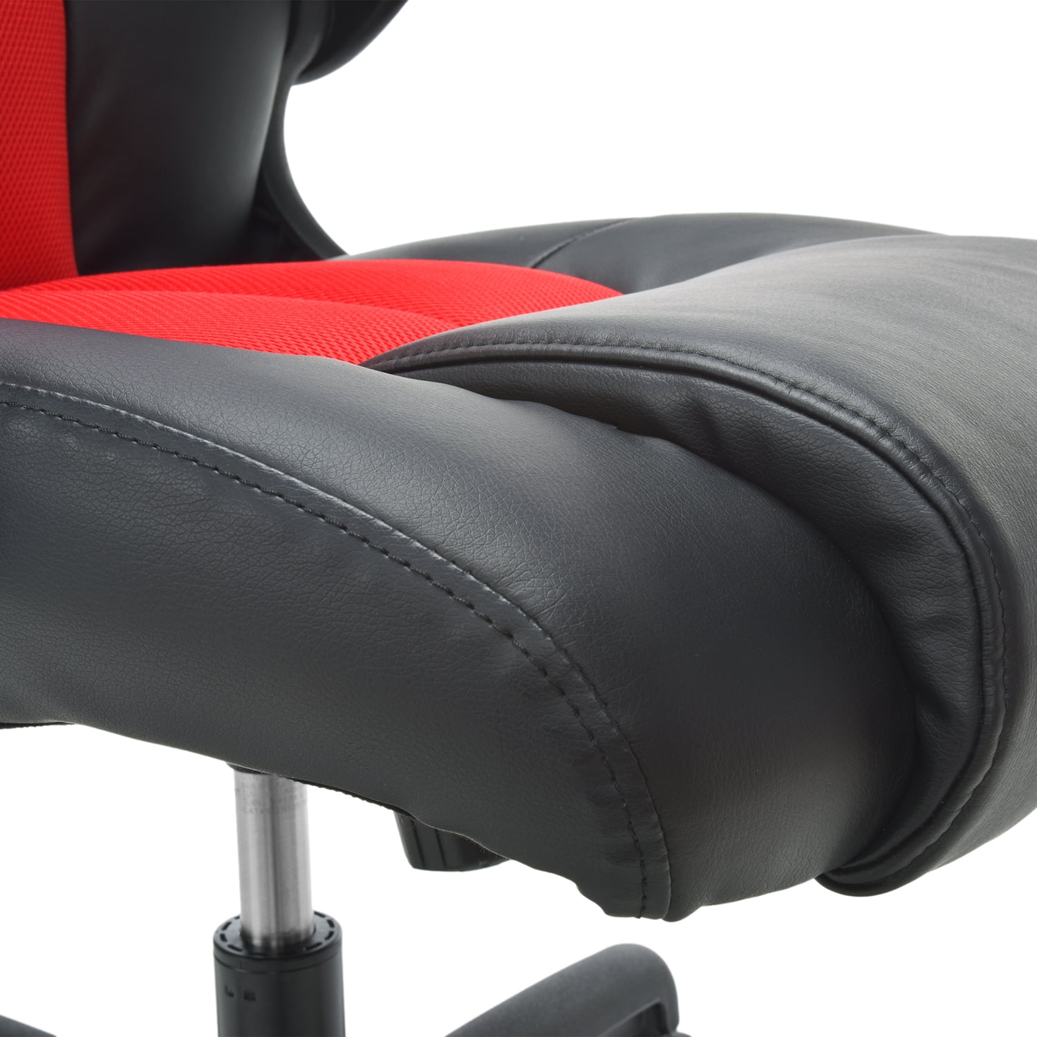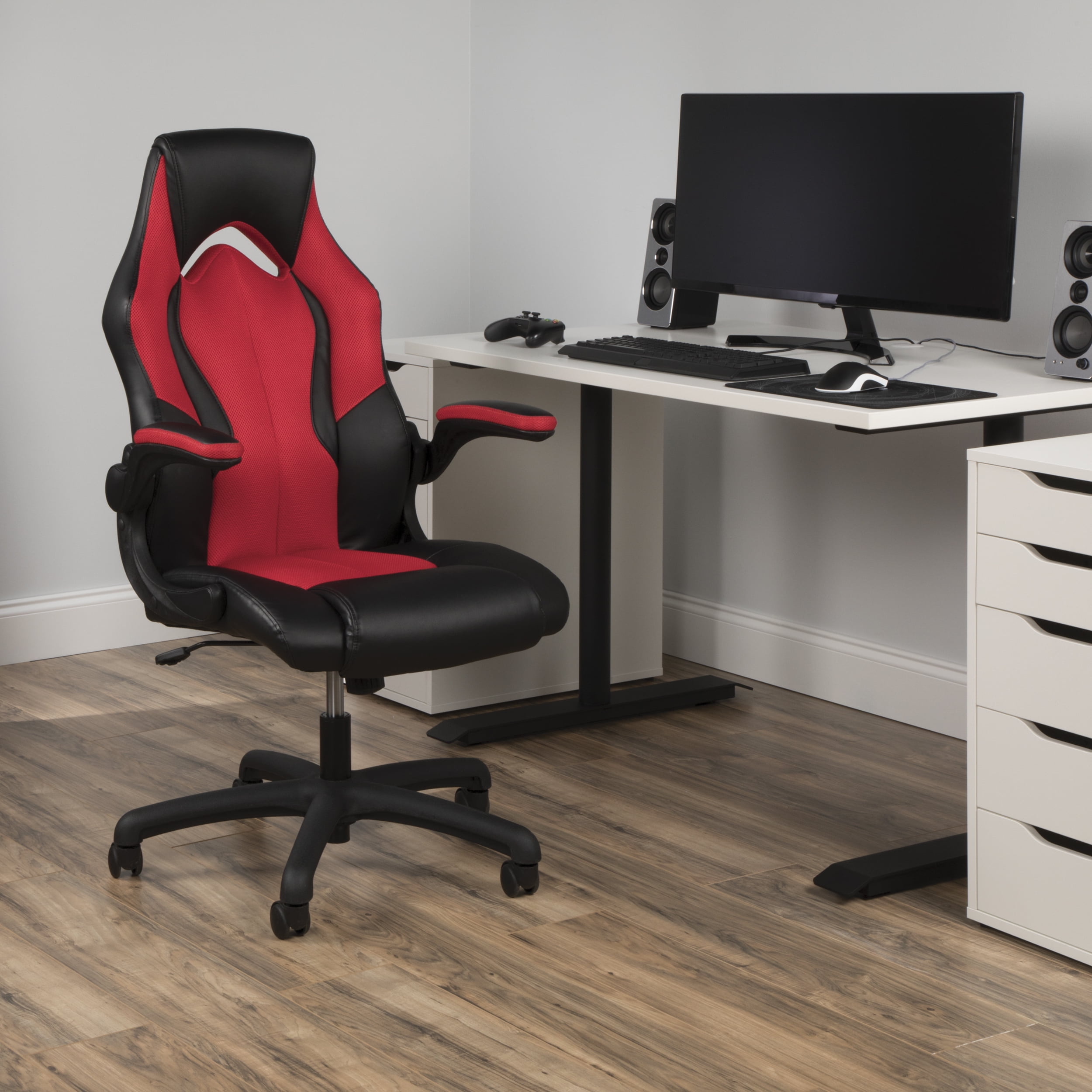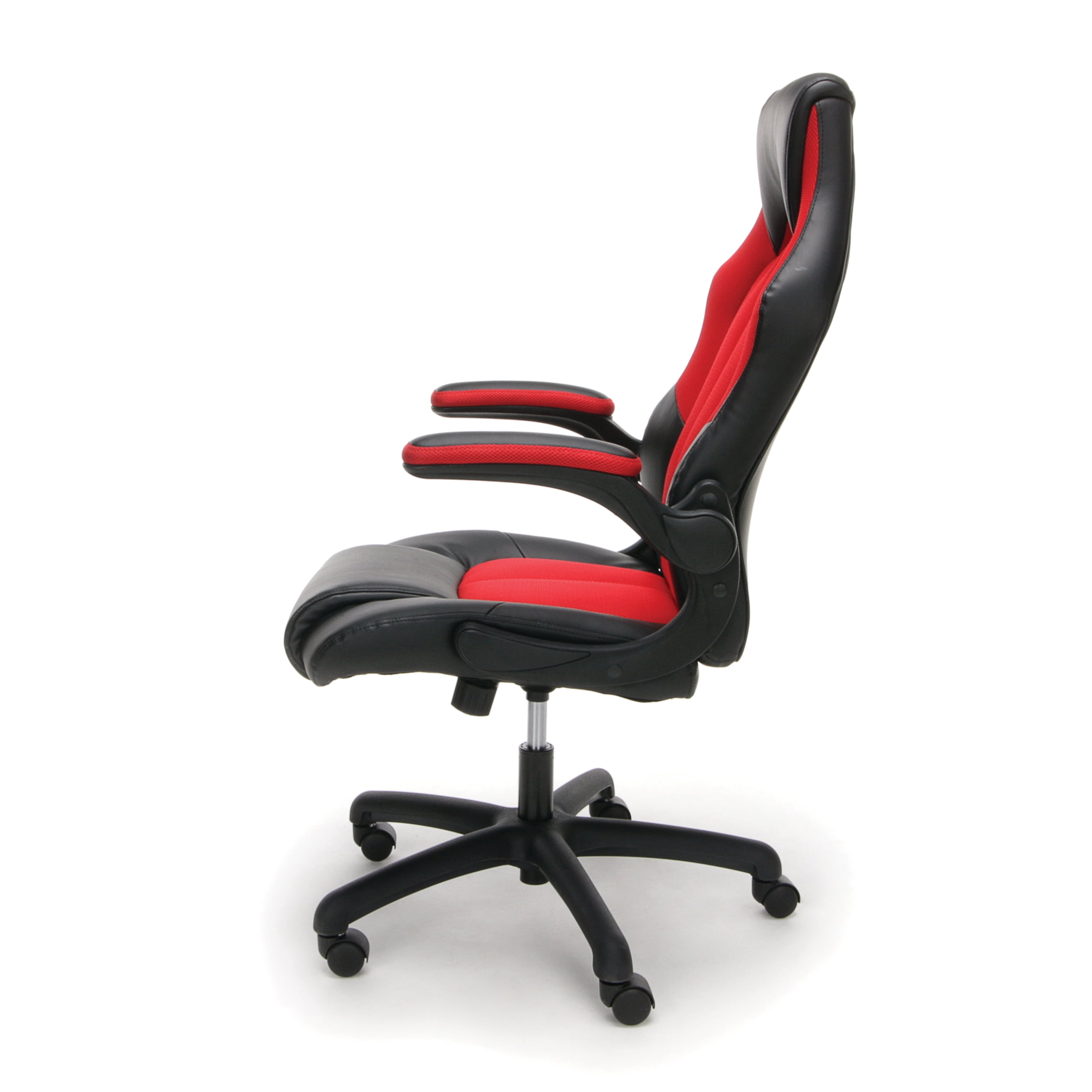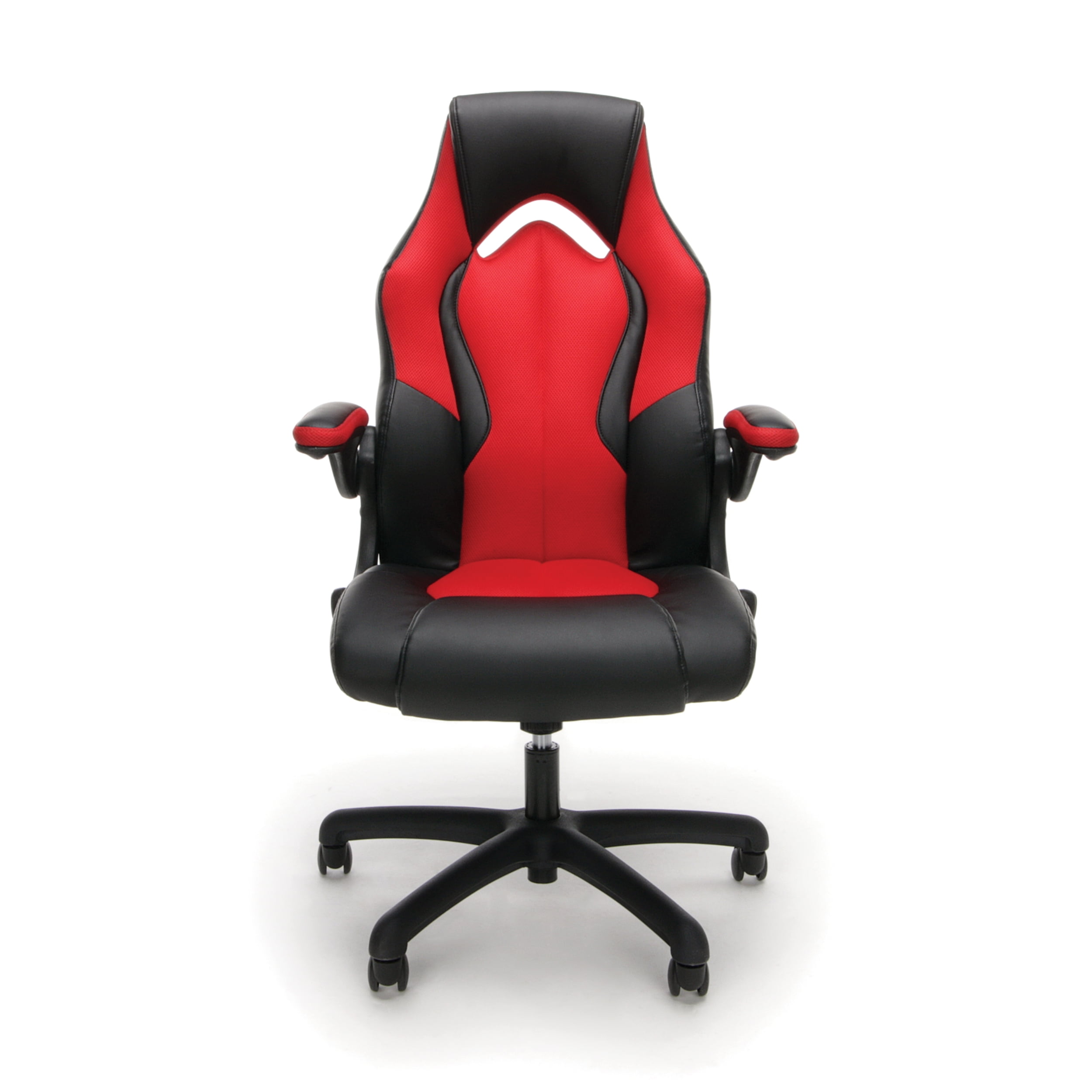 A race car style chair that provides luxury and comfort whether used during intense gaming sessions or long workdays This video game chair features an integrated padded headrest for those rare moments of rest while gaming The flip-up, padded arms make it easier to push your chair fully under the desktop to maximize space Bonded leather upholstery is comfortable and easy to wipe clean This video game chair features an integrated padded headrest for those rare moments of rest while gaming This PC gaming chair comes with integrated lumbar support to keep you comfortable for hours on end The center-tilt mechanism rotates the seat back into a comfortable reclining position and tilt lock keeps it there The adjustable tilt tension allows you to control the rate of recline, so you don’t tilt back too fast Steel tube framing holds you in position for quality support and comfort for long gaming hours The chair features a 360-degree swivel base and pneumatic height adjustment for personalized comfort Kick back and relax knowing this gaming chair is covered by the OFM Essentials 5-Year Limited Warranty