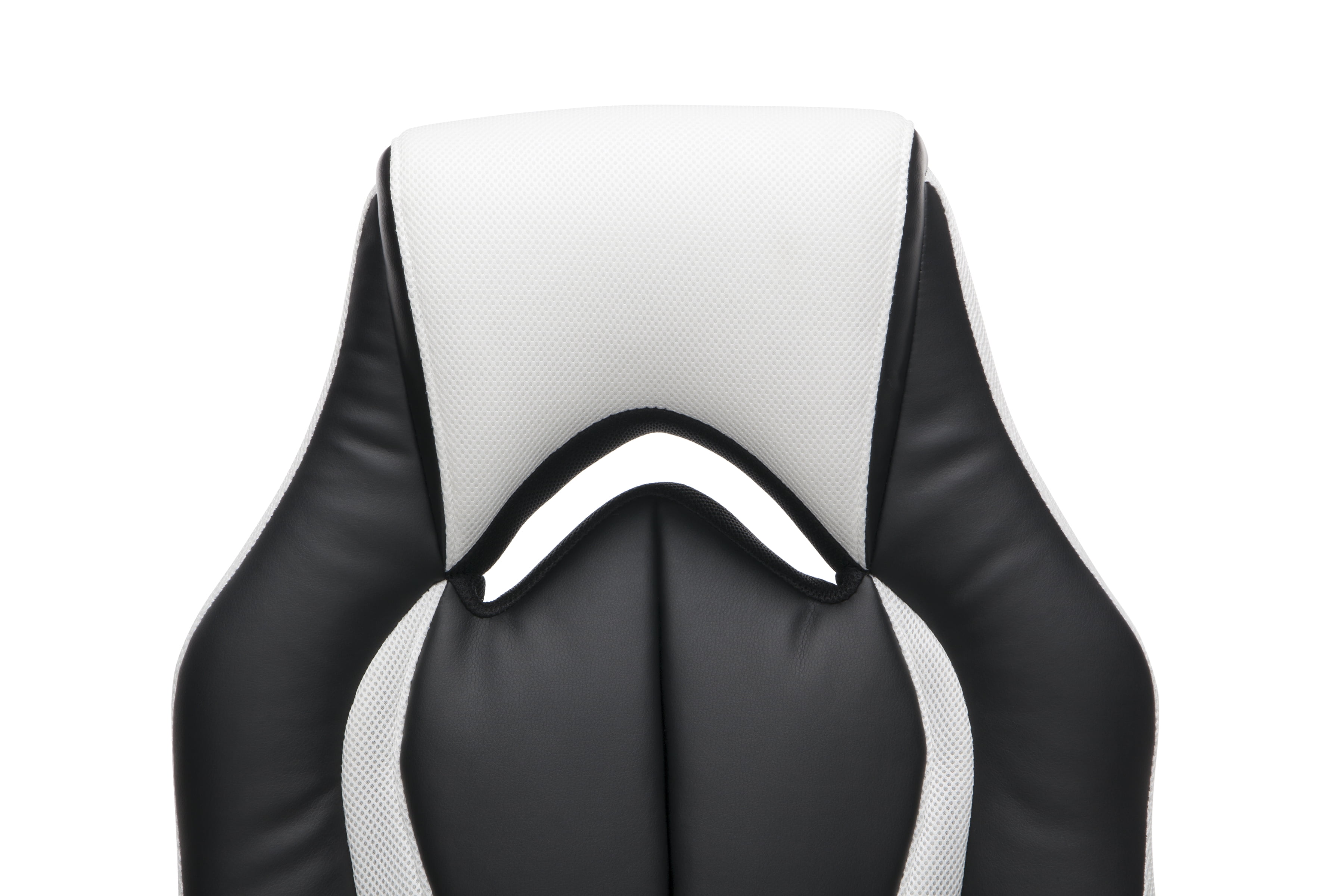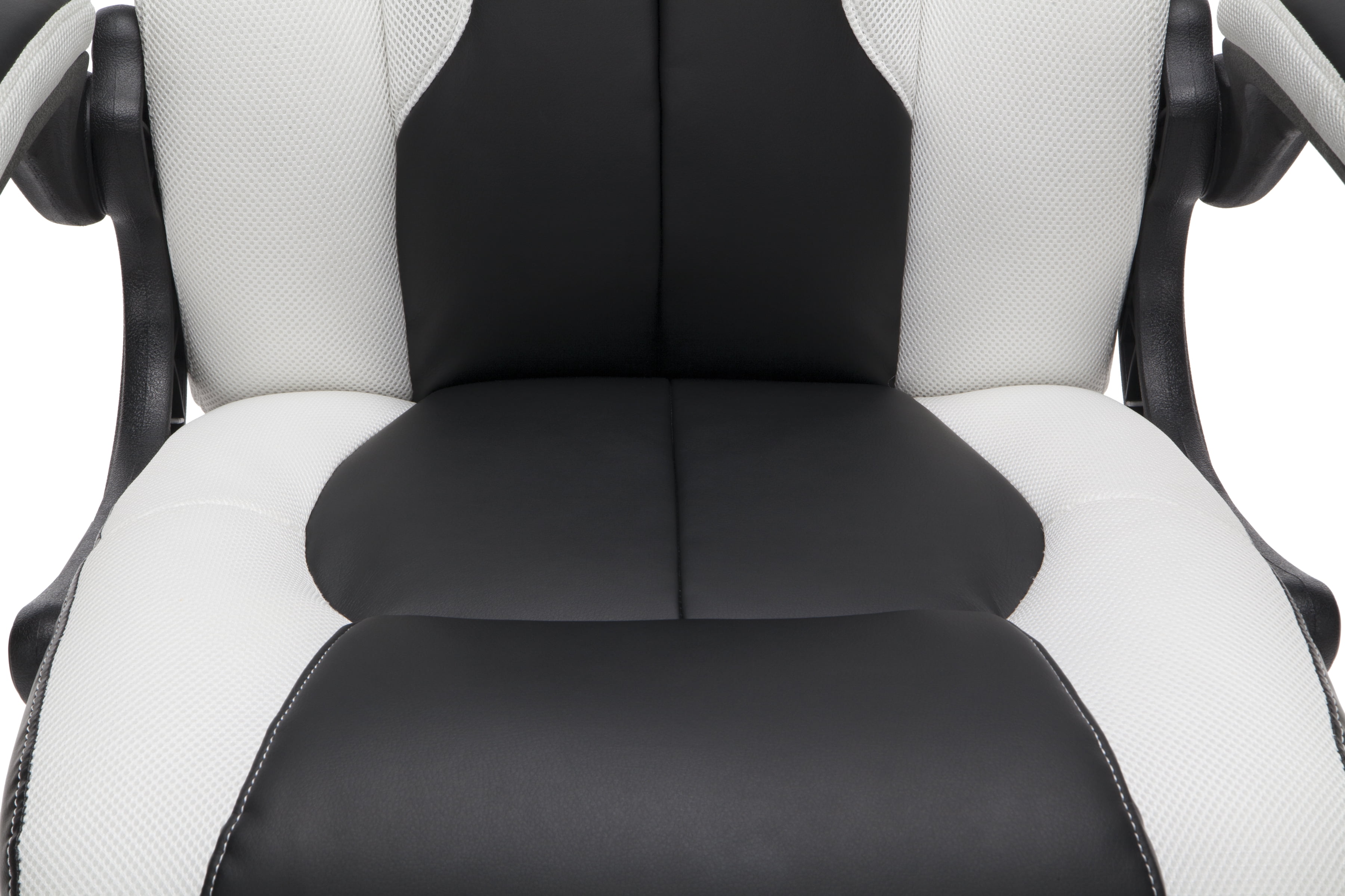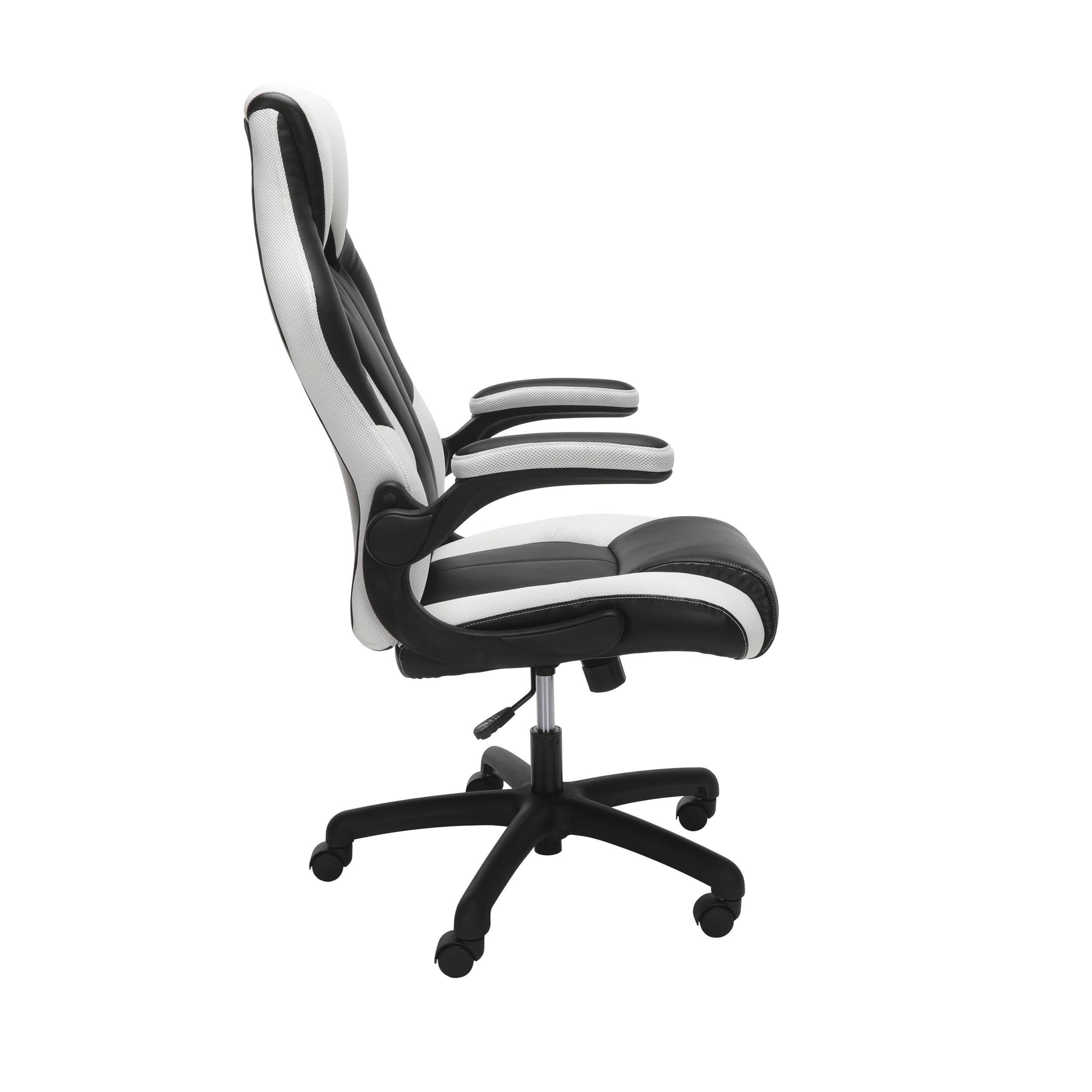 The OFM Essentials Collection seating is where quality meets value – and now it’s taking the desk chair to a whole new level with the ESS-3086 series. This High-Back Racing Style Bonded Leather Gaming Chair, in White, was designed with ergonomics in mind. With contoured segmented padding, a high back, and integrated headrest and lumbar support, this chair provides high-performance comfort whether used during intense gaming sessions or long work days. The thickly padded armrests can be left down for upper body support or flipped up to allow for uninhibited movement whenever you need it. Additional features include seat height adjustment, tilt-lock/tilt-tension control, and 360-degree swivel. SofThread Leather and contrasting color mesh upholstery complete the modern, high-quality look and feel. This chair is backed by the OFM Essentials 5-Year Limited Warranty and features a 275 lb weight capacity.
