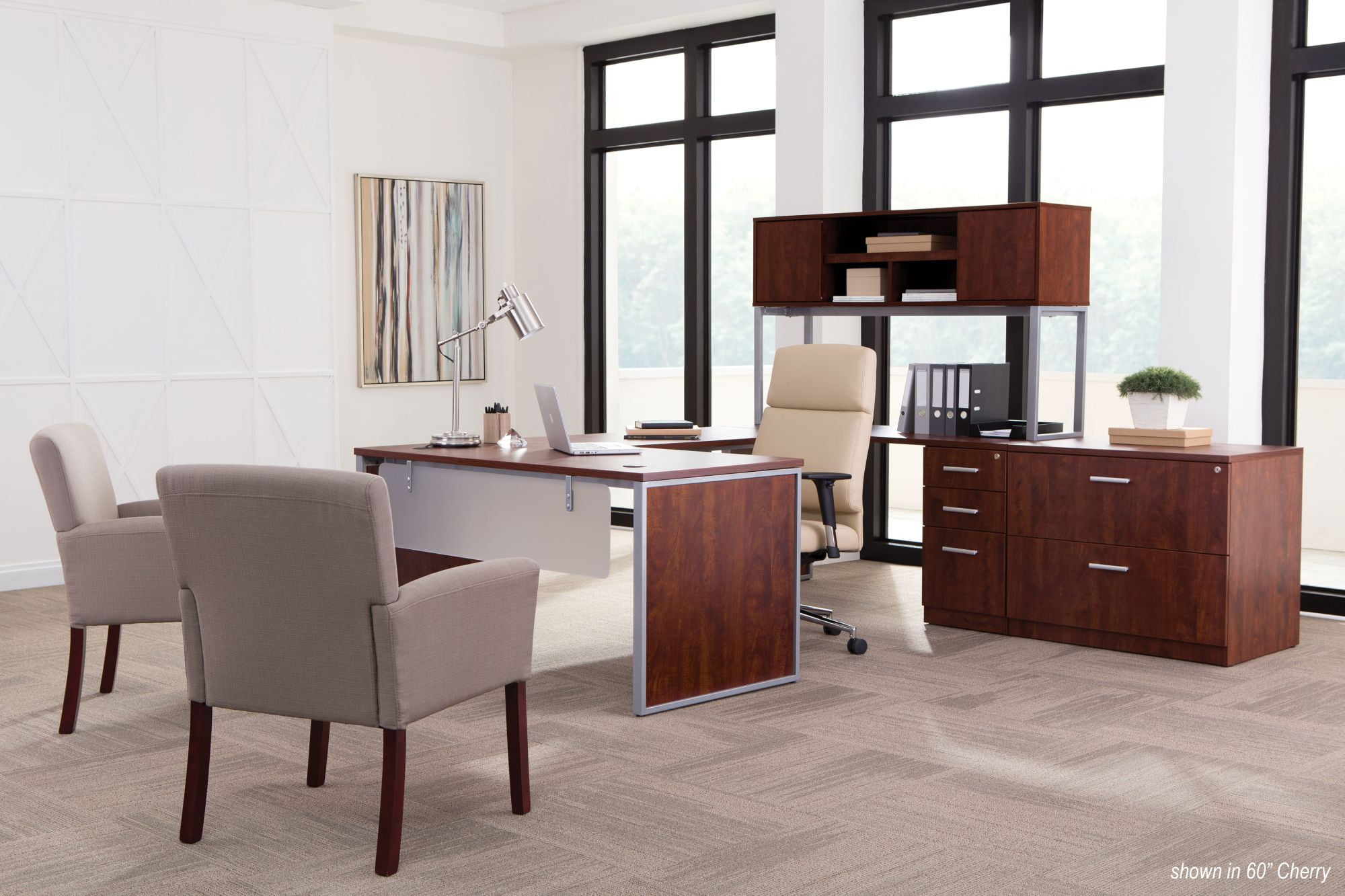 One series, limitless possibilities. Thoughtfully crafted, the OFM Fulcrum Series 60″ Hutch with Doors, in Cherry, is expertly engineered to provide ample office storage. The modern hutch features 3 center shelves, providing a display area, and 2 sliding doors, providing covered office storage space. The hutch cabinet, with metallic silver legs, combines rustic and industrial design elements that compliment any office decor.Color – Cherry