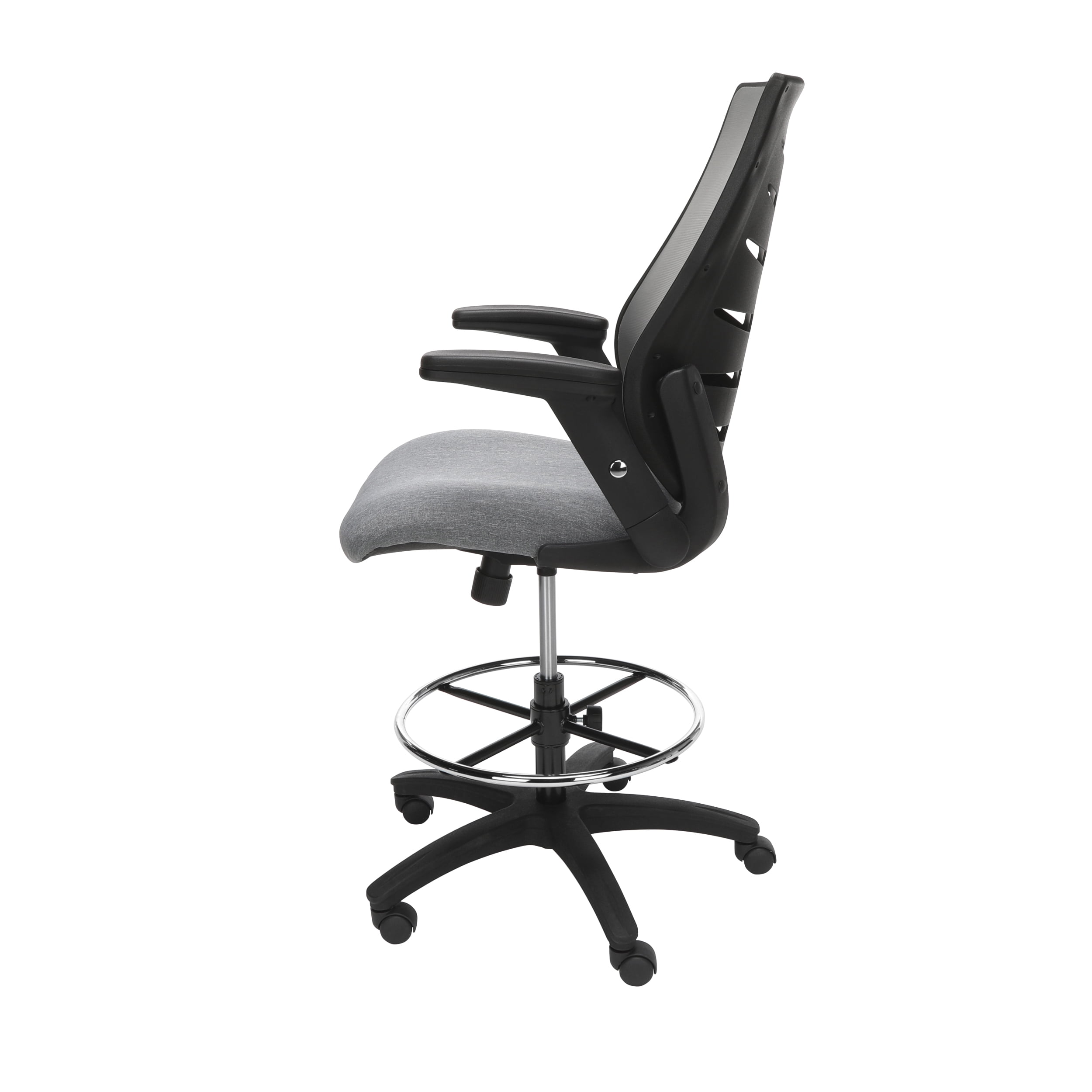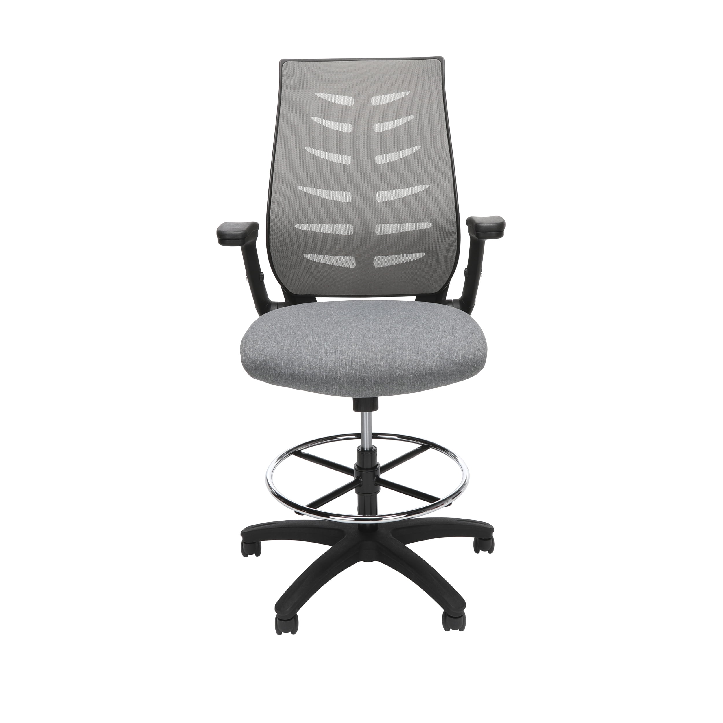 Sophistication and comfort are at the forefront in the design of the OFM Mid Back Mesh Drafting Chair, Drafting Stool, with Lumbar Support, in Gray. The stylishly ventilated design of the mesh back provides air circulation that keeps you cool all day. The conforming fabric seat with waterfall edge takes the pressure off of the back of your thighs, allowing you to sit comfortably for longer. This draft stool features integrated lumbar support for all-day back comfort. The drafting stool also features a metal footring to provide a resting spot, and support, for your feet. The flip up and height-adjustable arms provide a unique amount of flexibility as they can be adjusted for different users and moved out of the way as needed. Ergonomic features that allow further customization include center-tilt, upright tilt lock, tilt tension, and pneumatic seat height adjustment. This office chair has a five-star base that is molded from reinforced resin and has a 360-degree swivel. The chair measures 28.54″ D x 28.15″ W x 47.24 – 55.91″ H and holds users up to 275 lb. The computer chair is backed by the OFM 10-Year Limited Warranty.