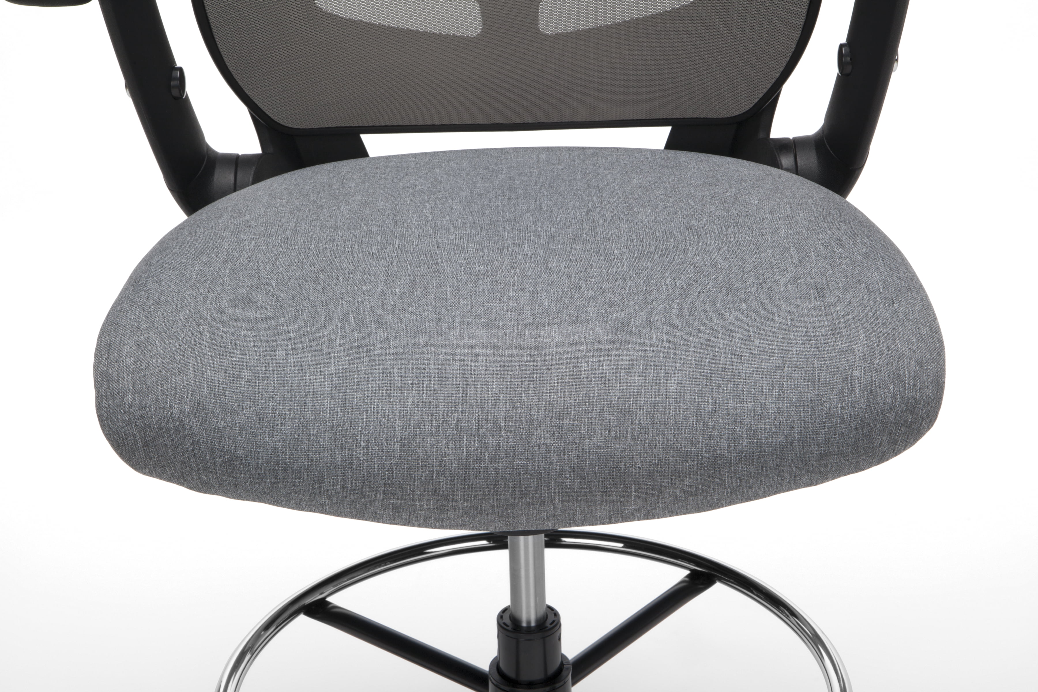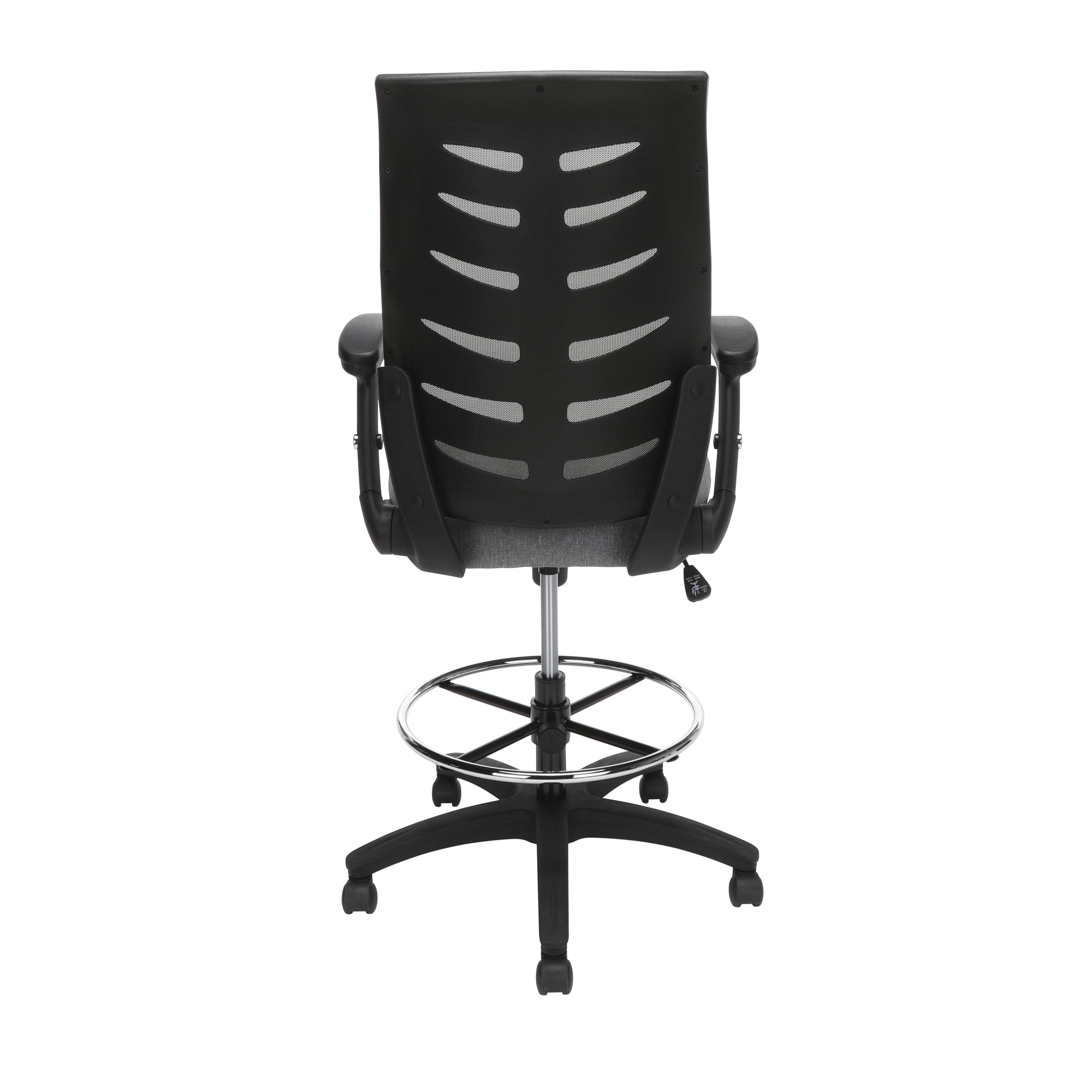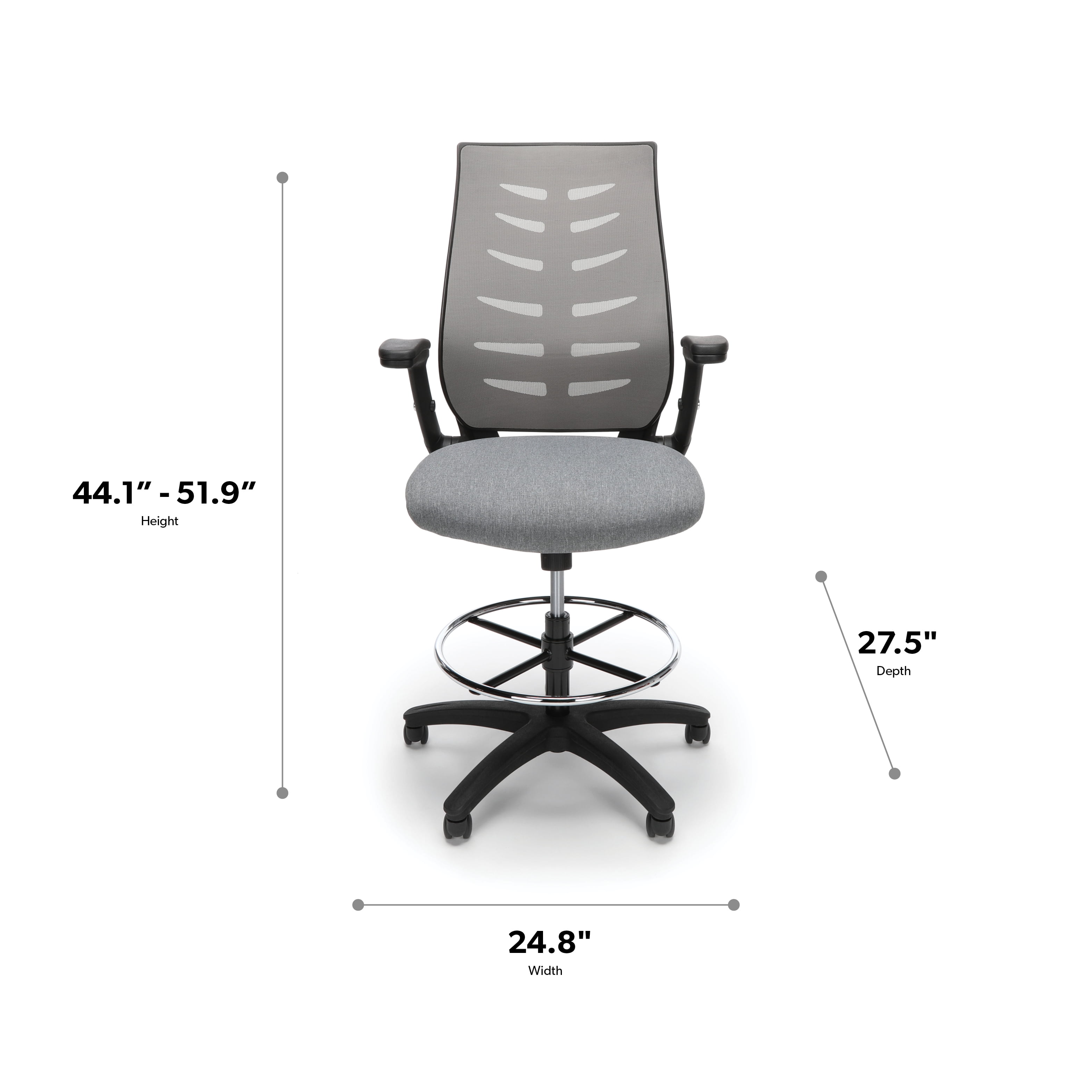 The stylish ventilated design of the mesh back provides air circulation for your back The conforming fabric seat with waterfall edge takes the pressure off the back of your thighs Draft stool features an integrated lumbar support for all-day back comfort The drafting stool features metal footring to provide a resting spot, and support, for your feet The flip up and height-adjustable arms on the drafting chair provide support and allow for freedom of movement The center-tilt mechanism rotates the seat back into a comfortable reclining position This task chair features upright tilt lock which secures the chair in the full upright position to prevent unintended reclining Tilt tension controls the rate and ease of recline to make tilting easy but not too fast Pneumatic seat height adjustment controls the seat’s up and down movement to adapt to various user heights The office chair features a five-star base that is molded from reinforced resin and has a 360-degree swivel that provides freedom of movement in any direction This roomy chair measures 28.54″ D x 28.15″ W x 47.24 – 55.91″ H This multi-purpose chair features a 275 lb weight capacity and is backed by the OFM 10-Year Limited Warranty